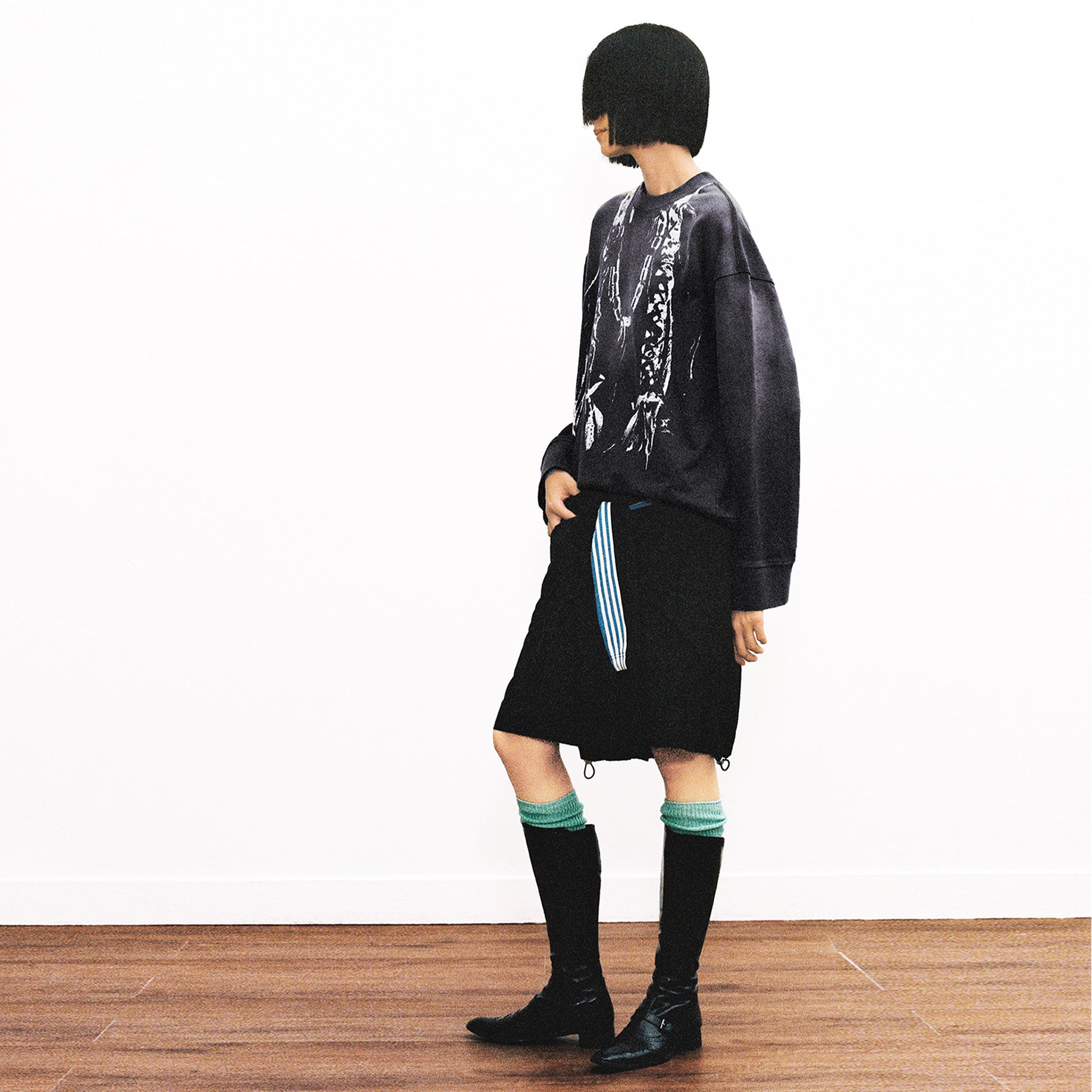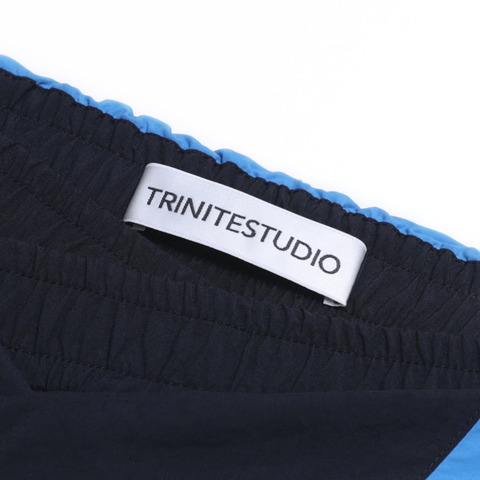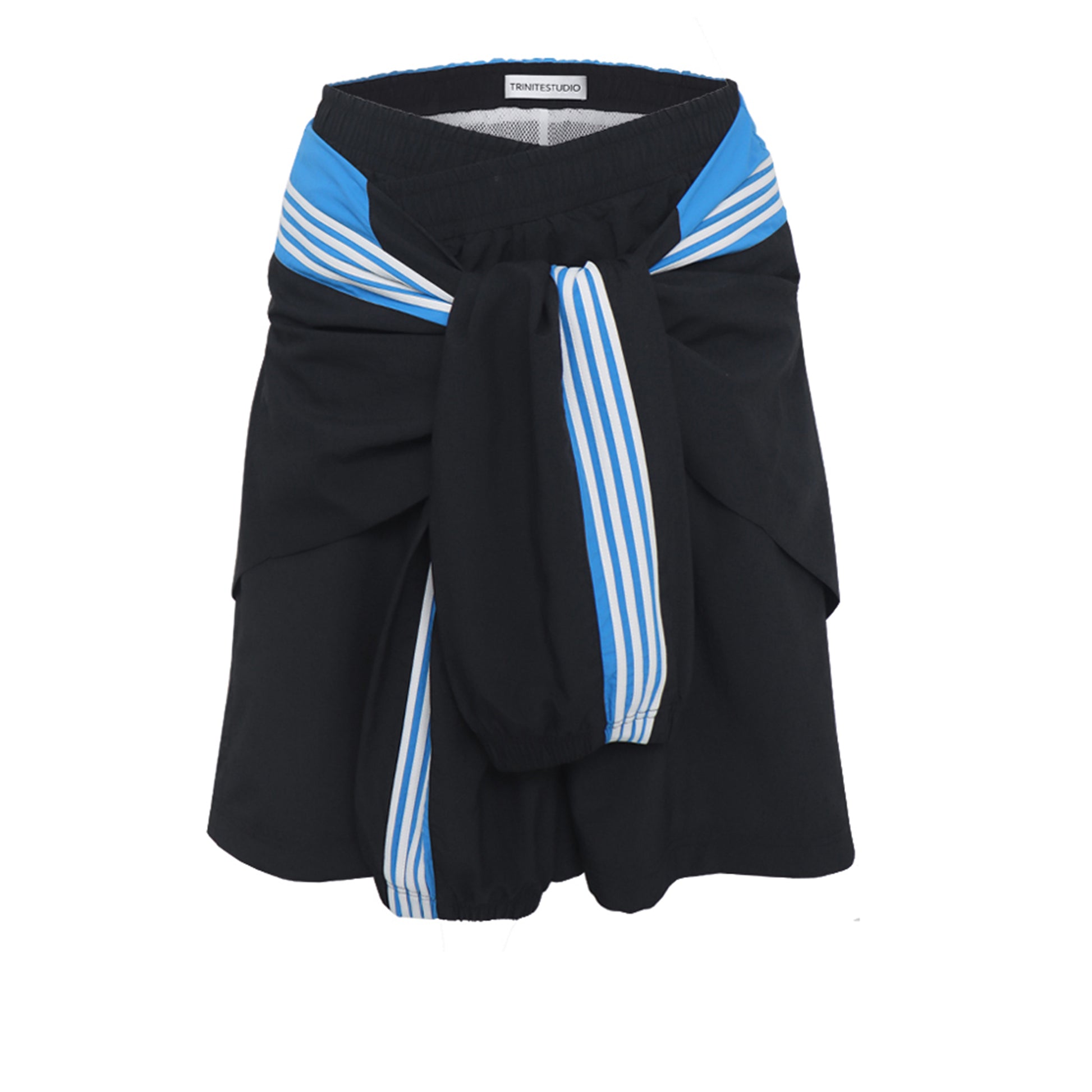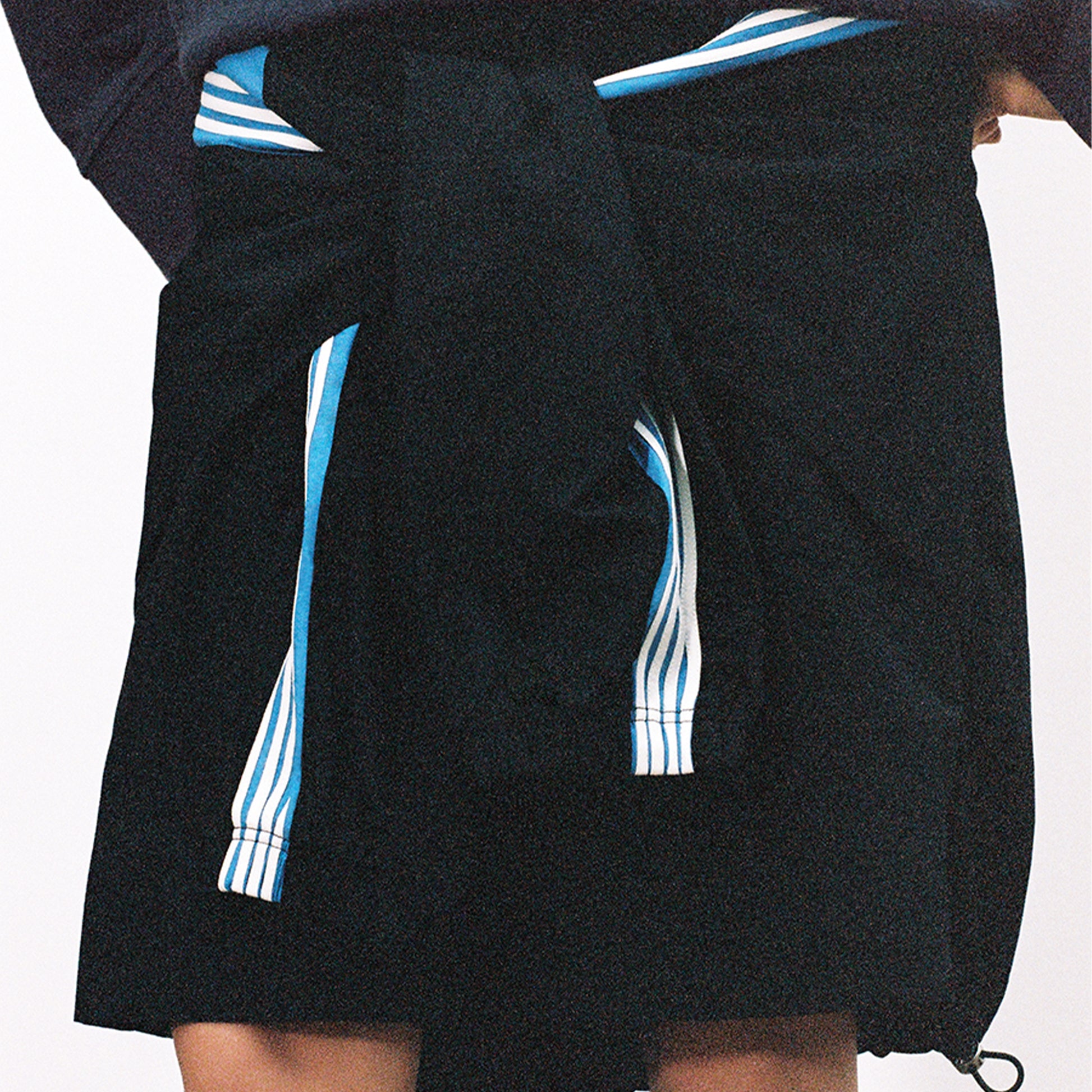 The shape is deformed from a sports jacket tied around the waist into a complete piece. TRINITE designed it to visually resemble a skirt with shorts by connecting another "sports jacket" to the loose five-point shorts, with adjustable drawstrings at the hem.