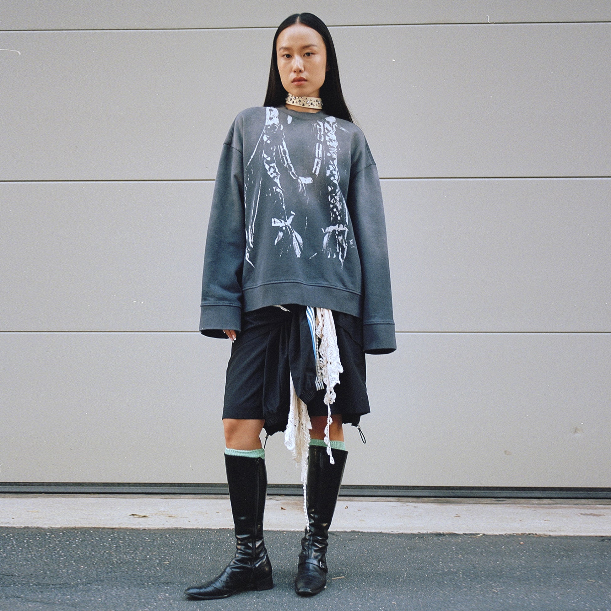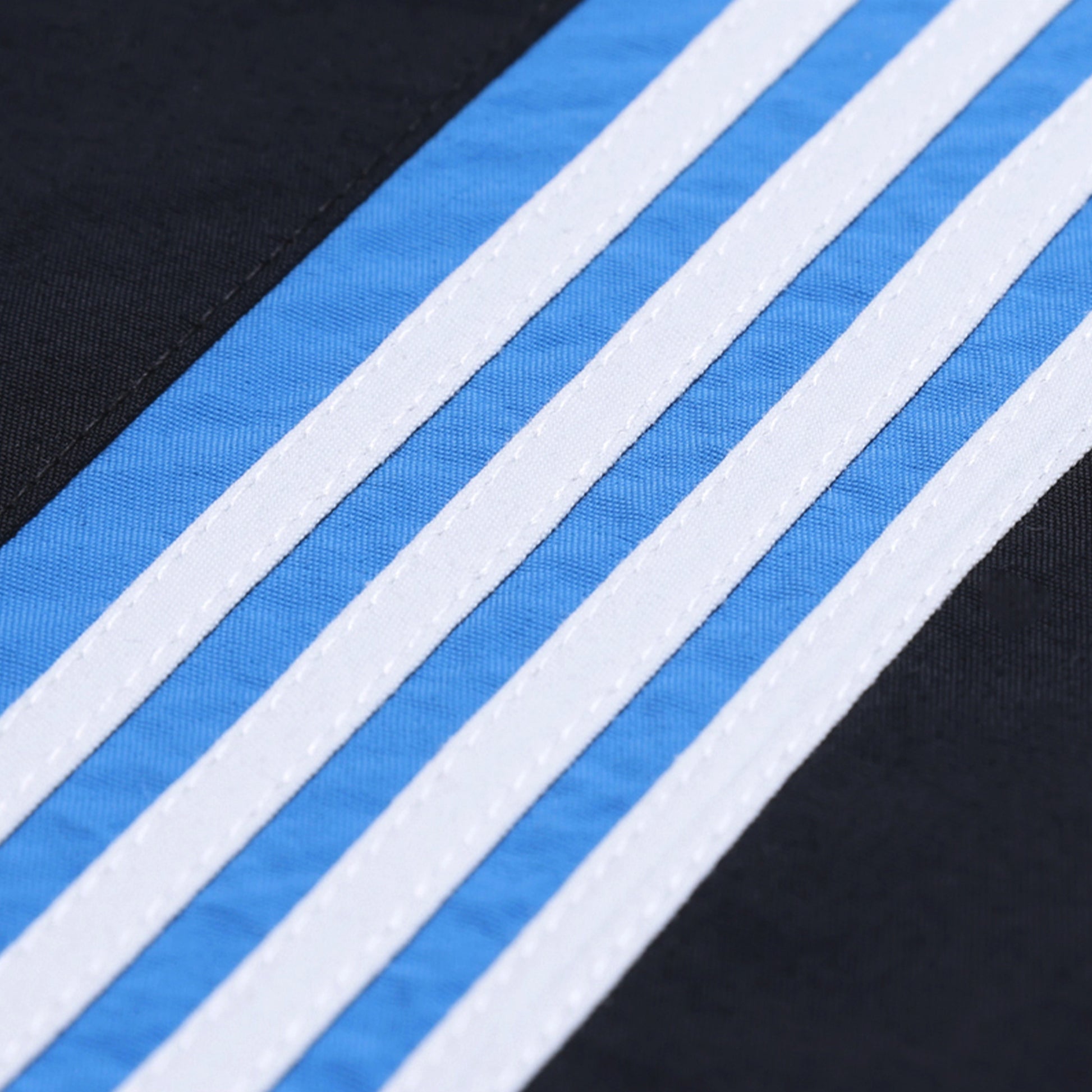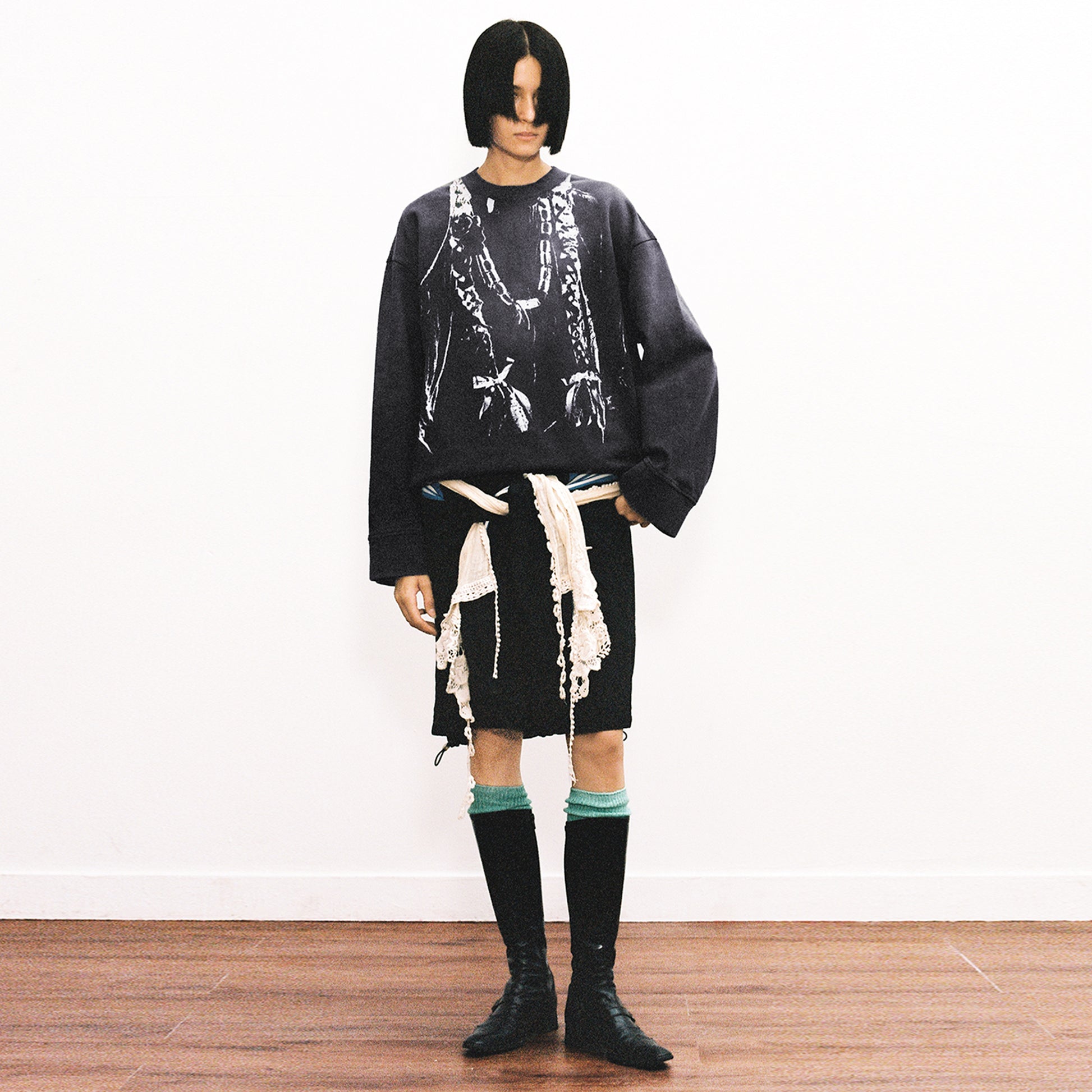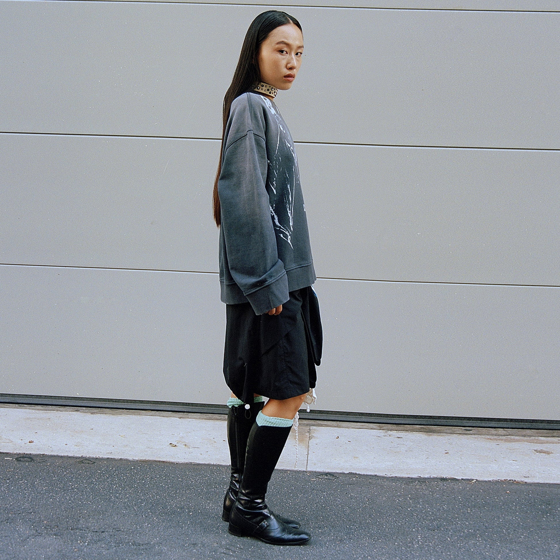 The shape is deformed from a sports jacket tied around the waist into a complete piece. TRINITE designed it to visually resemble a skirt with shorts by connecting another "sports jacket" to the loose five-point shorts, with adjustable drawstrings at the hem.