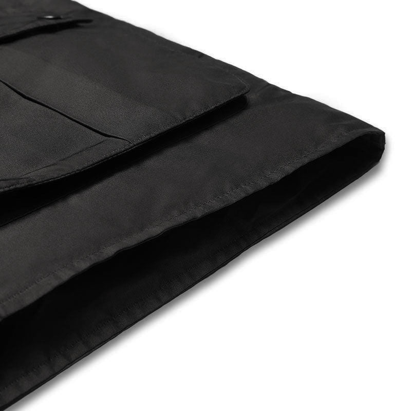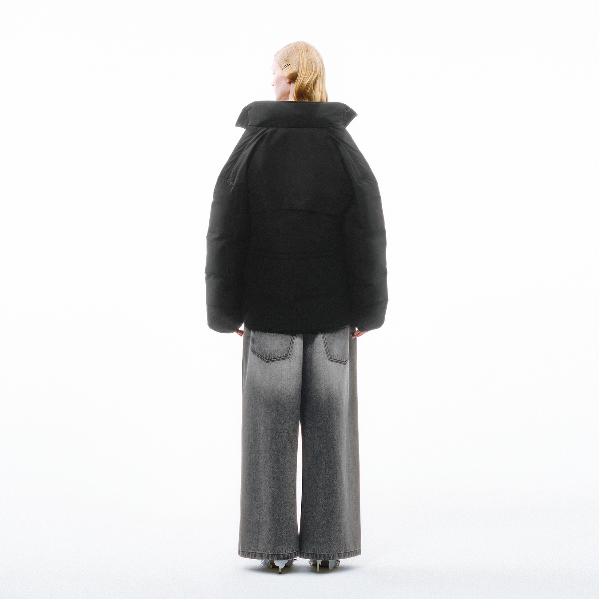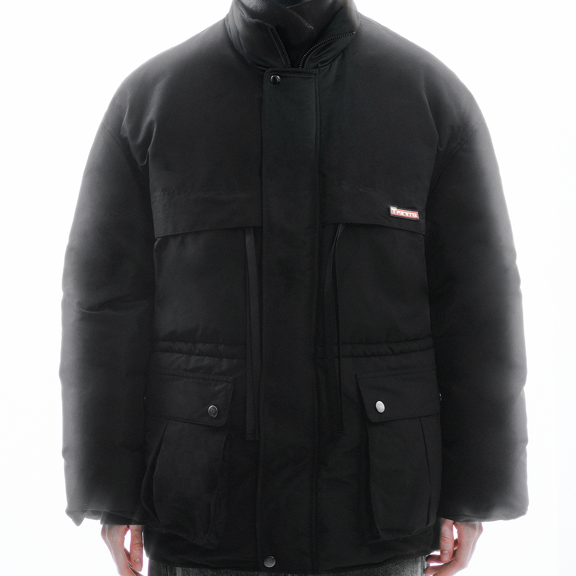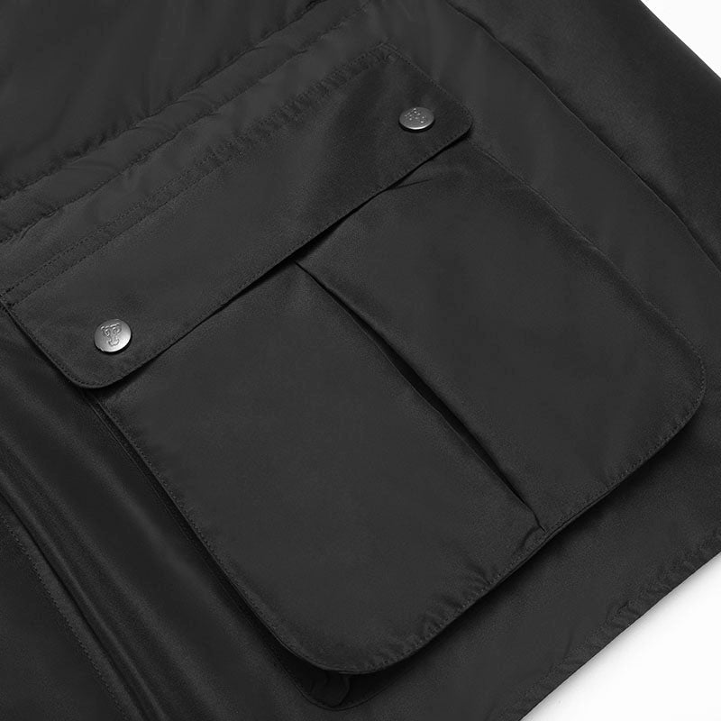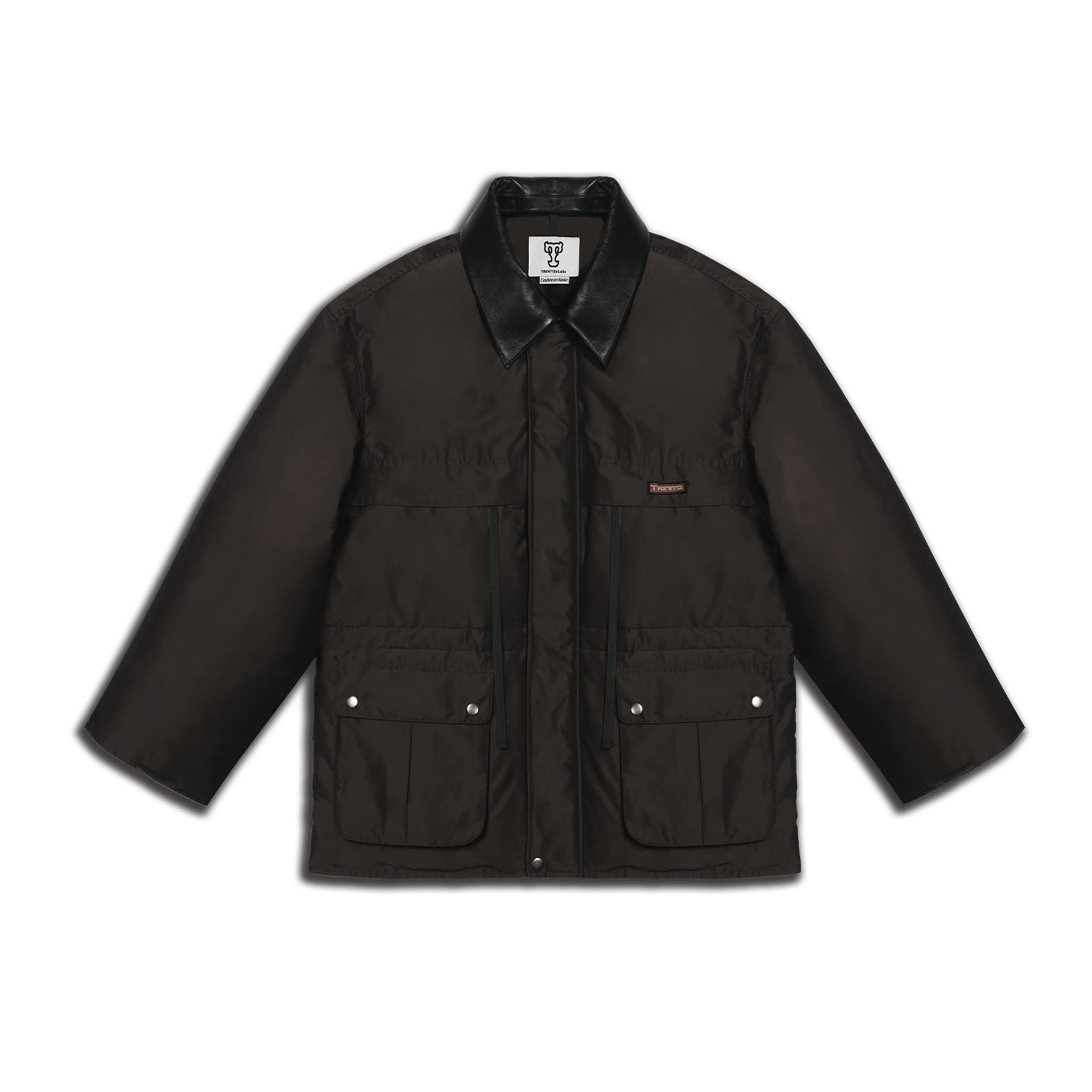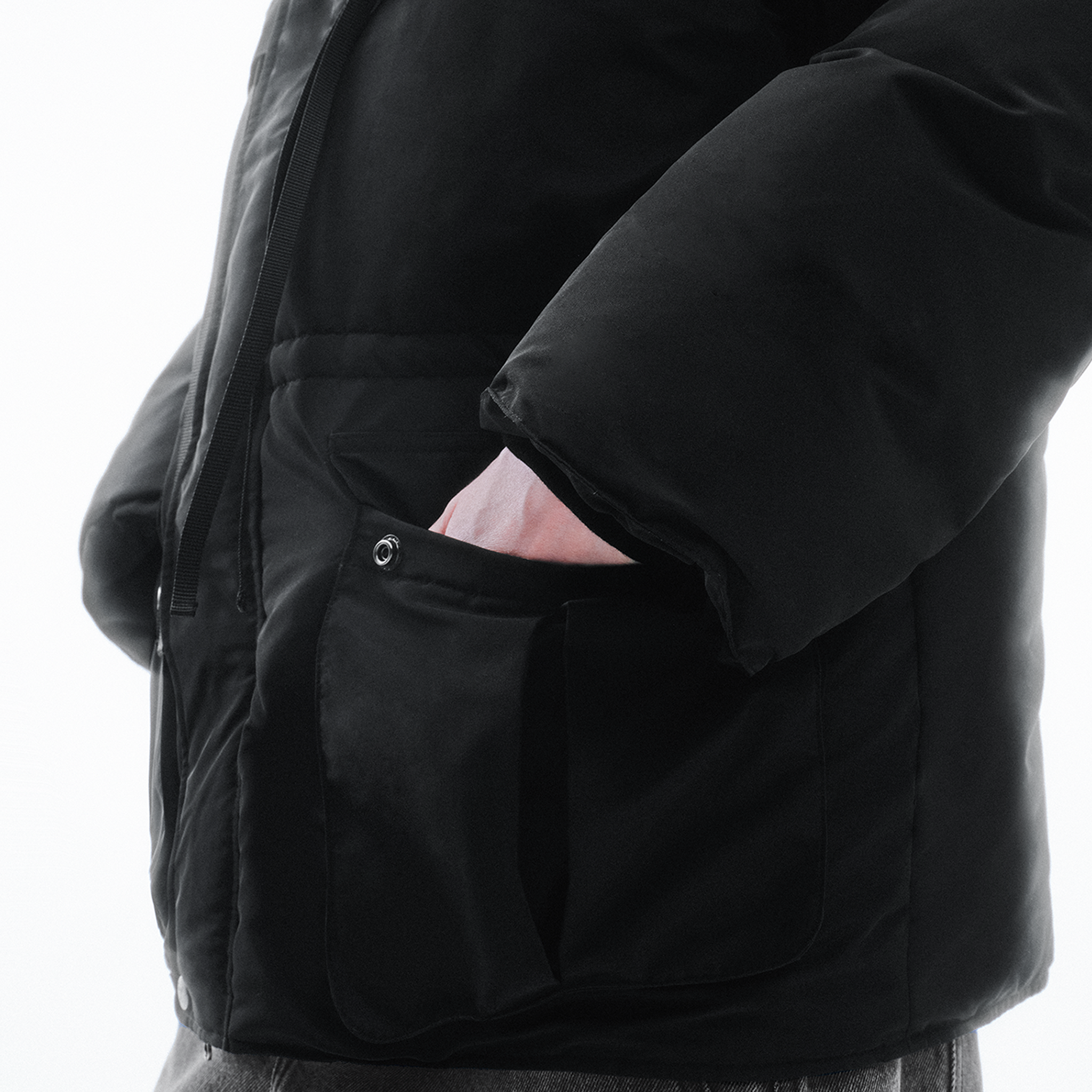 This down jacket seamlessly blends functionality and aesthetic detailing, featuring a detachable genuine leather collar for versatile styling across various occasions. Its overall design is anchored in a workwear-inspired multi-pocket layout, exuding a structured, rugged appeal. The fabric is crafted from a silk-blend material sourced from Como, Italy, offering the gentle luster and smooth texture characteristic of silk. Filled with 95% goose down (XS: 125g / S: 135g / M: 140g), it provides lightweight warmth, plush loft, and lasting comfort—making it an ideal choice for winter that balances practicality and style.