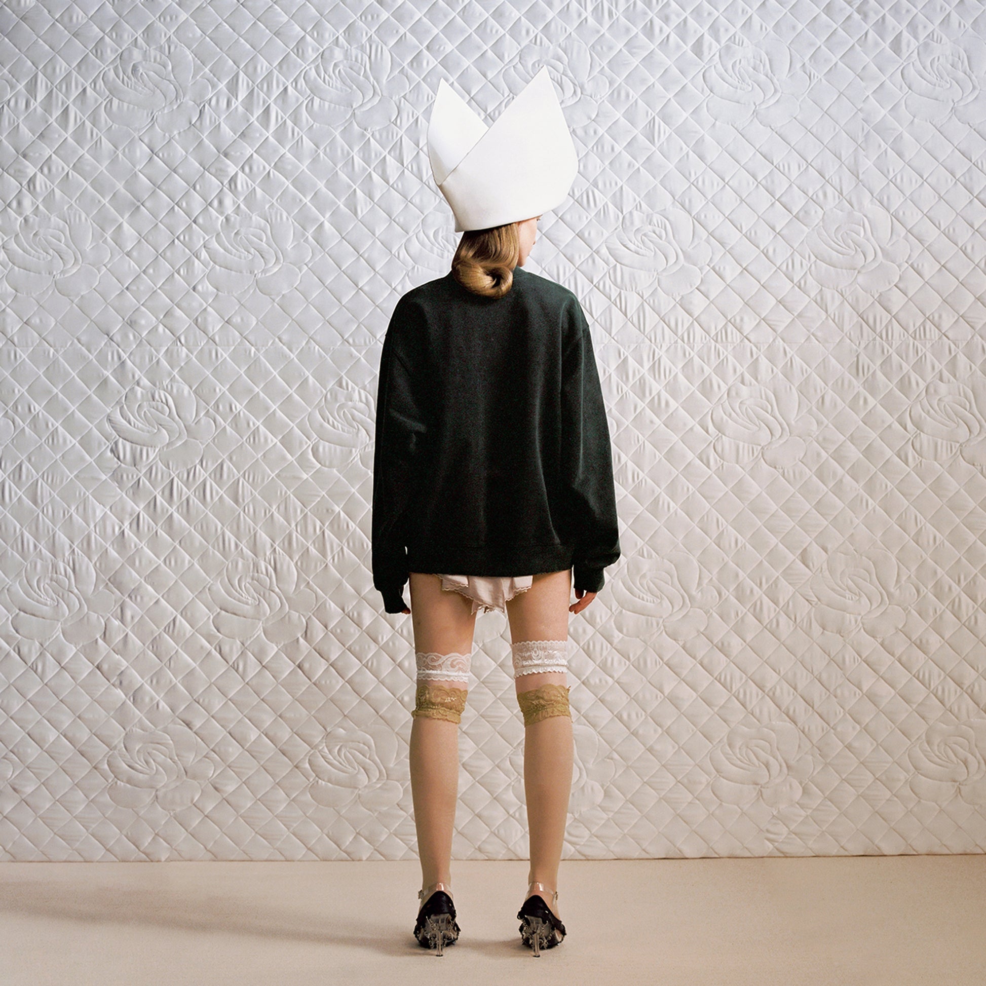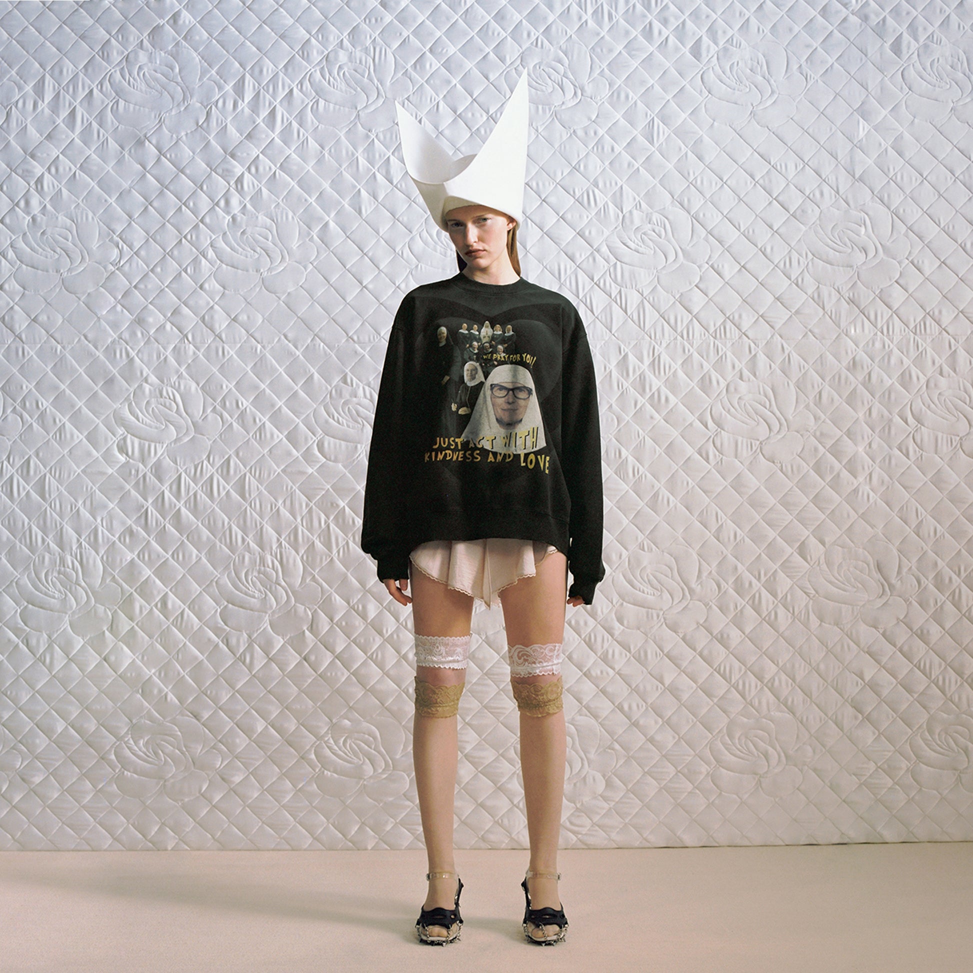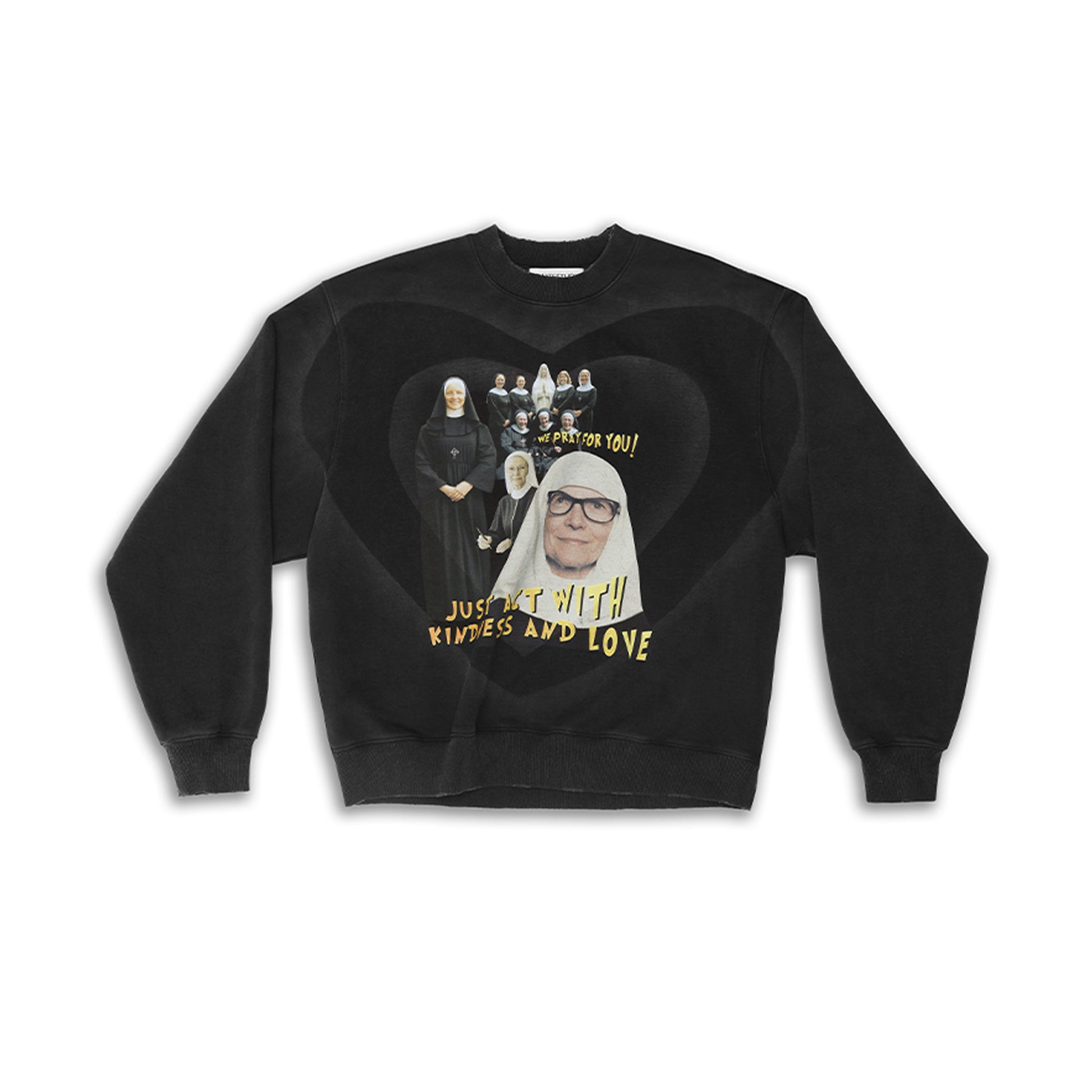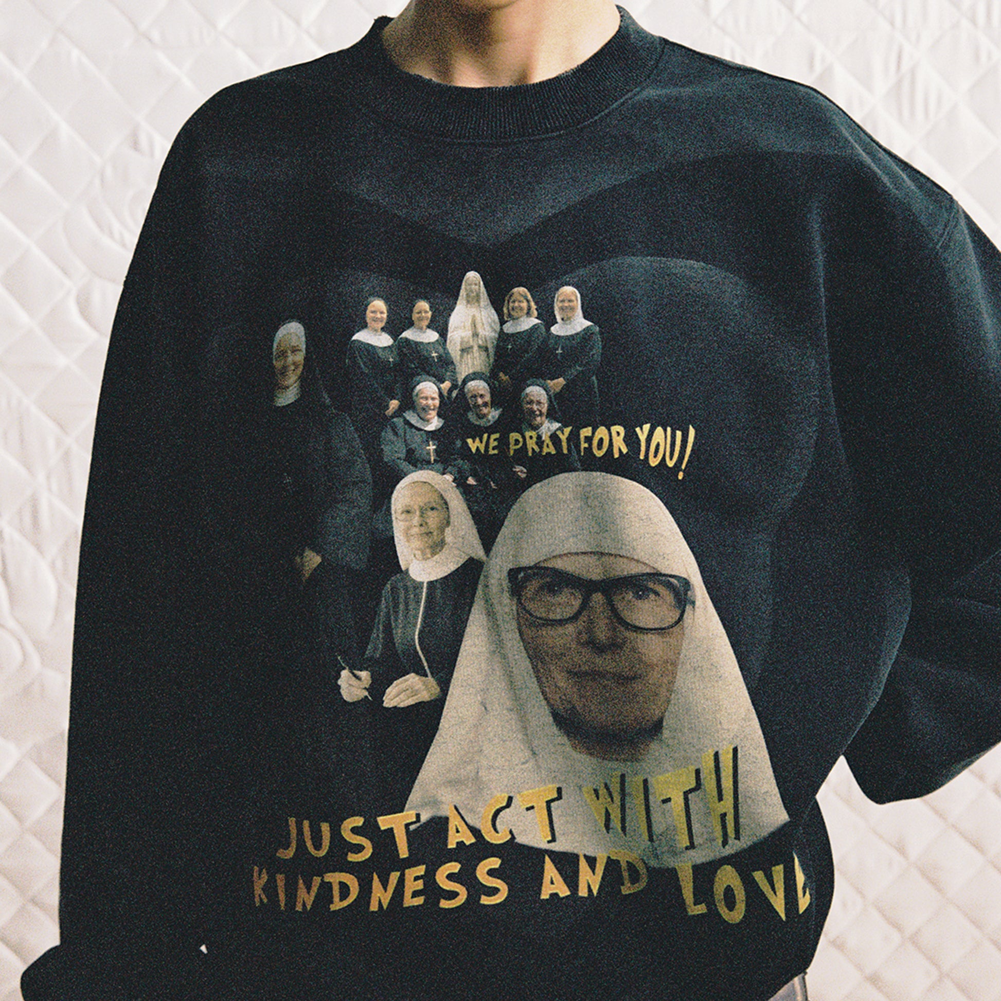 This streetwear essential combines an oversized sweatshirt silhouette with vintage wash effects to define the brand's urban aesthetic. The washed-out color palette and subtle distressing create natural worn-in character, while the voluminous cut ensures comfort and inclusivity. Featuring this season's nun-themed graphic print layered with heart-shaped bleach sprays, the design adds a playful feminine touch that elevates its fashion quotient.