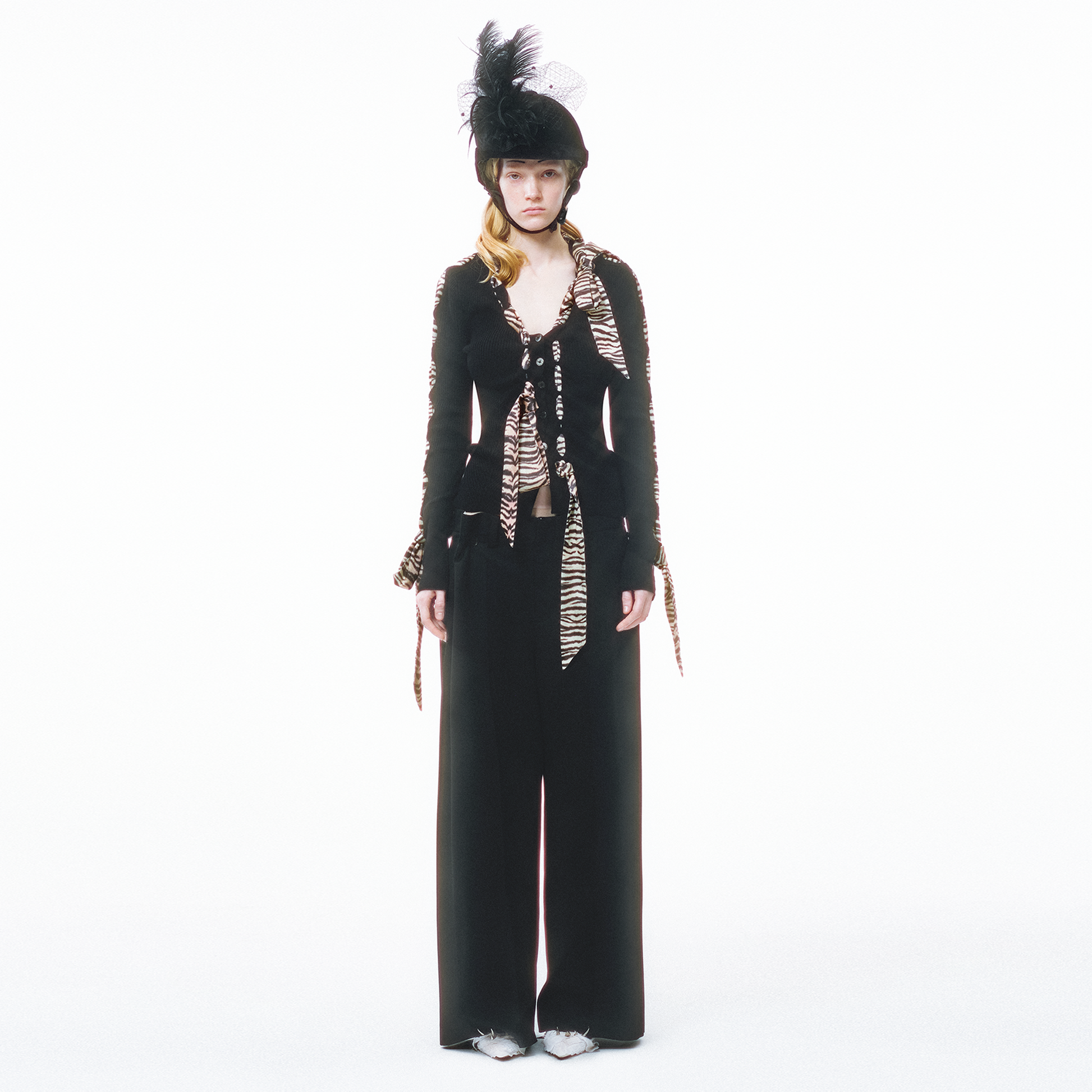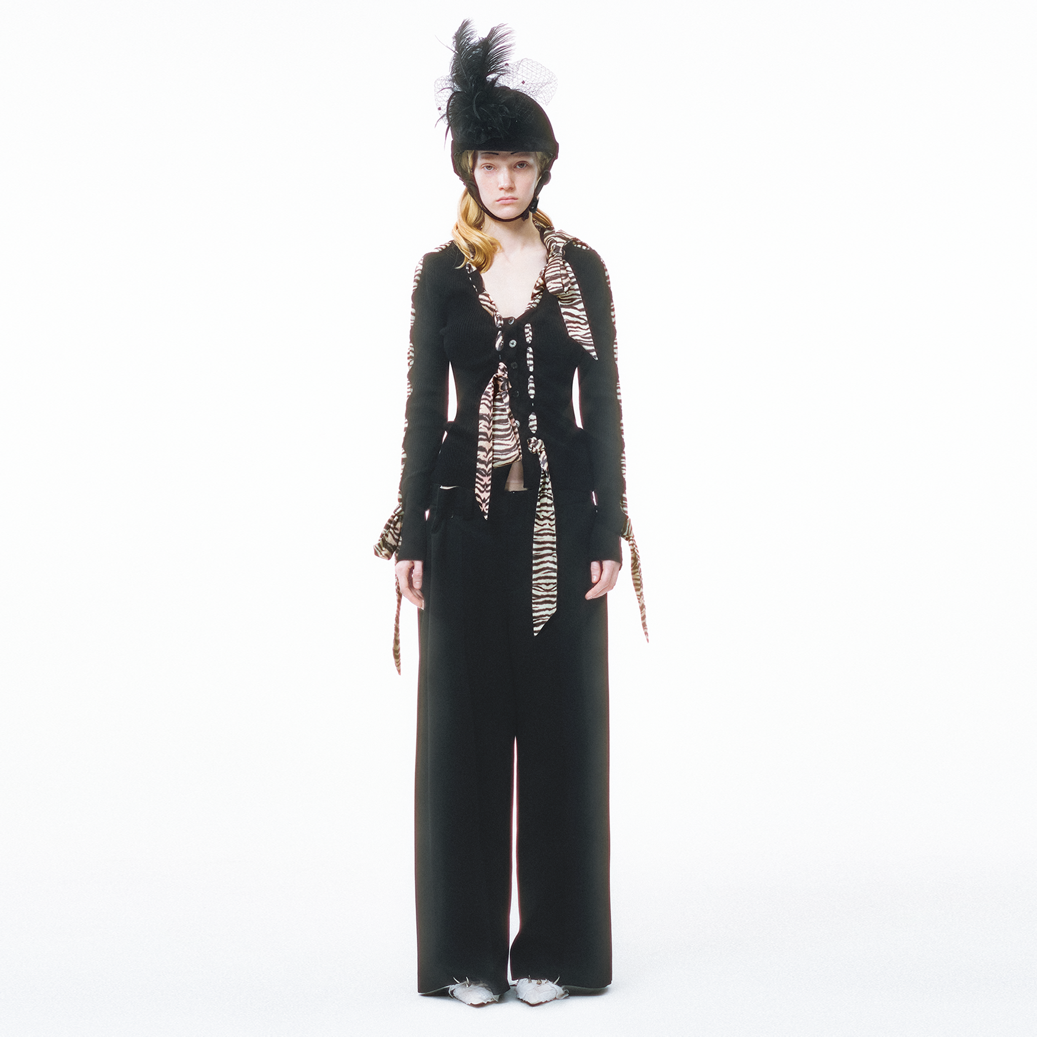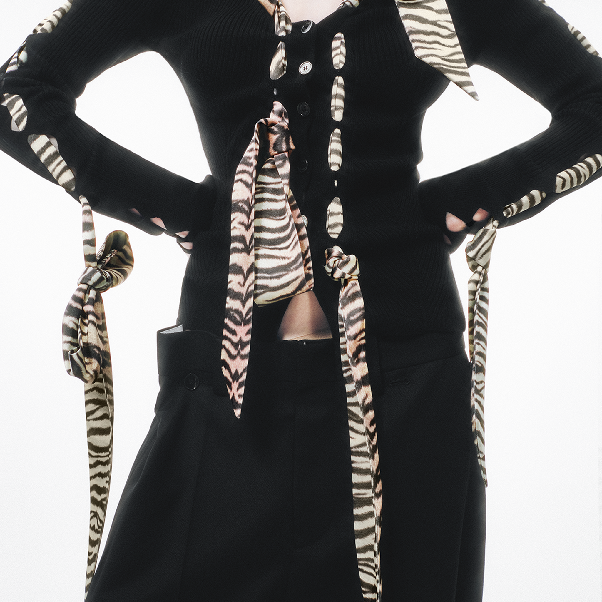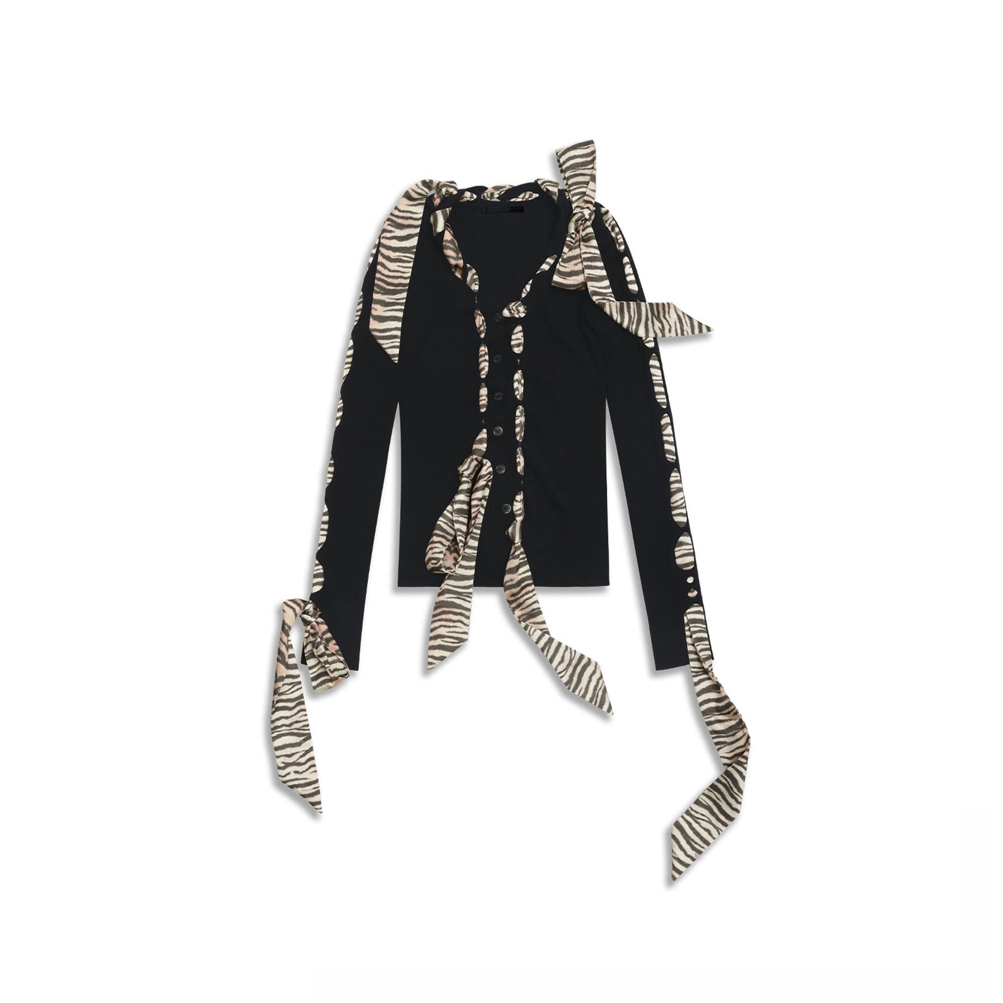 This knit cardigan features a scarf-style trim and structural holes as its key design highlights, cleverly blending soft accents with a practical knitted structure. The main body is made from 100% Merino wool with a fiber fineness of 19.5 microns (certified as Extra Fine by The Woolmark Company), offering lightness, warmth, and a soft, comfortable feel against the skin. The V-neck design elongates the neckline, making the overall silhouette appear lighter and more slender. The cardigan is adorned with knitted holes of varying sizes and comes with detachable silk-blend ribbons. The three ribbons can be freely threaded through the holes, allowing for multiple styling possibilities.