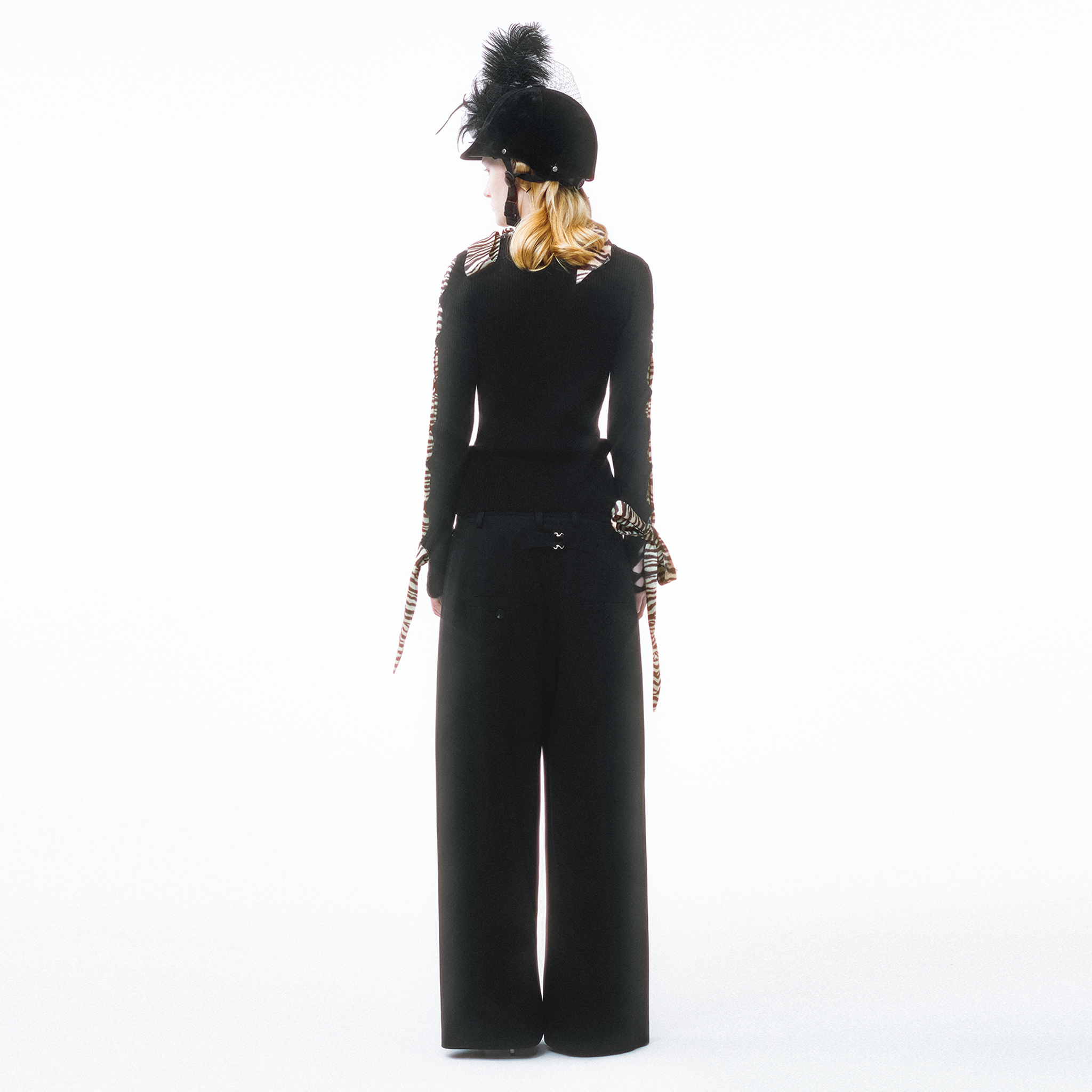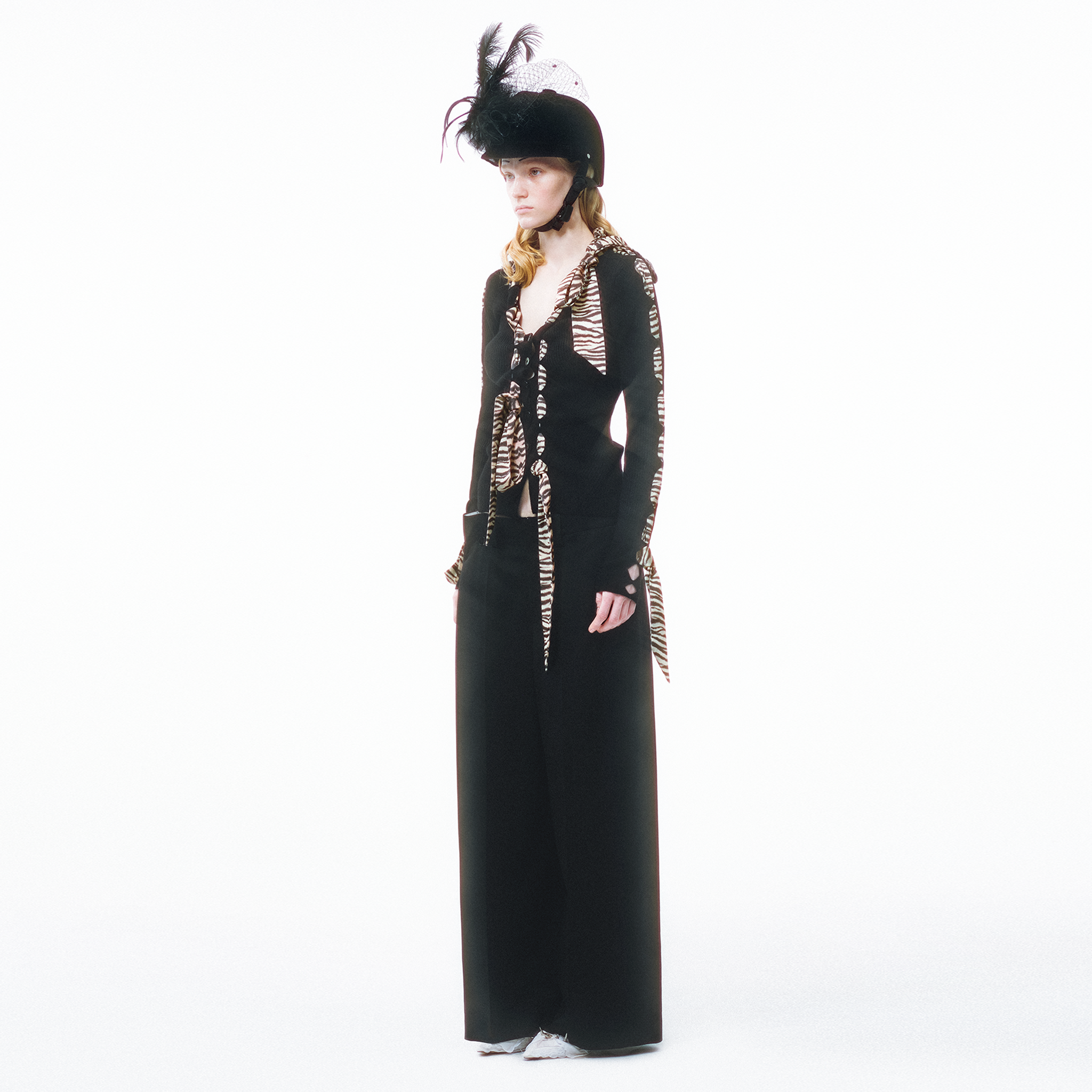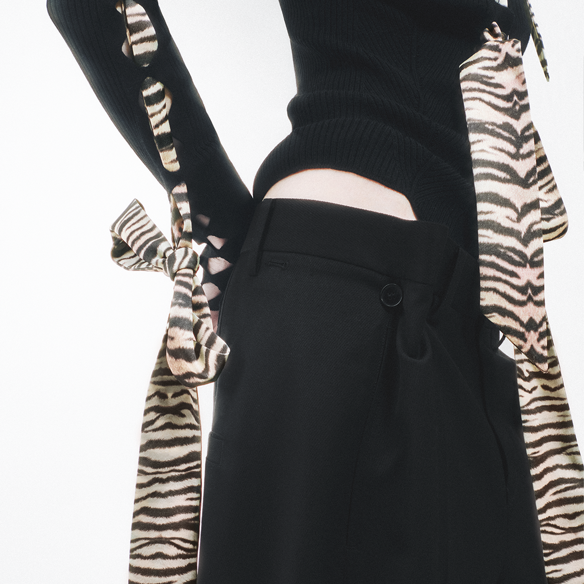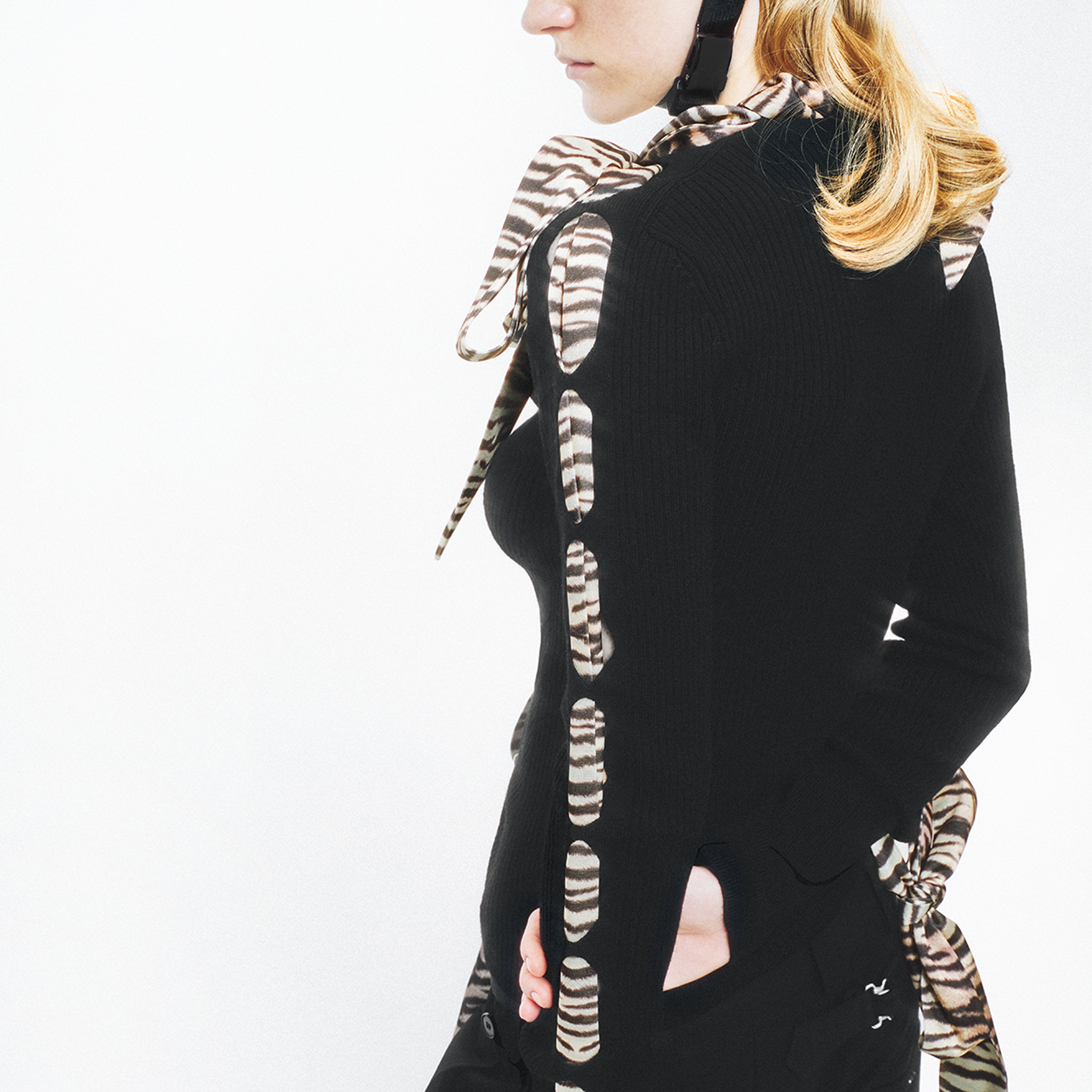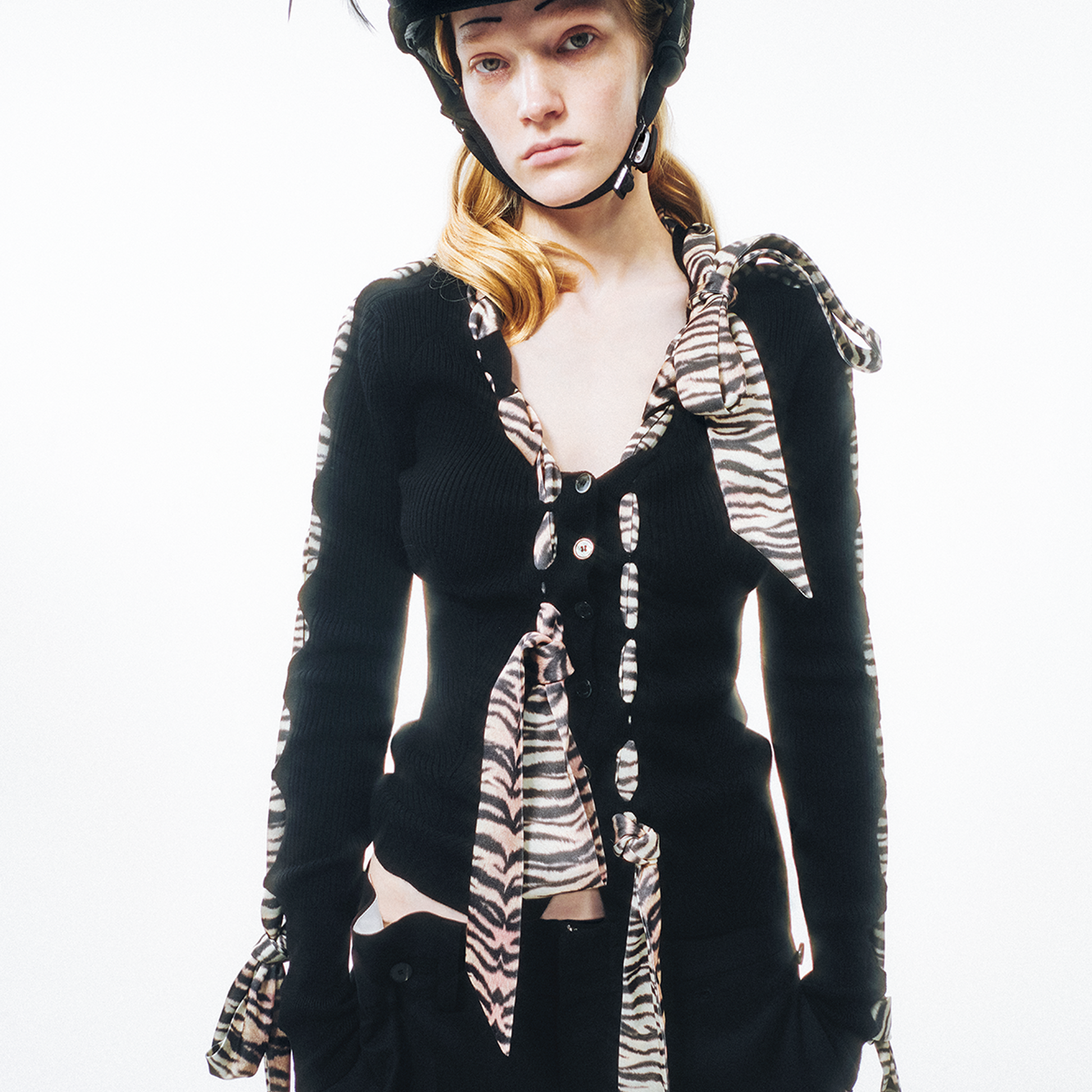 This knit cardigan features a scarf-style trim and structural holes as its key design highlights, cleverly blending soft accents with a practical knitted structure. The main body is made from 100% Merino wool with a fiber fineness of 19.5 microns (certified as Extra Fine by The Woolmark Company), offering lightness, warmth, and a soft, comfortable feel against the skin. The V-neck design elongates the neckline, making the overall silhouette appear lighter and more slender. The cardigan is adorned with knitted holes of varying sizes and comes with detachable silk-blend ribbons. The three ribbons can be freely threaded through the holes, allowing for multiple styling possibilities.