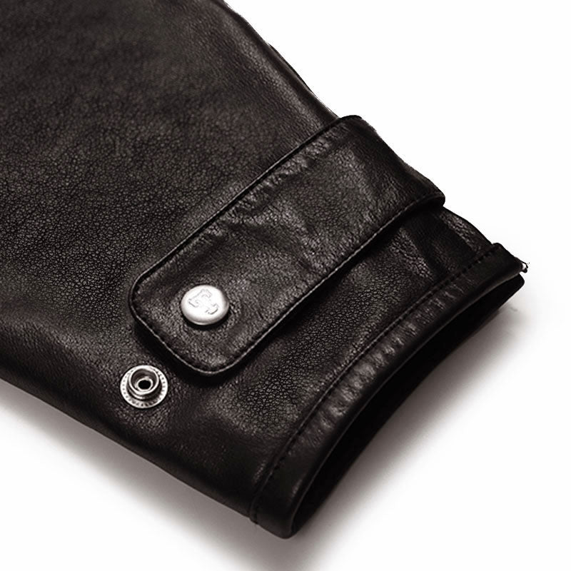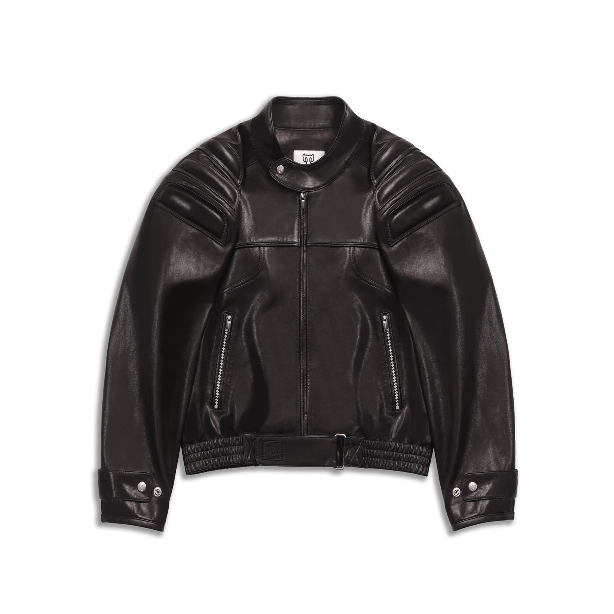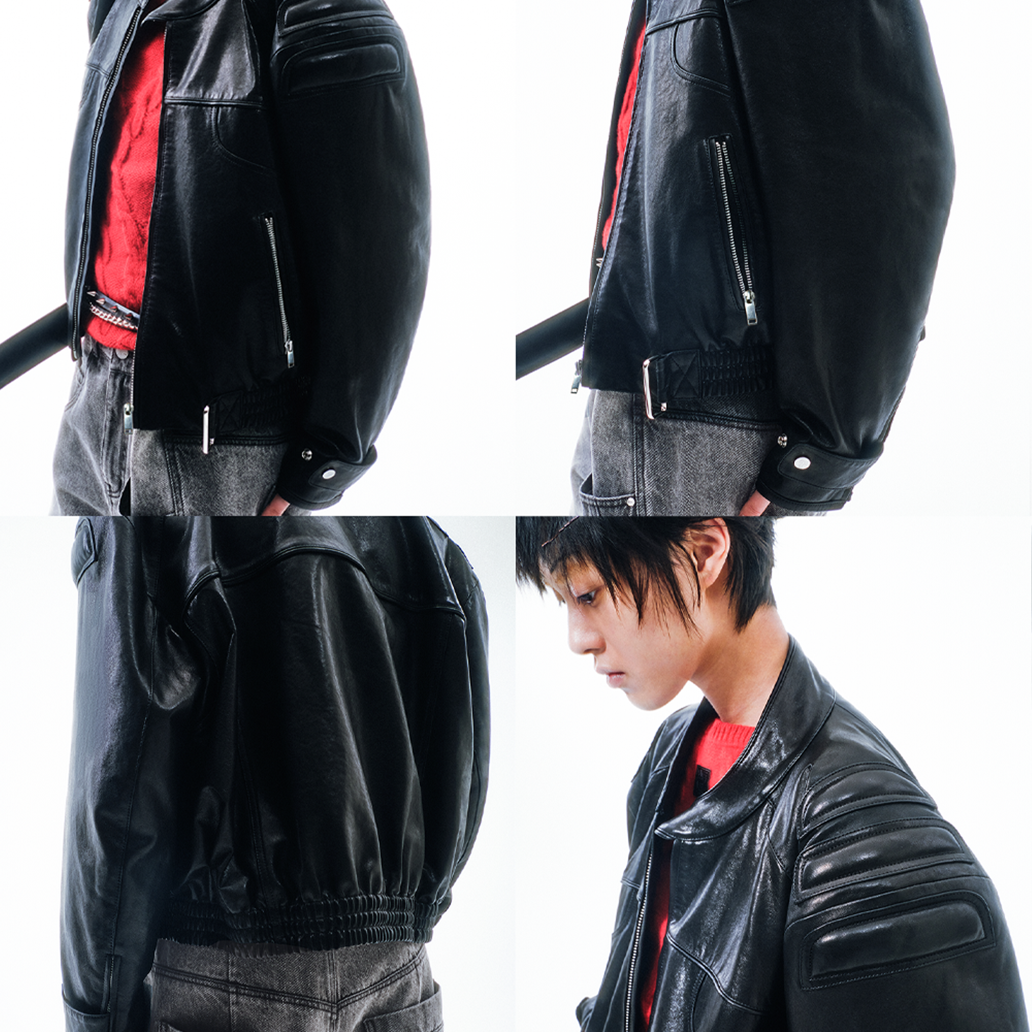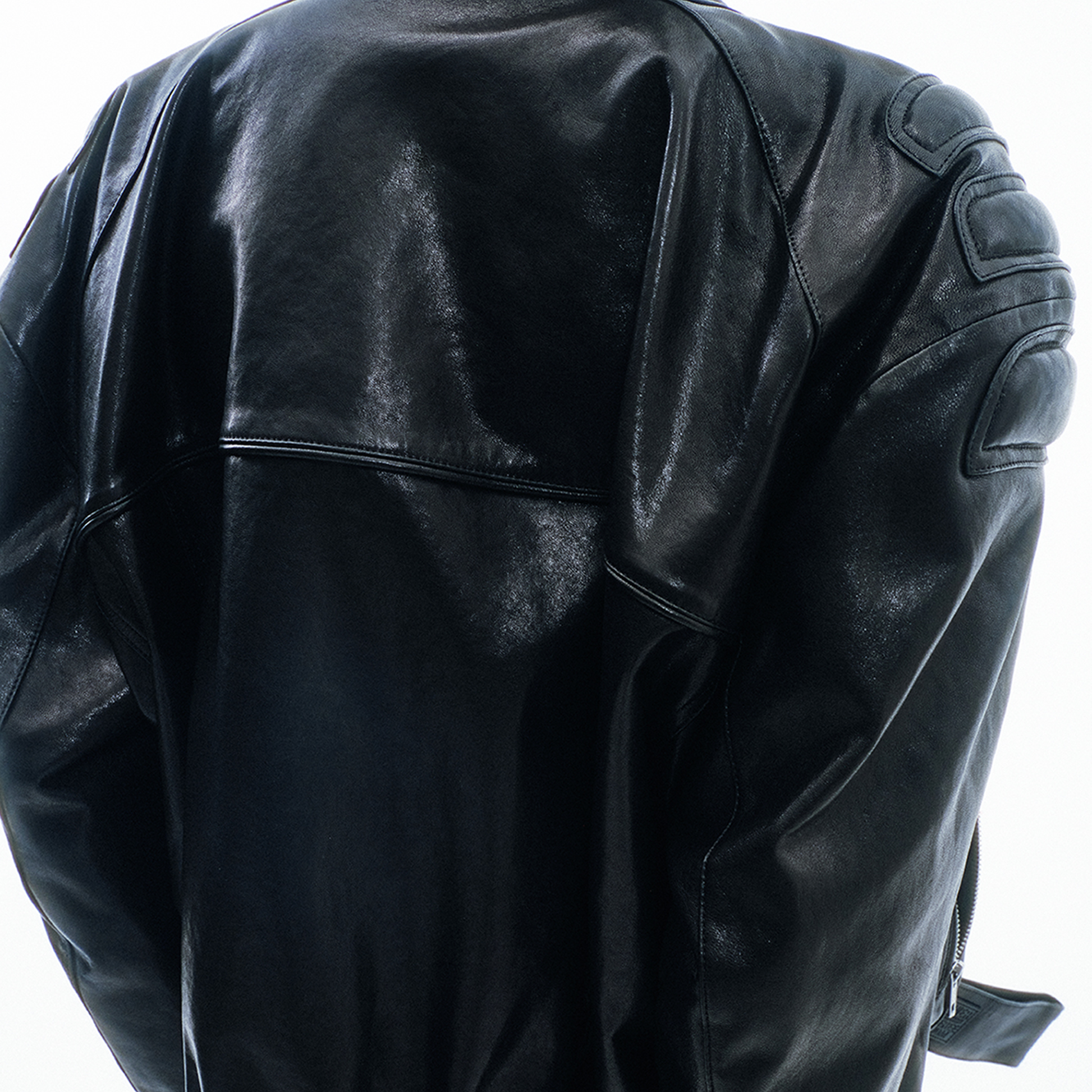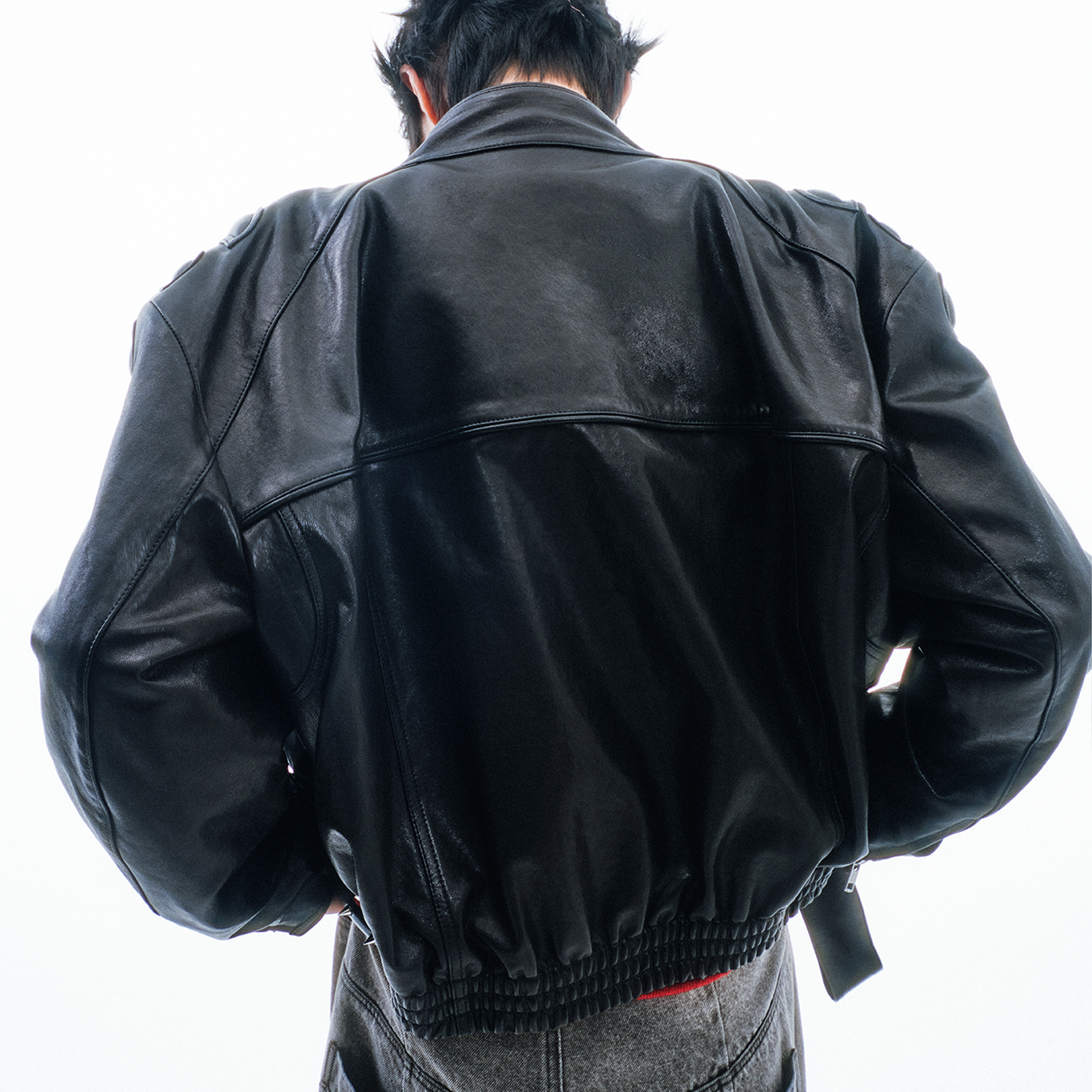 Inspired by vintage motorcycle culture, this black washed waxed leather jacket is crafted from soft sheepskin that undergoes a tumbling process, resulting in natural wrinkles and a supple, soft texture. The oversized silhouette blends a casual yet powerful visual impact, while padded shoulders enhance the motorcycle-inspired aesthetic and structural strength.