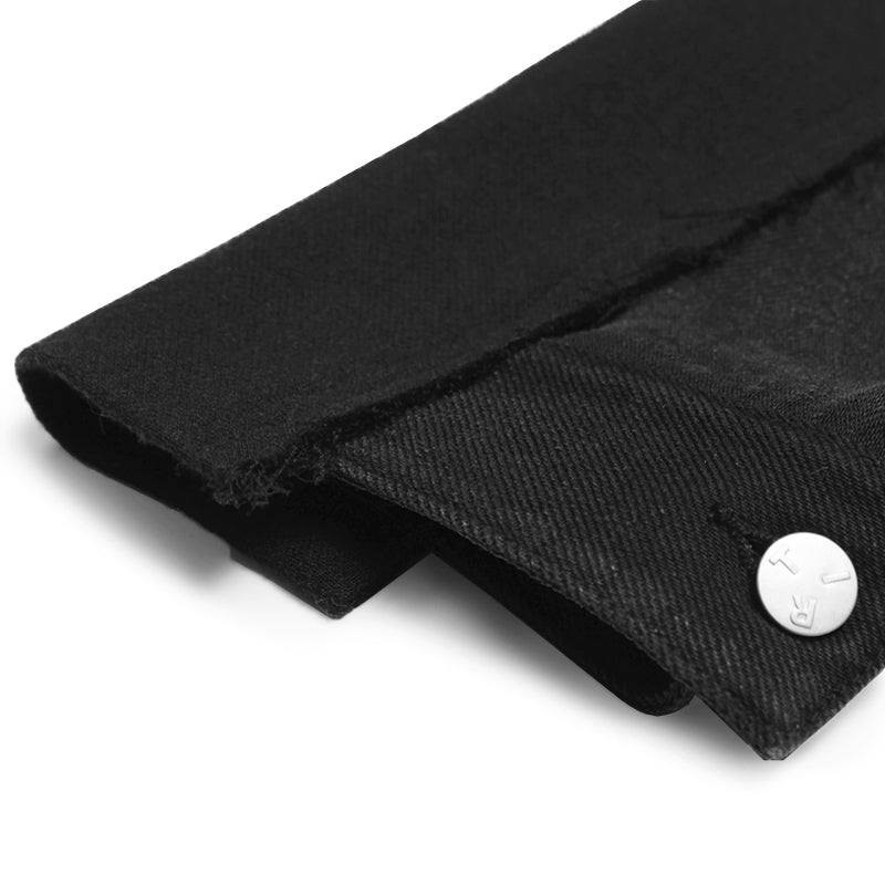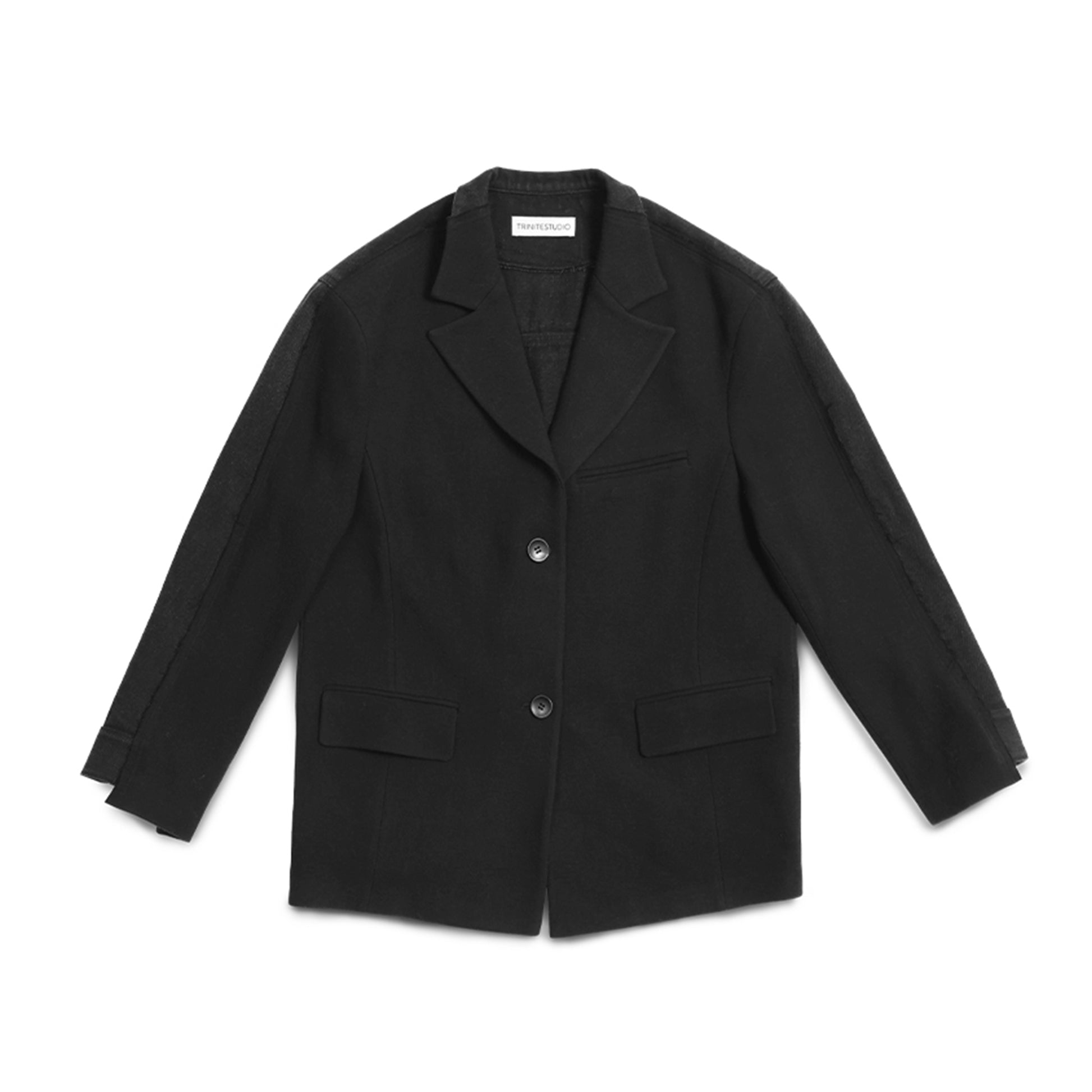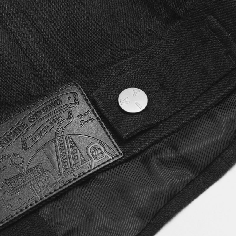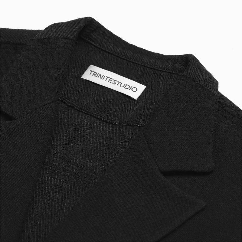 This blazer reflects TRINITE’s remade design philosophy with a unique mix of fabrics. The front is made from structured imported wool-blend fabric, pre-treated for a sharp silhouette. The back uses drapey twill denim with Tencel, featuring a washed, vintage-faded effect. The black base ensures versatility with a bold, rugged edge.