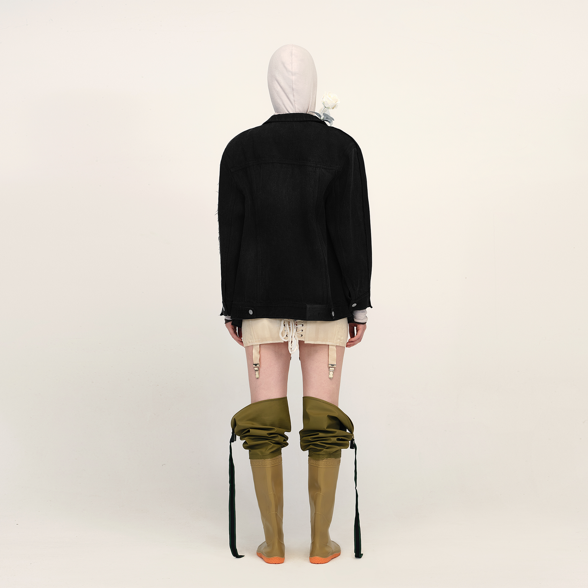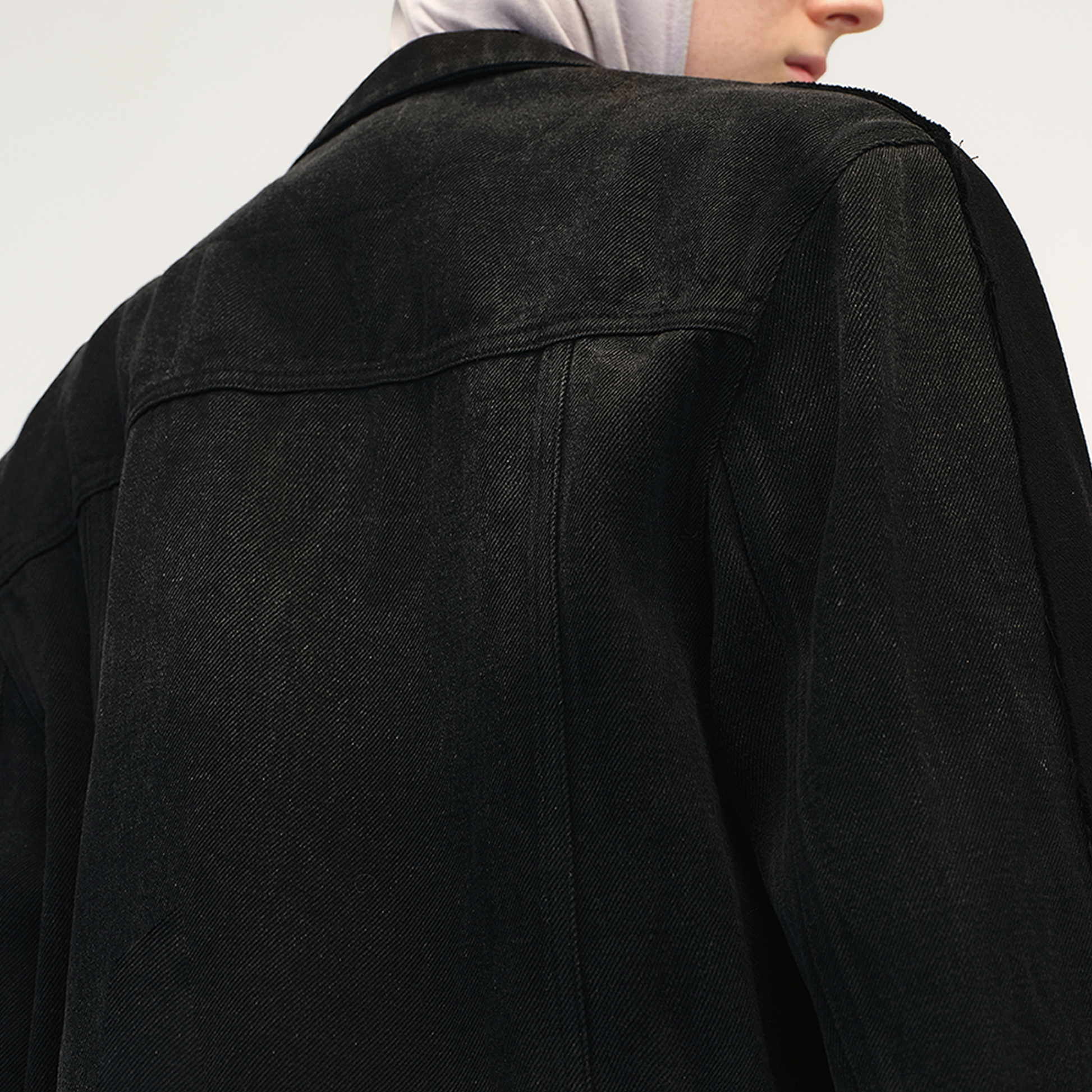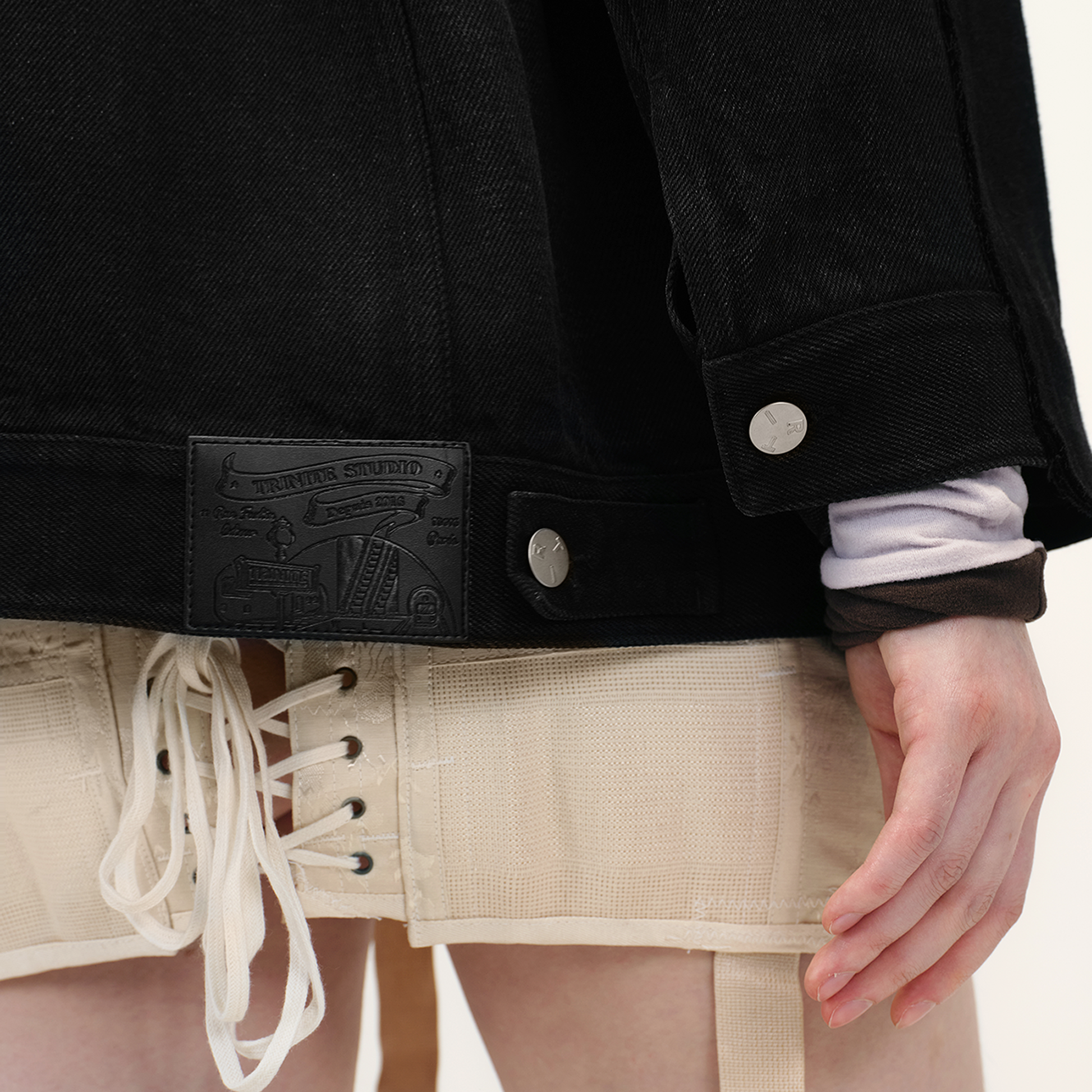 This blazer reflects TRINITE’s remade design philosophy with a unique mix of fabrics. The front is made from structured imported wool-blend fabric, pre-treated for a sharp silhouette. The back uses drapey twill denim with Tencel, featuring a washed, vintage-faded effect. The black base ensures versatility with a bold, rugged edge.