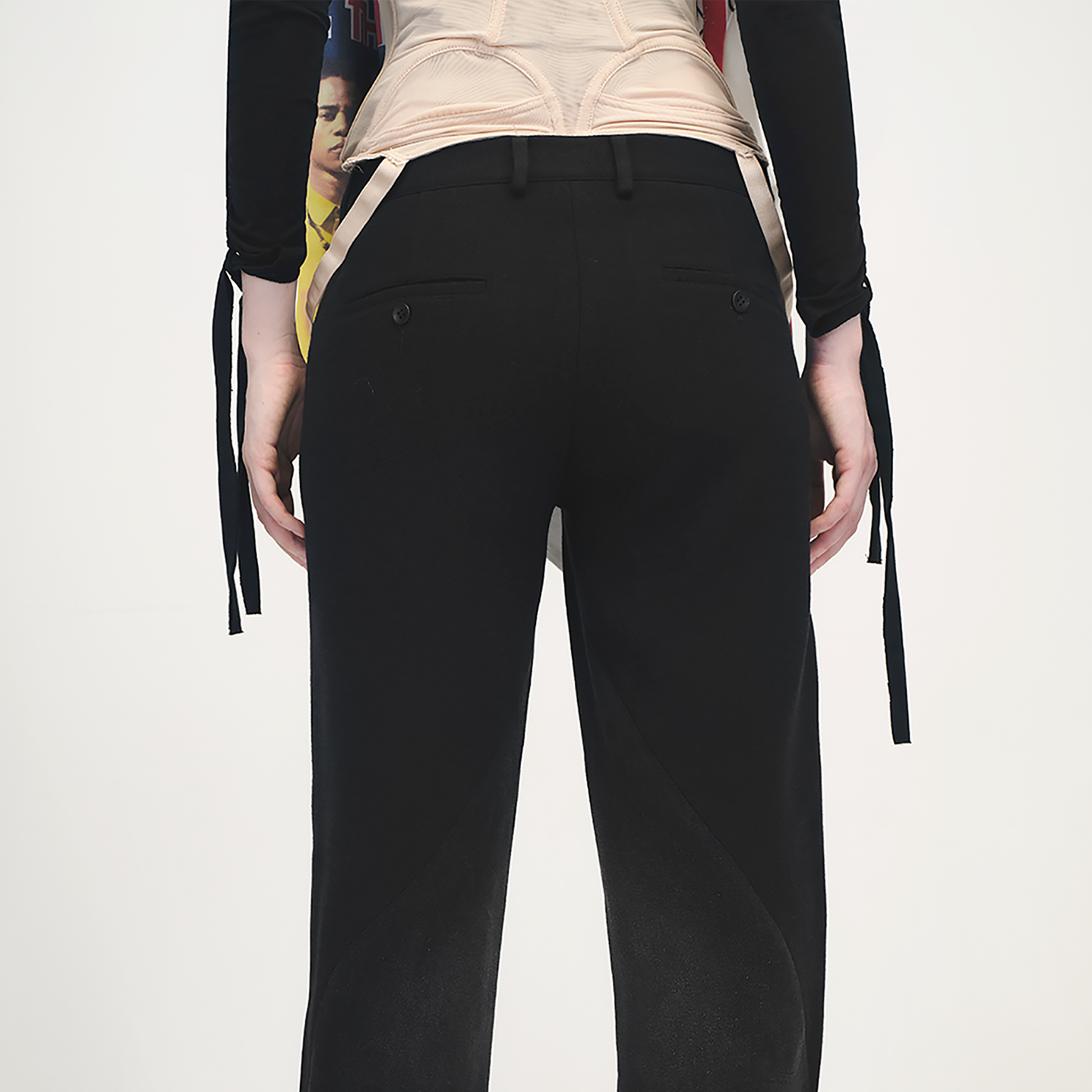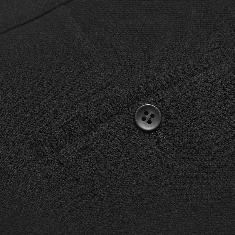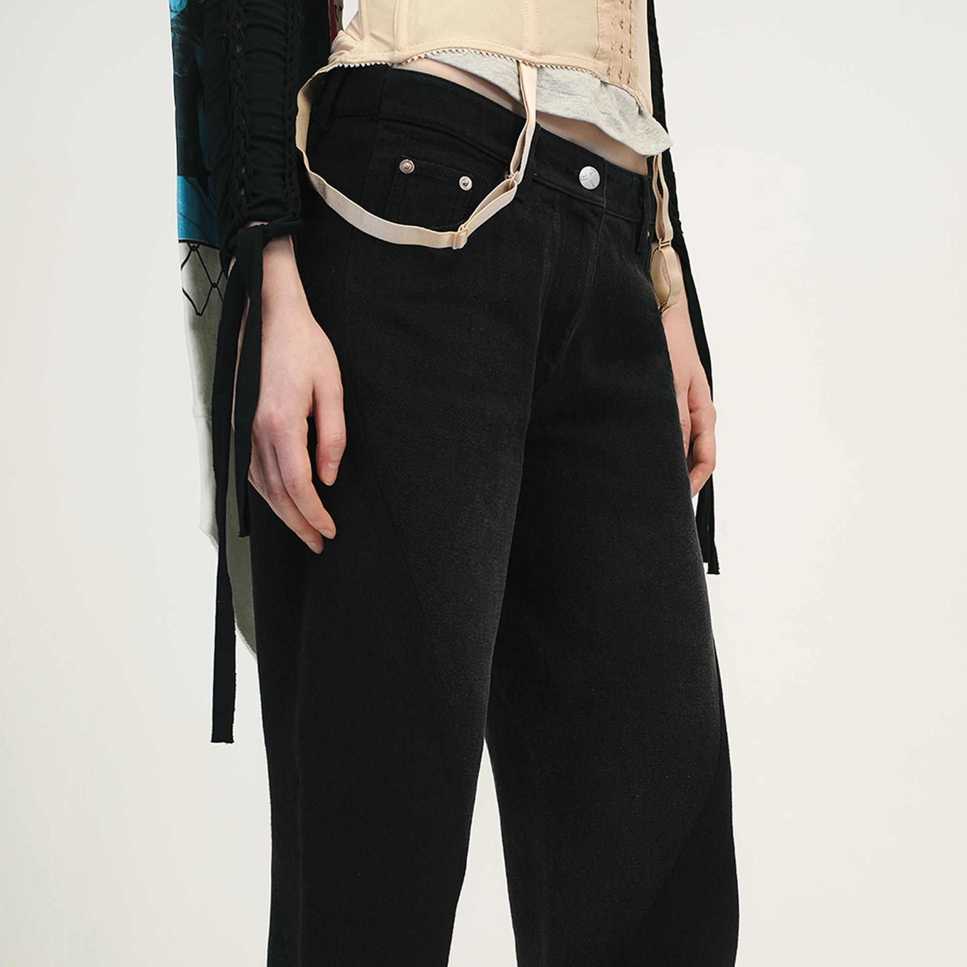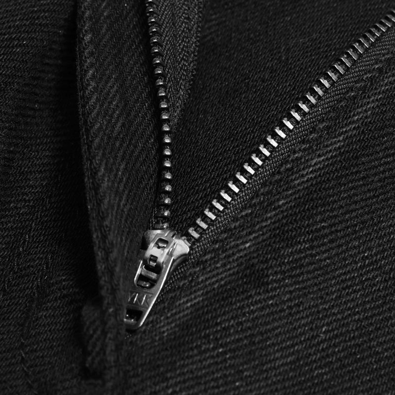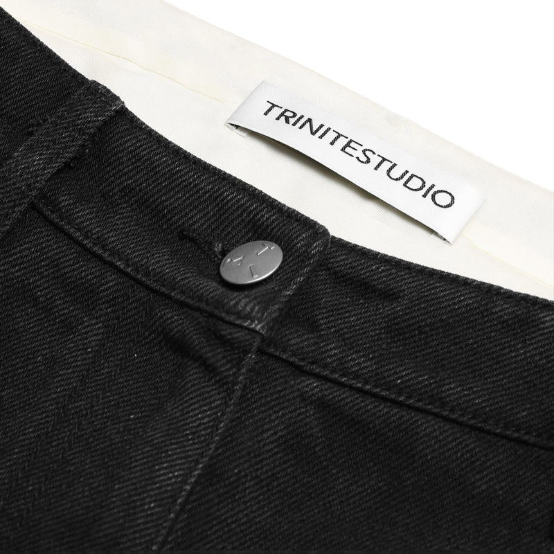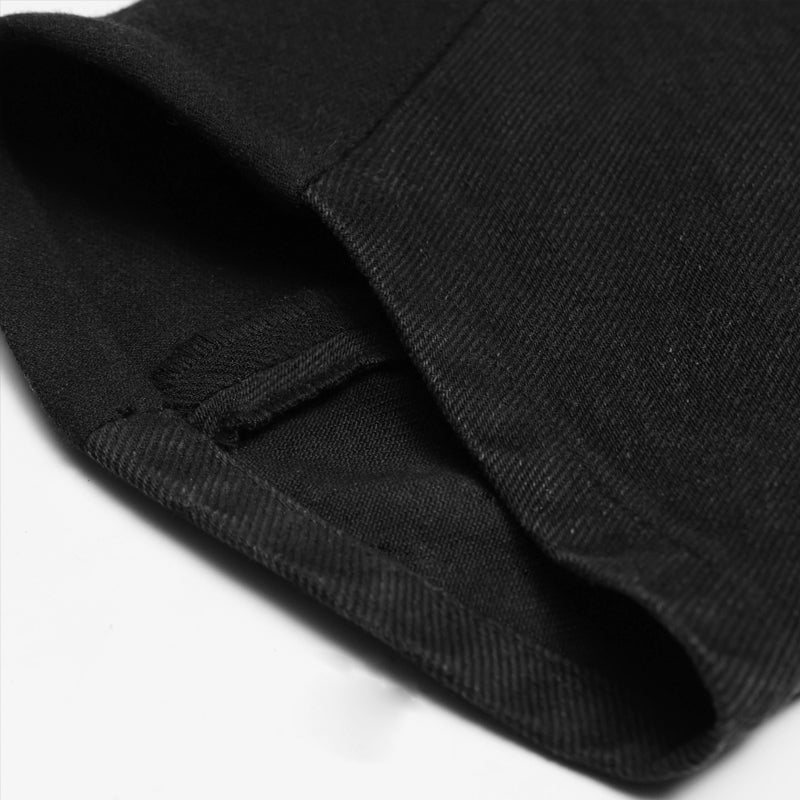 These trousers embody the brand’s remade design concept. The front is made from coarse twill denim with Tencel, offering natural drape and a smooth, structured feel. After a wash treatment, the fabric achieves a worn-in, faded look, mimicking the natural wear of denim over time. The back is crafted from imported blended wool for a substantial feel, with a half lining for added comfort. The black base makes it easy to pair, combining a minimalist aesthetic with a rugged edge.