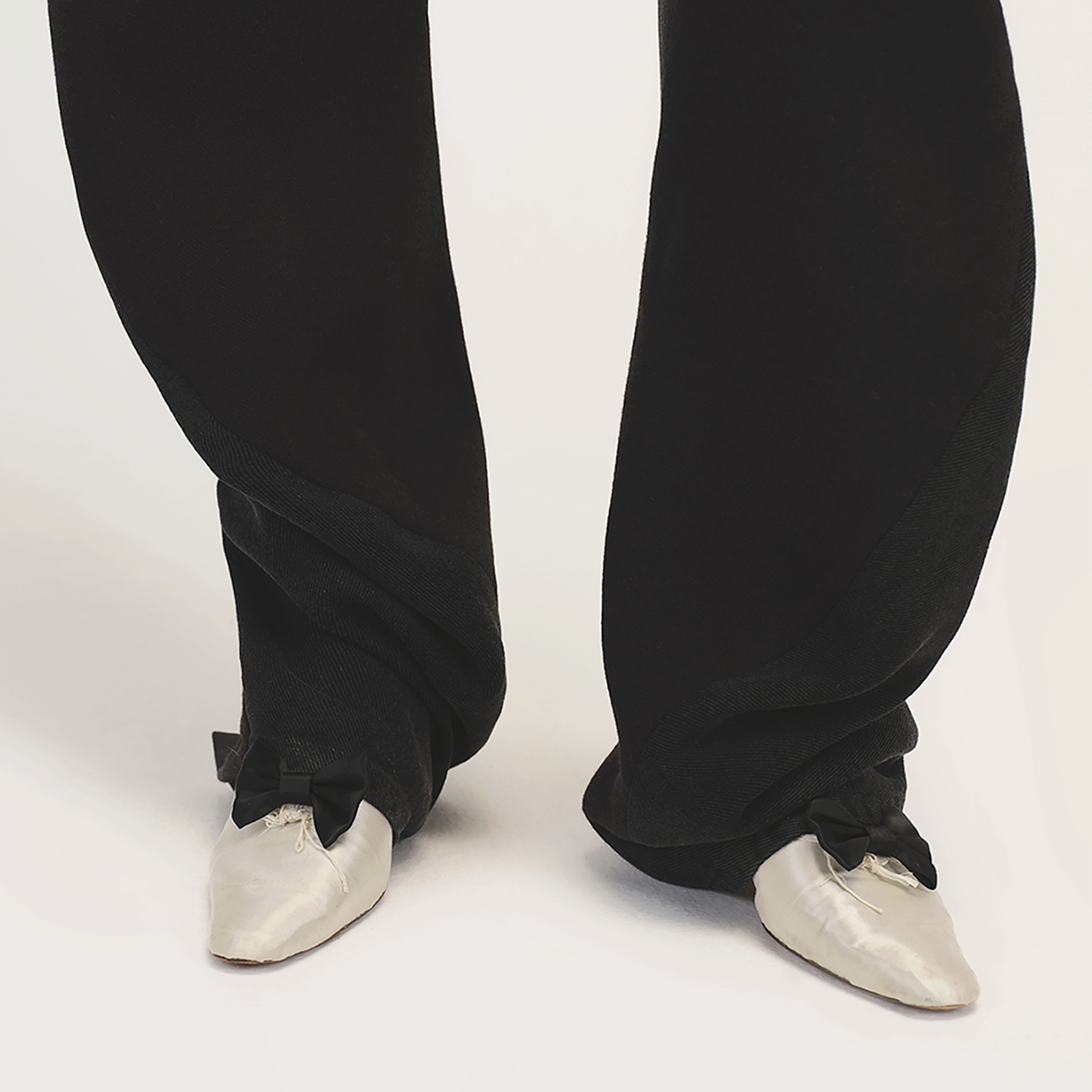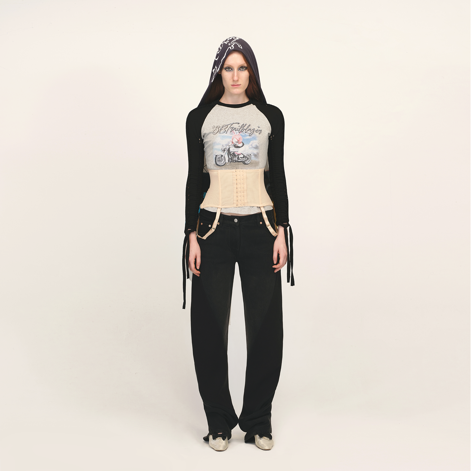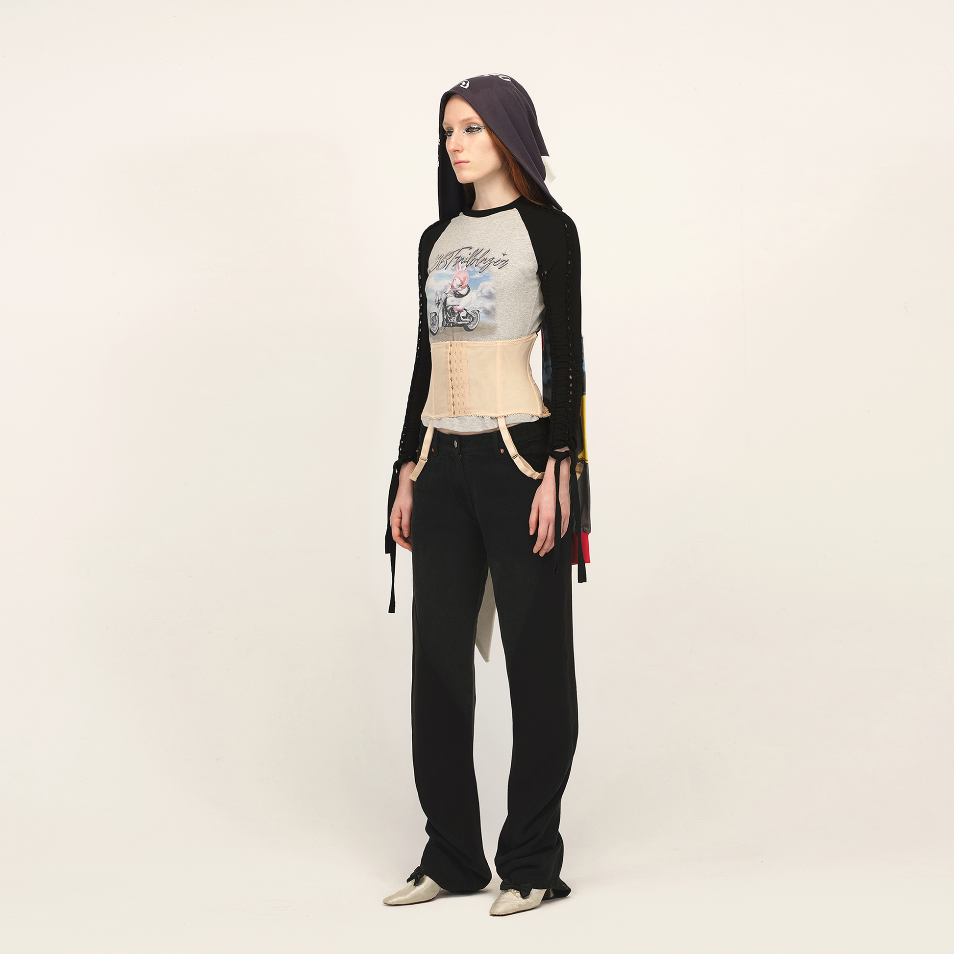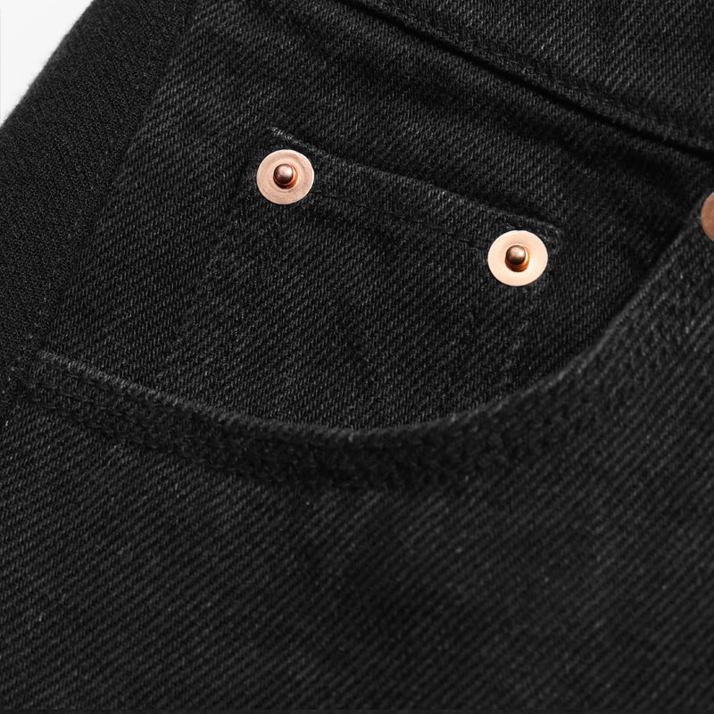 These trousers embody the brand’s remade design concept. The front is made from coarse twill denim with Tencel, offering natural drape and a smooth, structured feel. After a wash treatment, the fabric achieves a worn-in, faded look, mimicking the natural wear of denim over time. The back is crafted from imported blended wool for a substantial feel, with a half lining for added comfort. The black base makes it easy to pair, combining a minimalist aesthetic with a rugged edge.