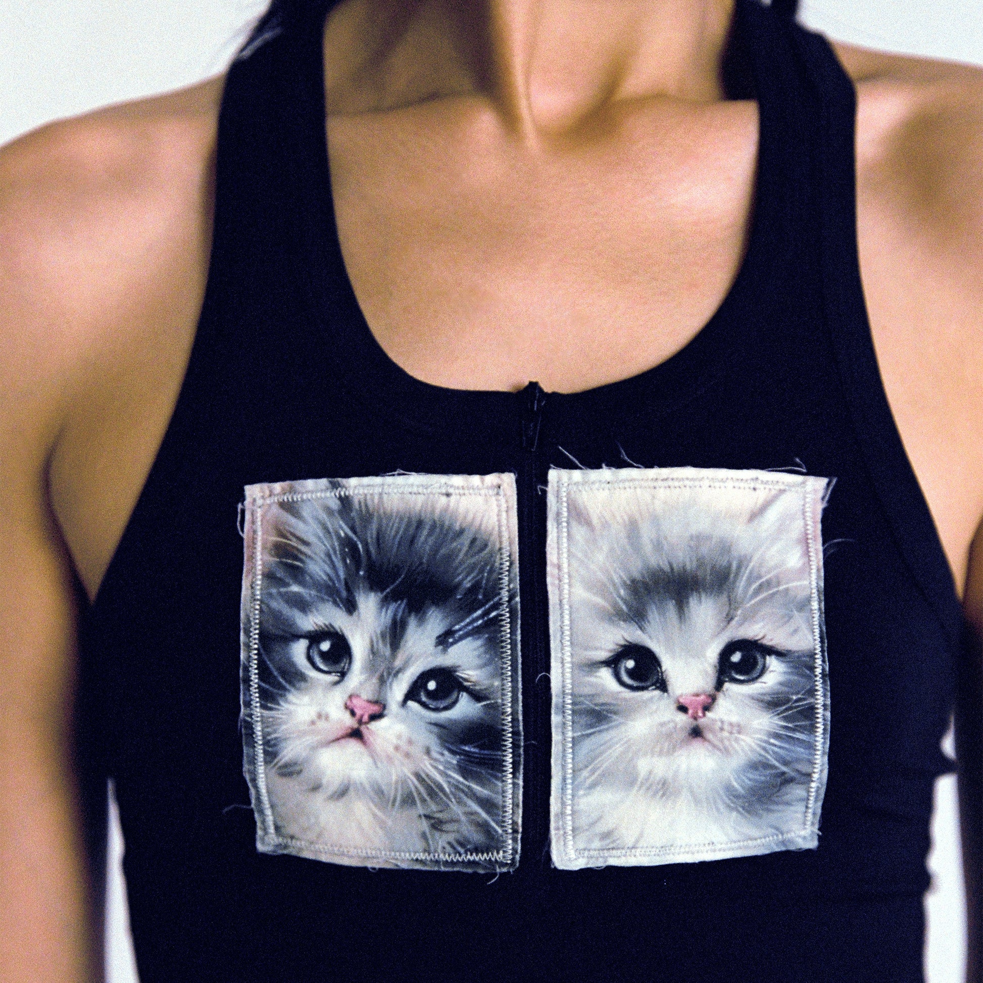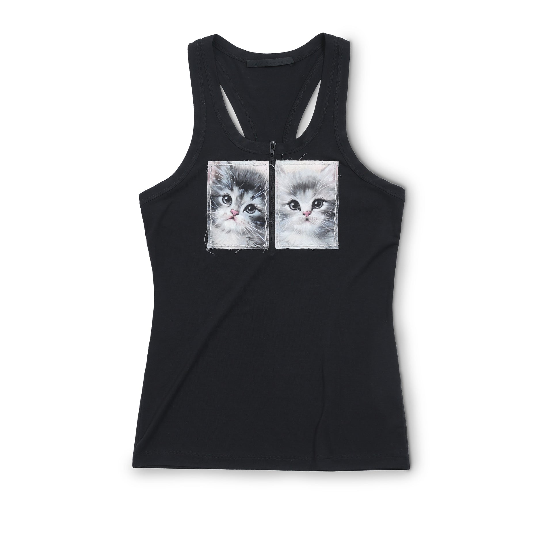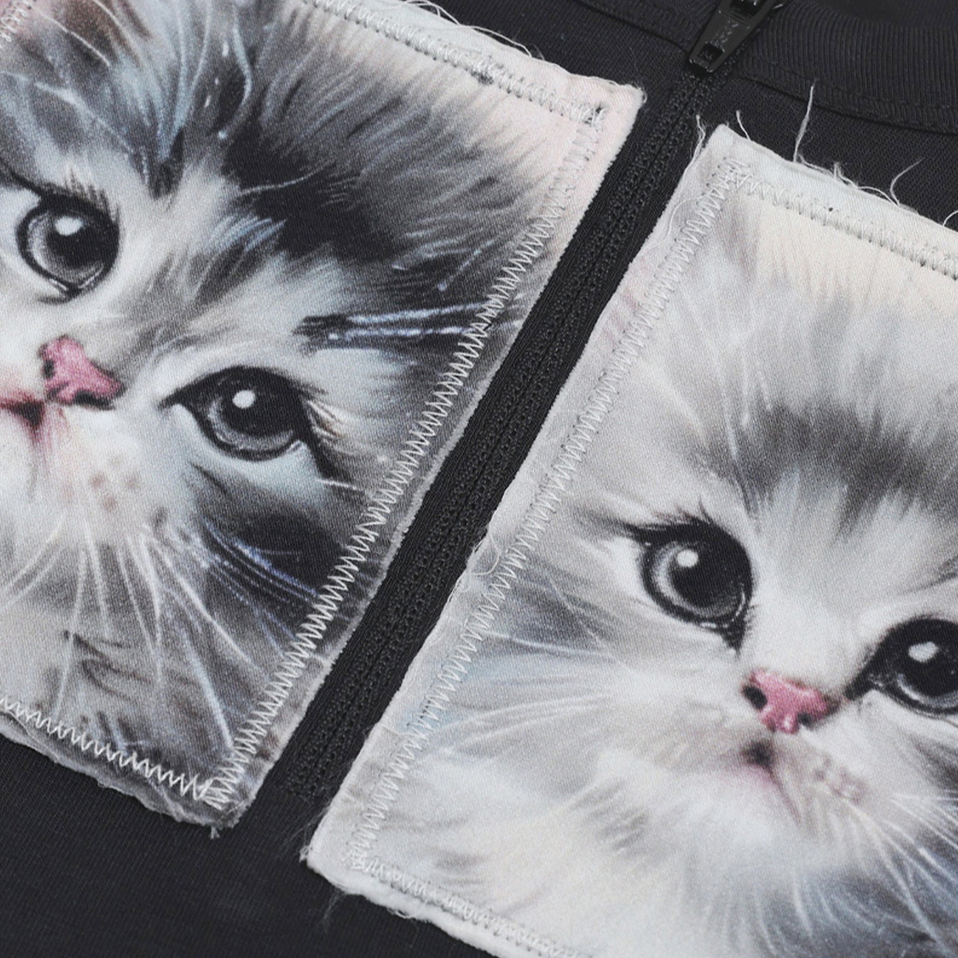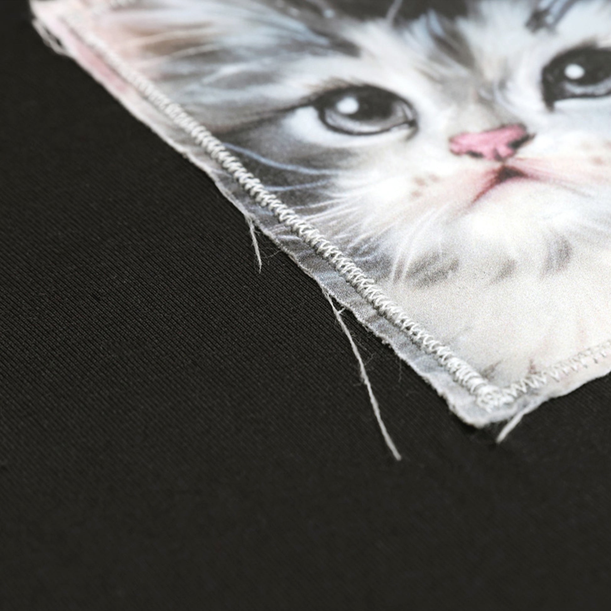 This top uses modal fabric known for its excellent elasticity, softness, smoothness, skin-friendliness, and breathability. The front chest patch features a cute baby cat vintage pattern with zigzag stitching, showcasing fine craftsmanship.