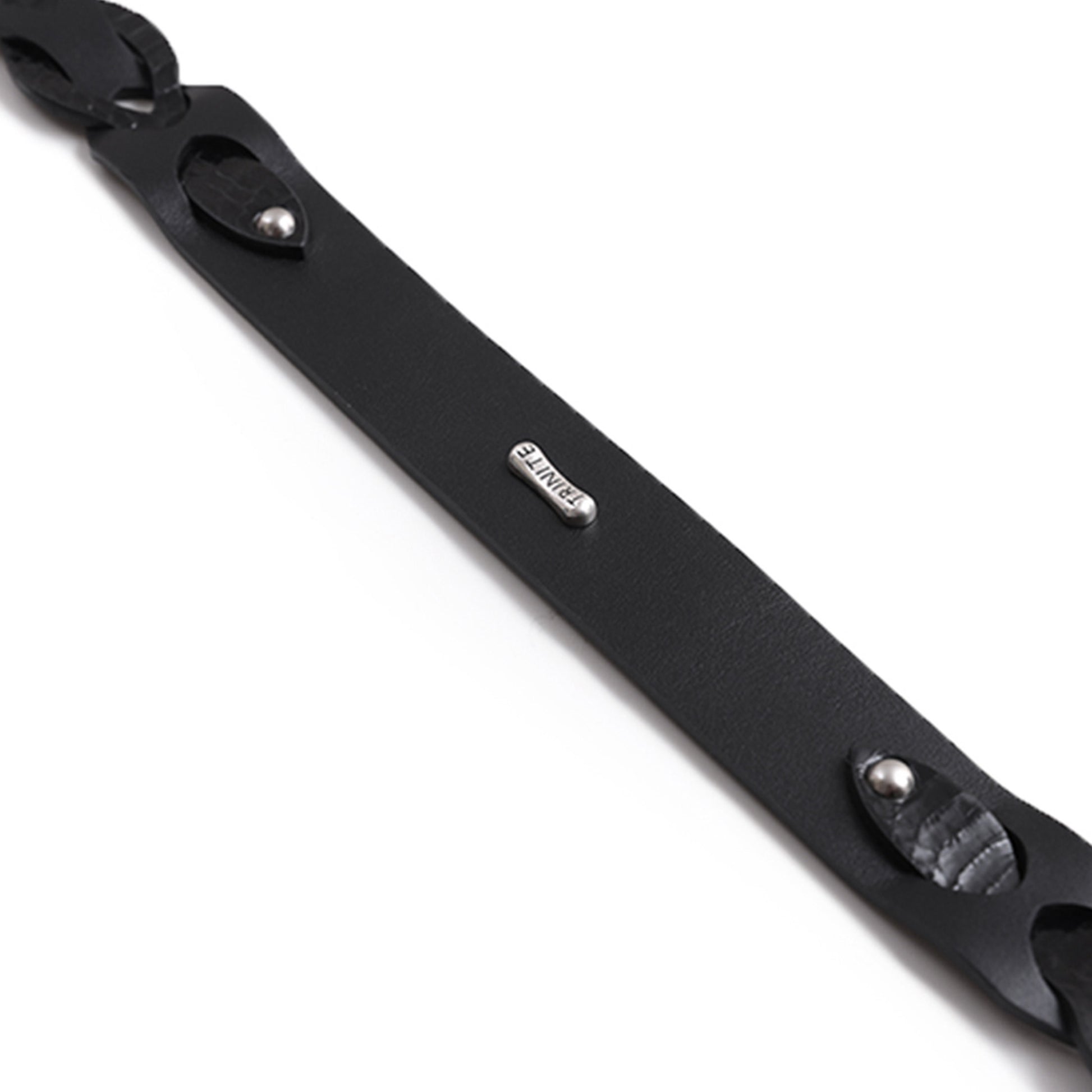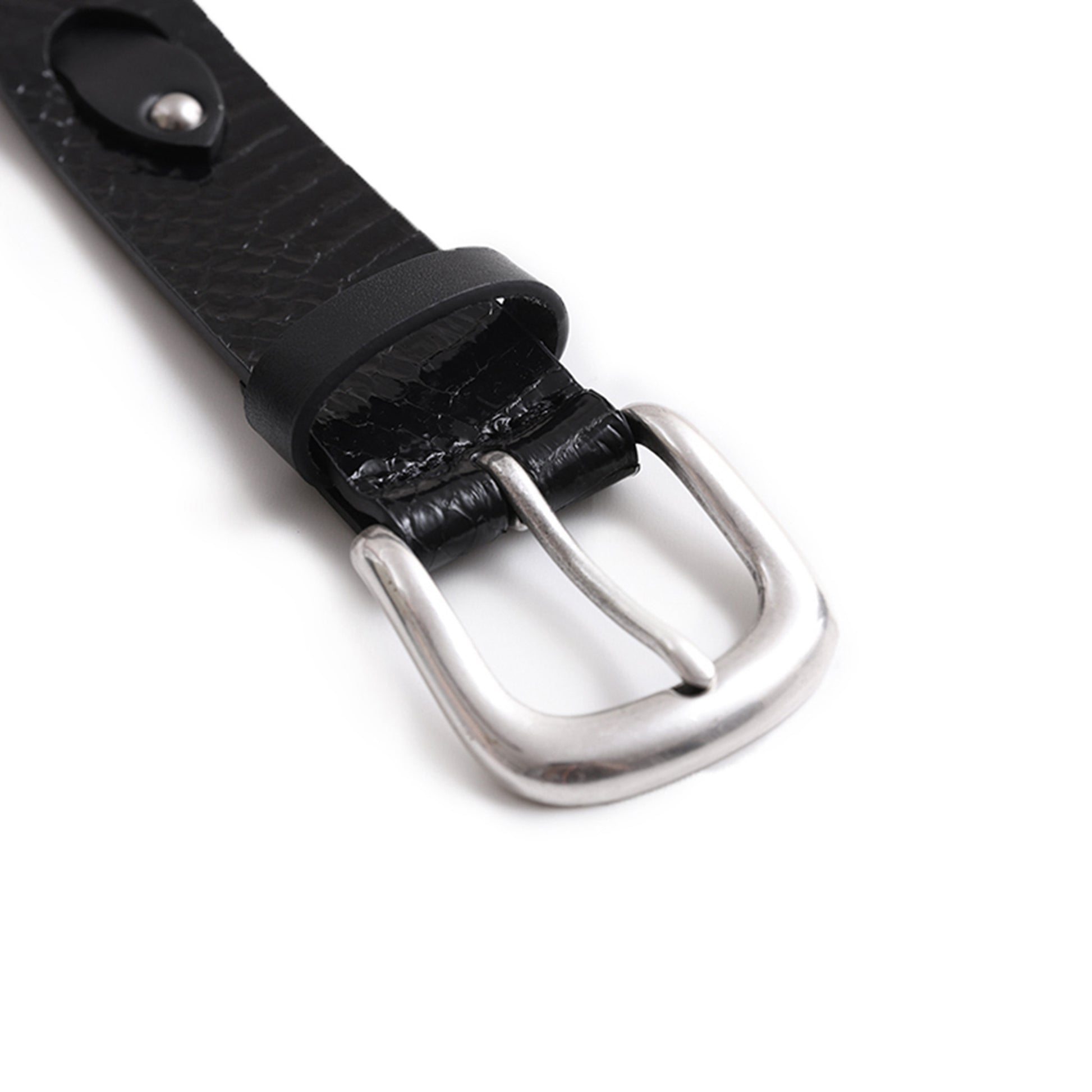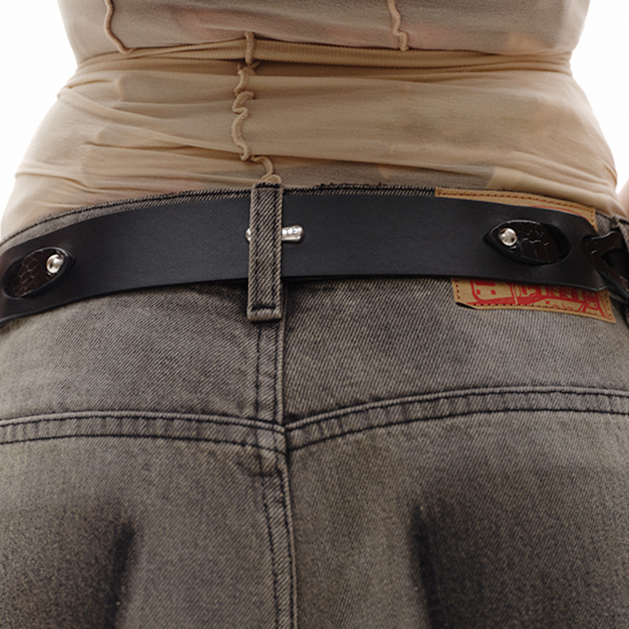 - Custom distressed silver buckle, rivets, and logo-decorated studs
