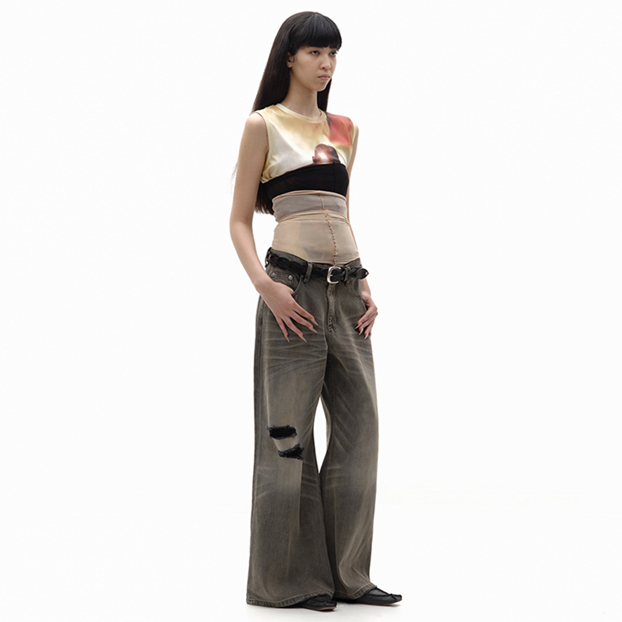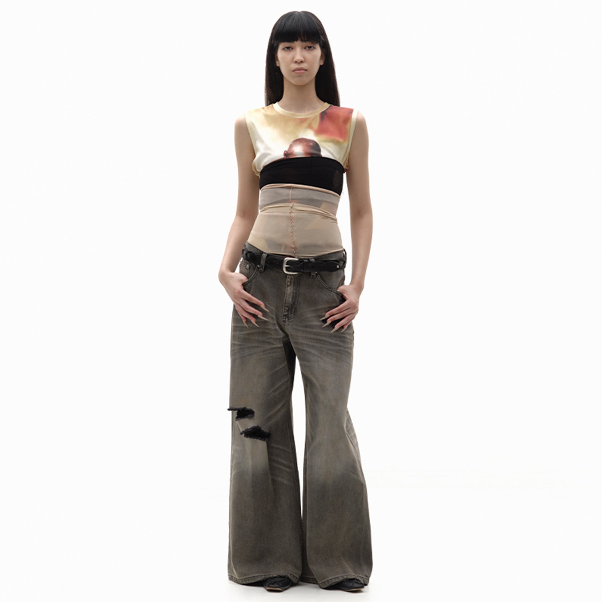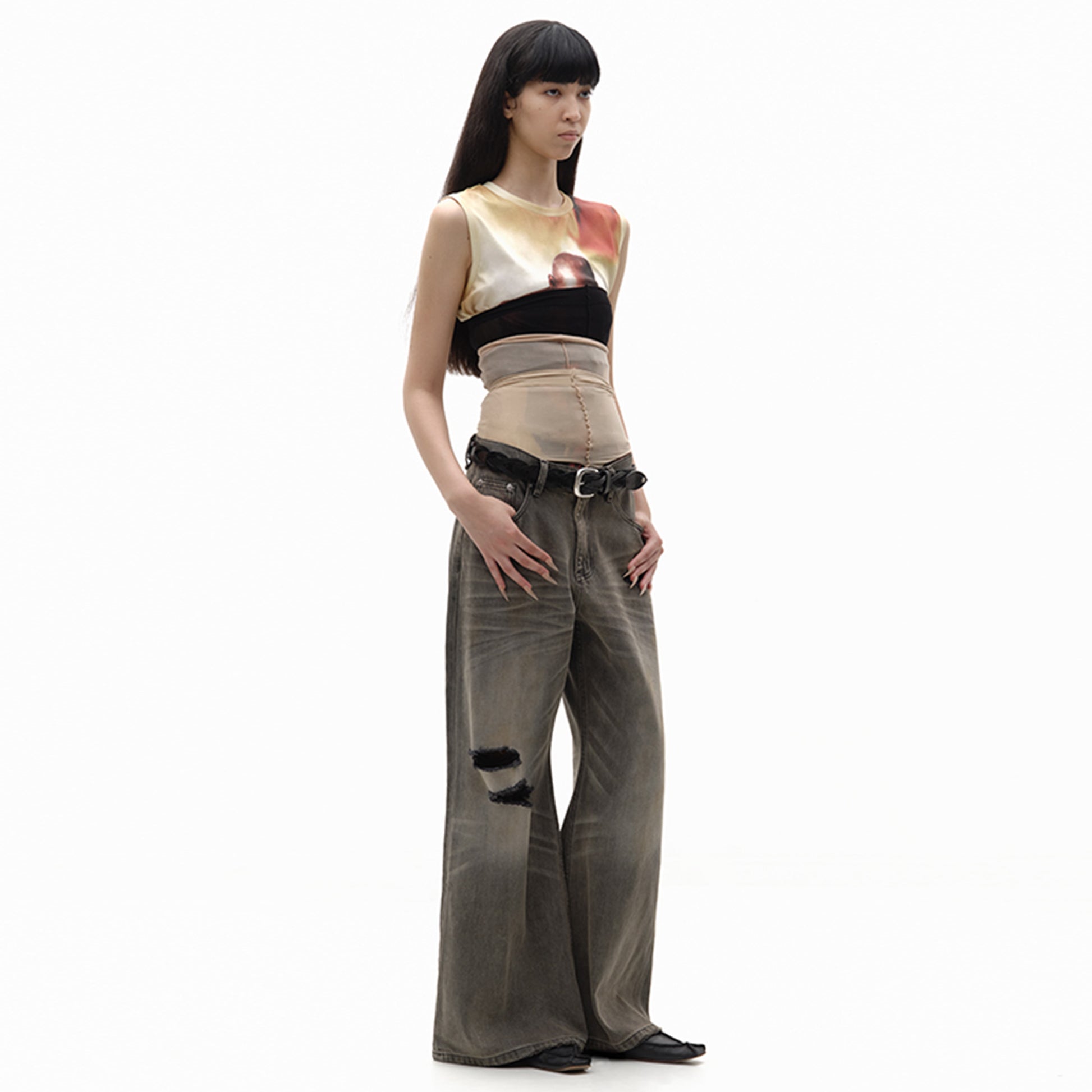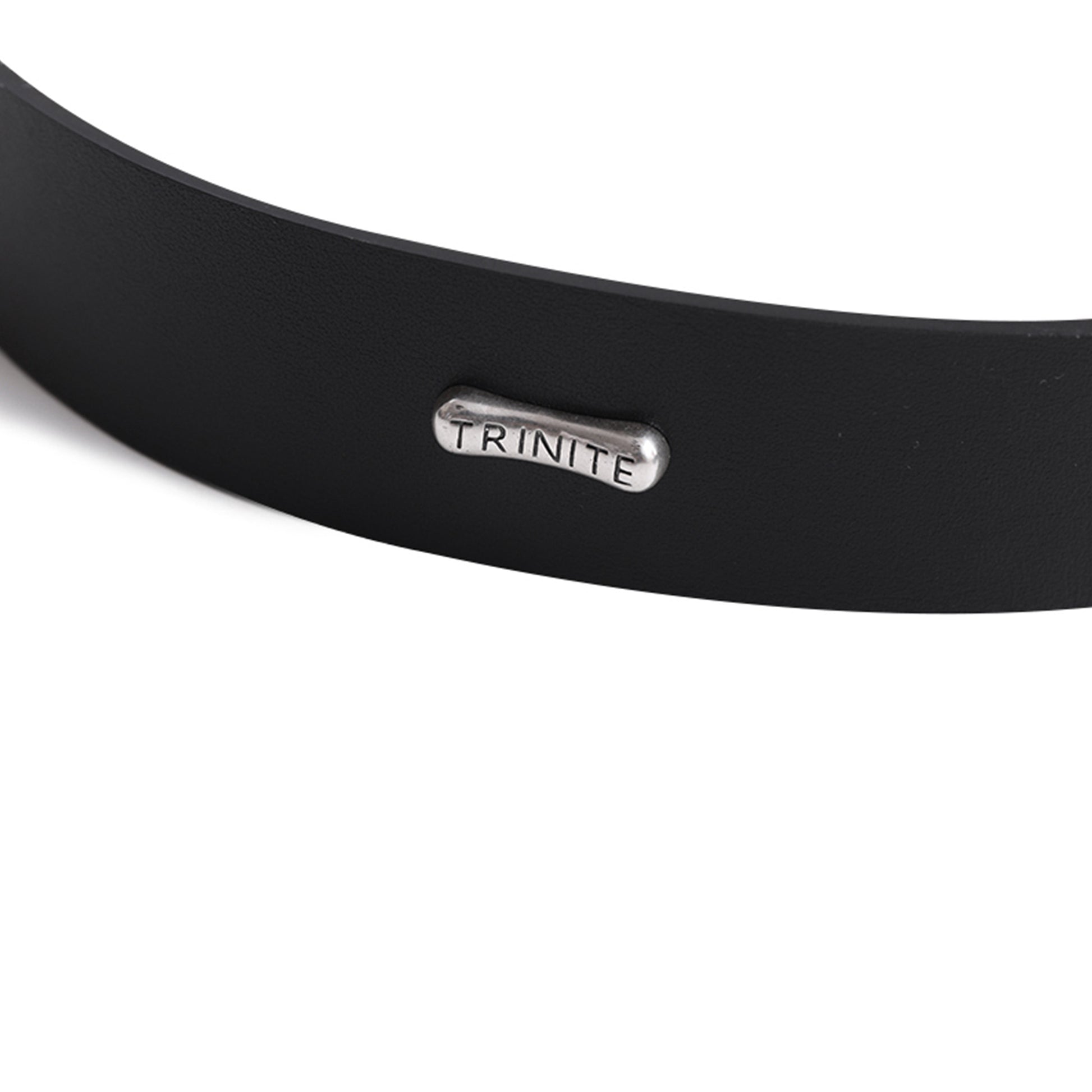 - Custom distressed silver buckle, rivets, and logo-decorated studs