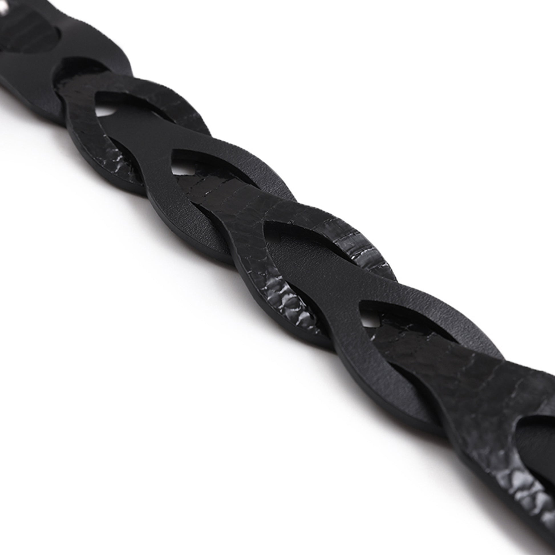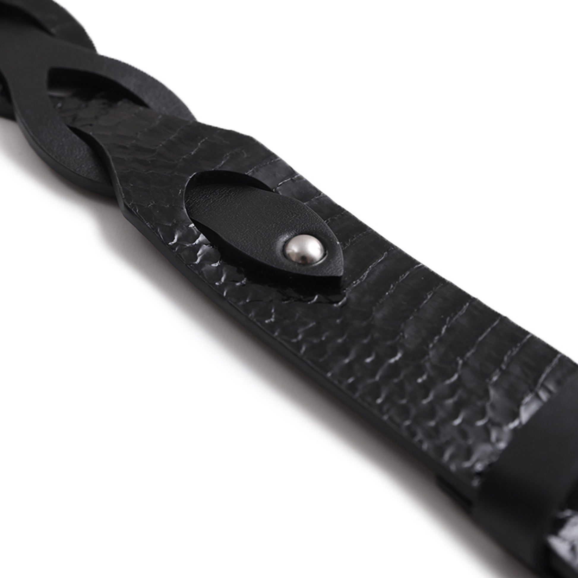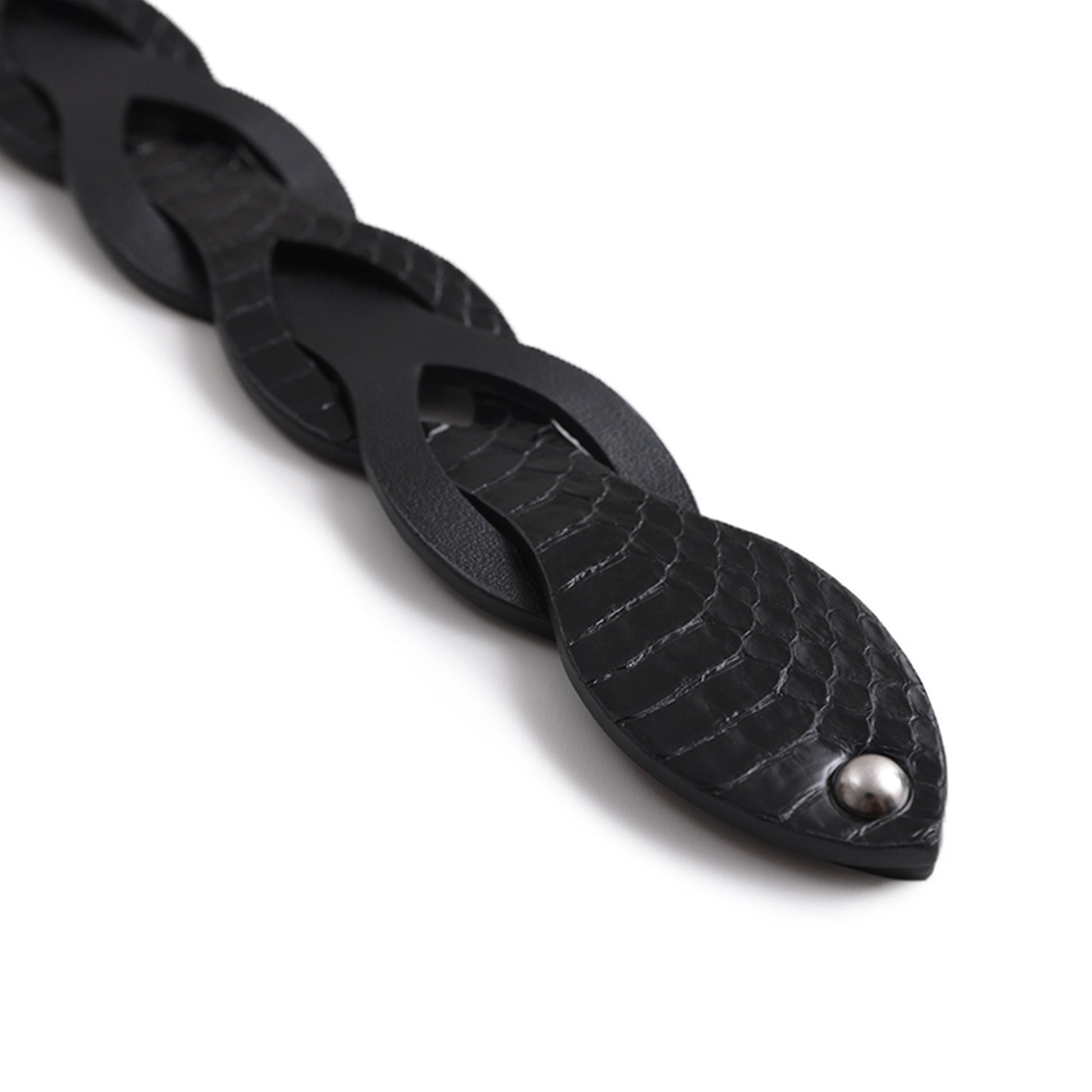 This belt features an intricate interweaving of natural snakeskin and top-grain calfskin, combining texture and sheen for a premium finish.