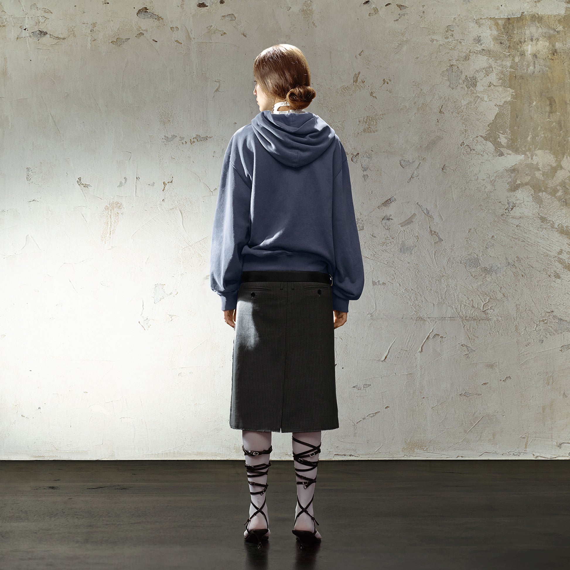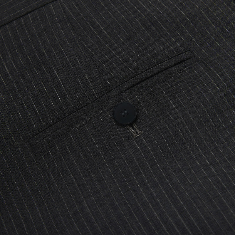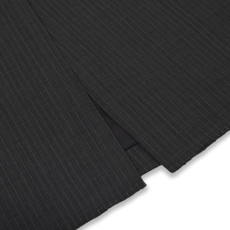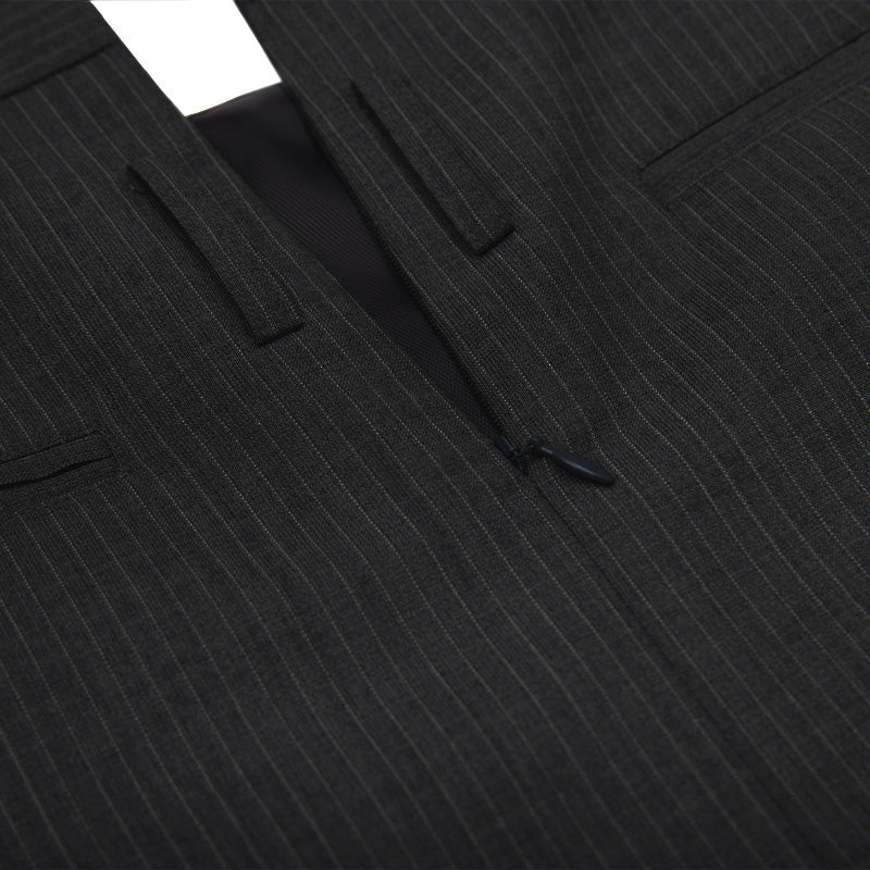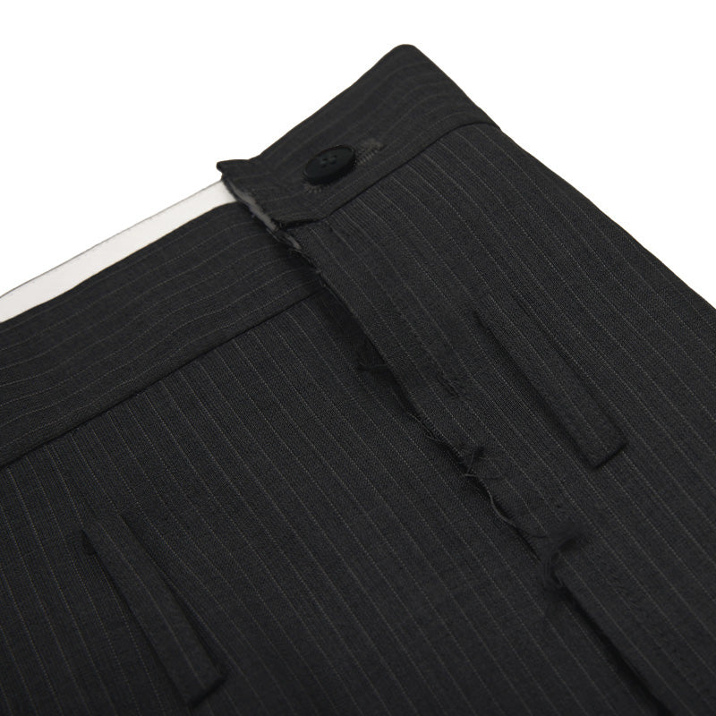 This piece is crafted from fine worsted wool suiting fabric with a striped pattern, featuring a deconstructed and asymmetrical silhouette that mimics the draped effect of a loosely tailored skirt. The design creates unique visual layers through strategic gathering and volume control. The skirt's fit is adjusted by a structural panel at the hips, while excess fabric at the waist falls naturally. Unfastening the side horn toggle reveals more of the white inner waistband, adding a touch of effortless style.