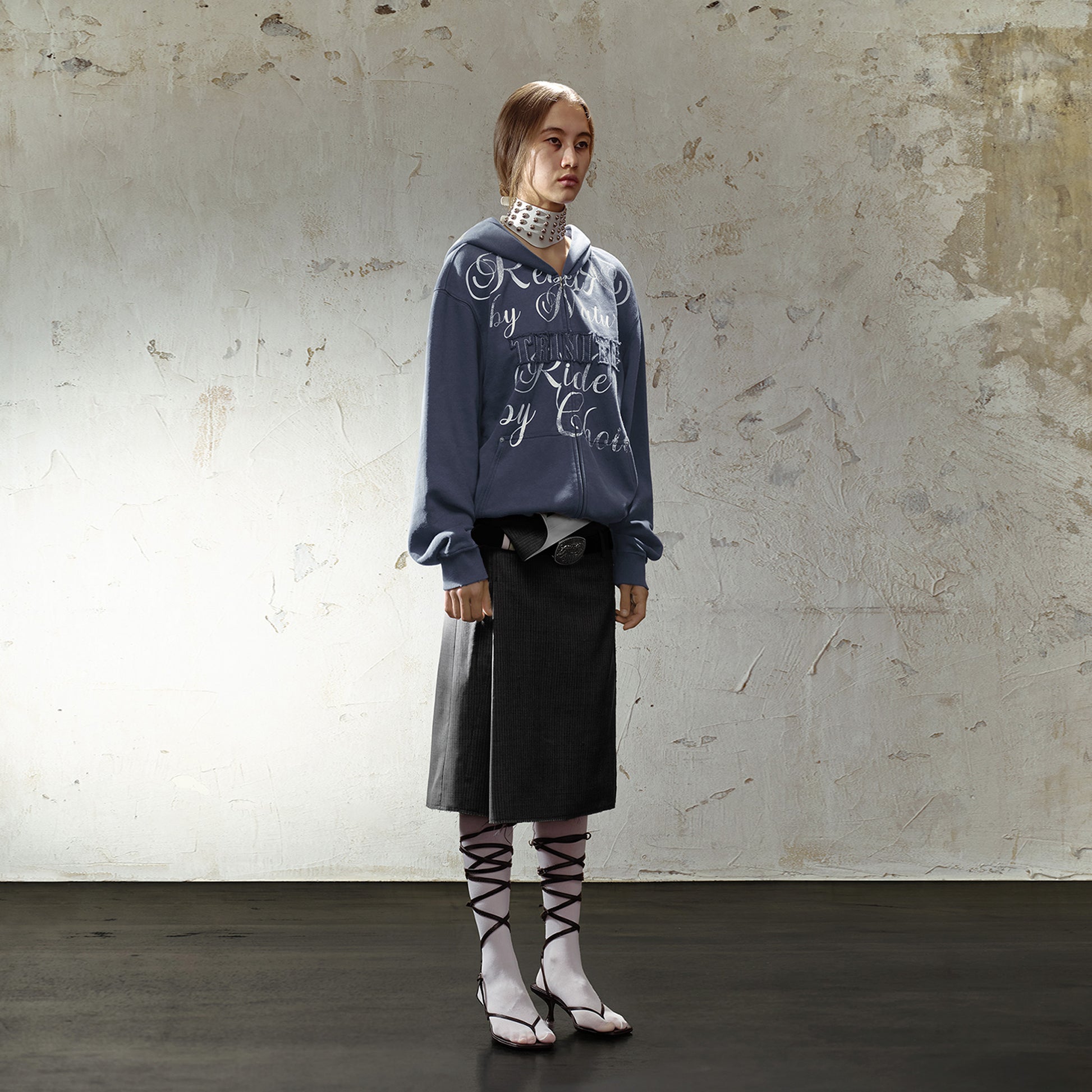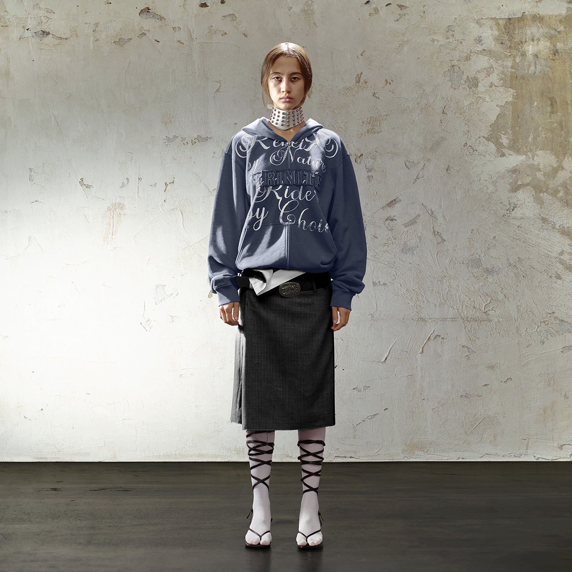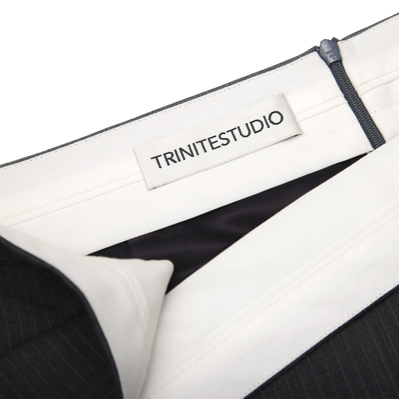 This piece is crafted from fine worsted wool suiting fabric with a striped pattern, featuring a deconstructed and asymmetrical silhouette that mimics the draped effect of a loosely tailored skirt. The design creates unique visual layers through strategic gathering and volume control. The skirt's fit is adjusted by a structural panel at the hips, while excess fabric at the waist falls naturally. Unfastening the side horn toggle reveals more of the white inner waistband, adding a touch of effortless style.