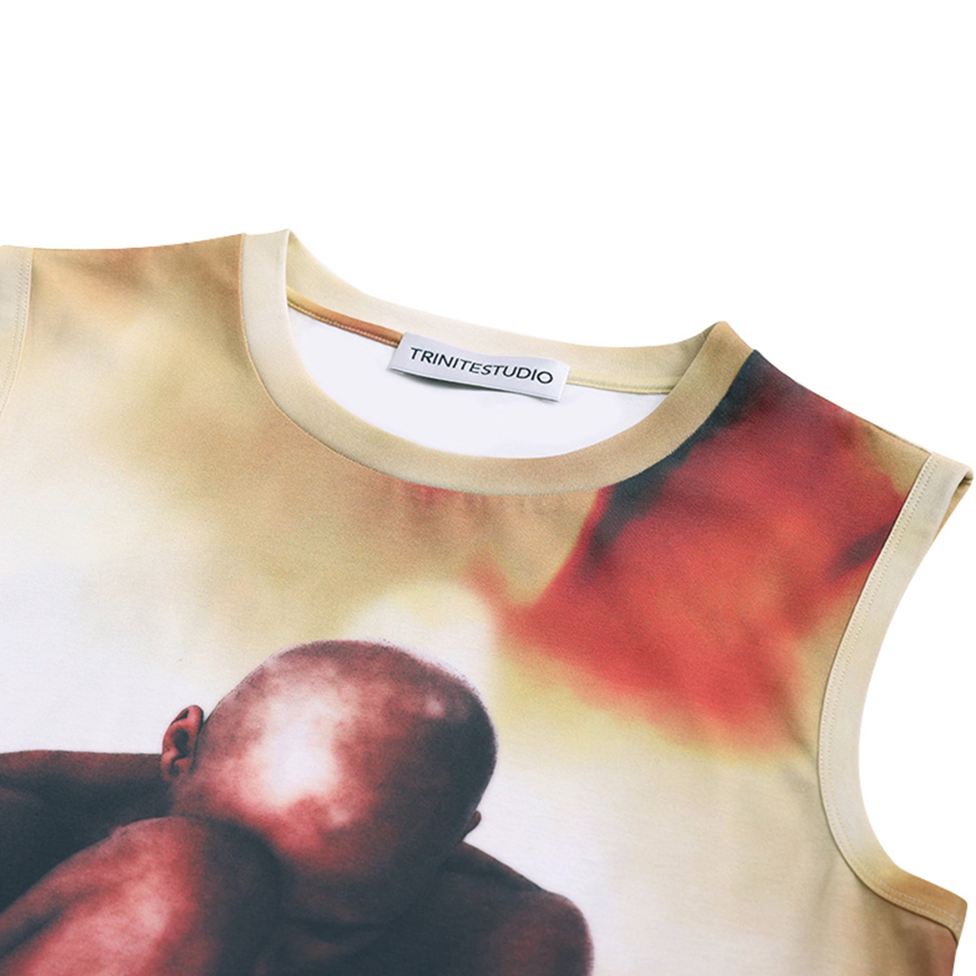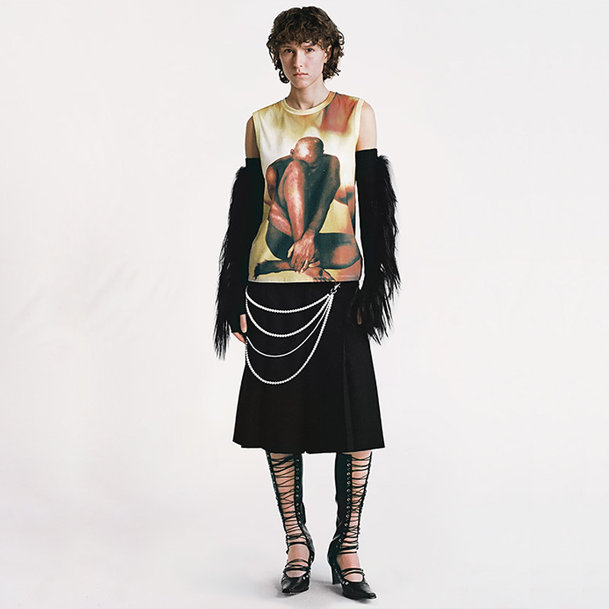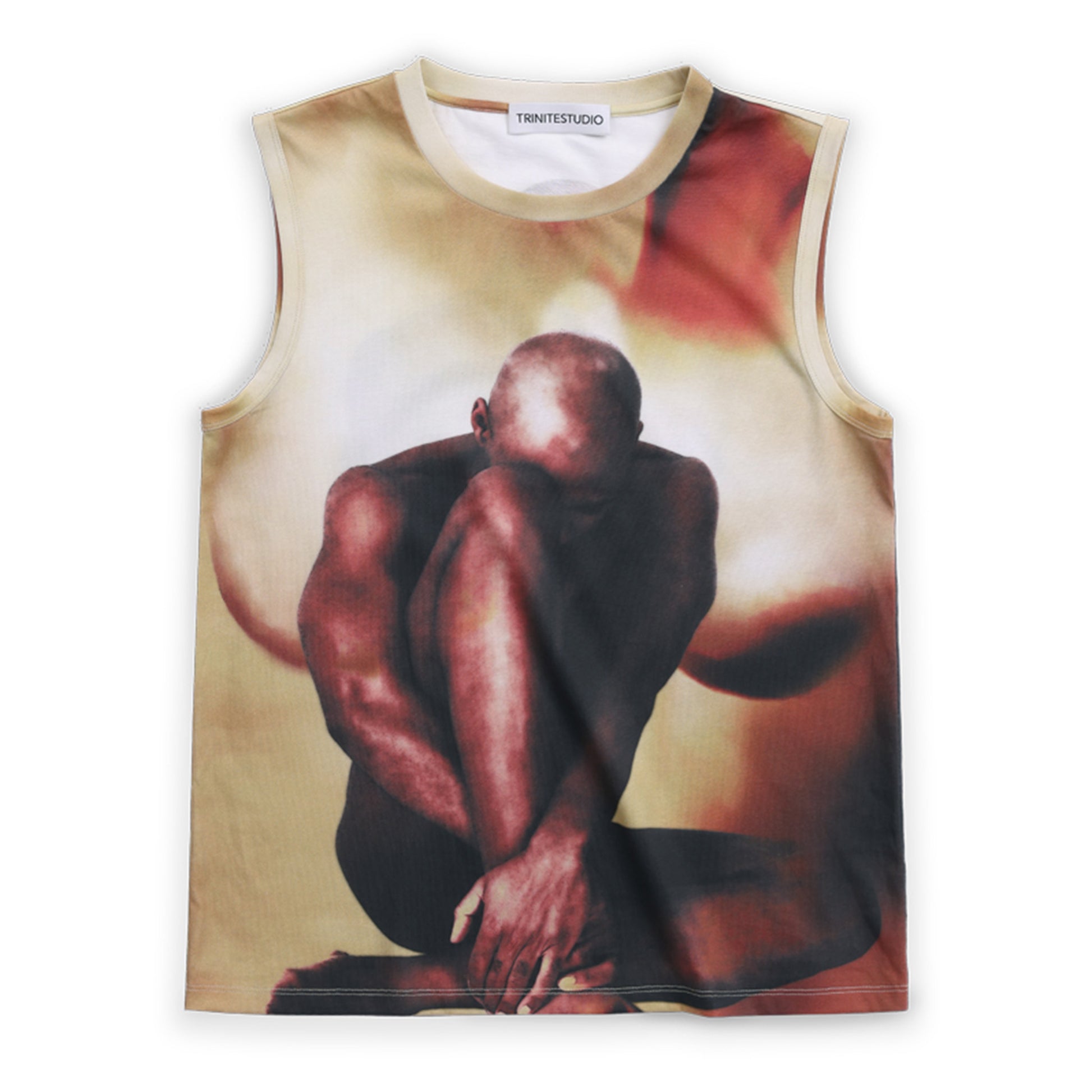 A striking male torso portrait is printed on the main body of the top, with a contoured female silhouette at the bottom, creating a strong contrast that highlights the theme of "strength and beauty." The design embodies a clash between fragility and primal wildness, reflecting Punk culture's ethos of "living for oneself without caring about societal judgment or definitions."