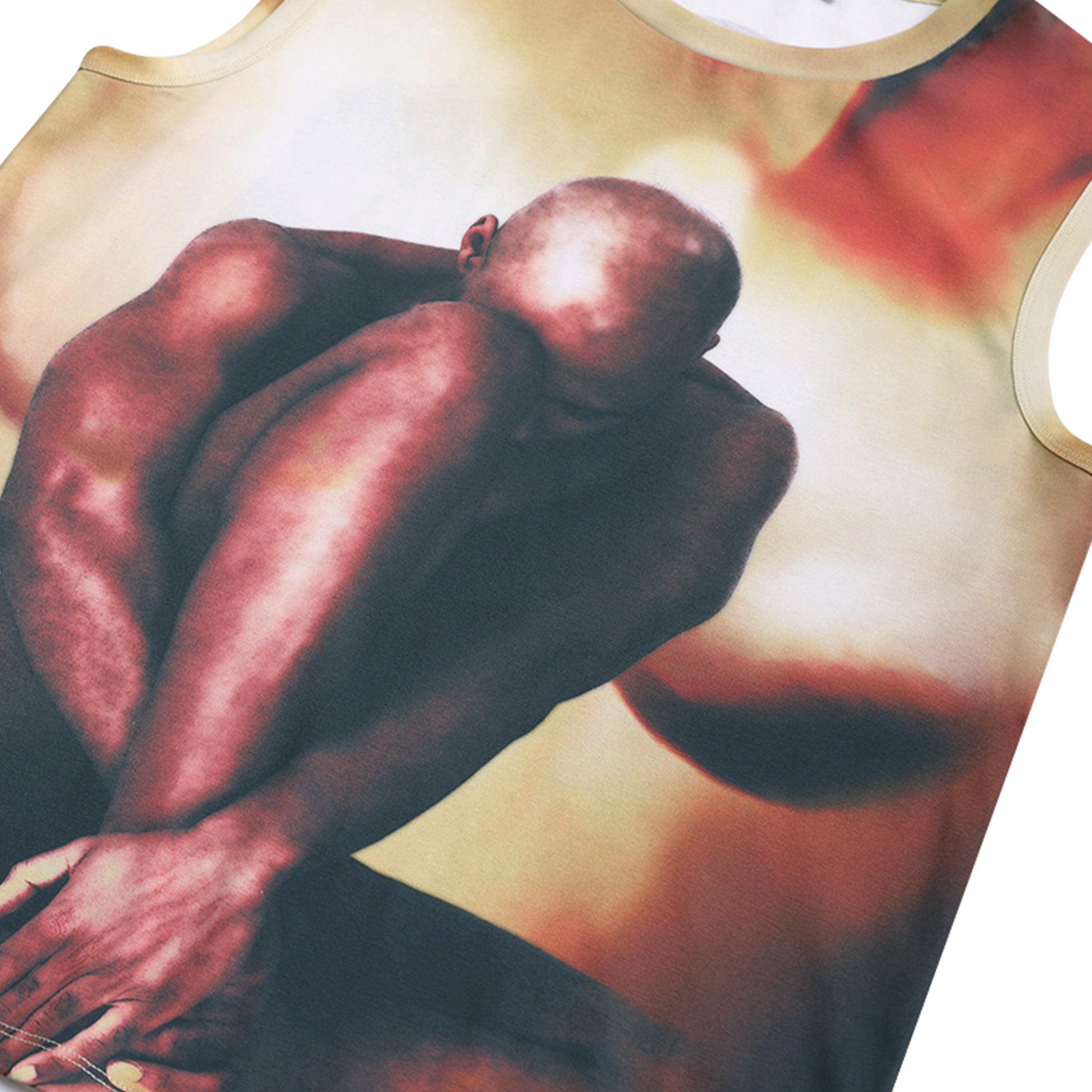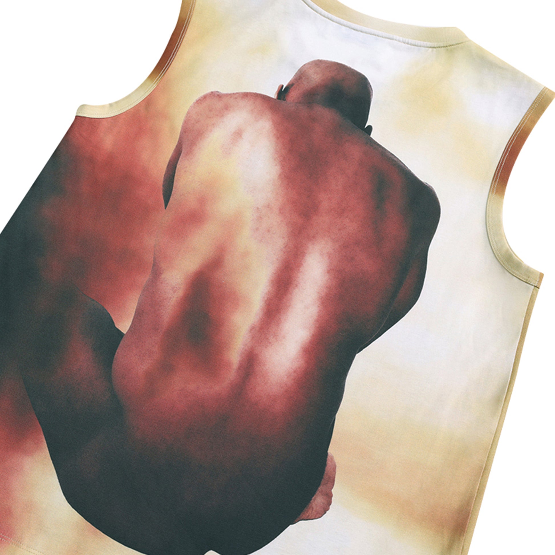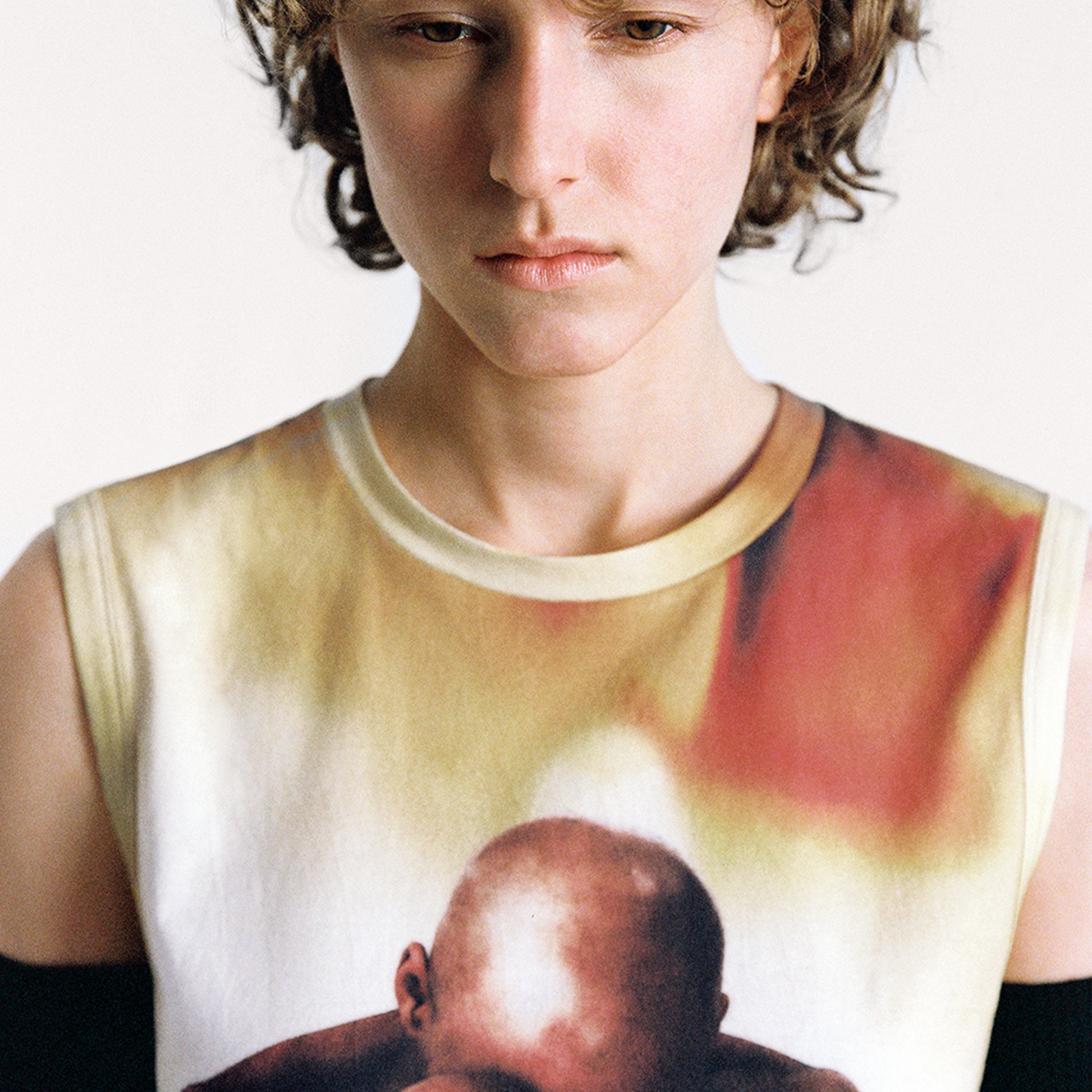 A striking male torso portrait is printed on the main body of the top, with a contoured female silhouette at the bottom, creating a strong contrast that highlights the theme of "strength and beauty." The design embodies a clash between fragility and primal wildness, reflecting Punk culture's ethos of "living for oneself without caring about societal judgment or definitions."