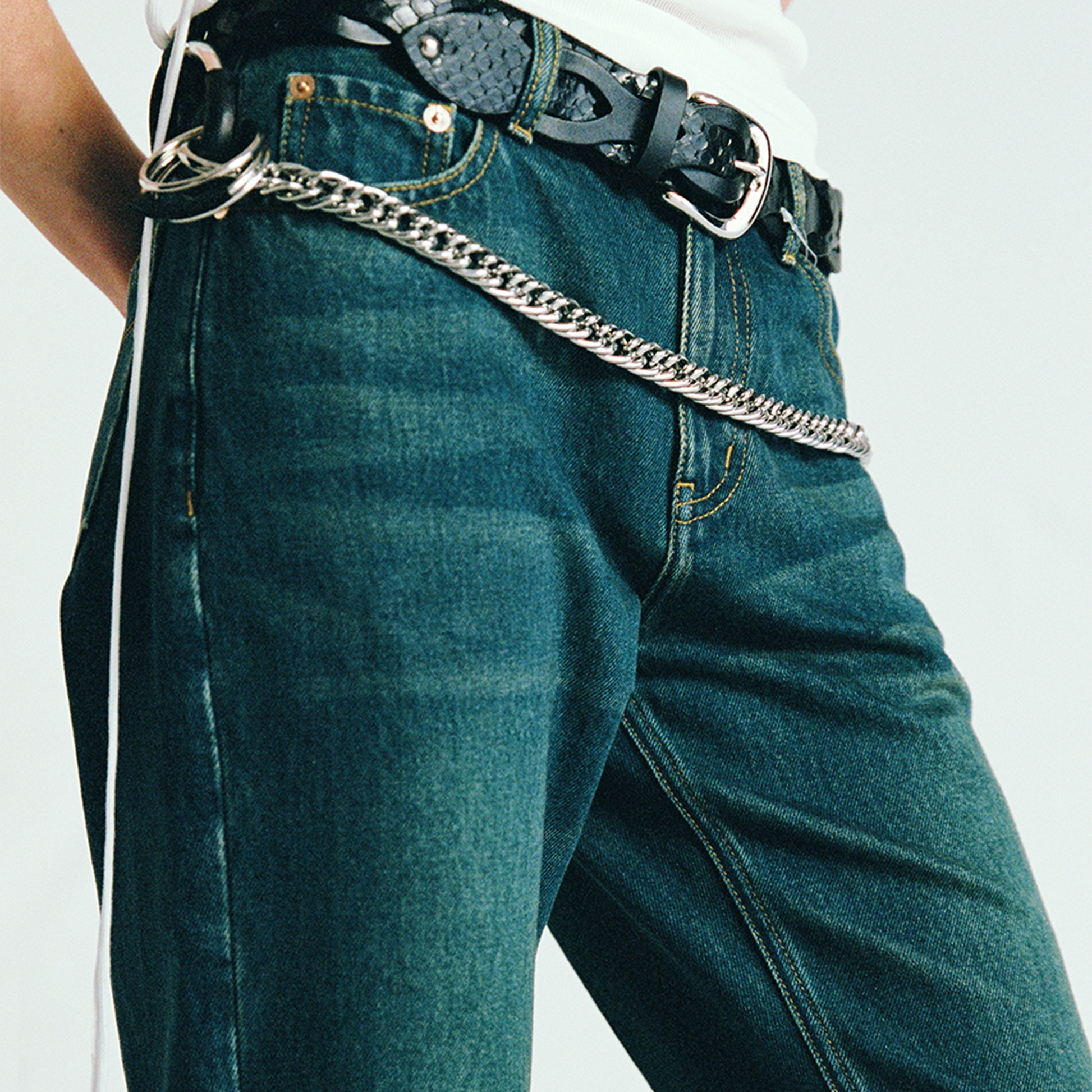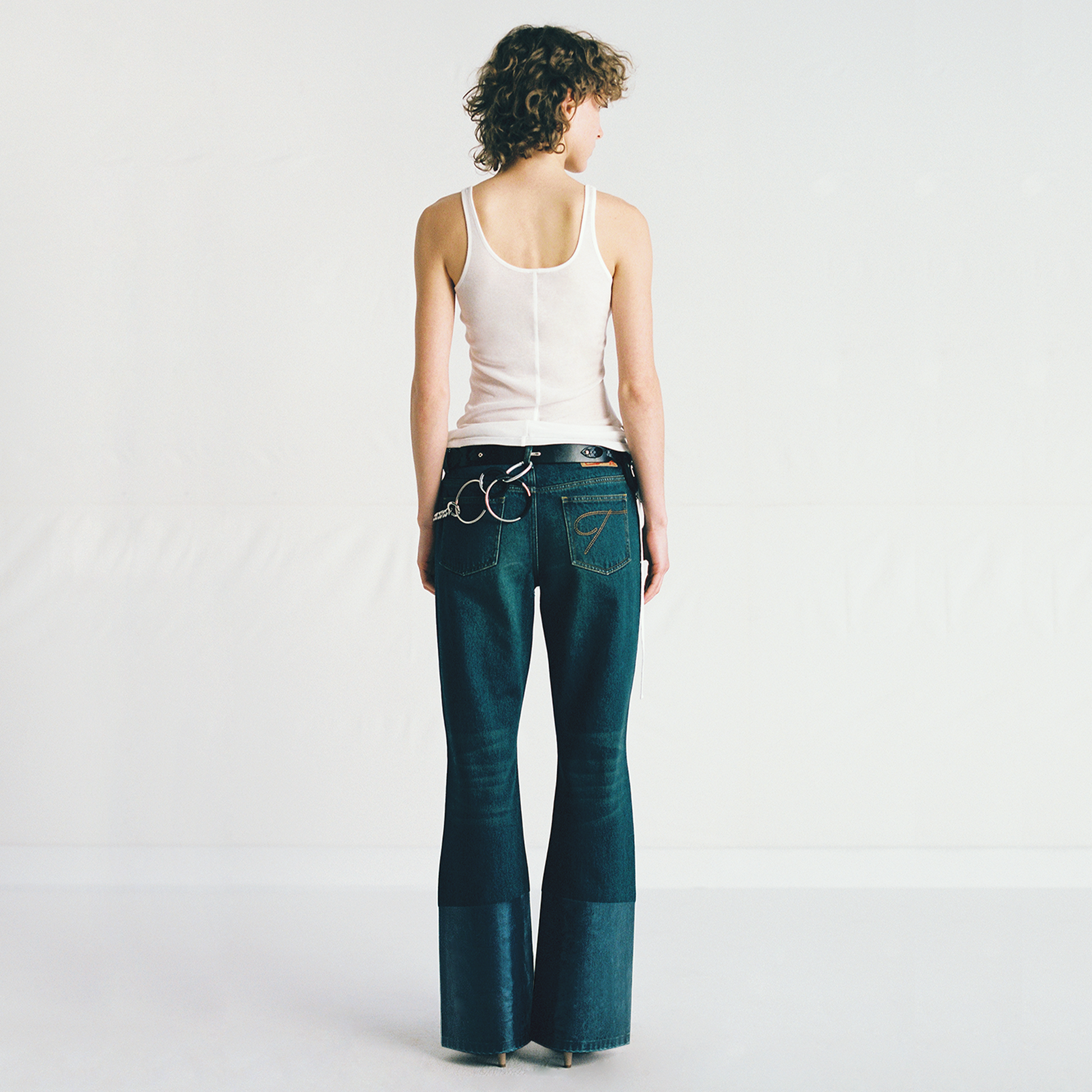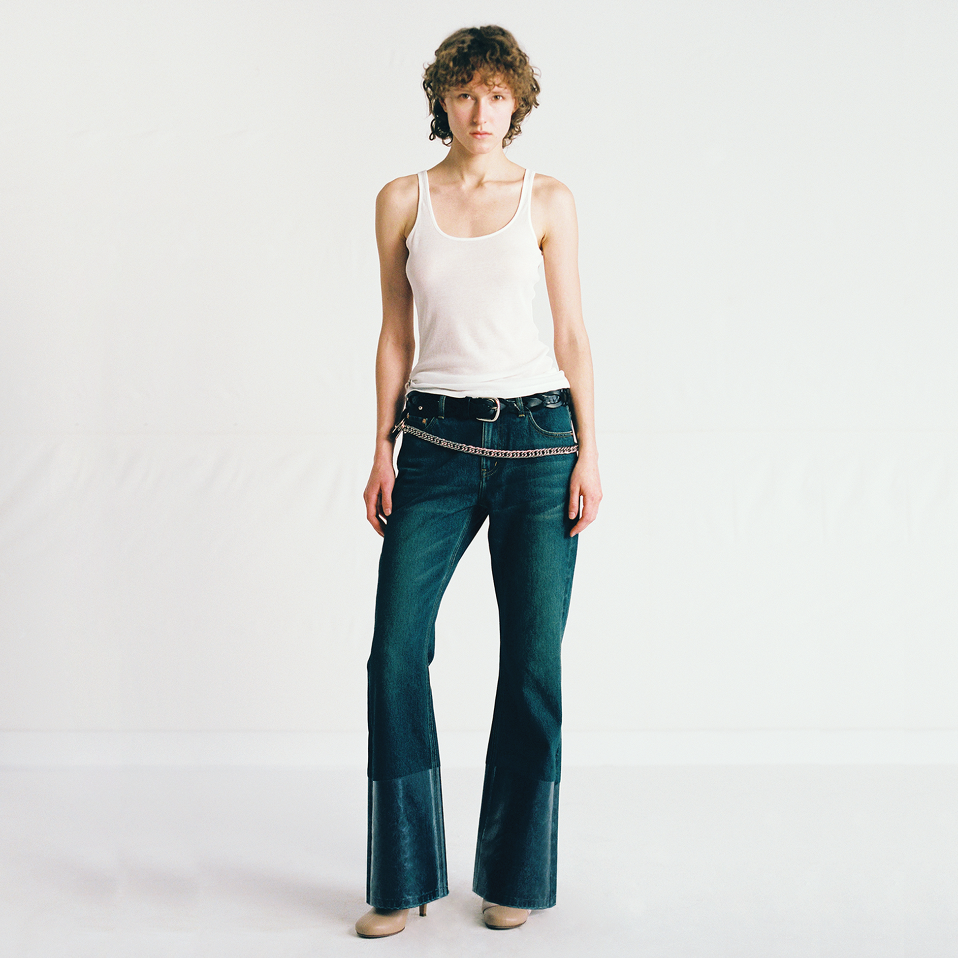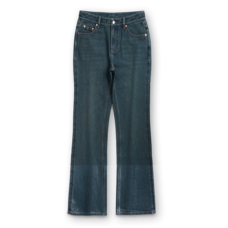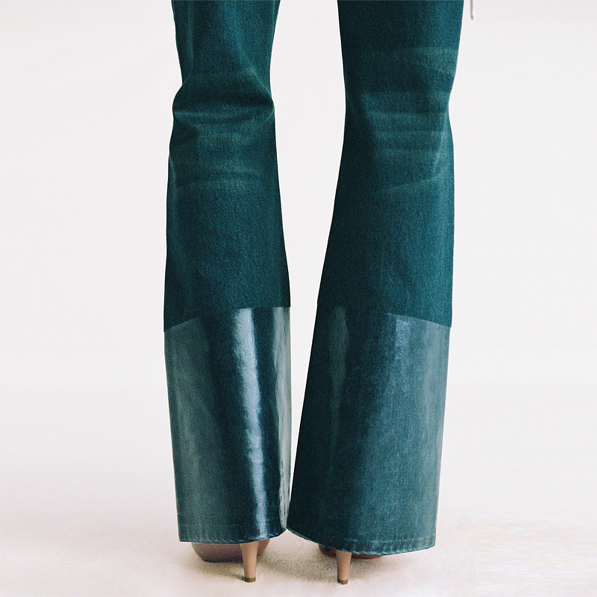 These jeans combine several eye-catching details. The dark blue-green color is memorable and attractive, with a curved waistband design that better fits the body. The slightly tight flared silhouette is romantic, elegant, and lively. The rubber-coated hem at the ankle is the most distinctive feature, making the jeans more structured and emphasizing the flared shape. The reflective coating adds a touch of modernity.