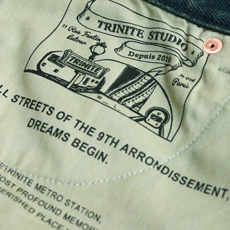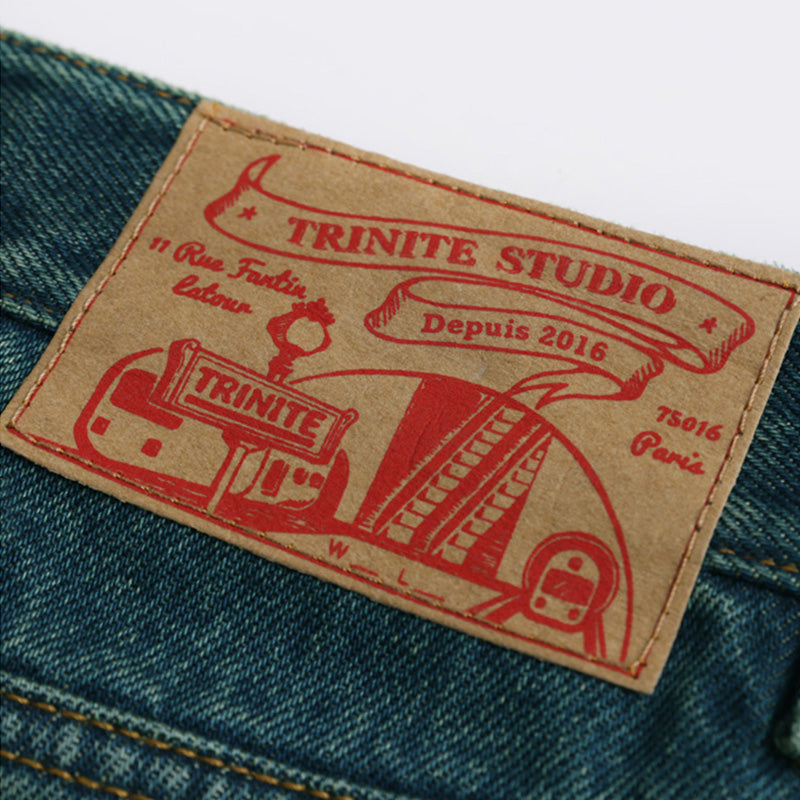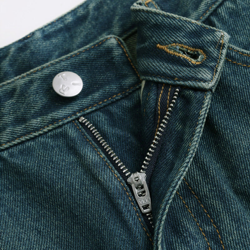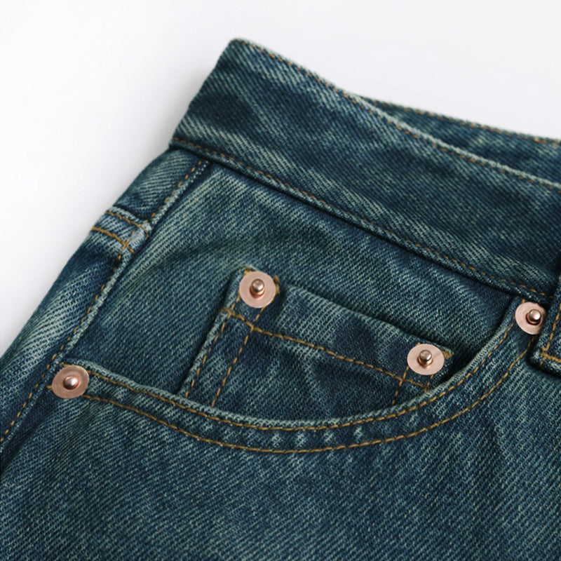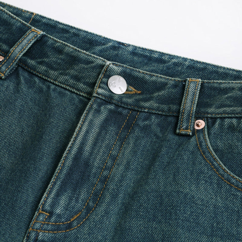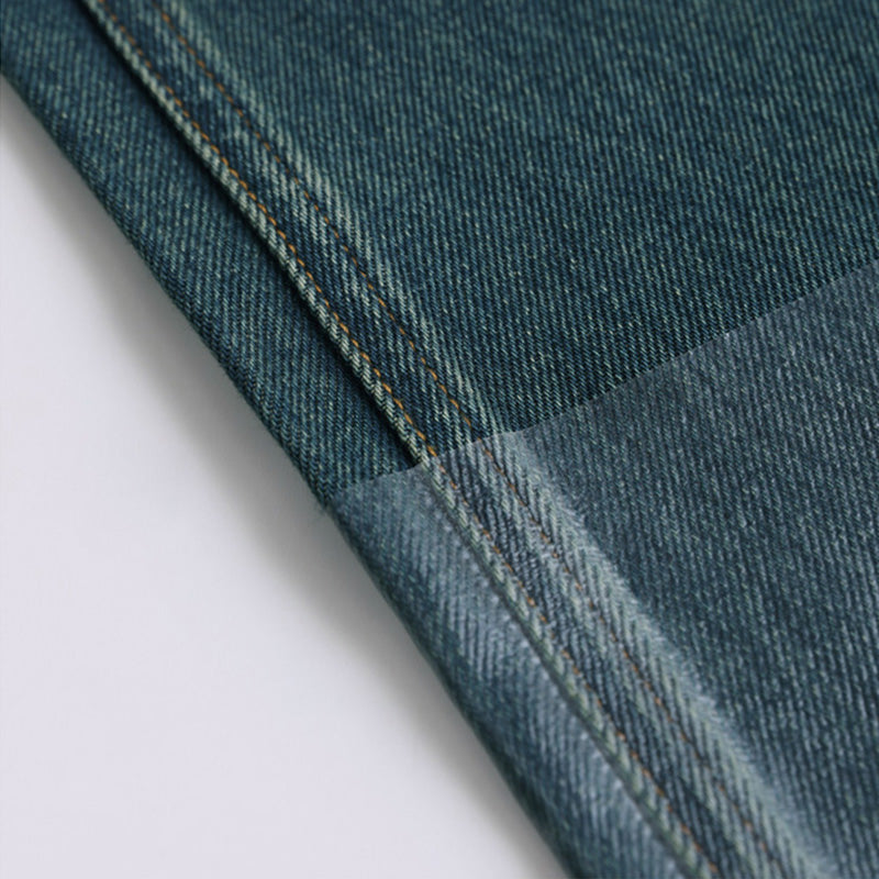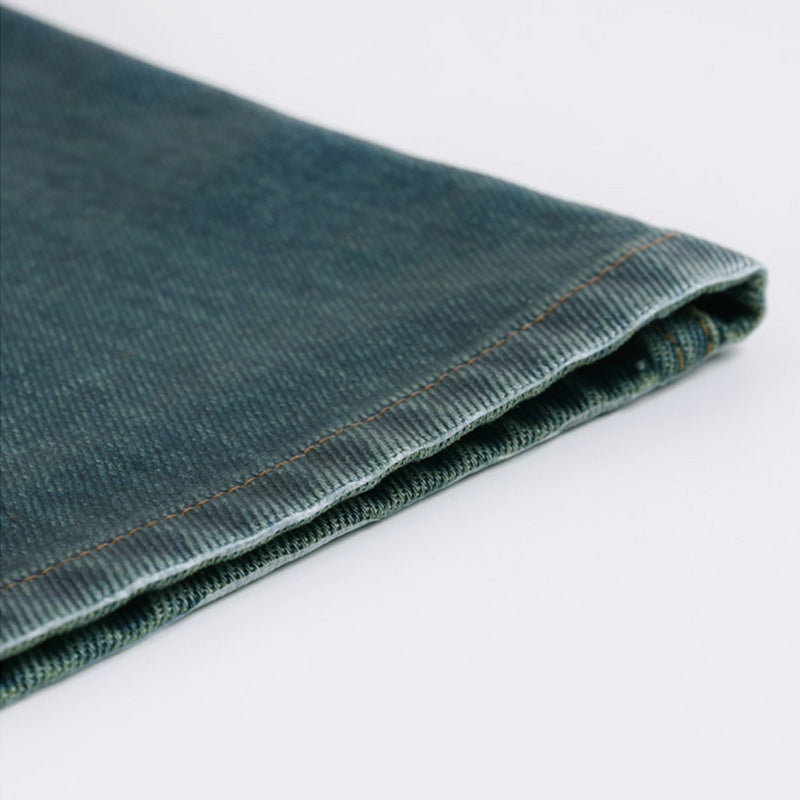 These jeans combine several eye-catching details. The dark blue-green color is memorable and attractive, with a curved waistband design that better fits the body. The slightly tight flared silhouette is romantic, elegant, and lively. The rubber-coated hem at the ankle is the most distinctive feature, making the jeans more structured and emphasizing the flared shape. The reflective coating adds a touch of modernity.