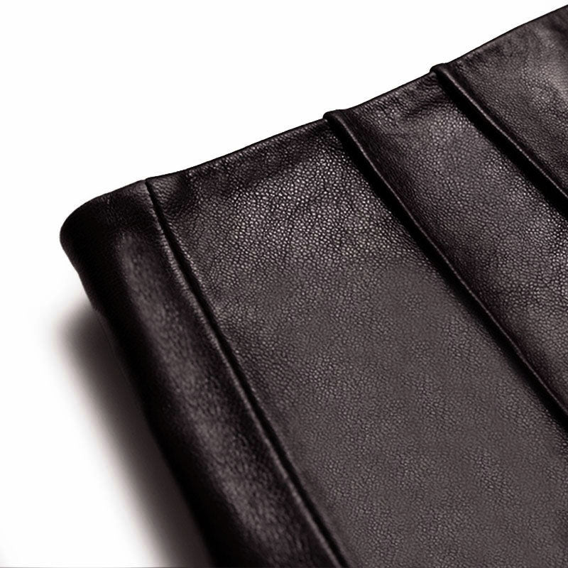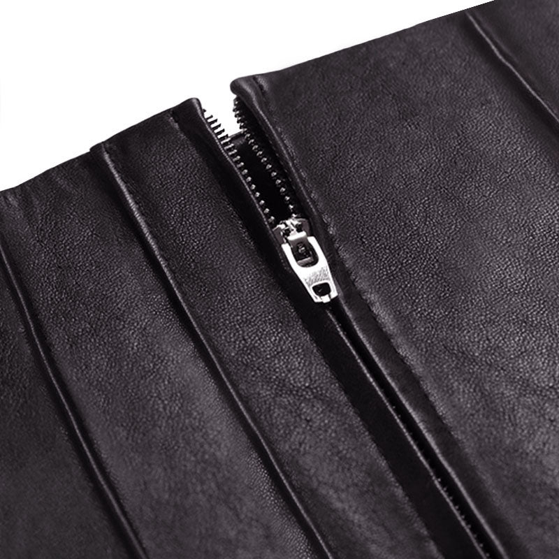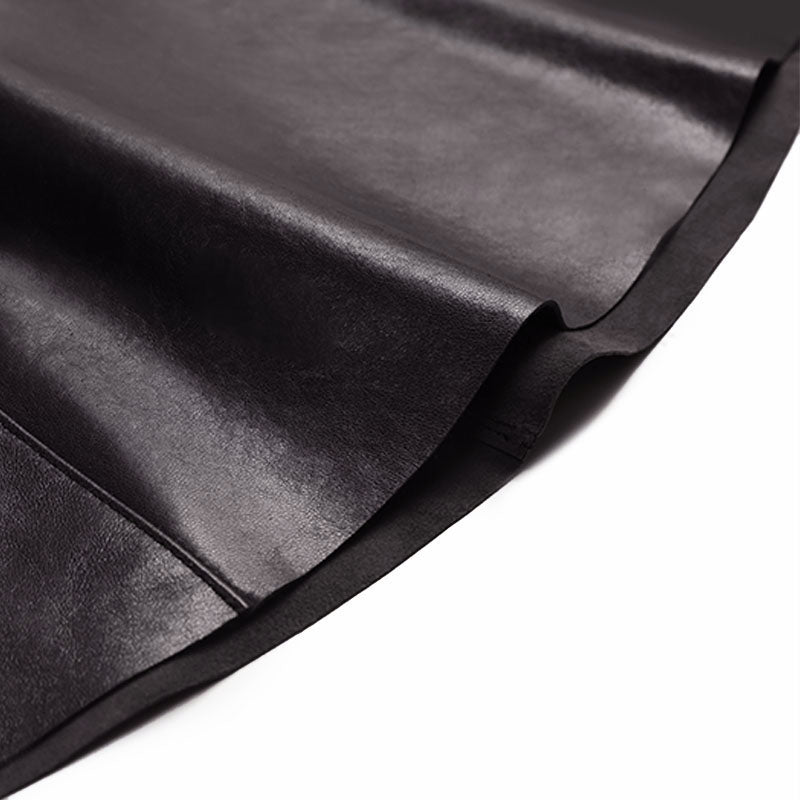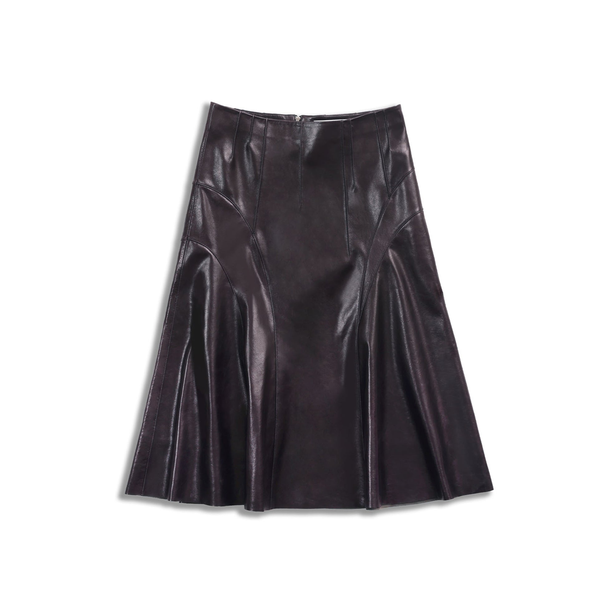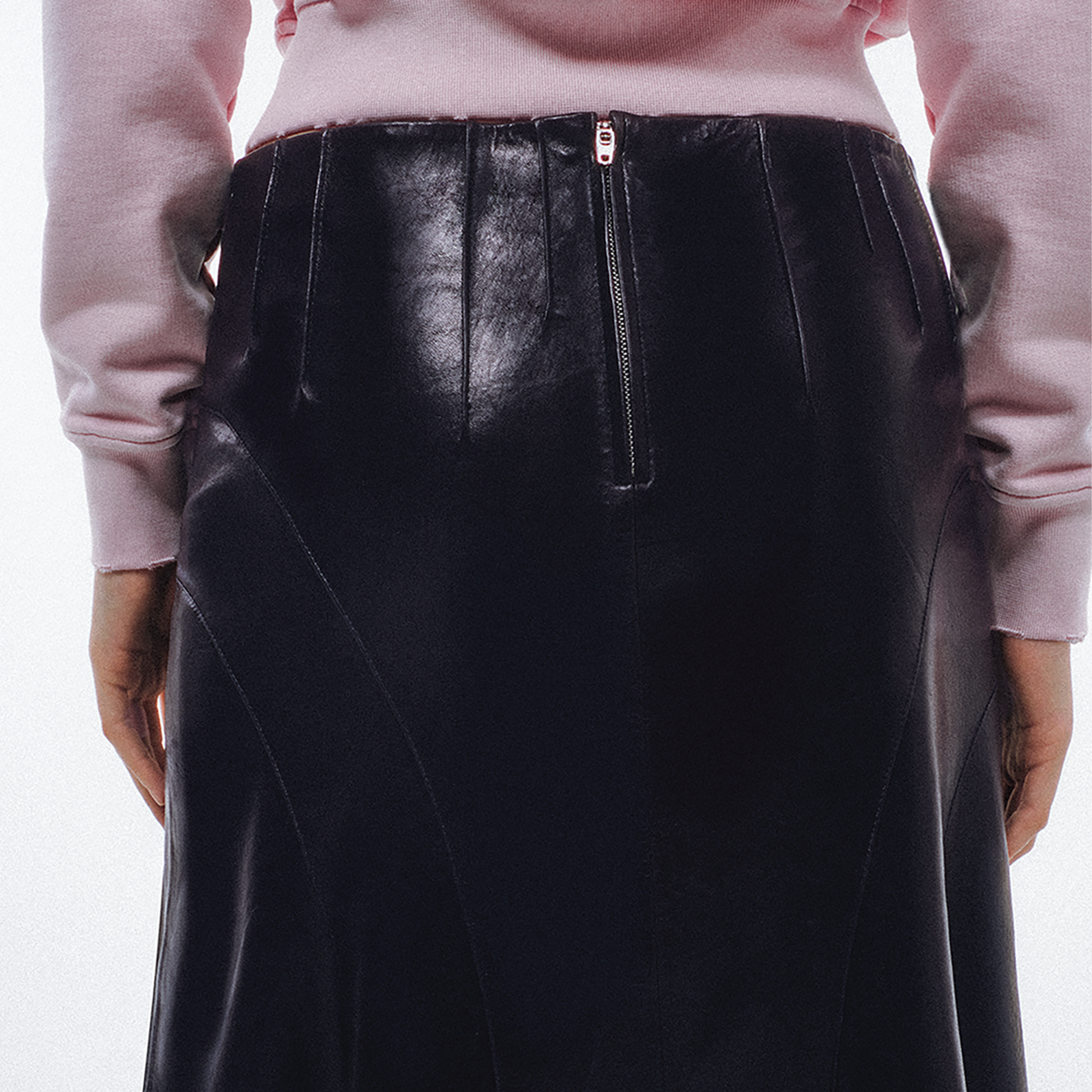 This skirt in dark eggplant waxed sheepskin centers on deconstructed patchwork tailoring. Multiple irregular darts along the waistline sculpt a three-dimensional structural silhouette, with varying dart lengths creating a rich visual rhythm that allows the leather to naturally catch light, revealing layered highlights and subtle texture. The asymmetrical seams break away from conventional construction, while the overall A-line silhouette gently flares toward the hem, echoing a mermaid-inspired shape for an elegant and elongated line.