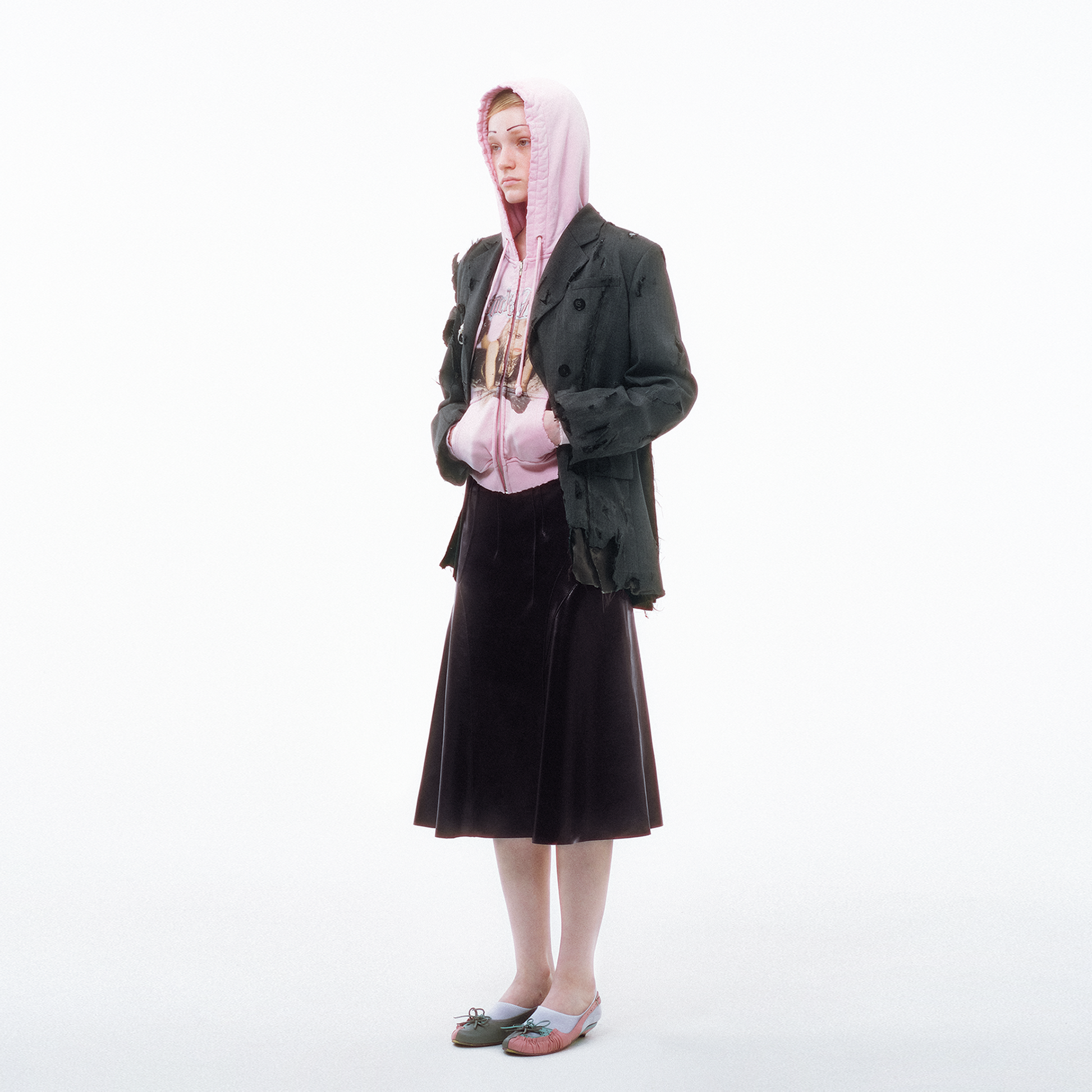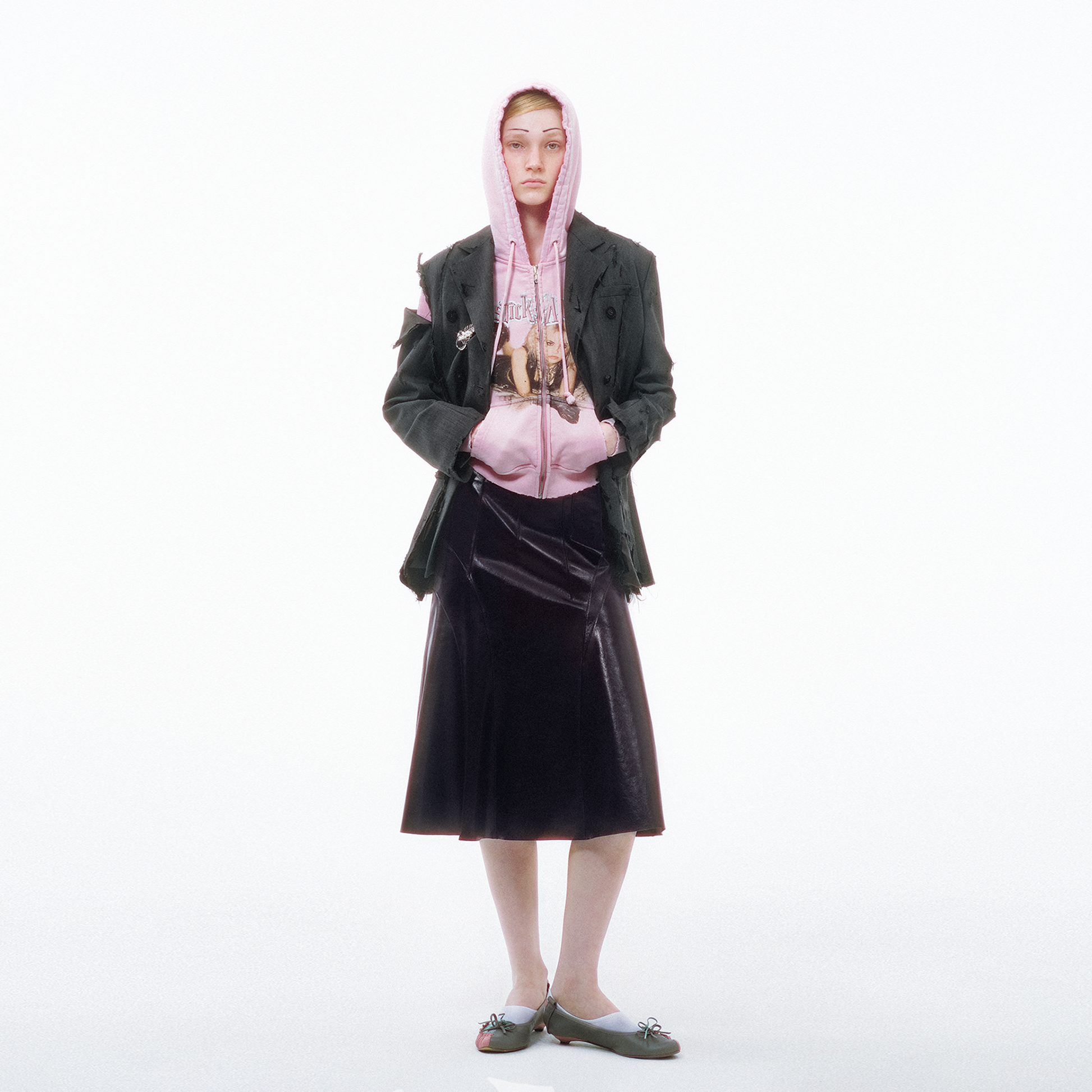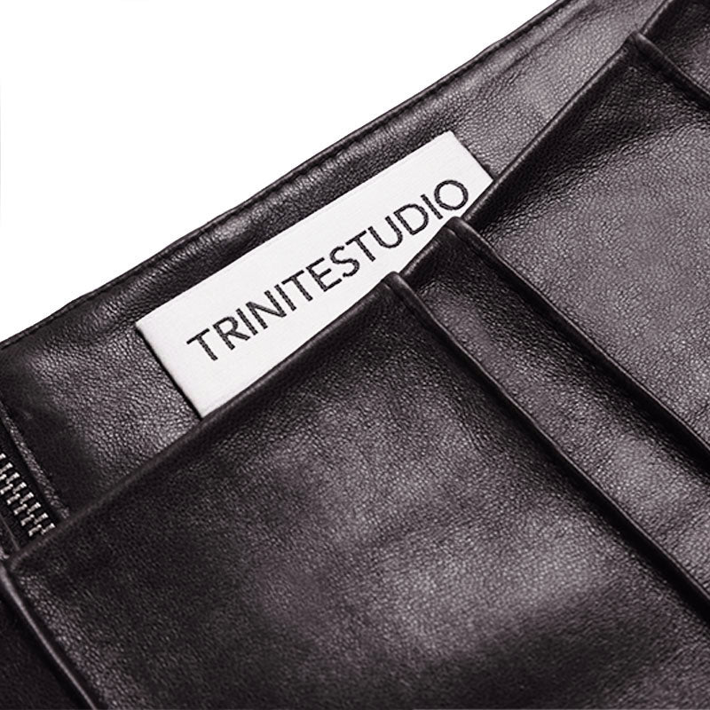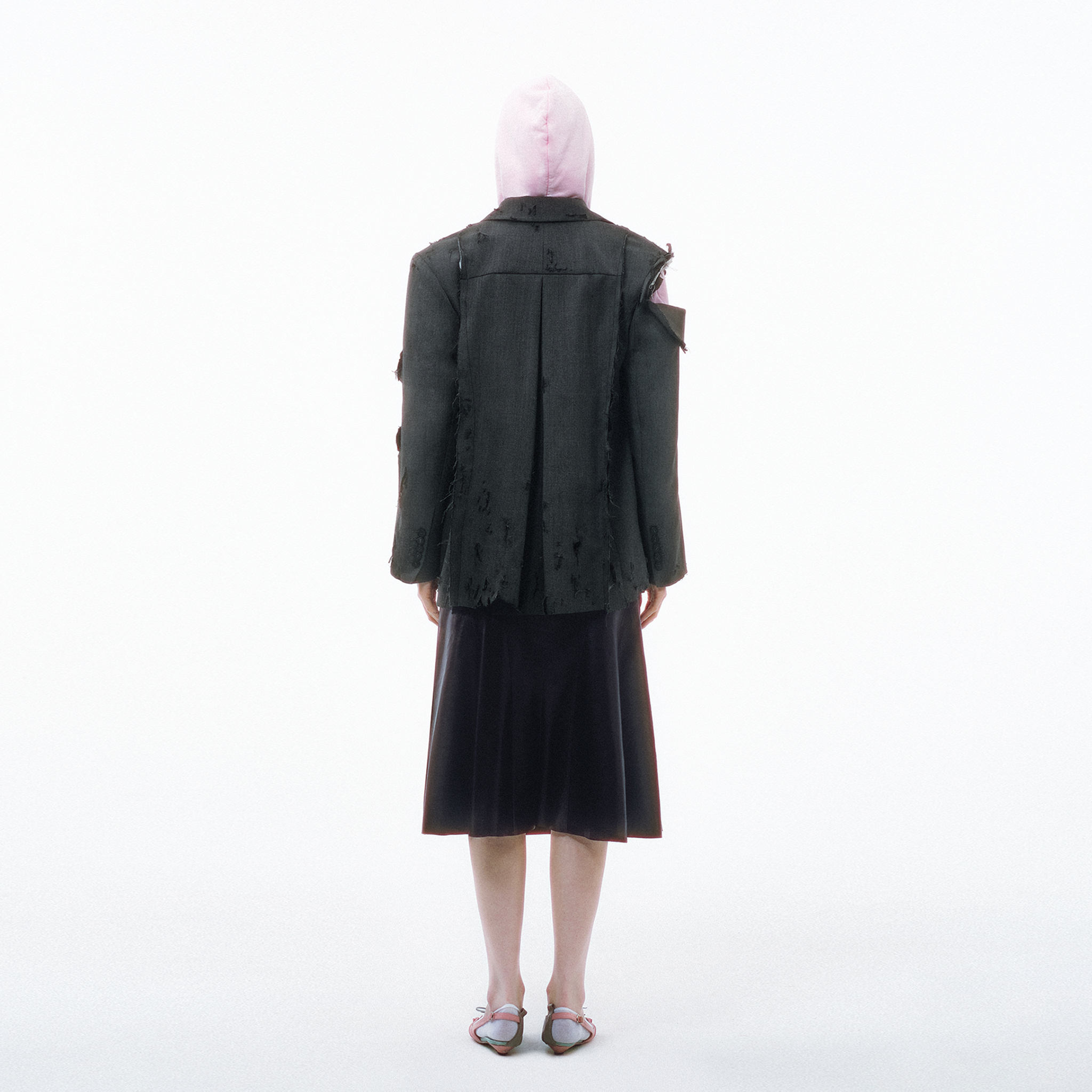This skirt in dark eggplant waxed sheepskin centers on deconstructed patchwork tailoring. Multiple irregular darts along the waistline sculpt a three-dimensional structural silhouette, with varying dart lengths creating a rich visual rhythm that allows the leather to naturally catch light, revealing layered highlights and subtle texture. The asymmetrical seams break away from conventional construction, while the overall A-line silhouette gently flares toward the hem, echoing a mermaid-inspired shape for an elegant and elongated line.