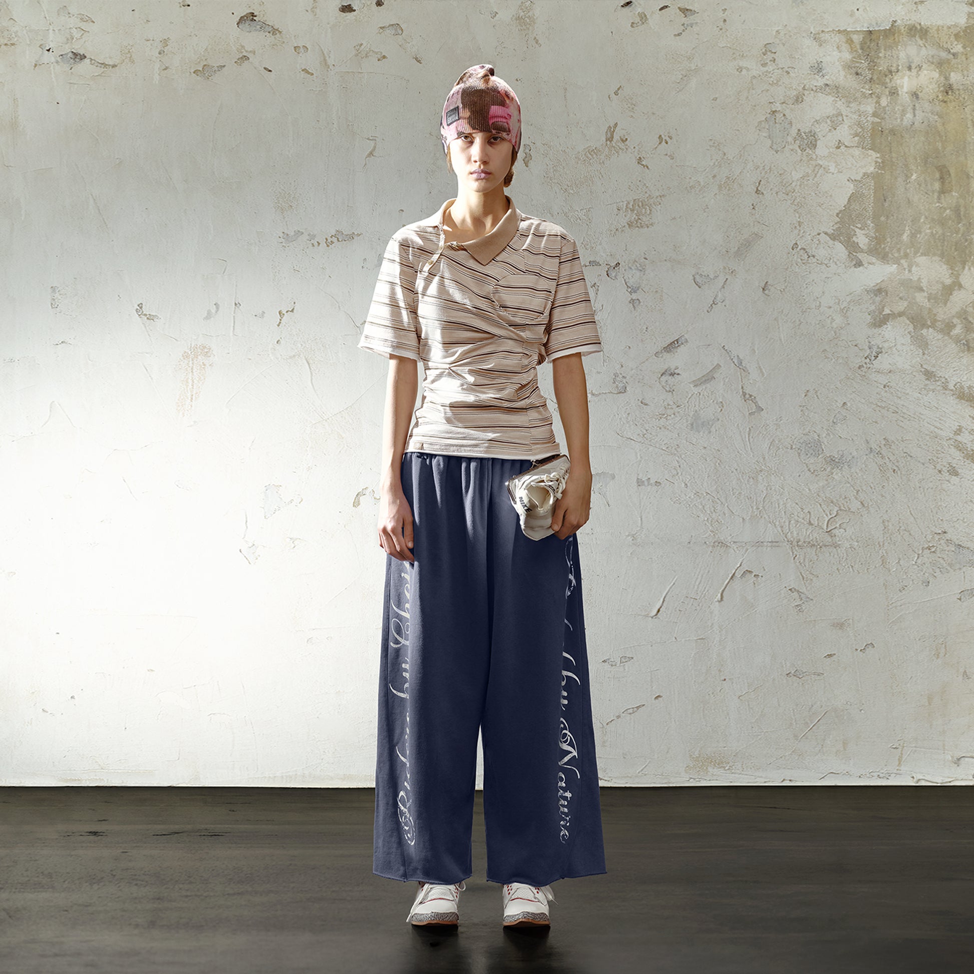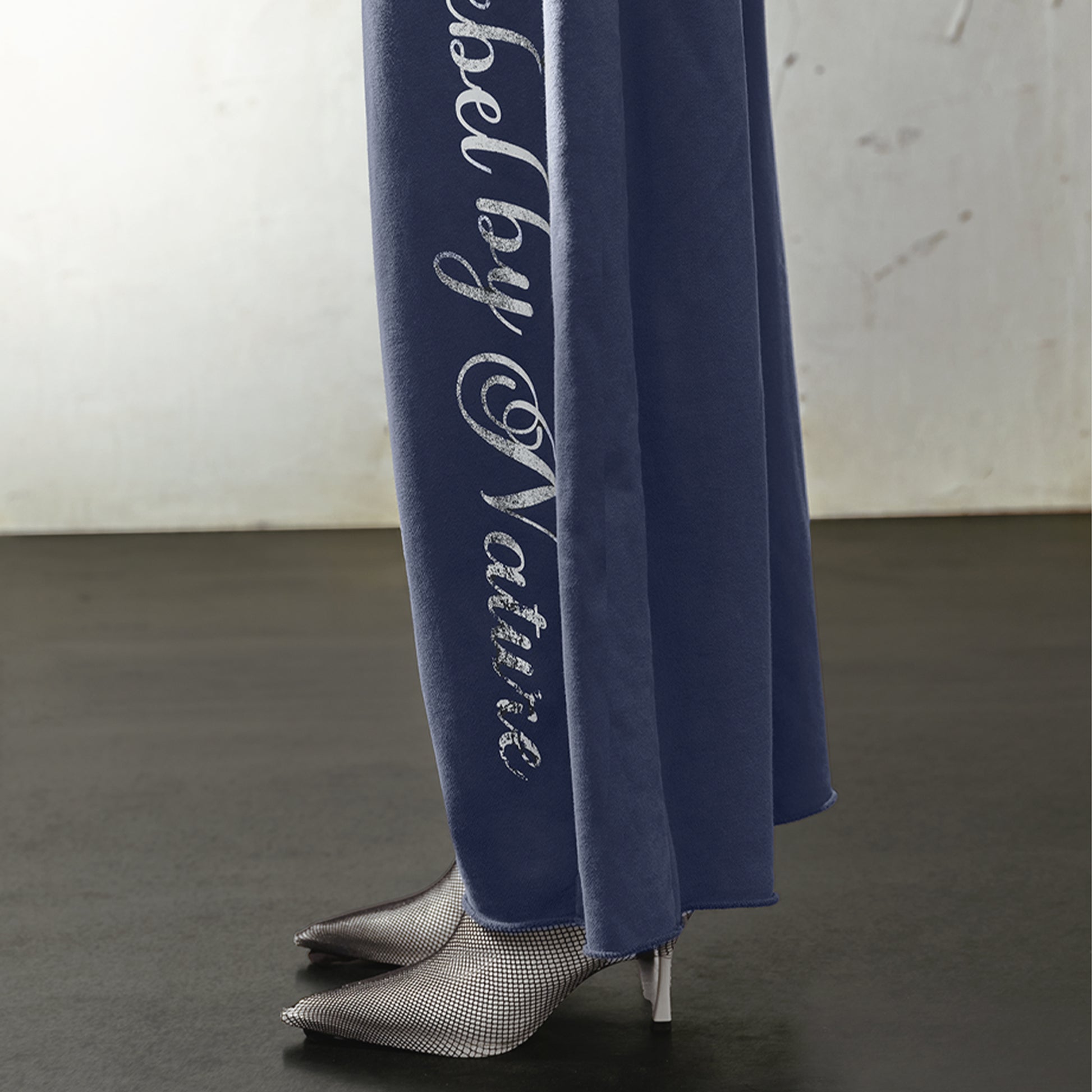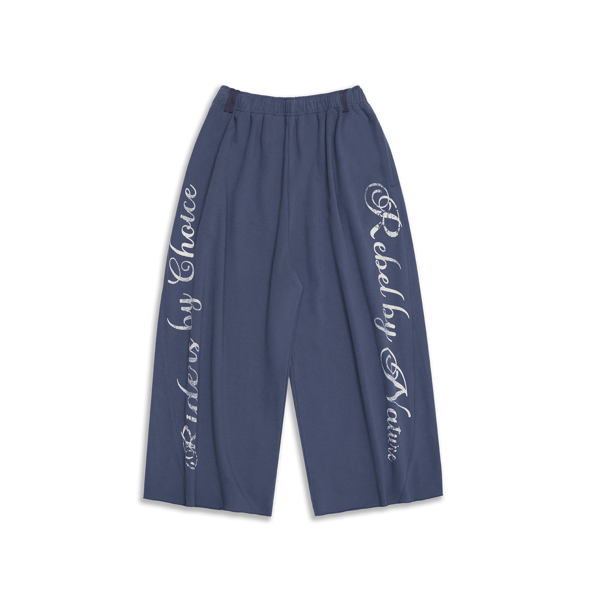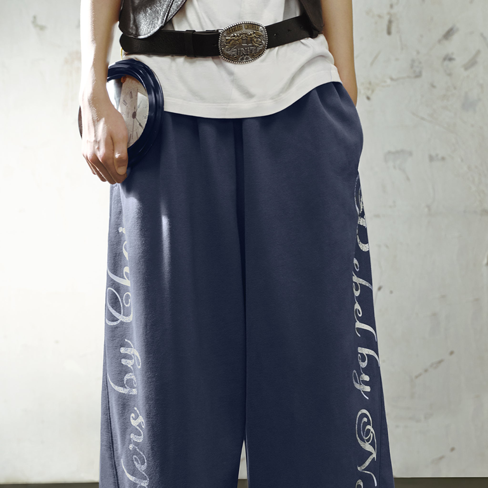 This cropped sport pant is crafted in a washed-out denim blue hue, creating a distinctive vintage aesthetic. The piece is accentuated with slogan prints, infusing it with streetwise attitude and personal expression. Its relaxed fit and cropped length offer a casual yet sharp look, making it versatile for various everyday styles.