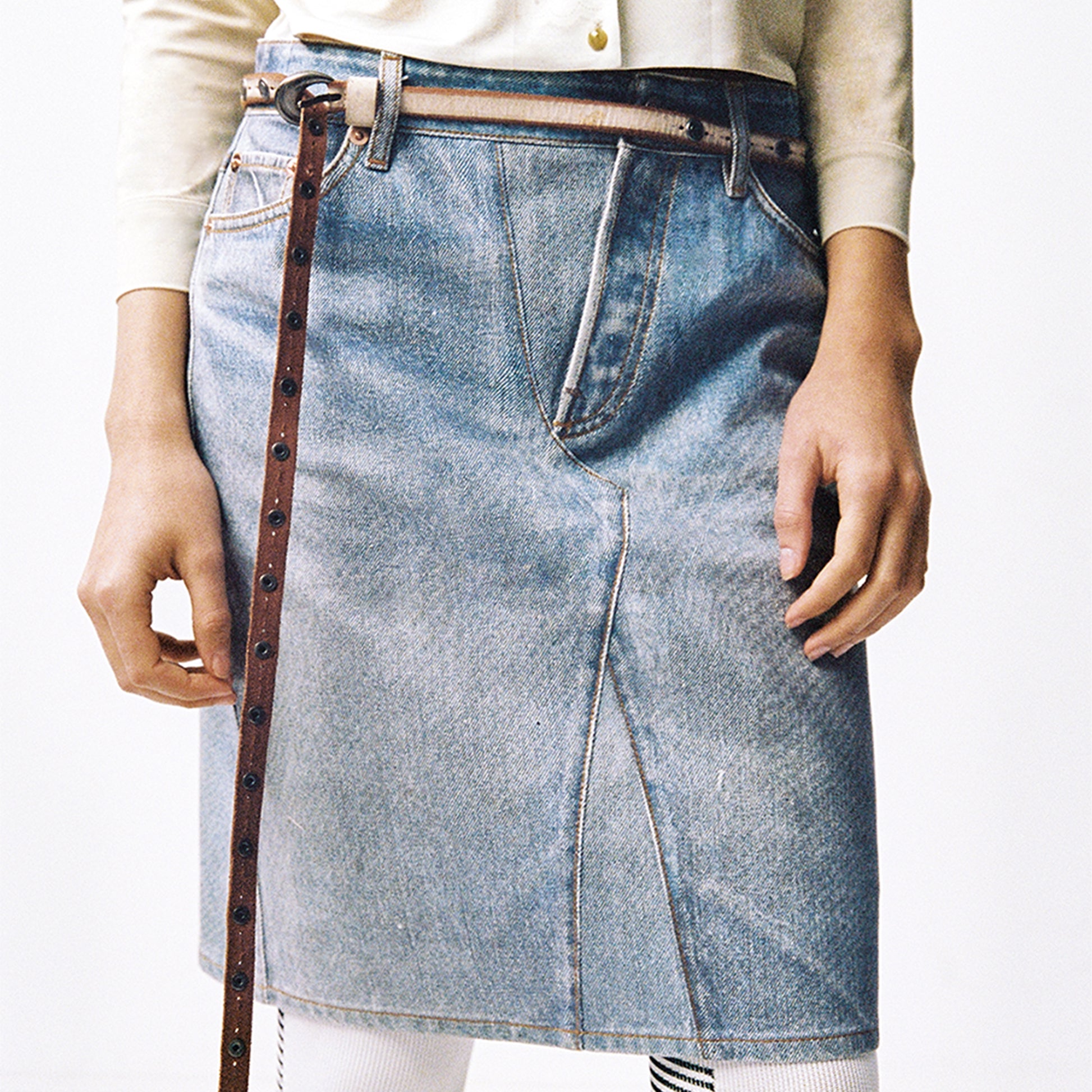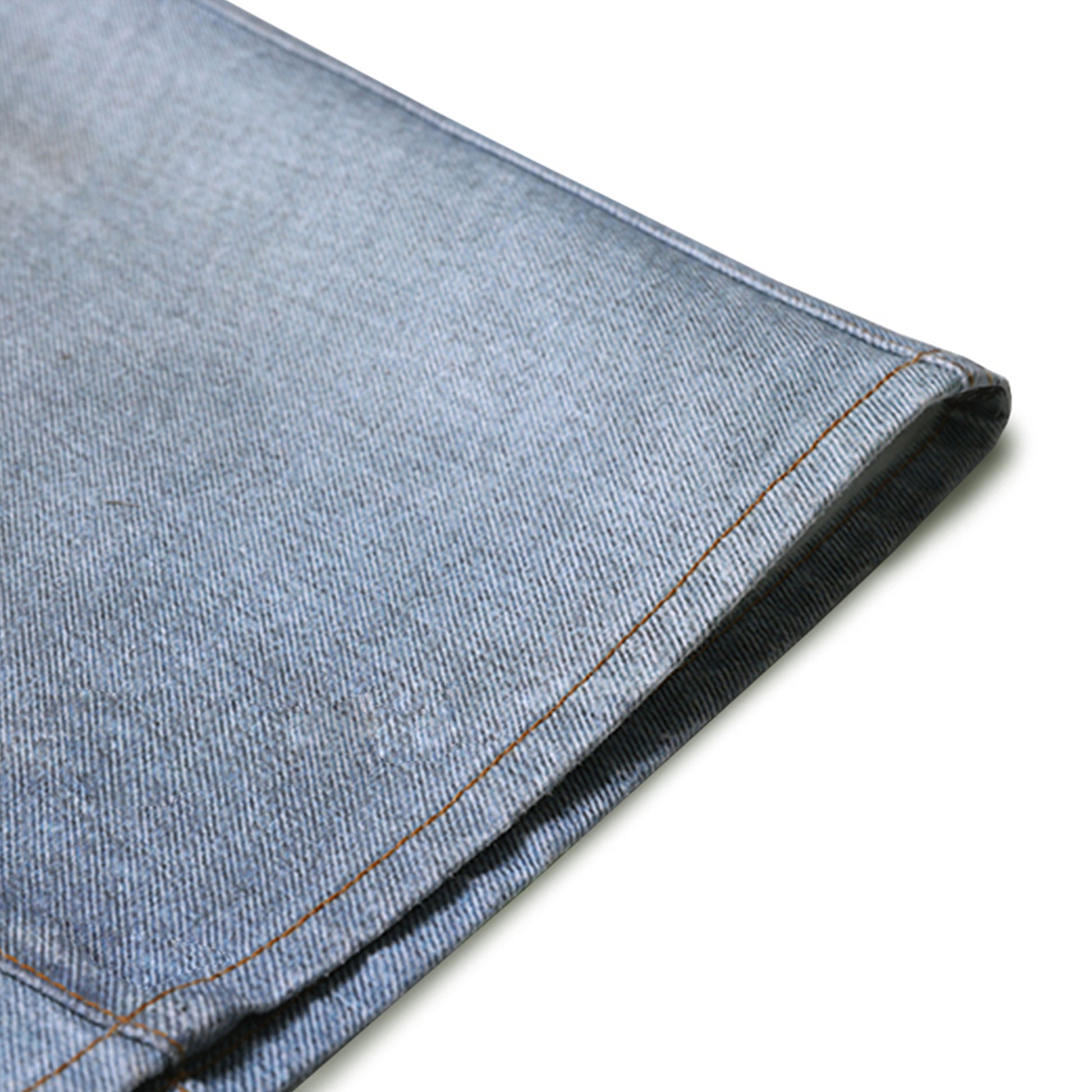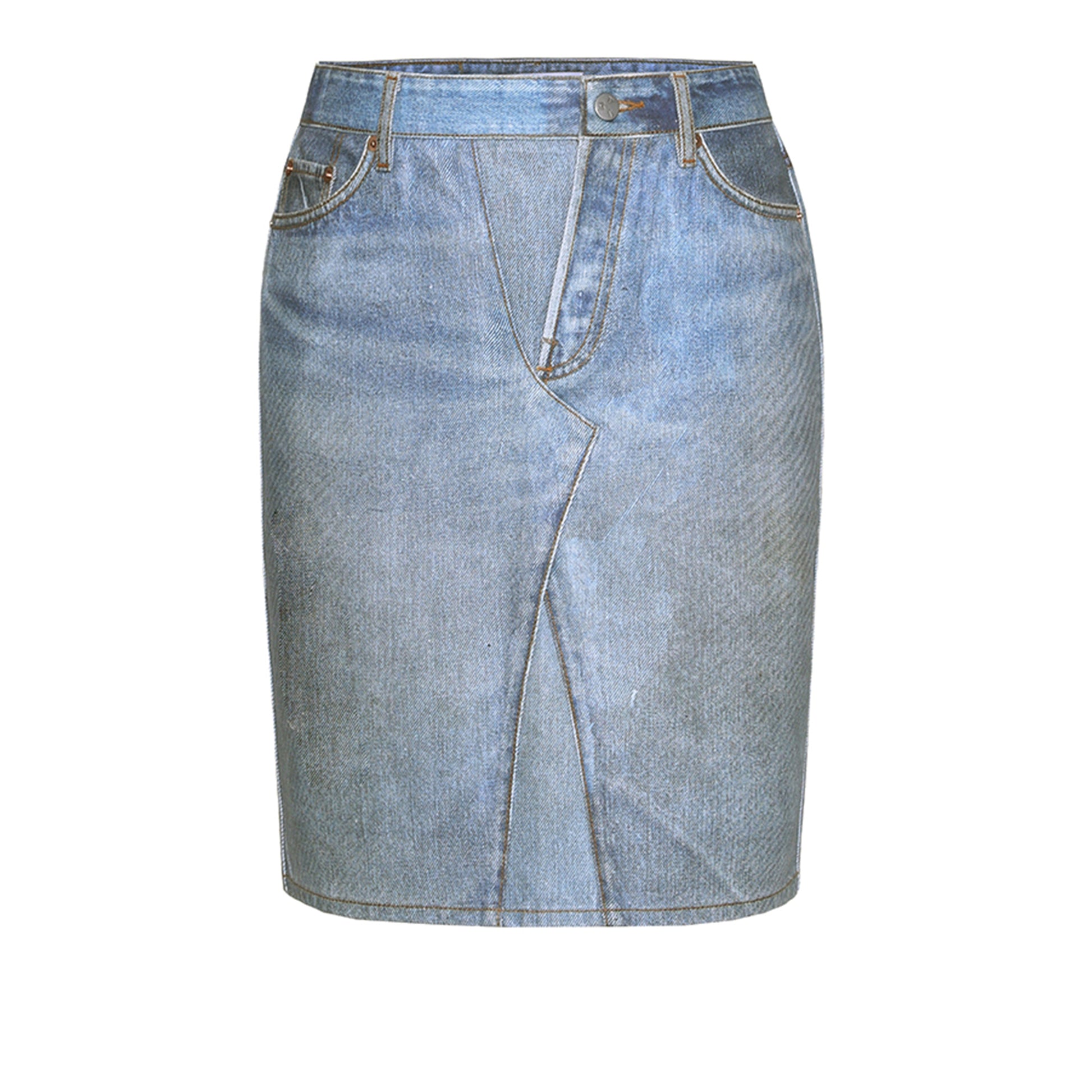 The studio photographed and converted a finished and washed denim skirt into a flat image for digital printing on a stiff canvas base, visually simulating a finished denim skirt with all creases and wash effects appearing as a digital image.