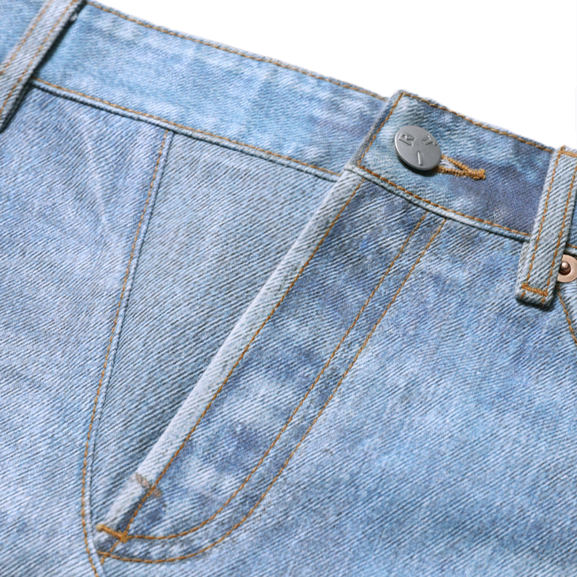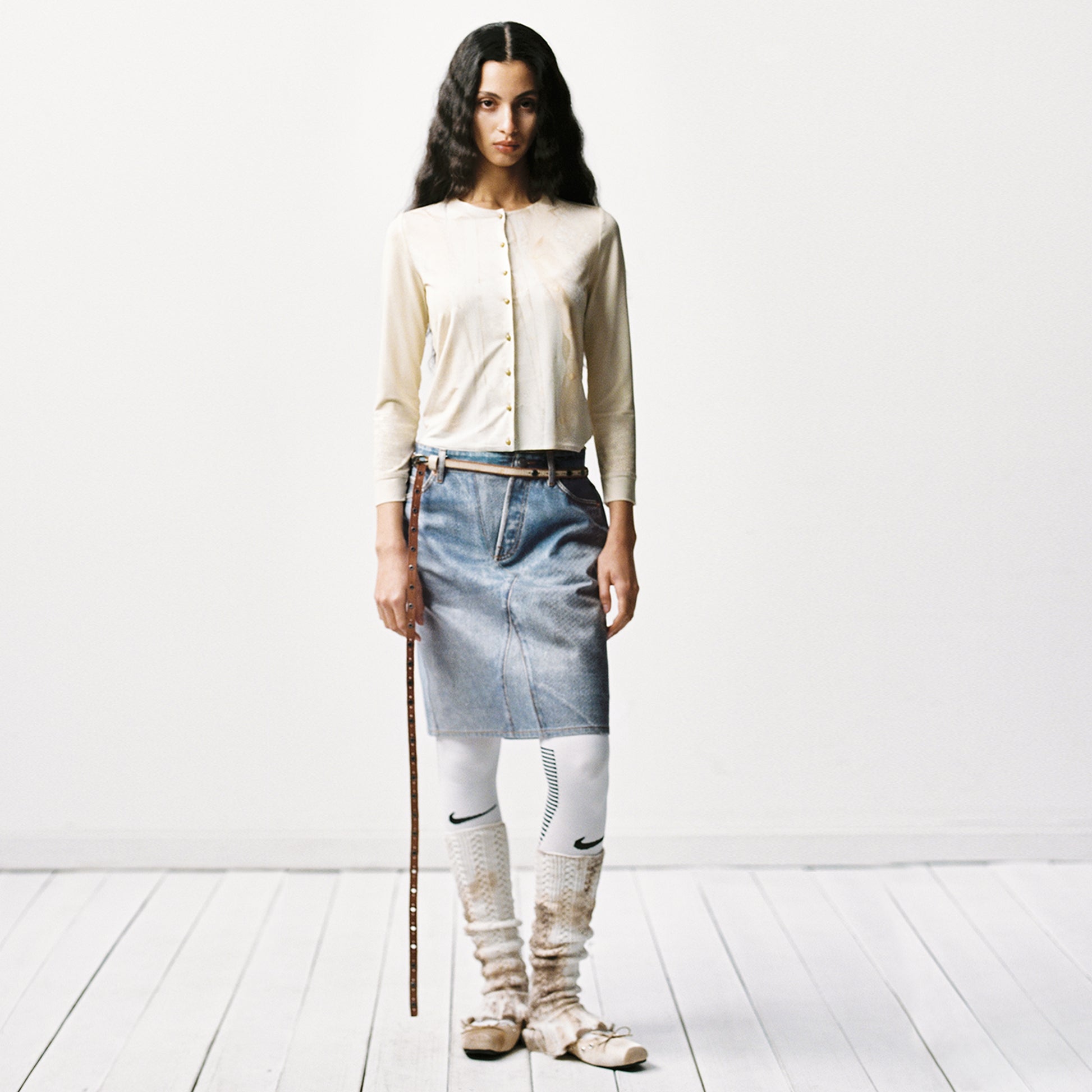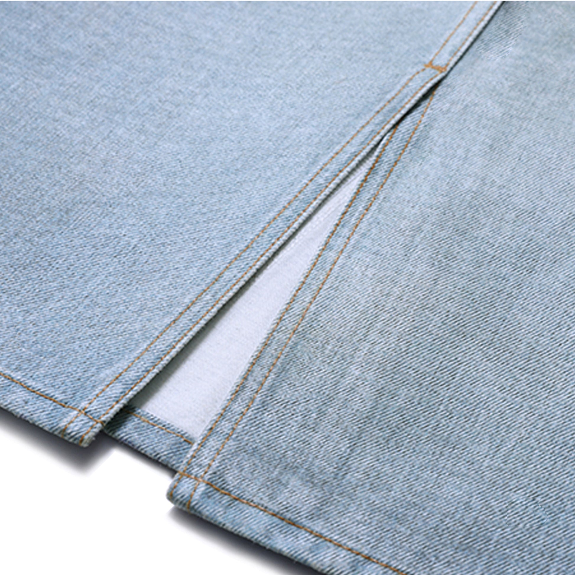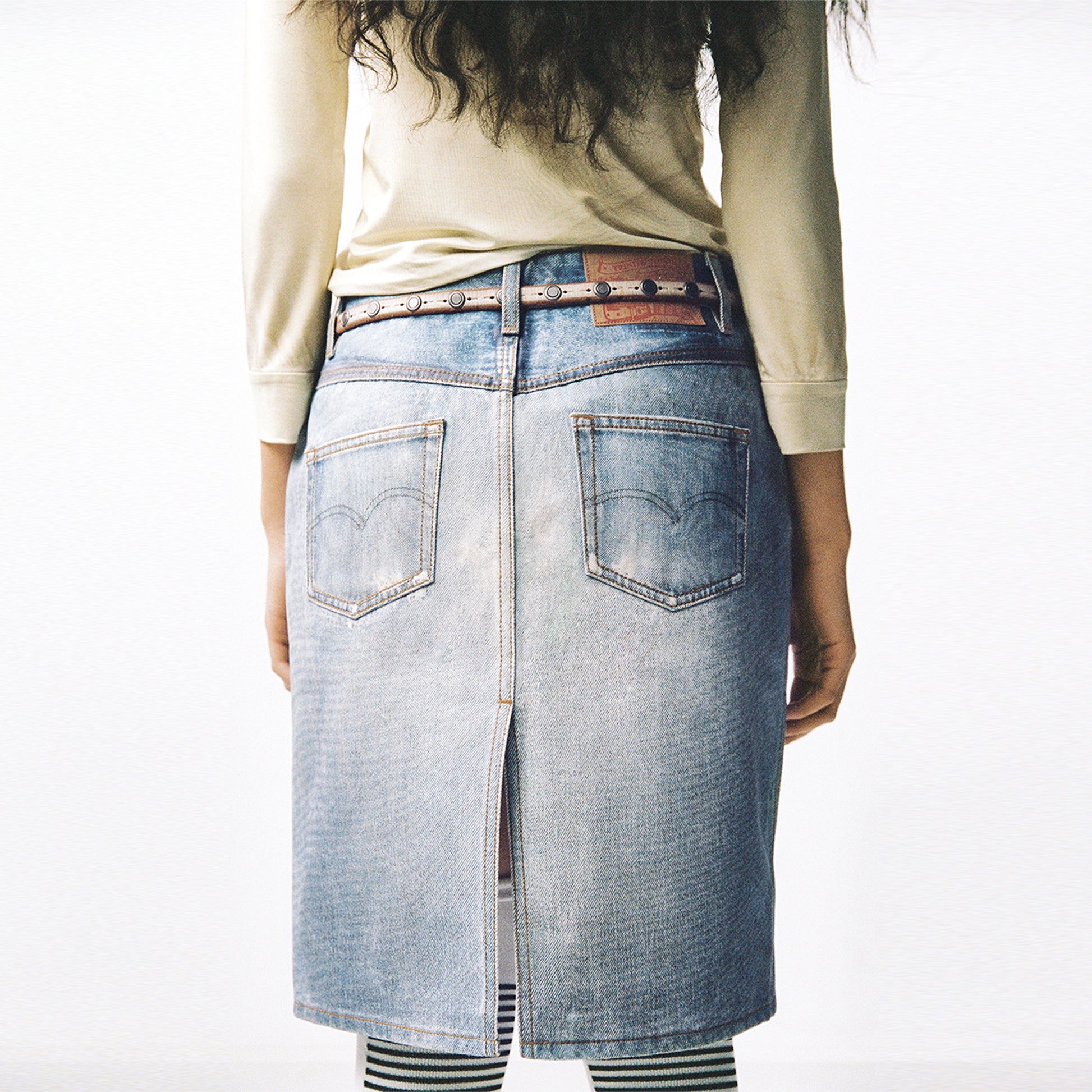 The studio photographed and converted a finished and washed denim skirt into a flat image for digital printing on a stiff canvas base, visually simulating a finished denim skirt with all creases and wash effects appearing as a digital image.