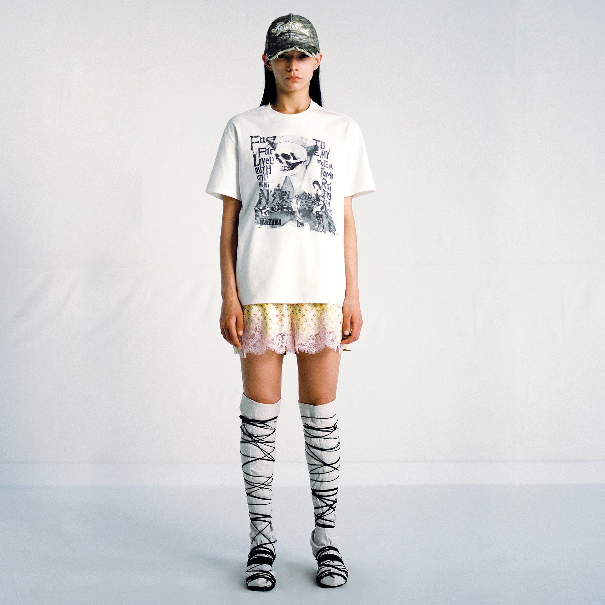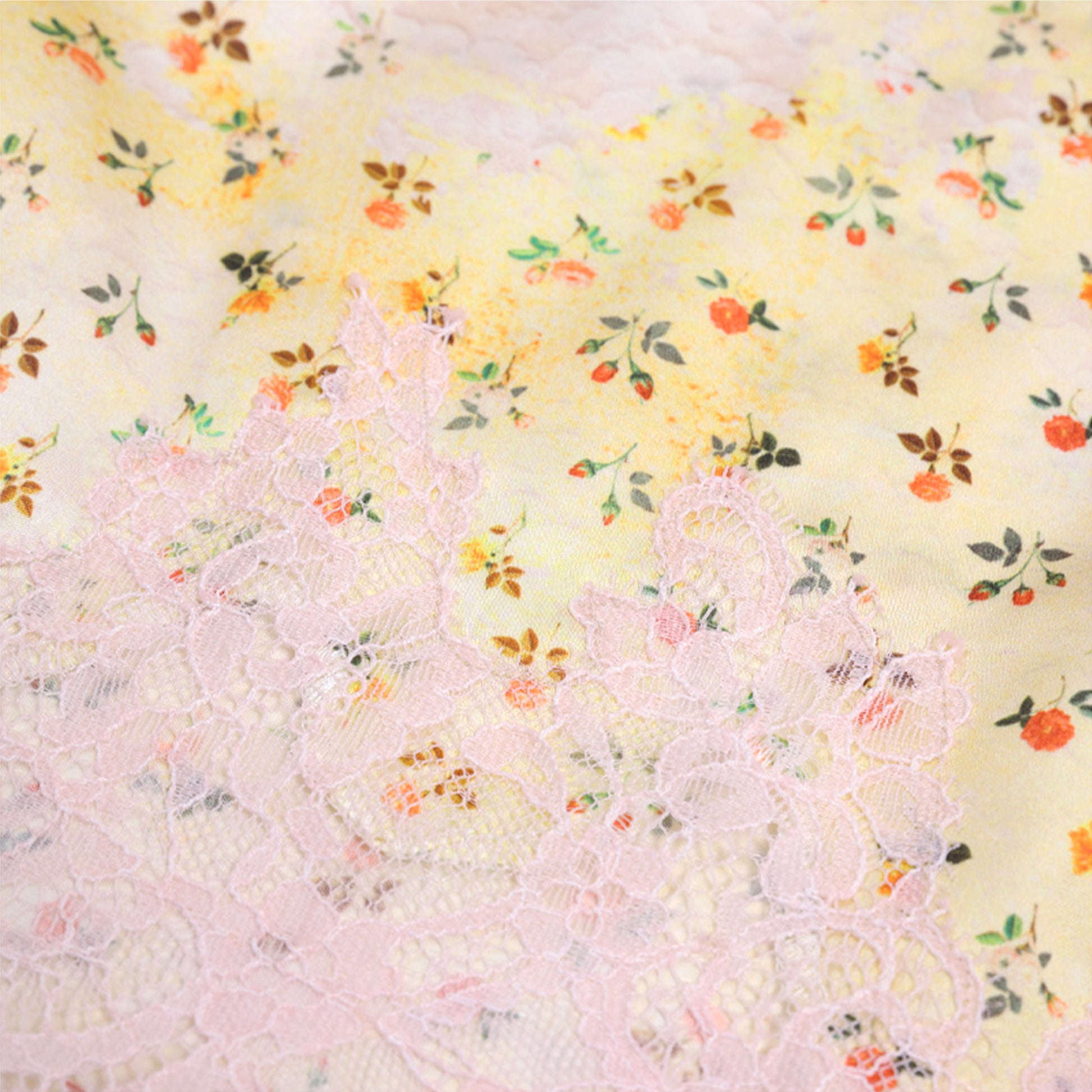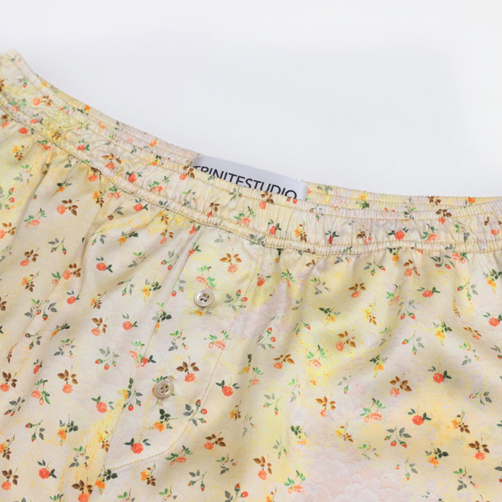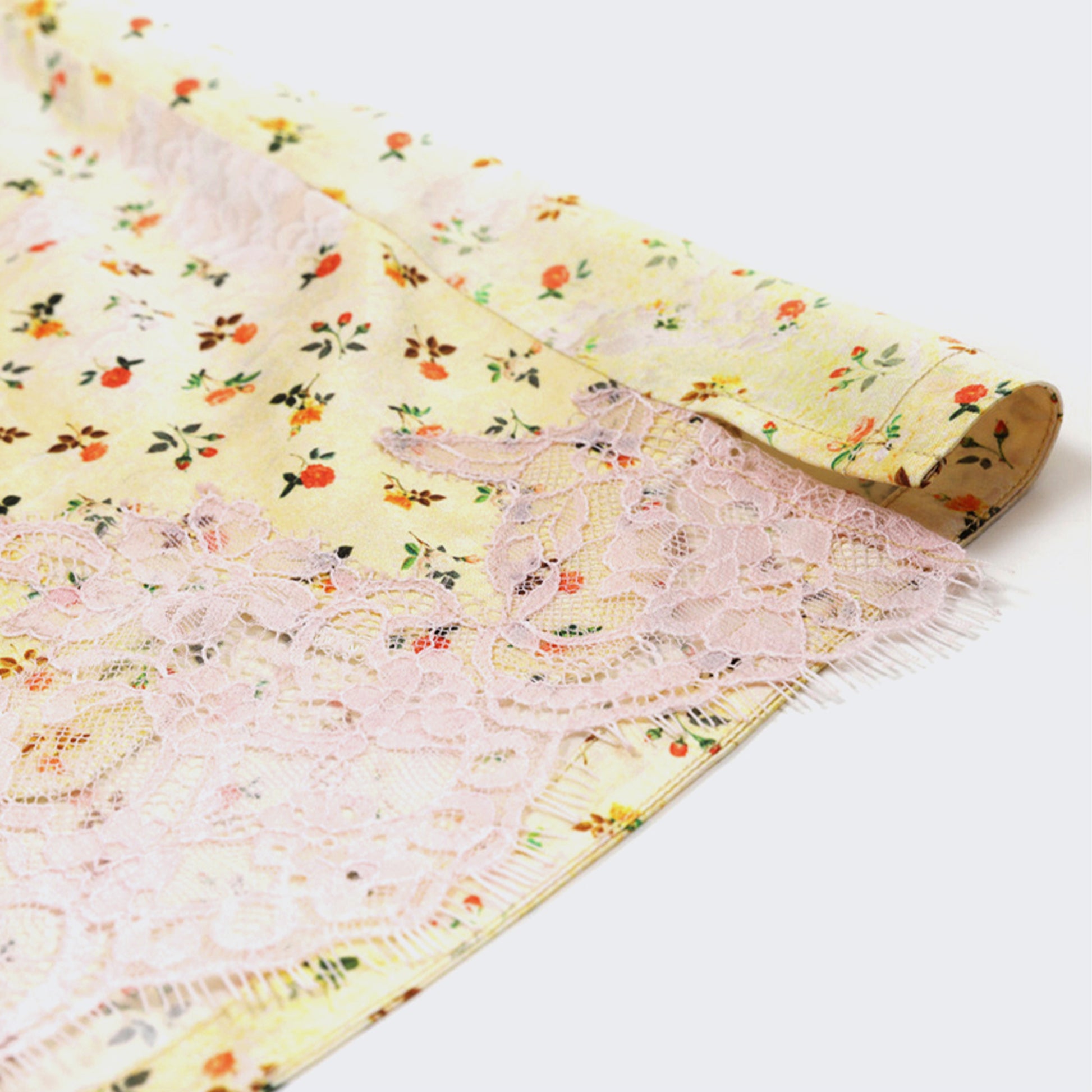 Independently photographed and designed by TRINITEstudio, this piece features eight different classic rose patterns clustered on a low-saturation yellow base fabric. The irregular distressed and rusty effects overlaid with faint nude lace break the girlishness of the floral pattern, adding a street-style edge and visual weight.