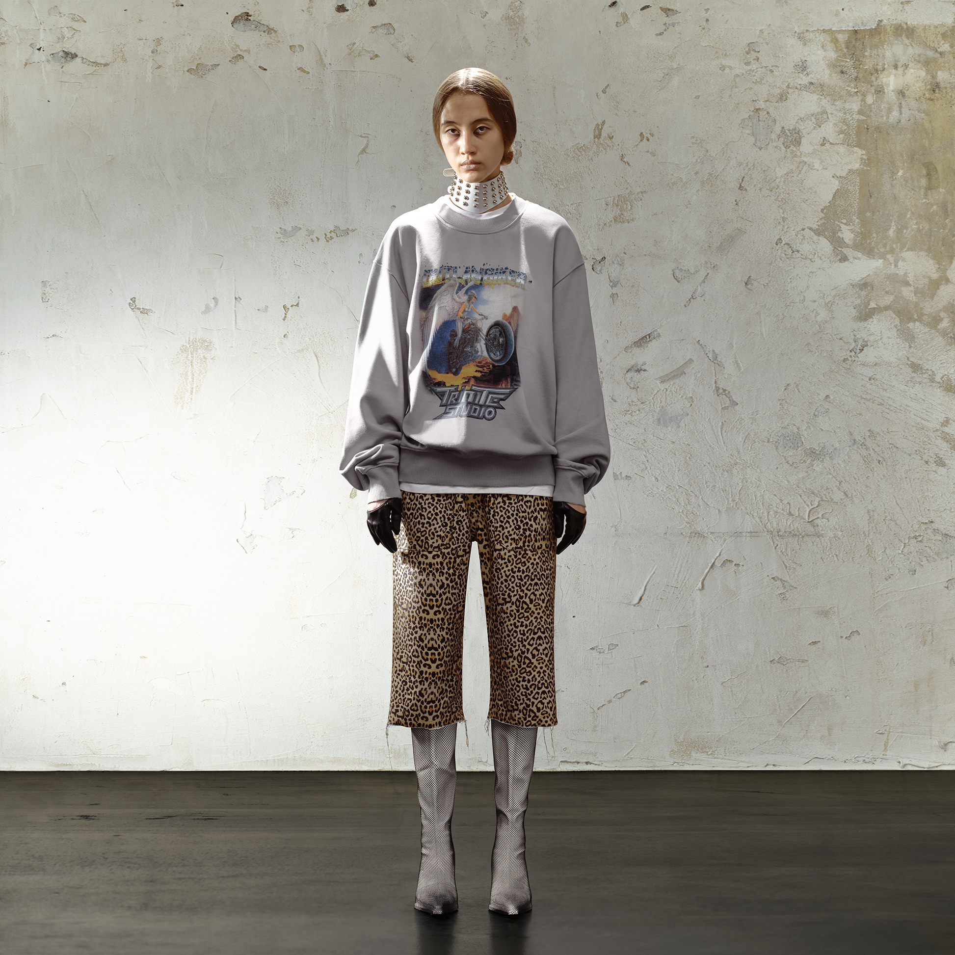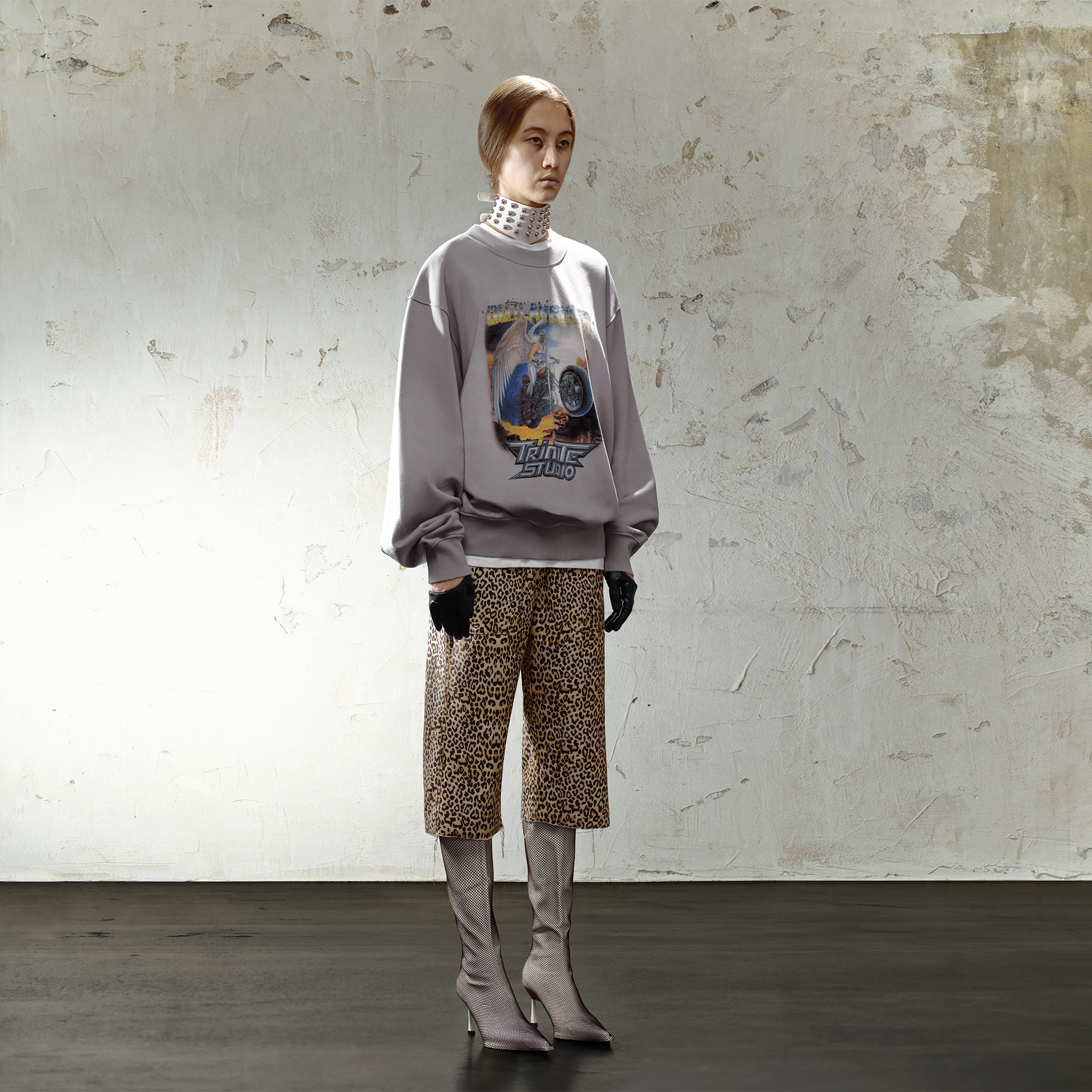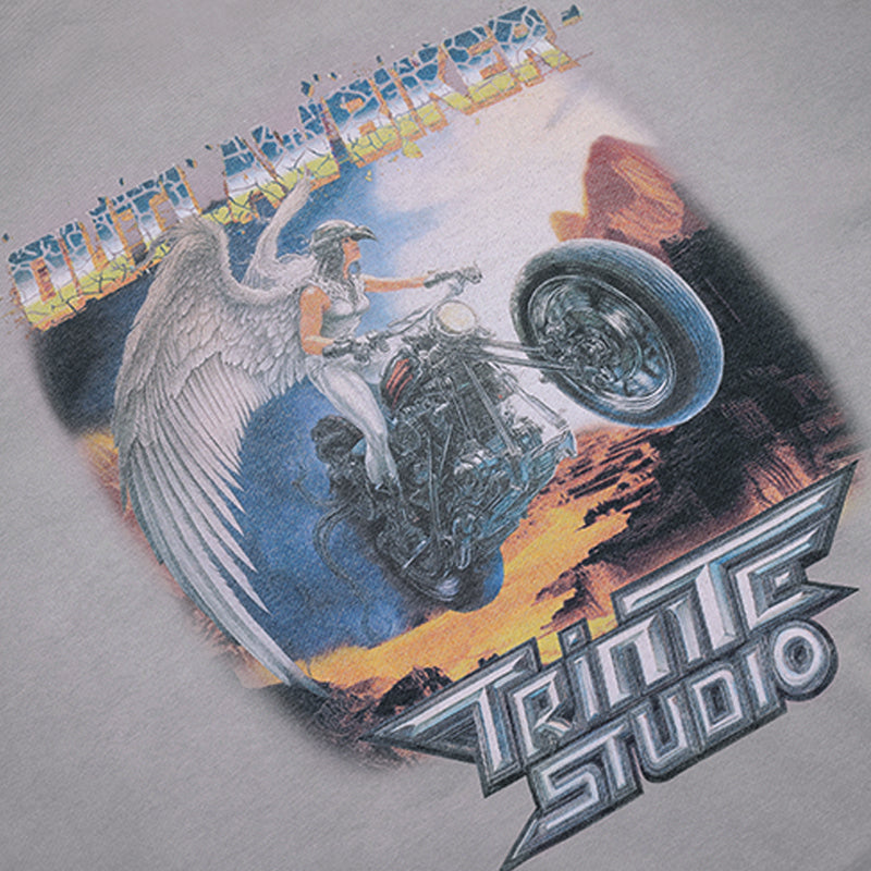 The sweatshirt silhouette and the washed-out, faded effect define the streetwear elements in the brand's image. The washed color and subtle wear marks create a natural vintage look. The cut offers a high degree of fit inclusivity and ensures comfortable wear. The chest features an angel-and-motorcycle pattern developed by the studio, combining romance with speed for a visually striking impact.