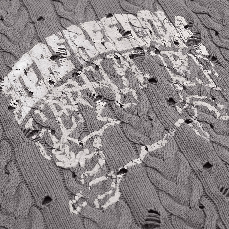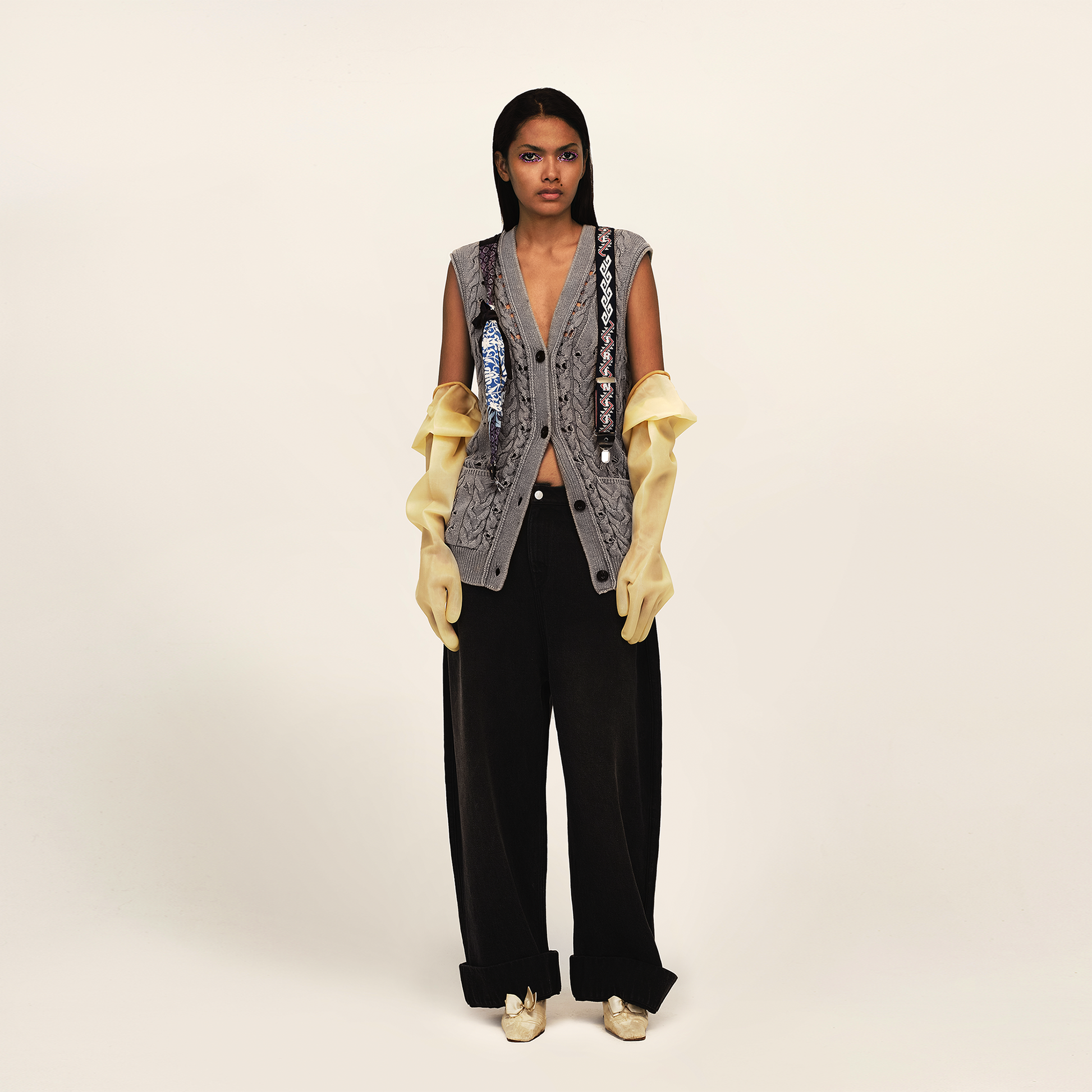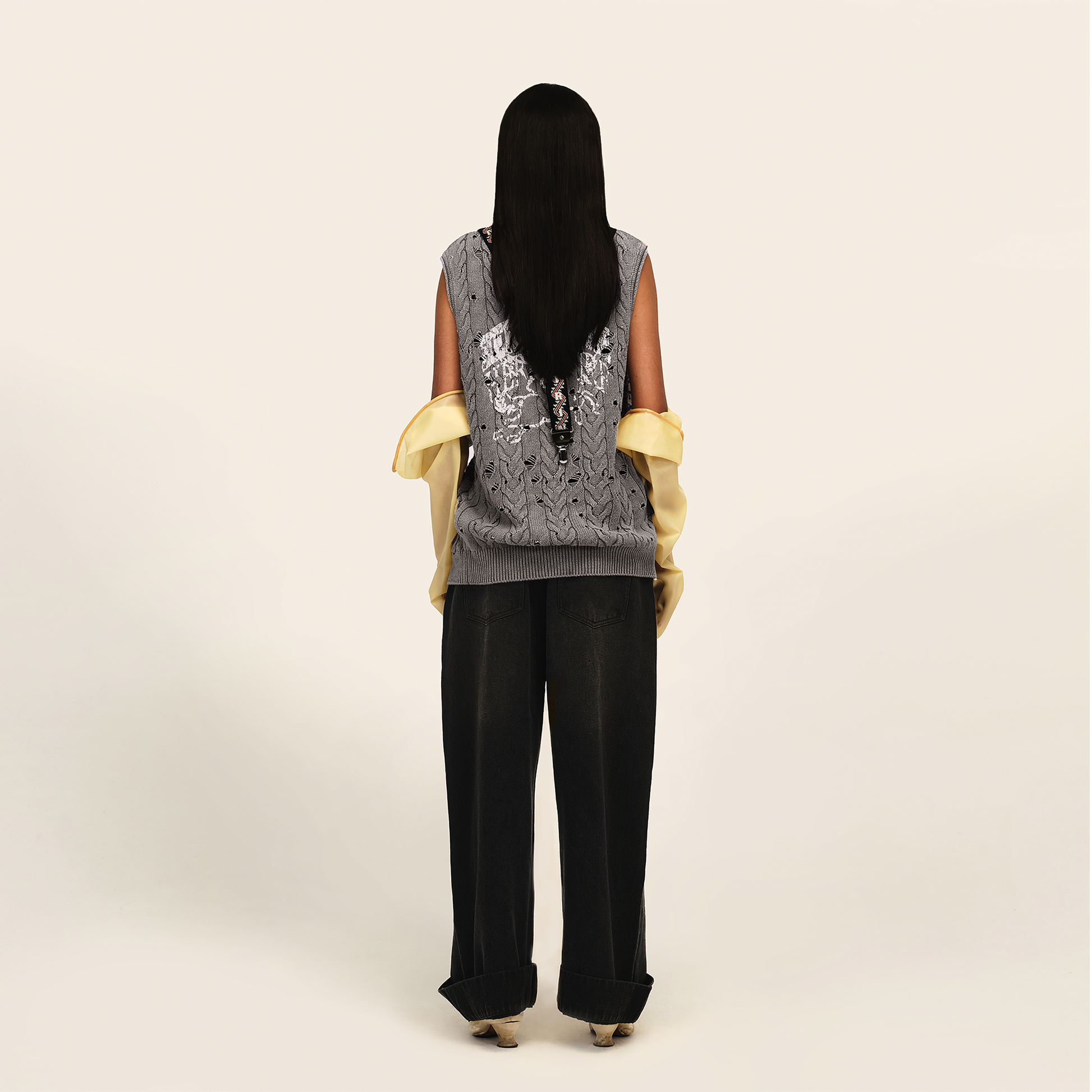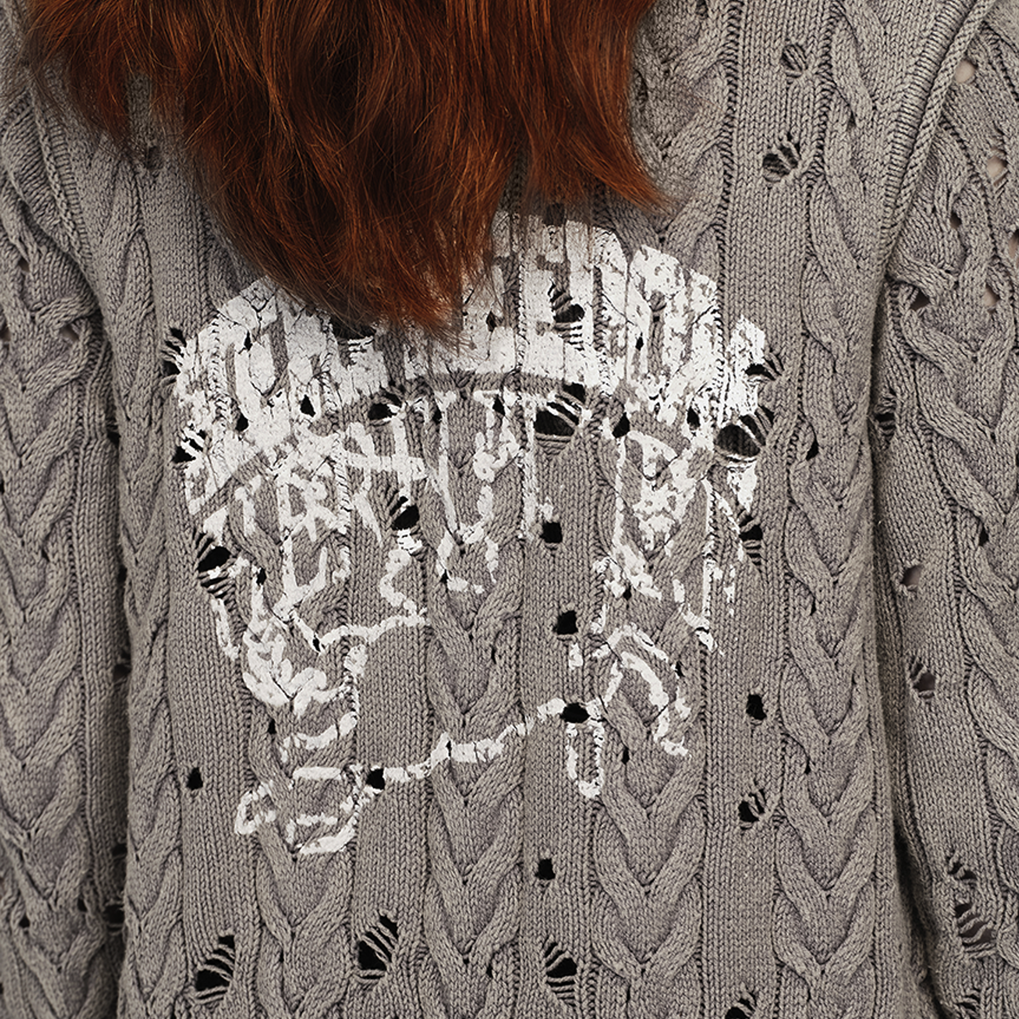 This vest cleverly blends vintage charm with a street-style distressed aesthetic. The soft texture of the yarn evokes memories of childhood knitwear, while the grey hue enhances its retro appeal. The craftsmanship features classic Aran cable knitting, paired with hand-cut hole techniques to simulate a worn effect, emphasizing a sense of rebellion and individuality. The back showcases a “HER FREEDOM” Pegasus design, rendered with placement screen printing technology, symbolizing freedom and strength, perfectly aligning with the season’s theme.
