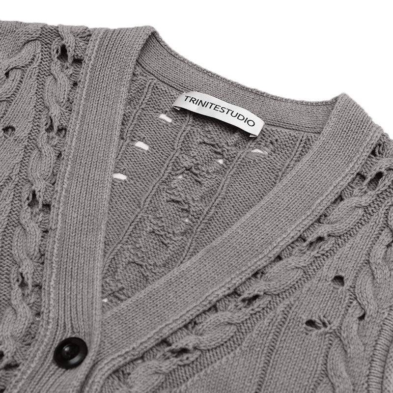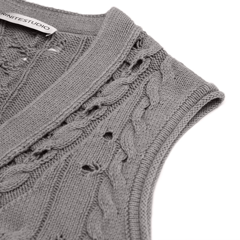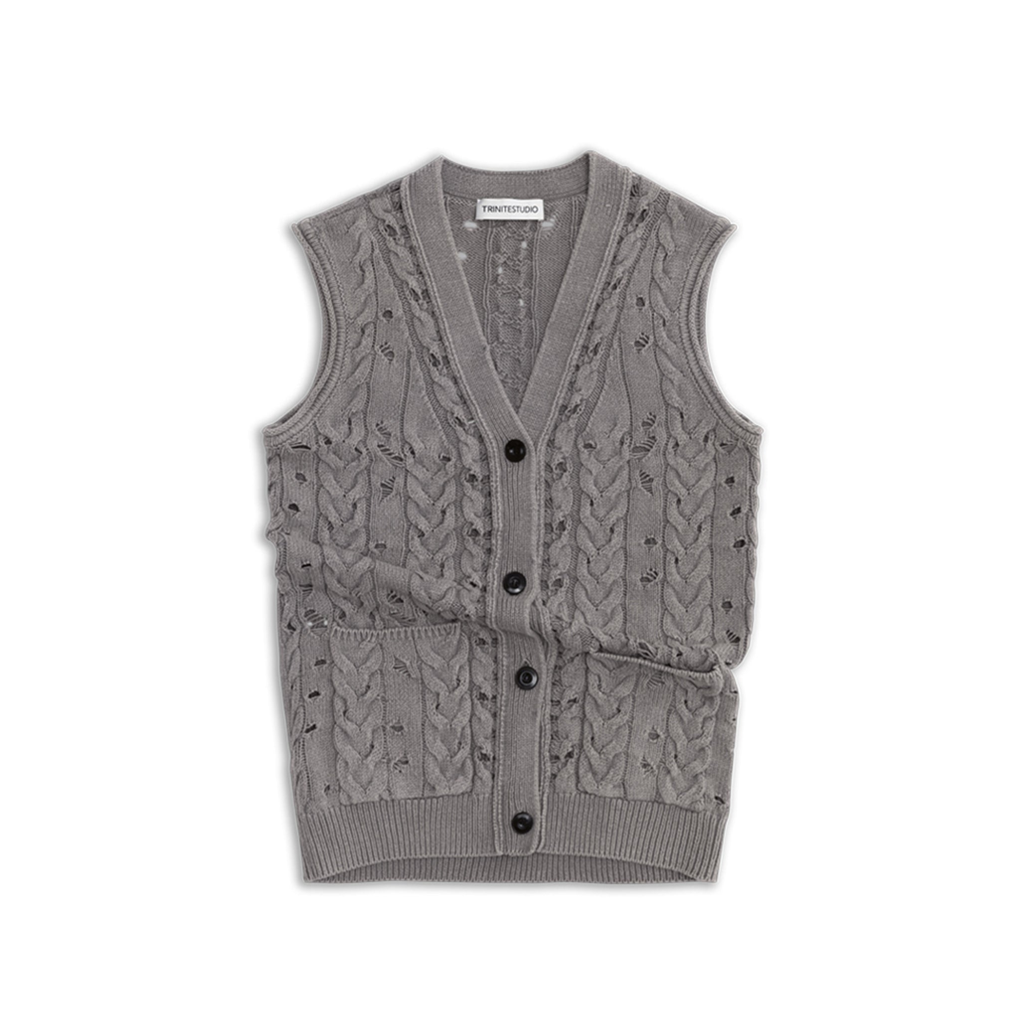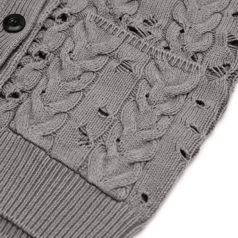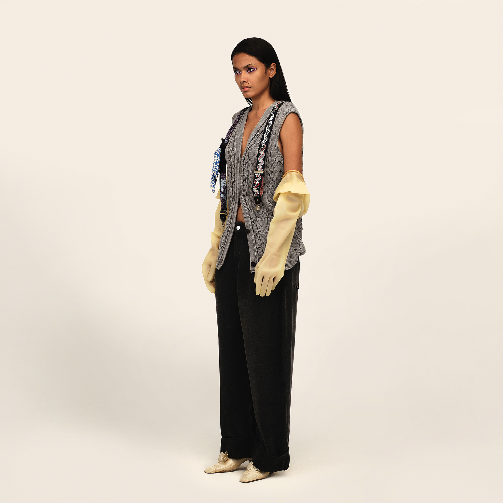 This vest cleverly blends vintage charm with a street-style distressed aesthetic. The soft texture of the yarn evokes memories of childhood knitwear, while the grey hue enhances its retro appeal. The craftsmanship features classic Aran cable knitting, paired with hand-cut hole techniques to simulate a worn effect, emphasizing a sense of rebellion and individuality. The back showcases a “HER FREEDOM” Pegasus design, rendered with placement screen printing technology, symbolizing freedom and strength, perfectly aligning with the season’s theme.
