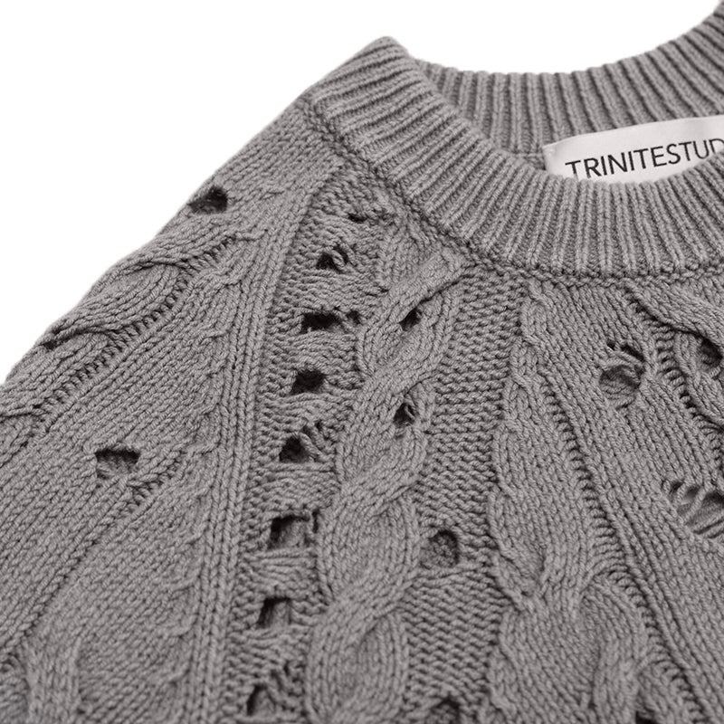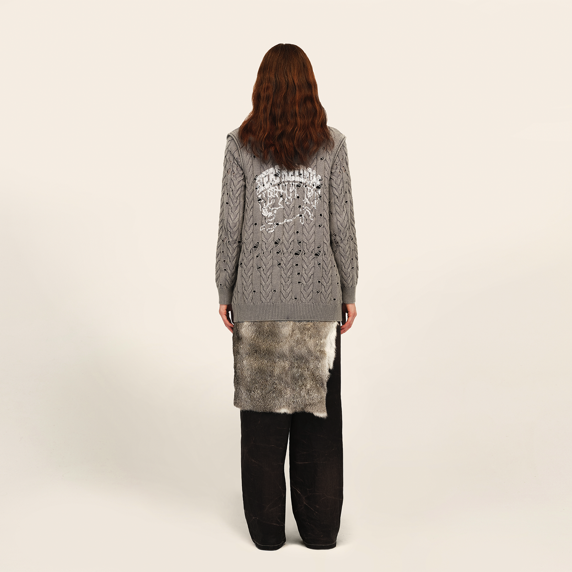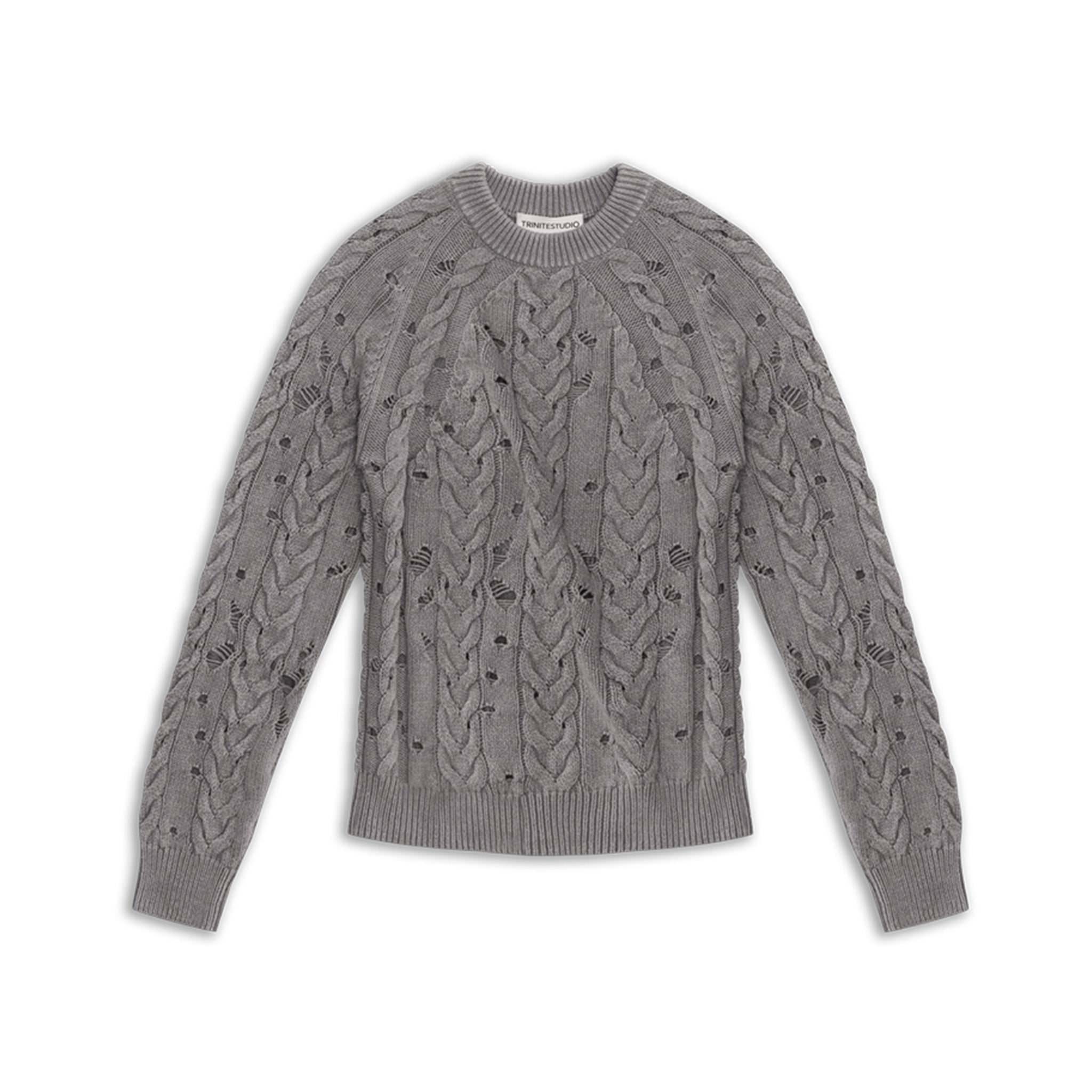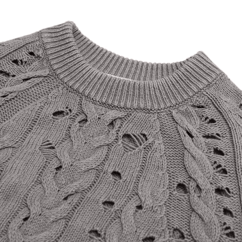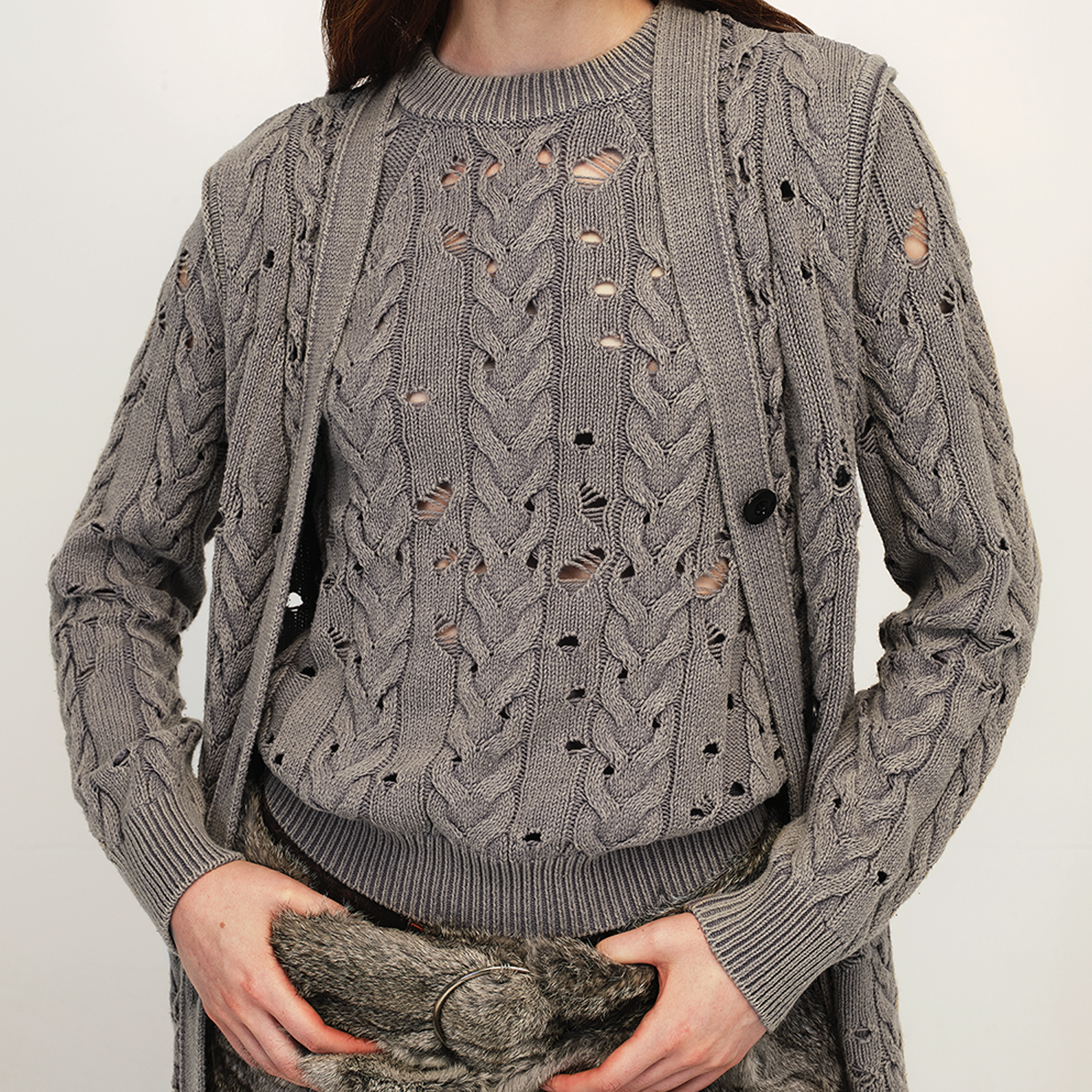 This knitted top seamlessly blends vintage charm with a street-style distressed aesthetic. The yarn’s texture recalls the feel of childhood knitwear, while the grey tone adds a strong retro vibe. The craftsmanship features classic Aran cable knitting, combined with hand-cut hole techniques to create a worn-in effect, highlighting a sense of rebellion and individuality.