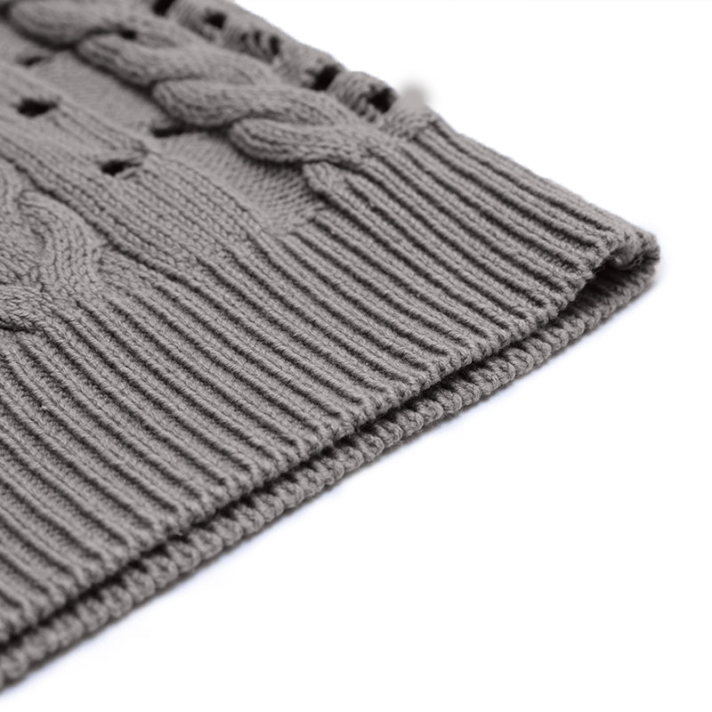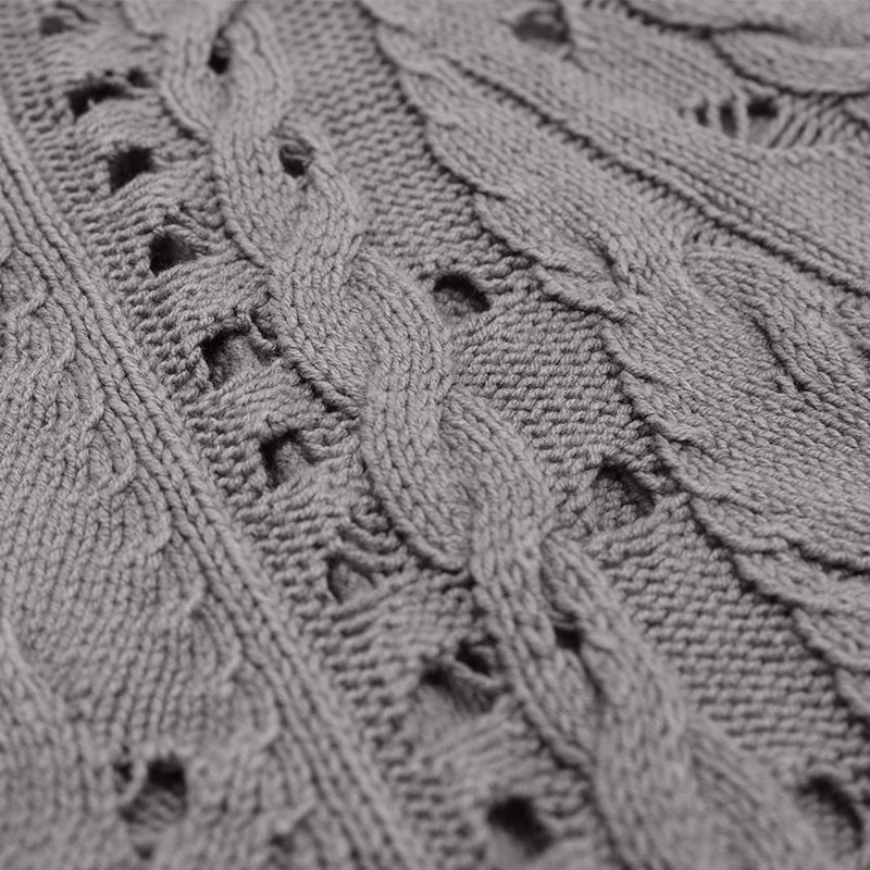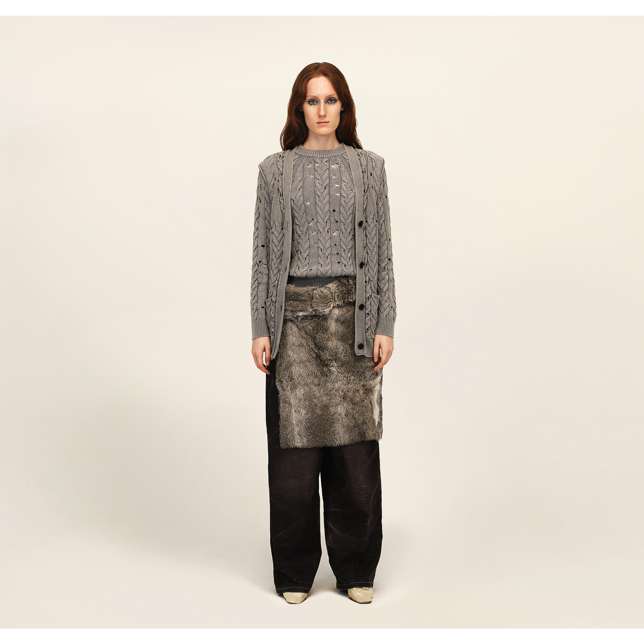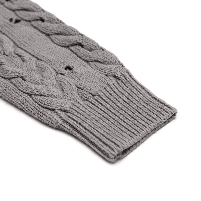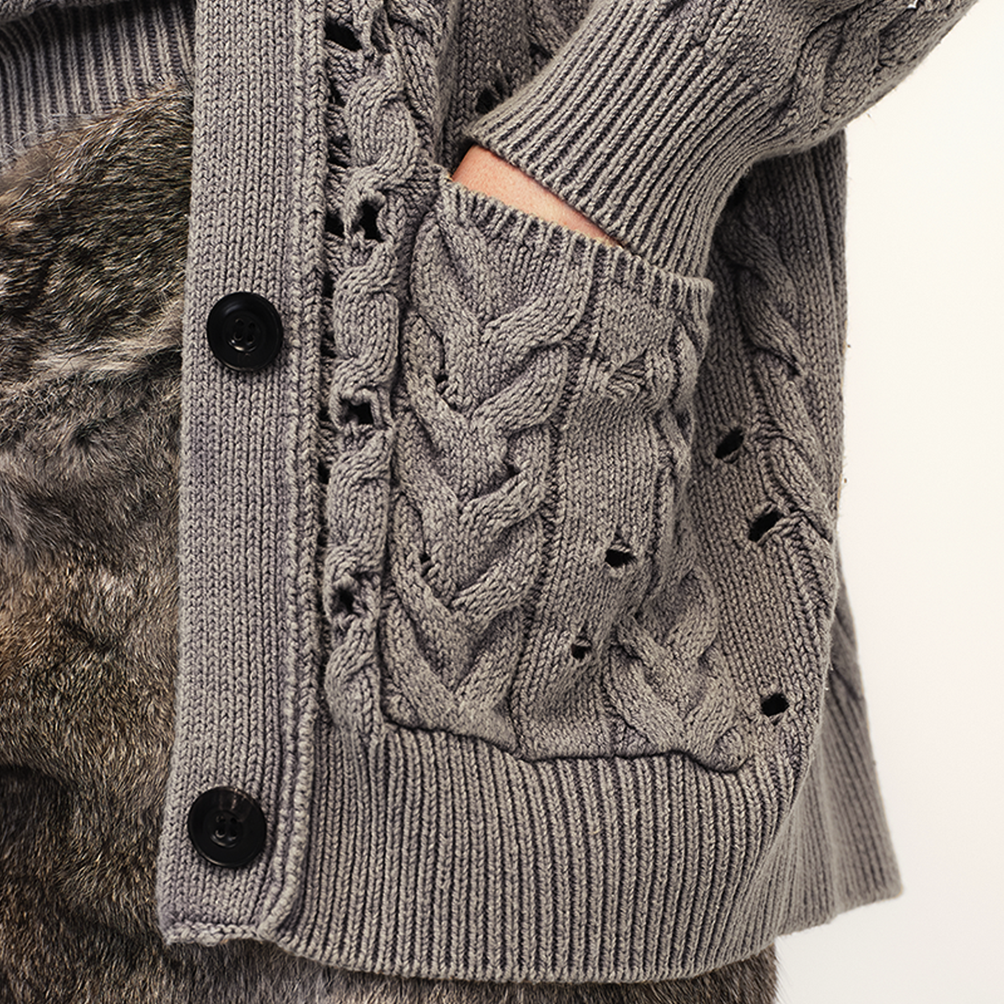 This knitted top seamlessly blends vintage charm with a street-style distressed aesthetic. The yarn’s texture recalls the feel of childhood knitwear, while the grey tone adds a strong retro vibe. The craftsmanship features classic Aran cable knitting, combined with hand-cut hole techniques to create a worn-in effect, highlighting a sense of rebellion and individuality.