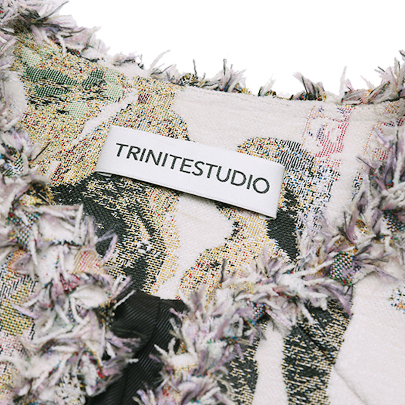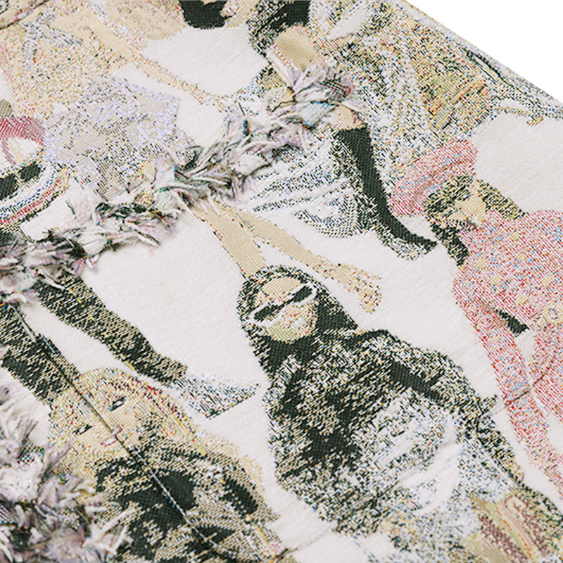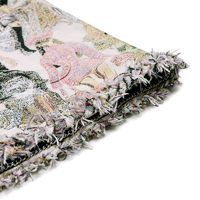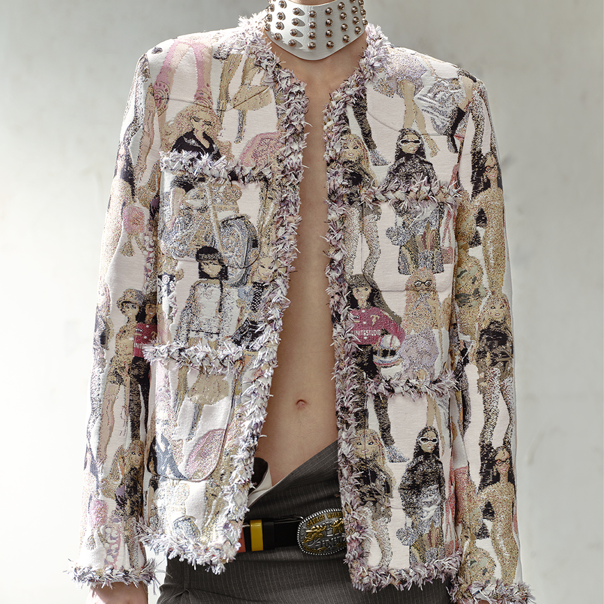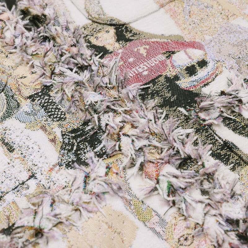 This jacquard-trimmed coarse-spun jacket is crafted from custom jacquard fabric developed by the studio, featuring 17 intricate patterns woven from yarns in varying colors to create rich visual layers. The placket, cuffs, hem, and pocket openings are all adorned with raw-edge fabric weaving, adding subtle texture. The front closure utilizes metal hook fastenings, while the hem is accentuated with a metal chain to refine the silhouette and enhance the unique design.