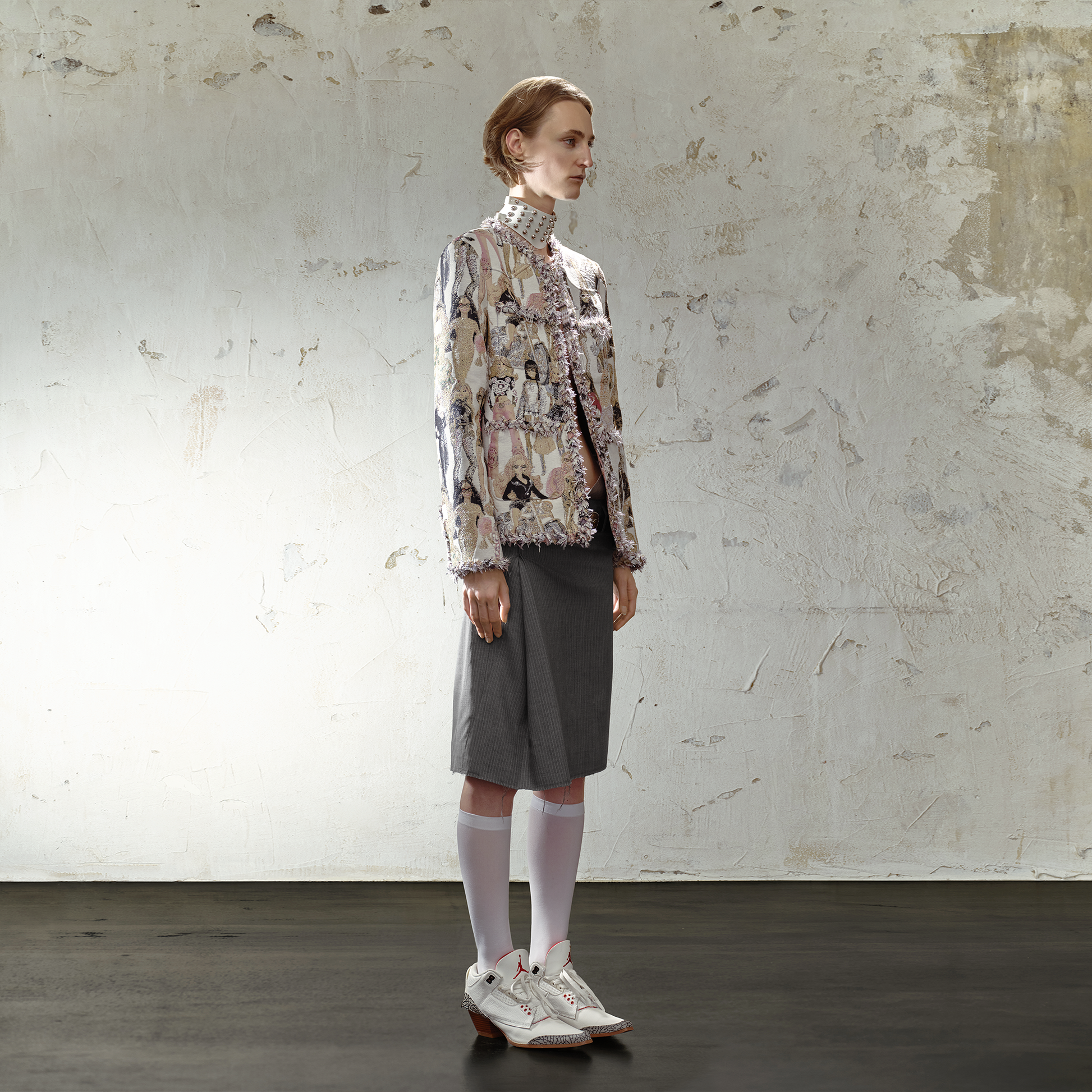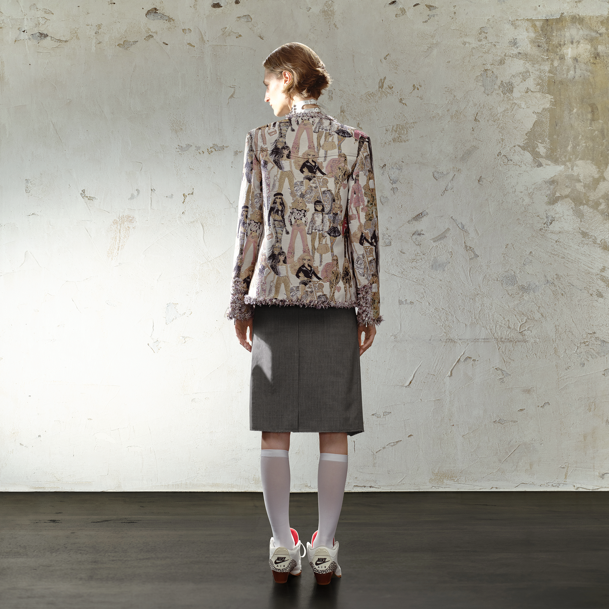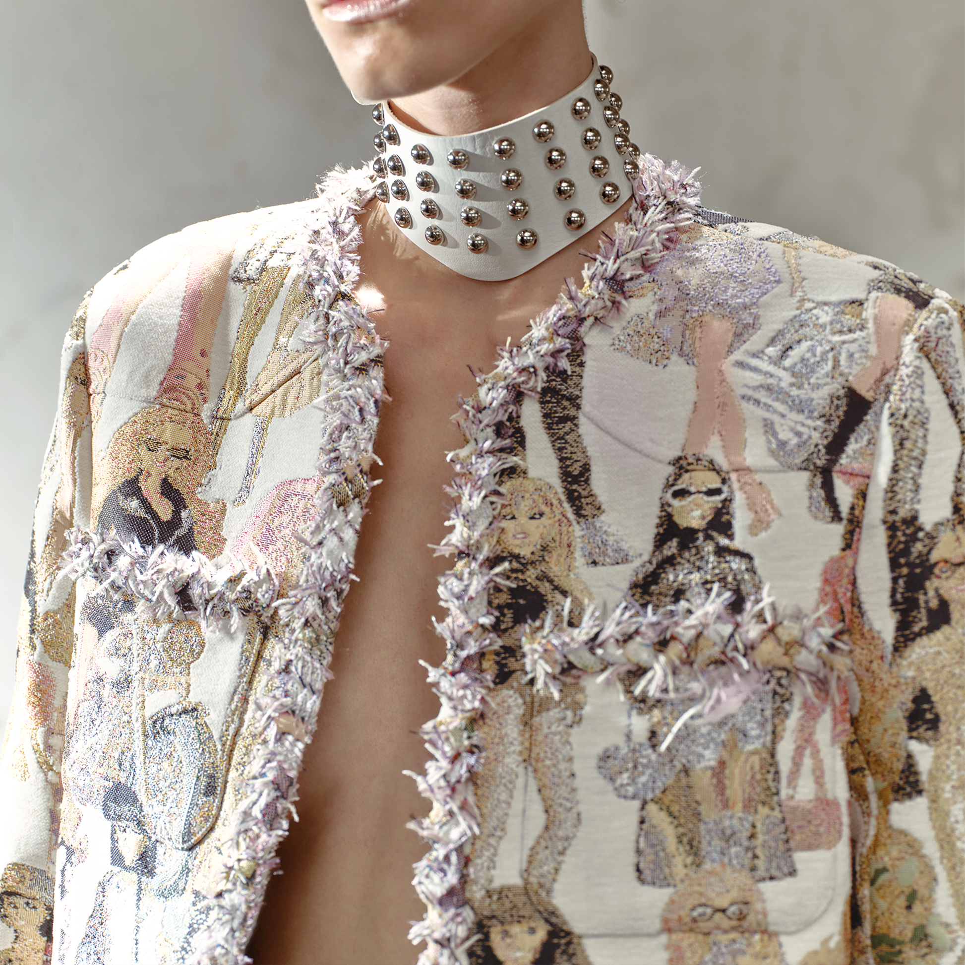 This jacquard-trimmed coarse-spun jacket is crafted from custom jacquard fabric developed by the studio, featuring 17 intricate patterns woven from yarns in varying colors to create rich visual layers. The placket, cuffs, hem, and pocket openings are all adorned with raw-edge fabric weaving, adding subtle texture. The front closure utilizes metal hook fastenings, while the hem is accentuated with a metal chain to refine the silhouette and enhance the unique design.