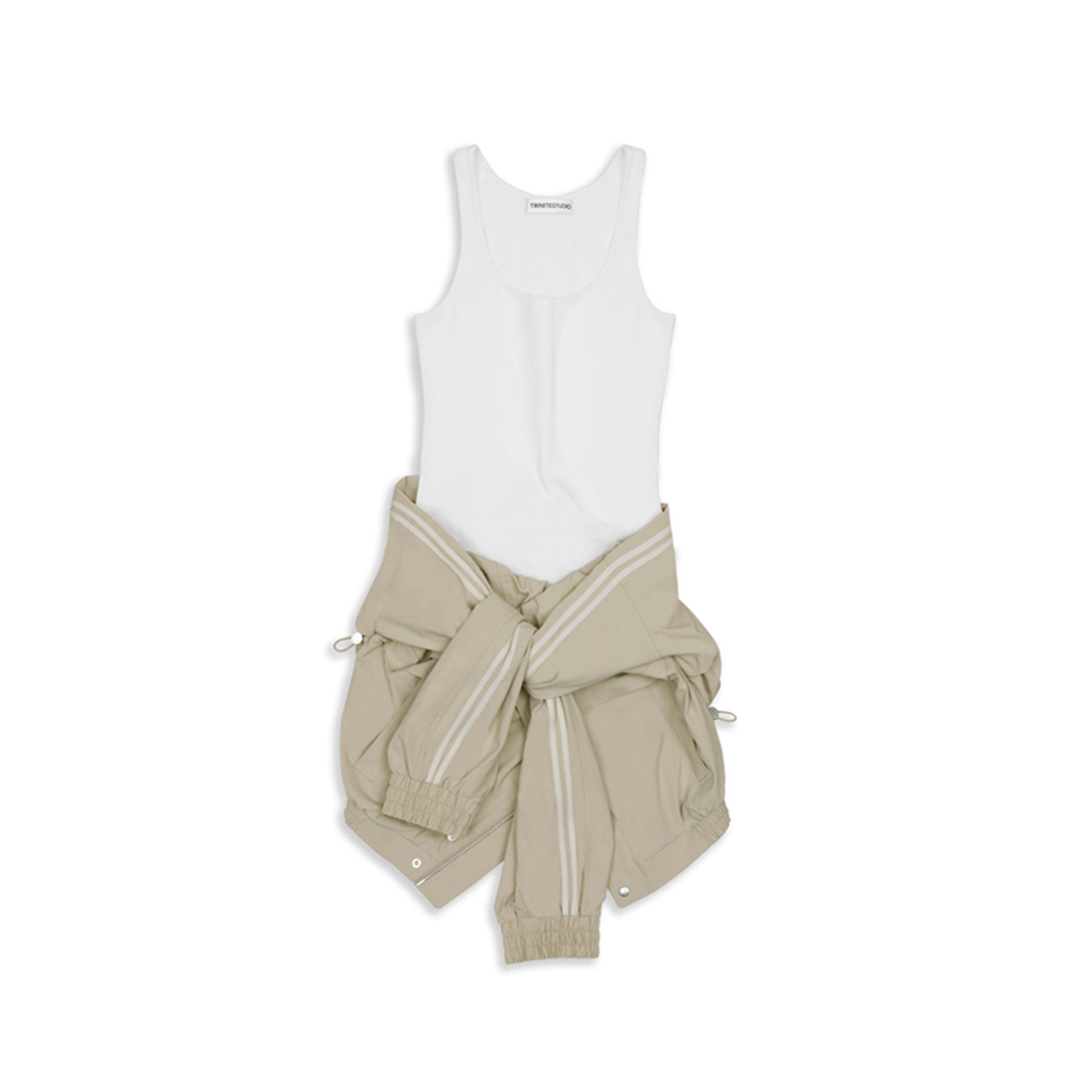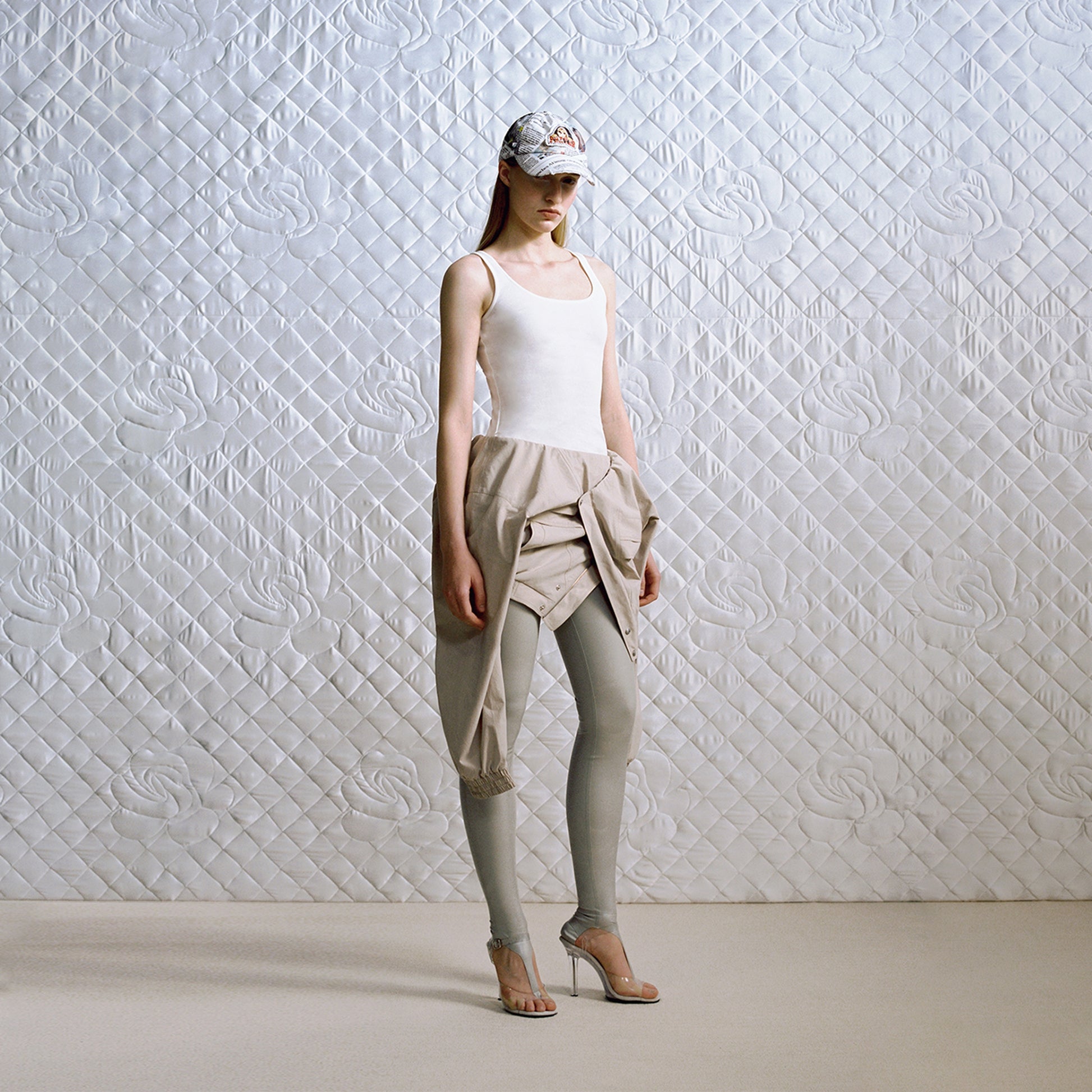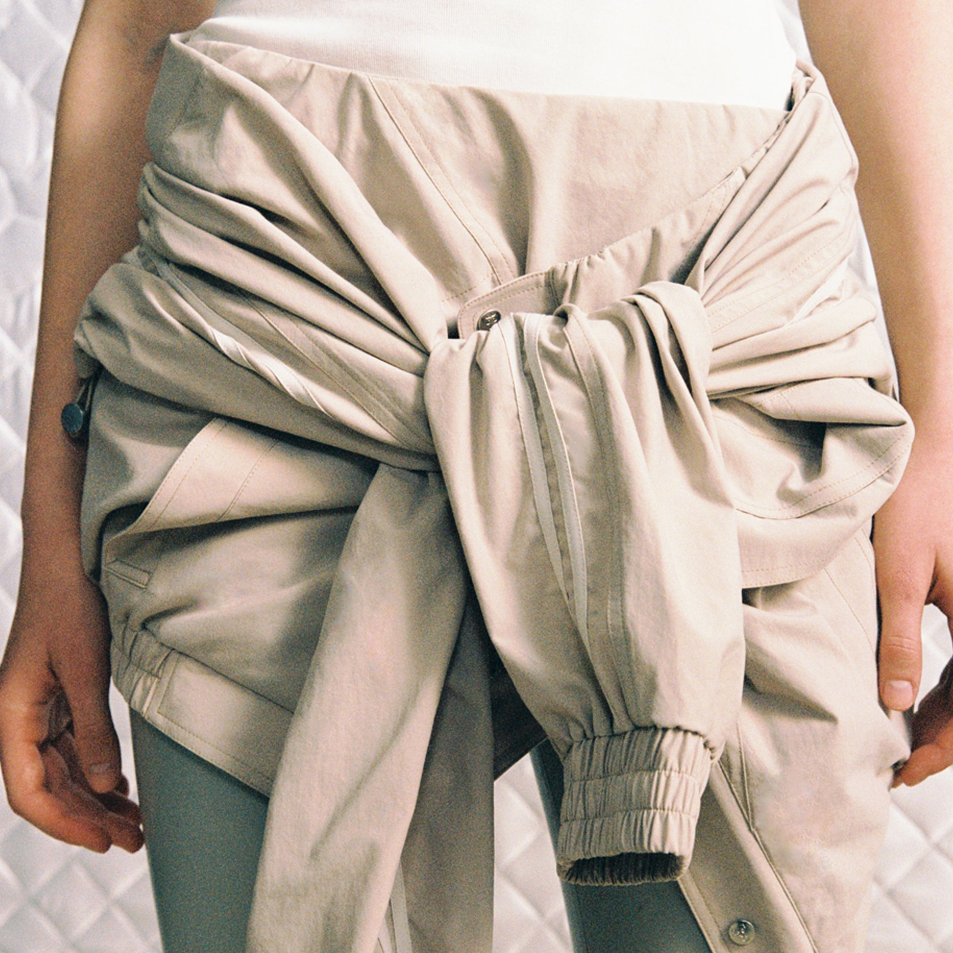 Deconstruct racing tops and track jackets and connect them to create layered silhouettes. The khaki lower body is simple and neutral, with a metal zipper as the main opening and closing method of the skirt, continuing the restrictive details of the track jacket, and the sleeves can be naturally draped or knotted and tightened. The skirt retains the classic coat pockets and features custom snap fastenings for rich detail, practicality, and design.