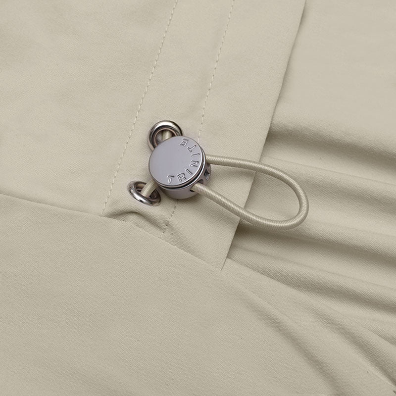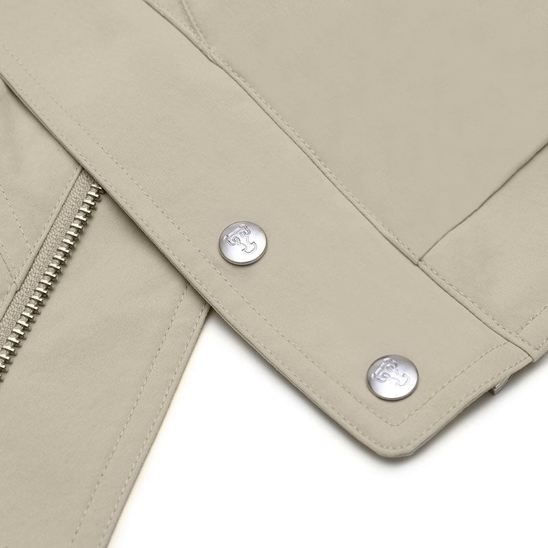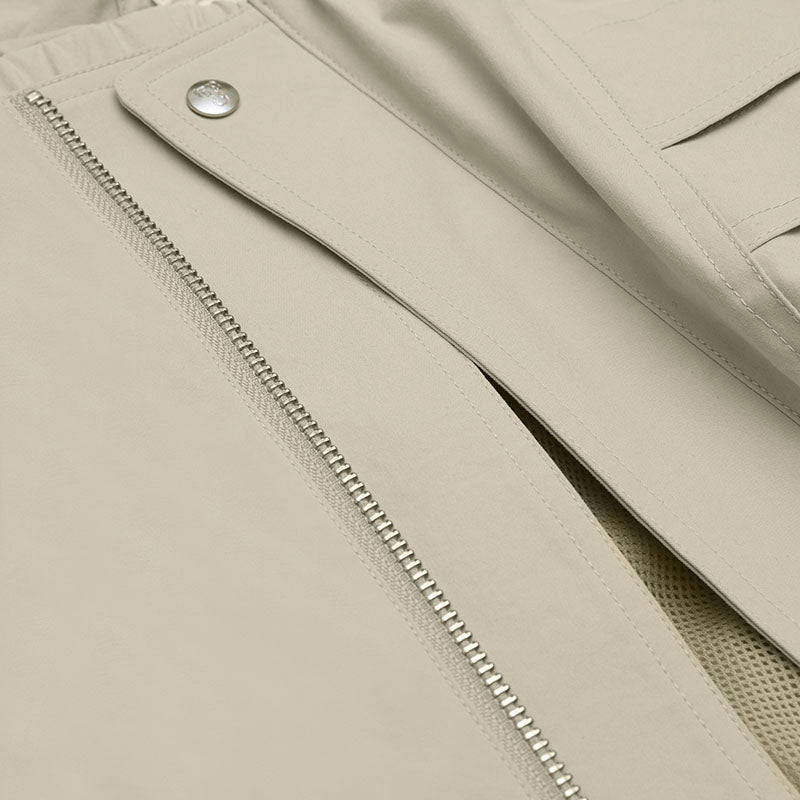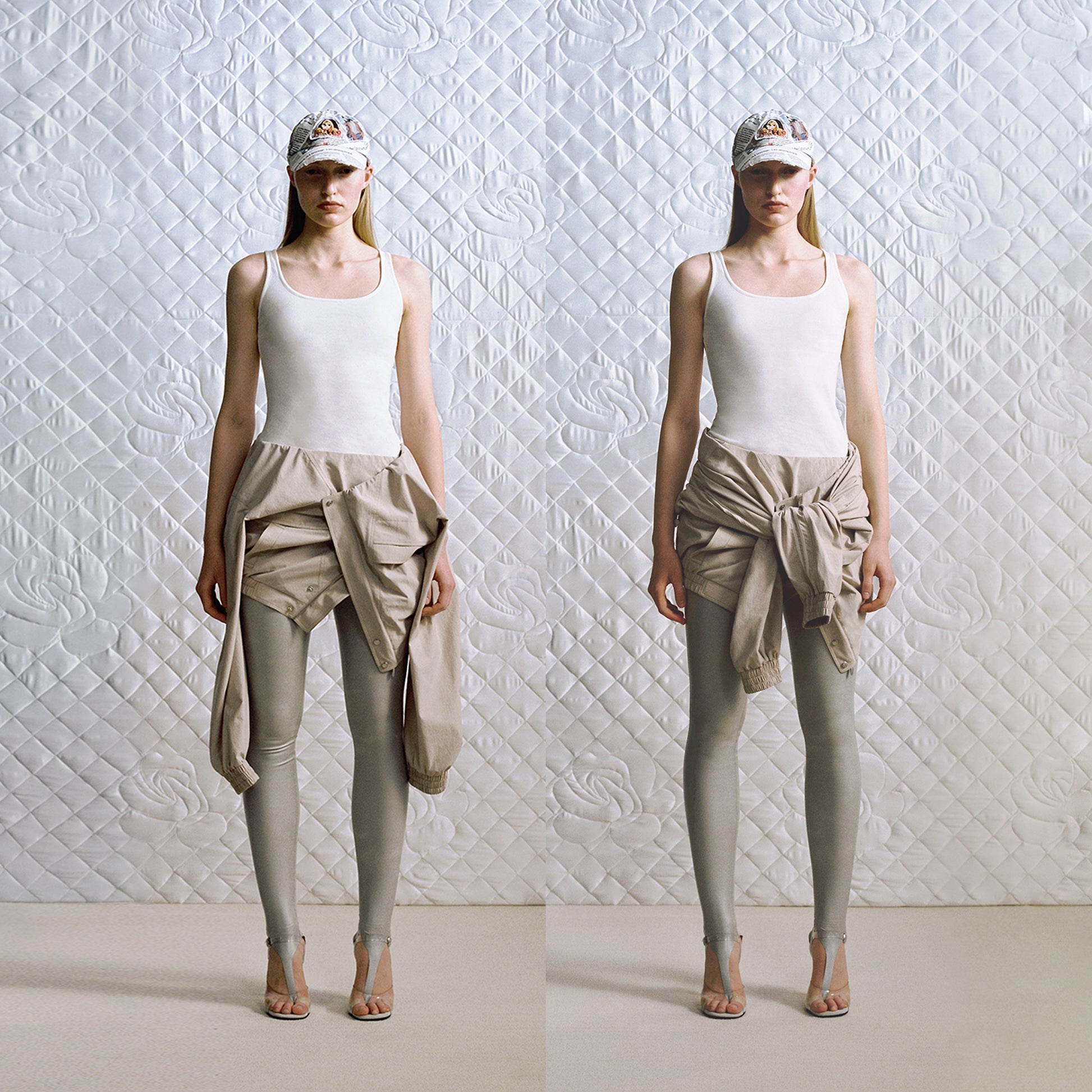 Deconstruct racing tops and track jackets and connect them to create layered silhouettes. The khaki lower body is simple and neutral, with a metal zipper as the main opening and closing method of the skirt, continuing the restrictive details of the track jacket, and the sleeves can be naturally draped or knotted and tightened. The skirt retains the classic coat pockets and features custom snap fastenings for rich detail, practicality, and design.
