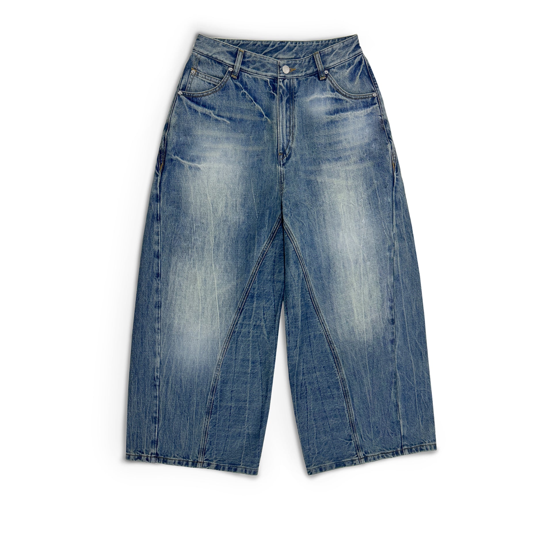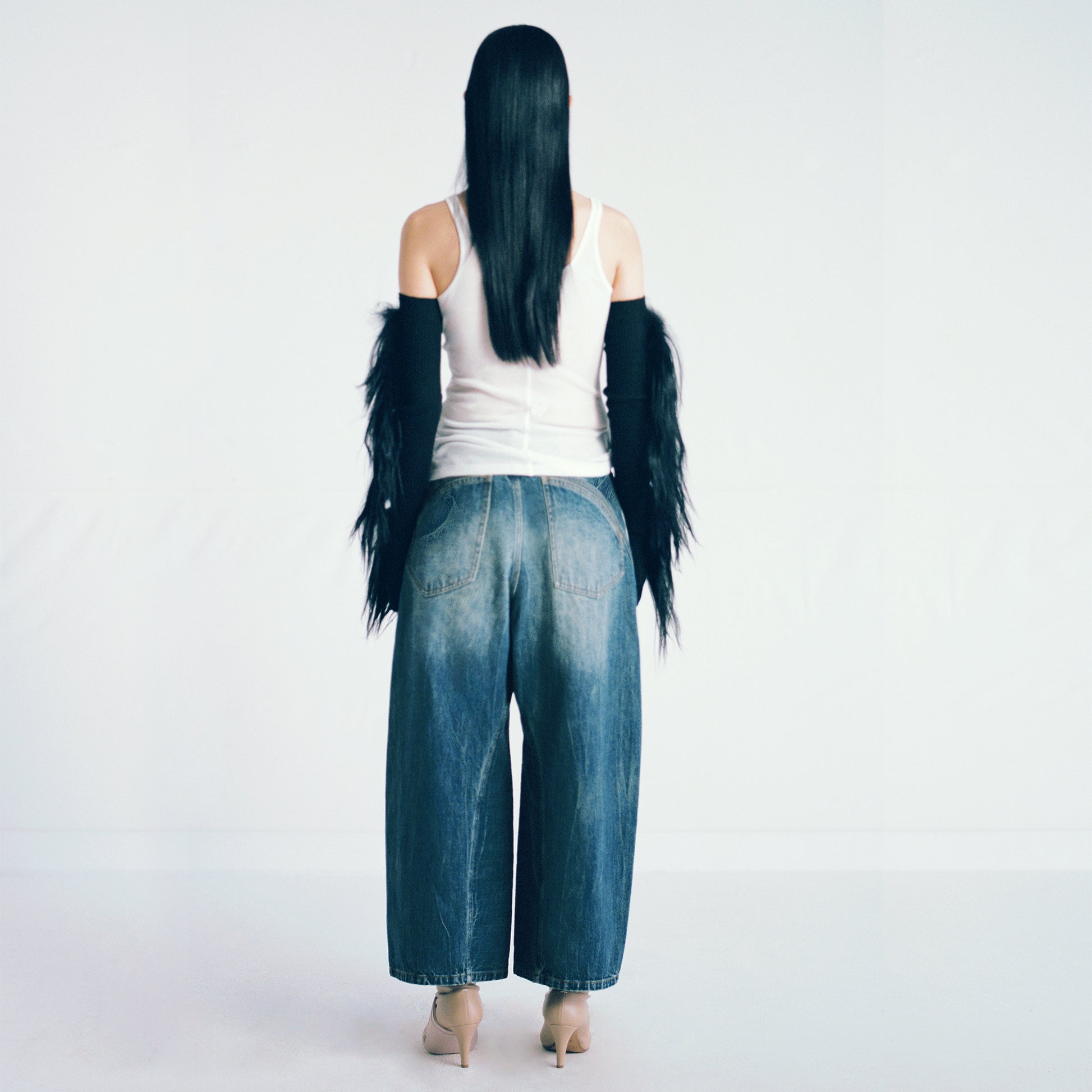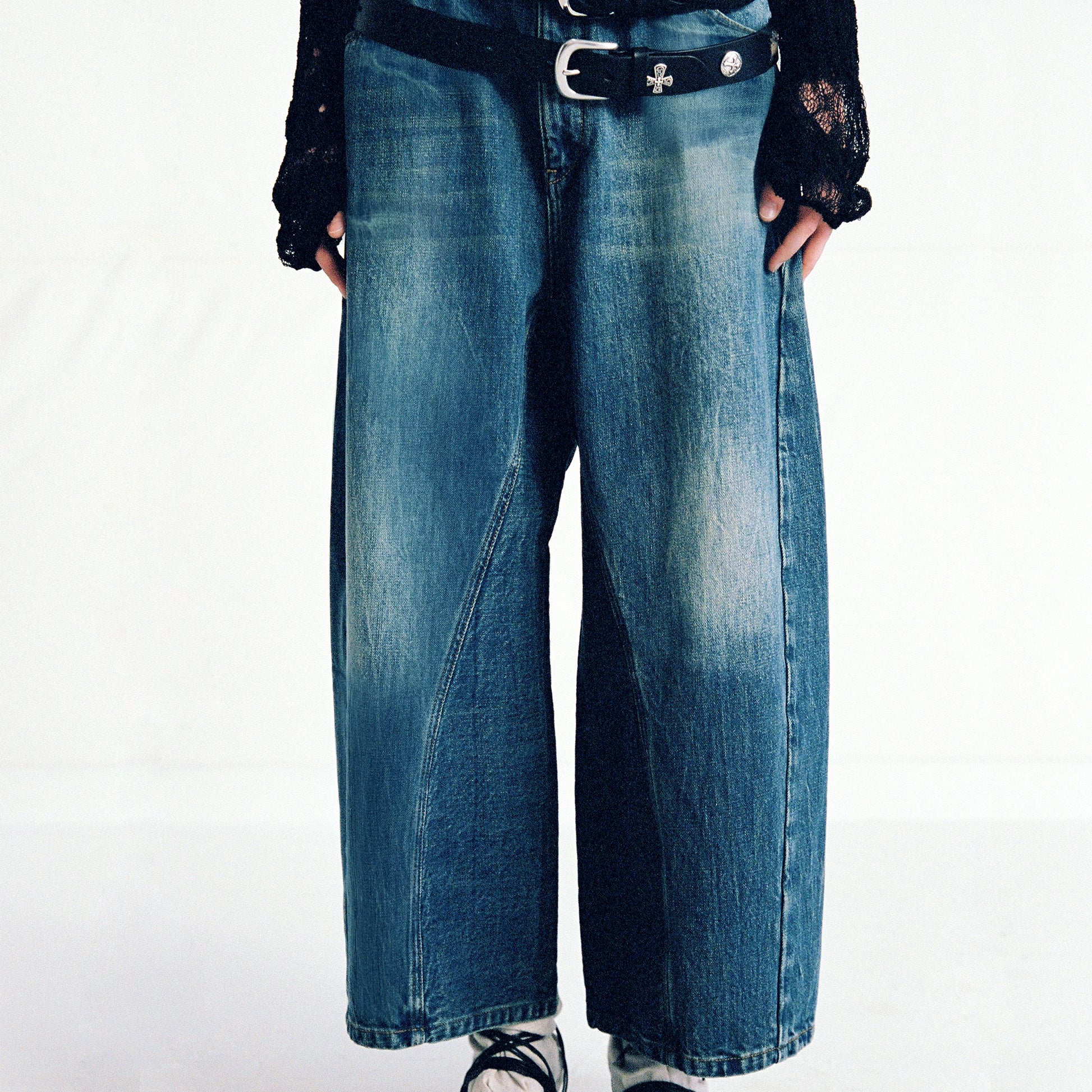 These pants feature a wide-leg cropped design with a continuation of the patched style. The lack of inner and outer seams, with the rear curve extending to the front, makes it an easy-to-match piece for everyday wear.