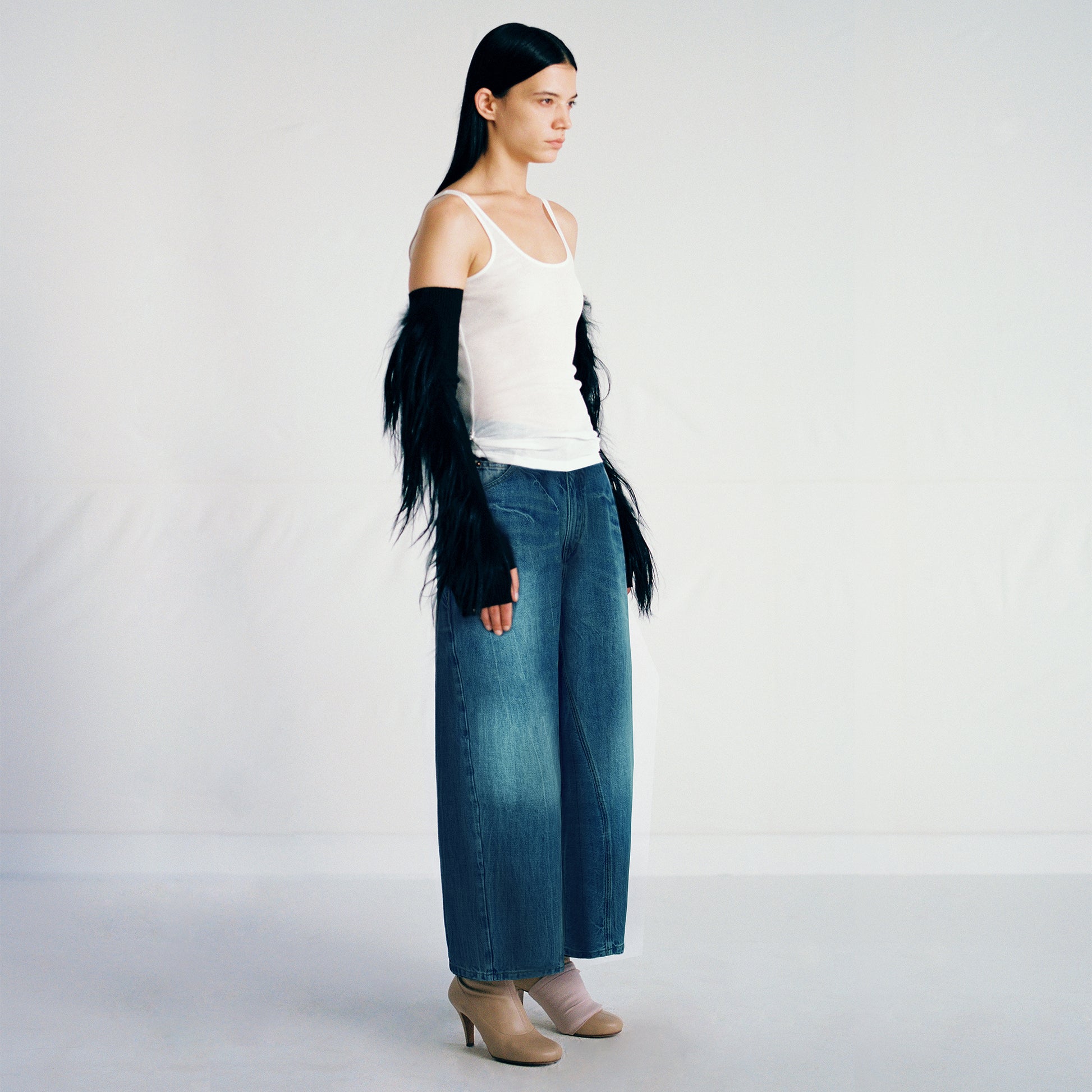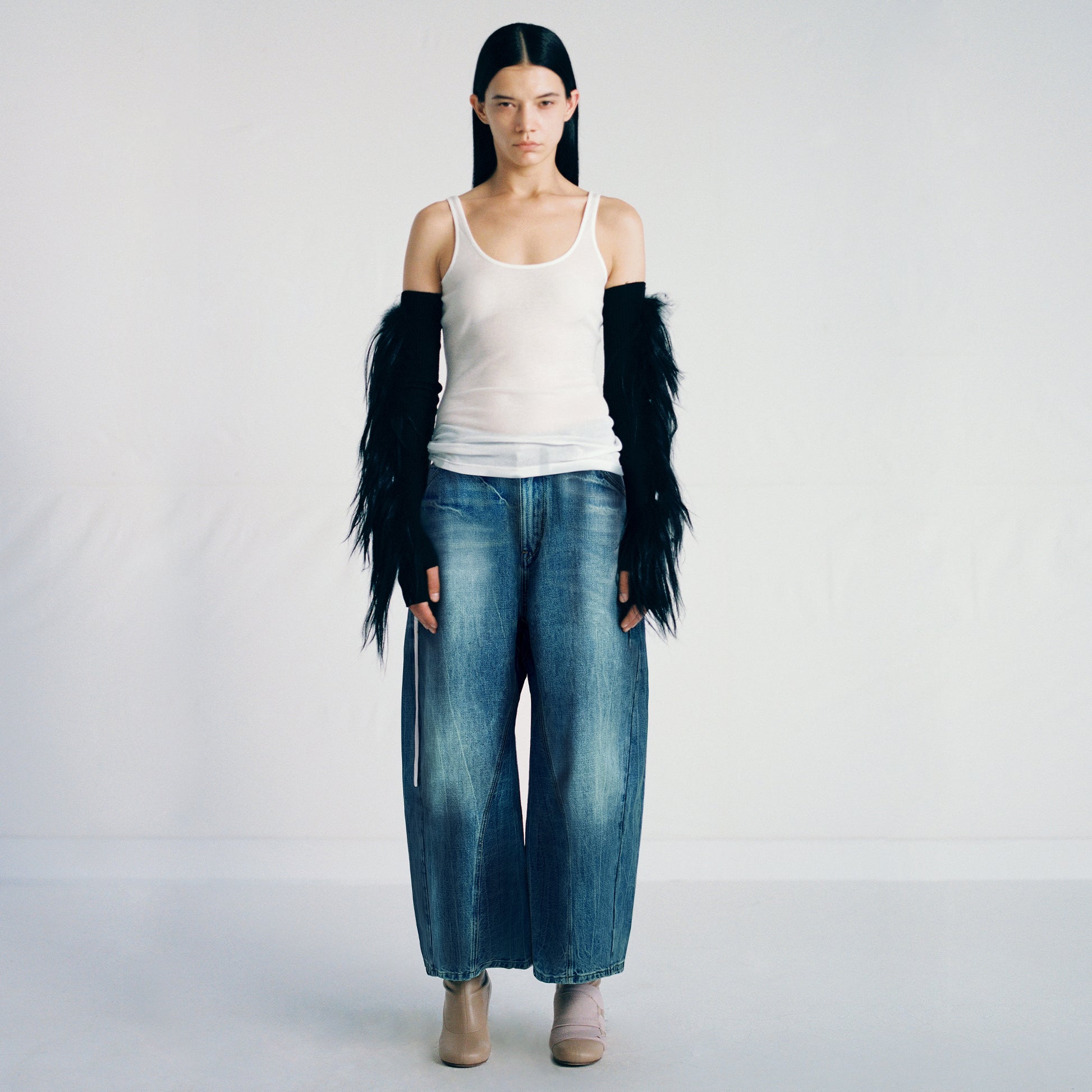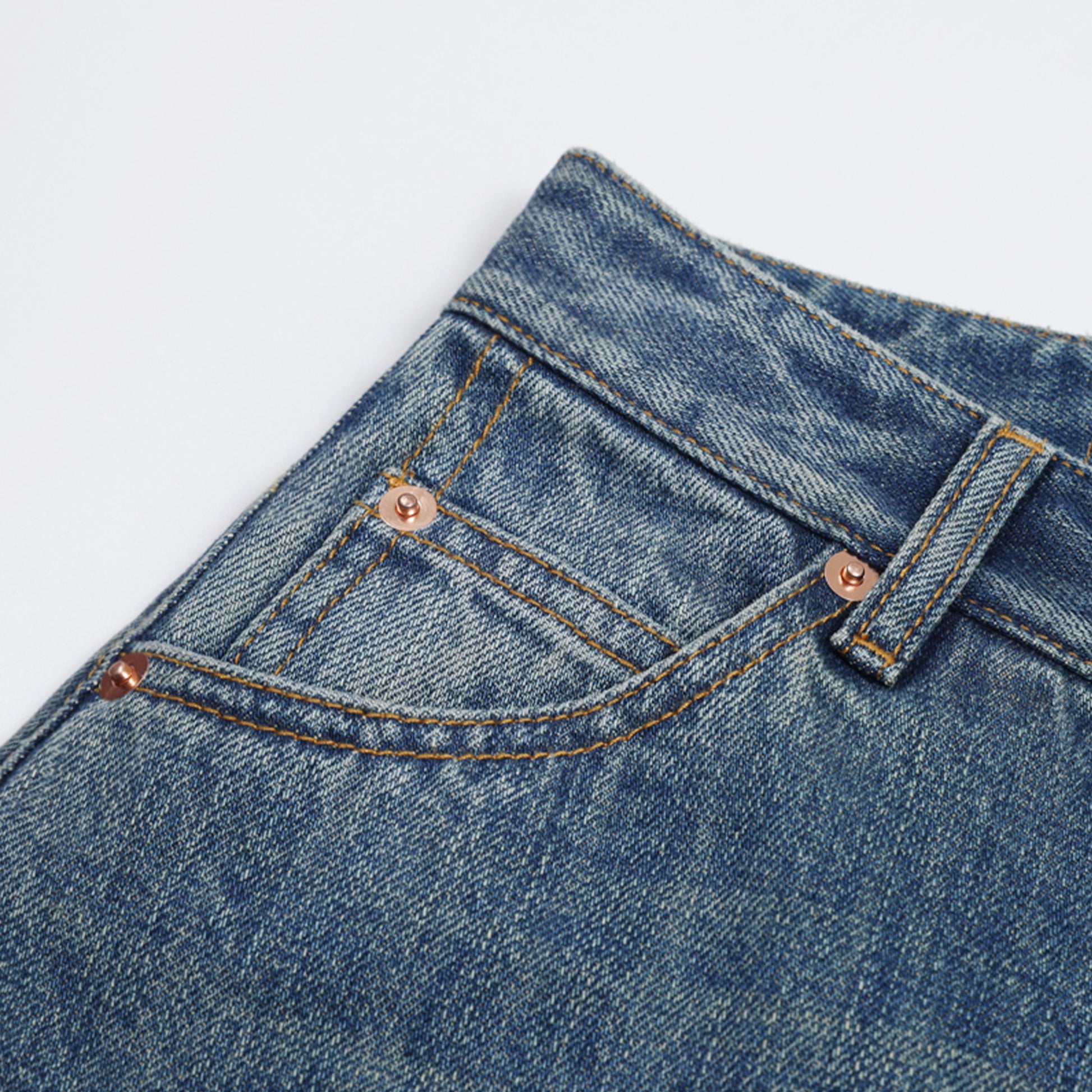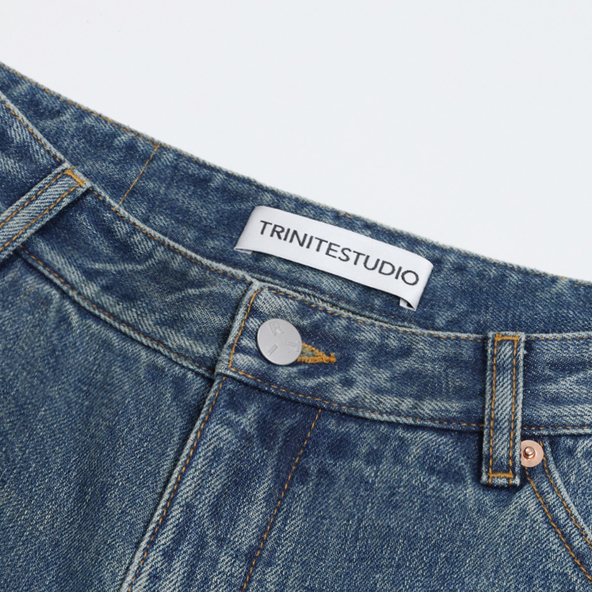 These pants feature a wide-leg cropped design with a continuation of the patched style. The lack of inner and outer seams, with the rear curve extending to the front, makes it an easy-to-match piece for everyday wear.