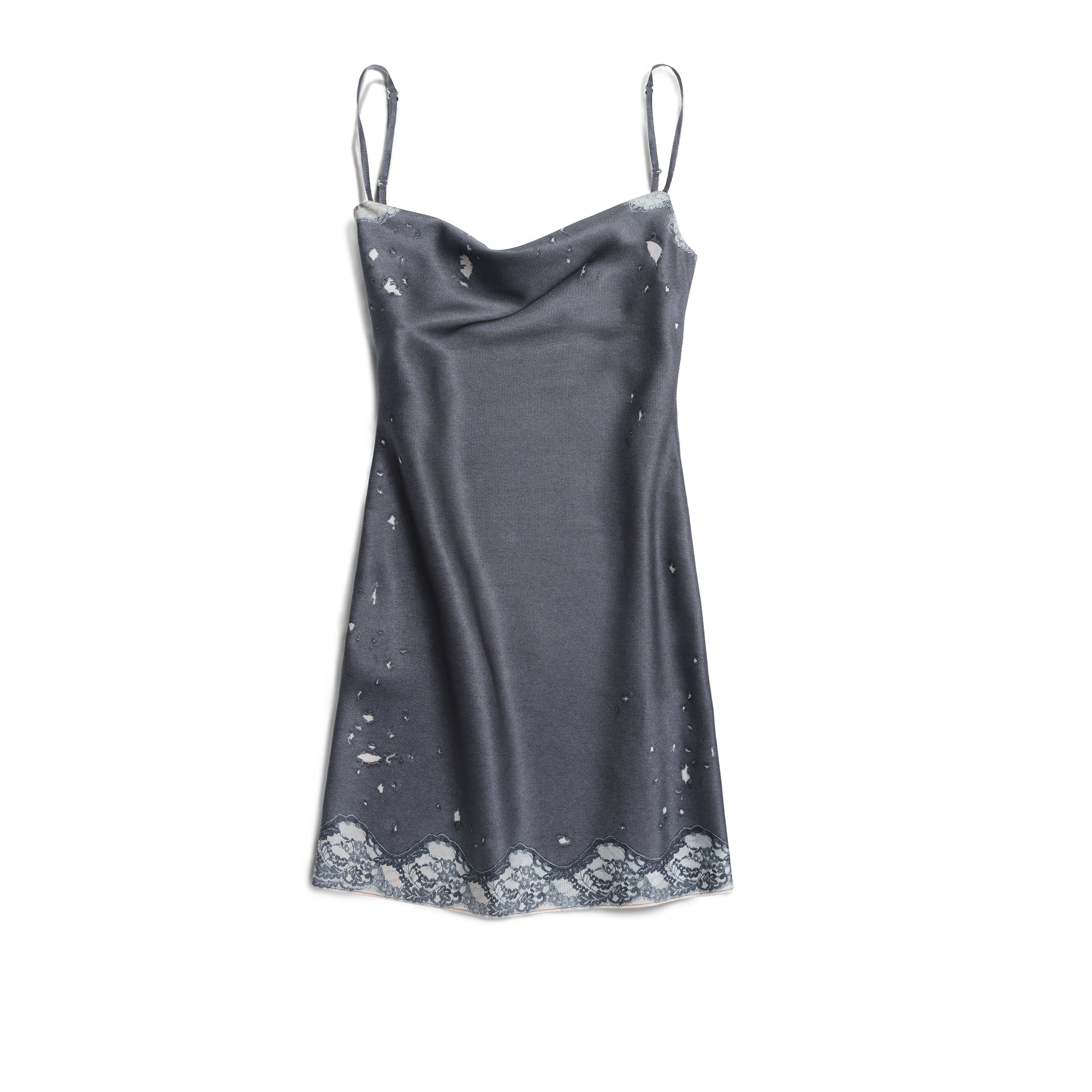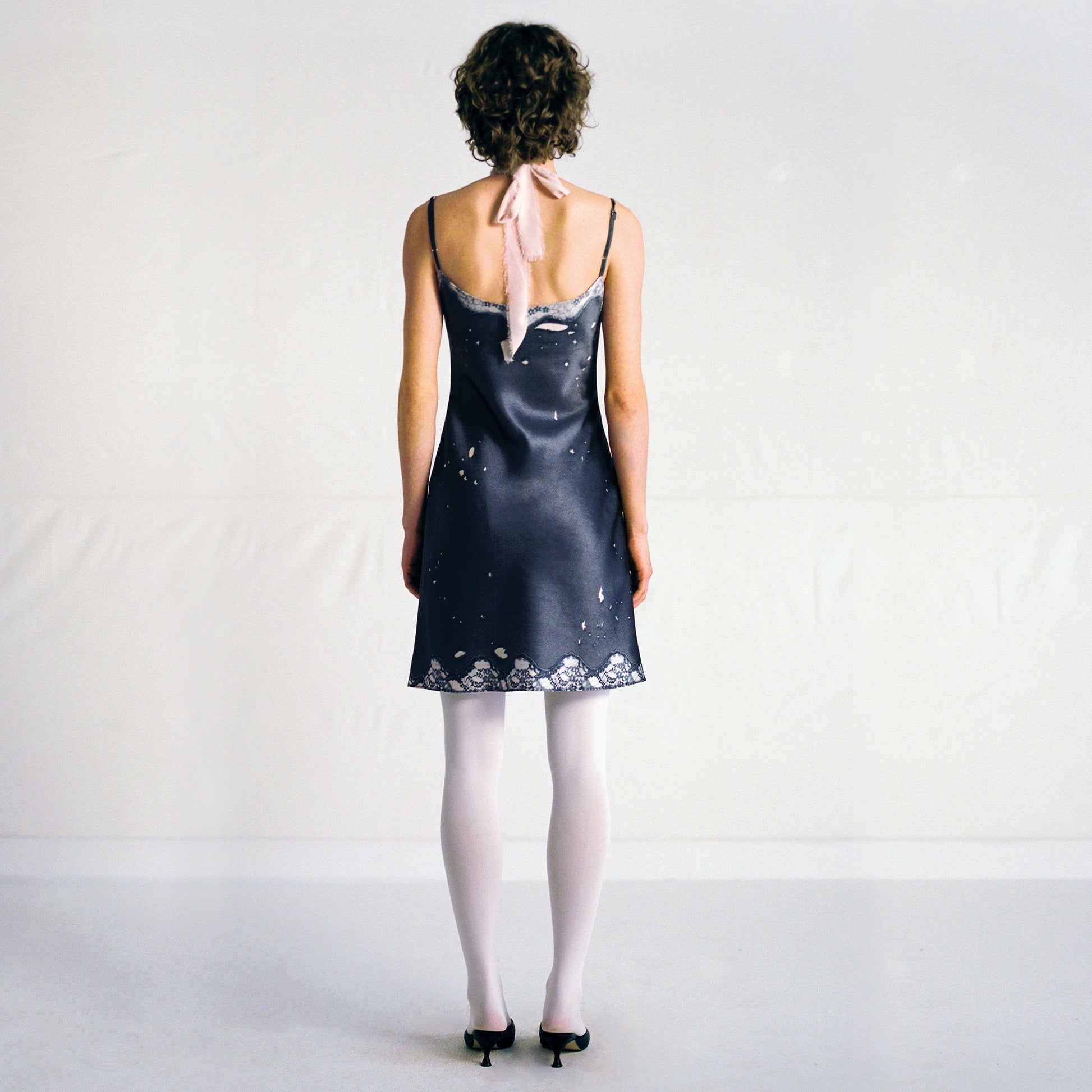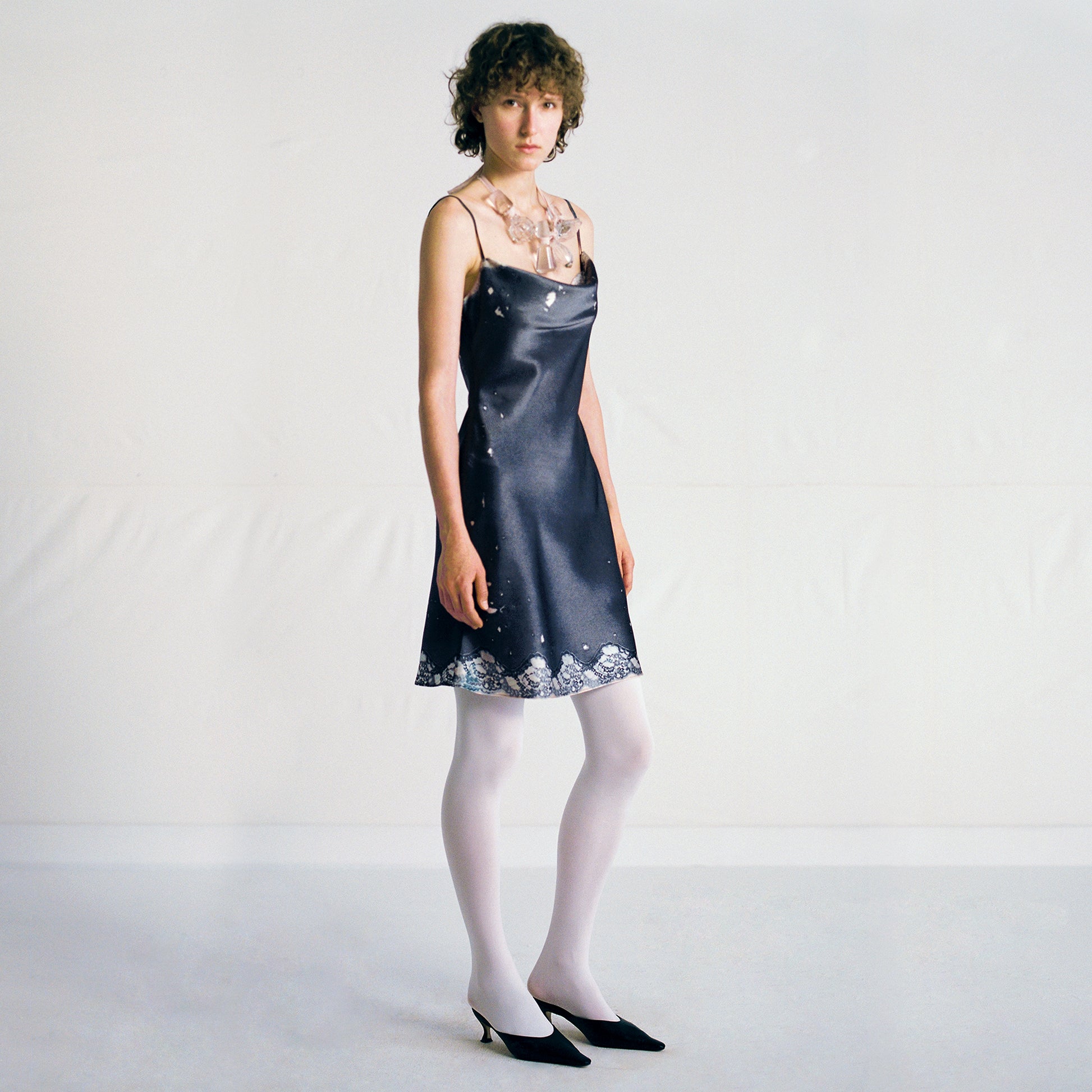 This printed pattern was independently photographed and produced by TRINITEstudio. The original ribbed knit fabric of the dress has been distressed and hole-punched to create a naturally worn look, softening the inherent femininity of the slip dress.