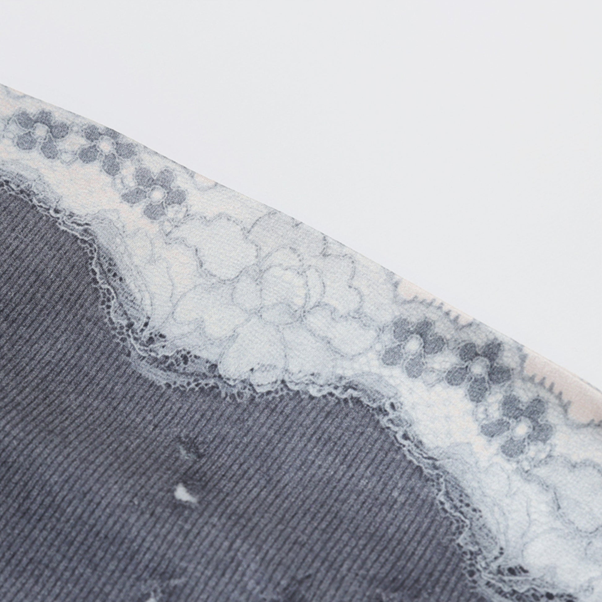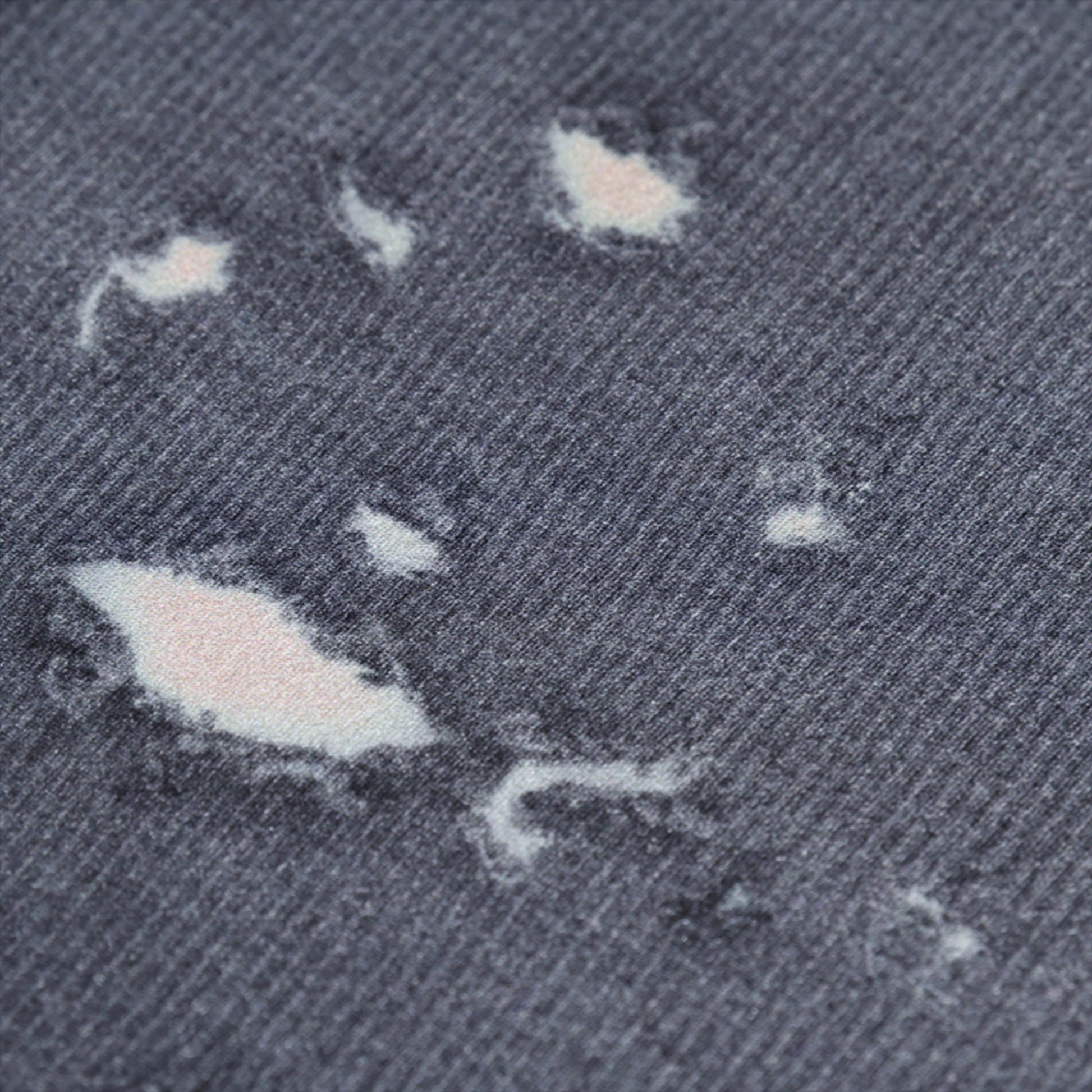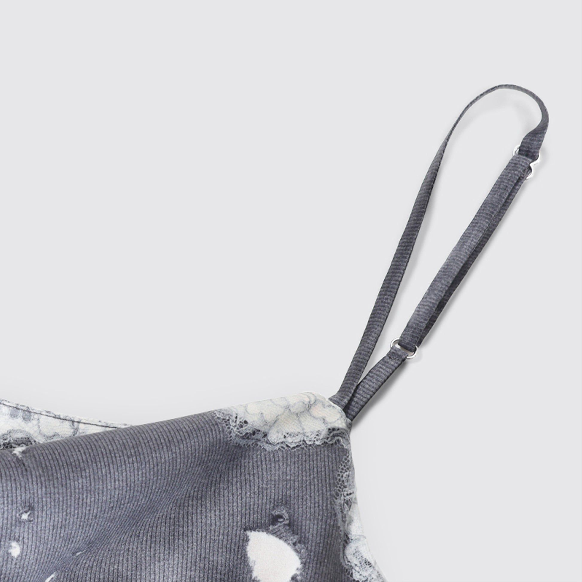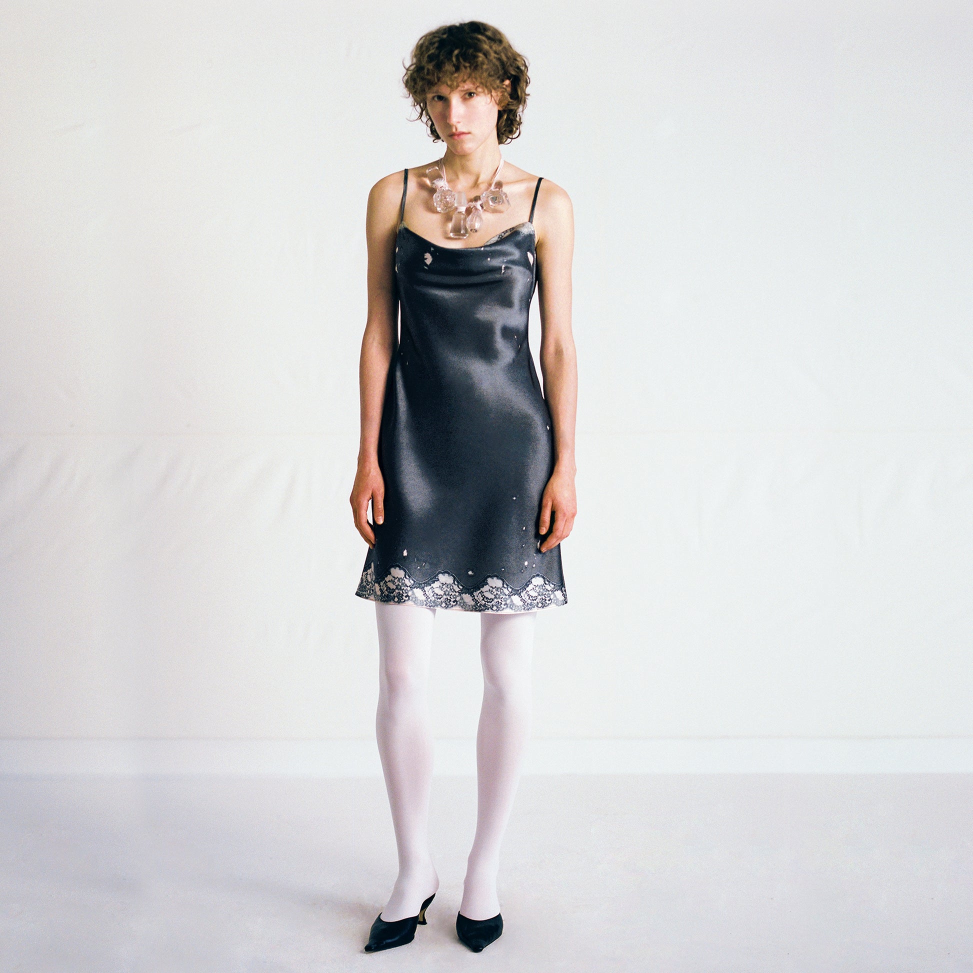 This printed pattern was independently photographed and produced by TRINITEstudio. The original ribbed knit fabric of the dress has been distressed and hole-punched to create a naturally worn look, softening the inherent femininity of the slip dress.