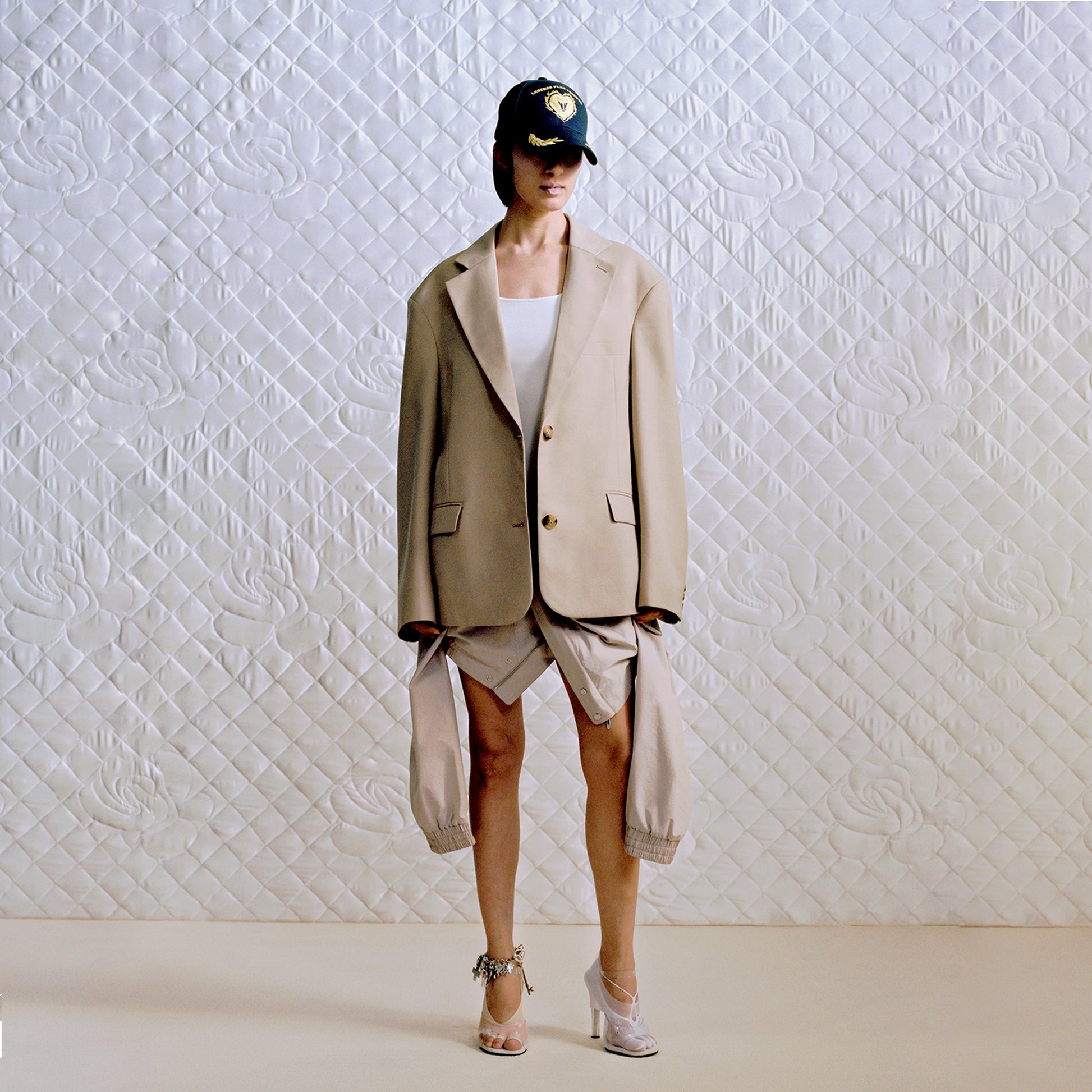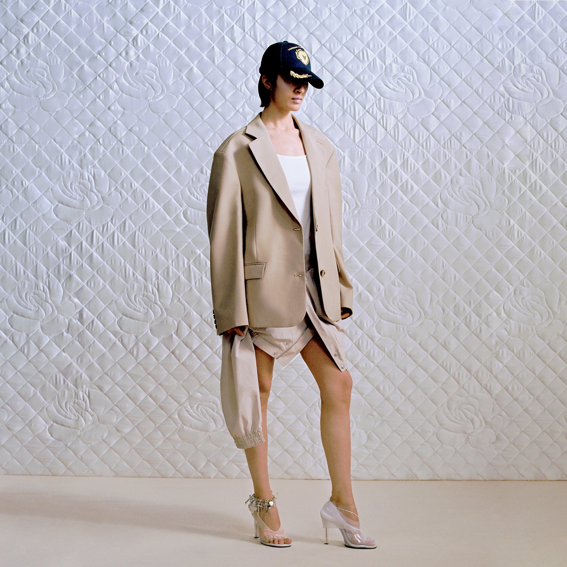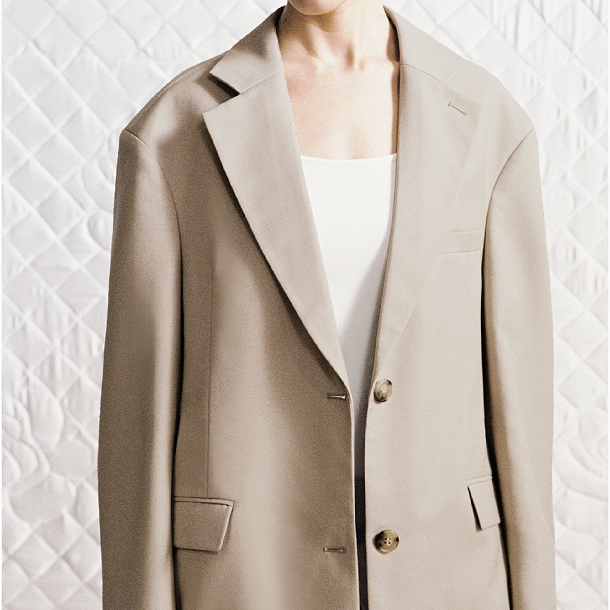 This suit redefines traditional tailoring, combining the sharp front silhouette of a structured blazer with the athletic back cut of a sport coat, masterfully balancing formality and streetwear edge. Breaking free from conventional suit constraints, the gender-neutral cut adapts effortlessly to various body types, making it versatile for multiple occasions.