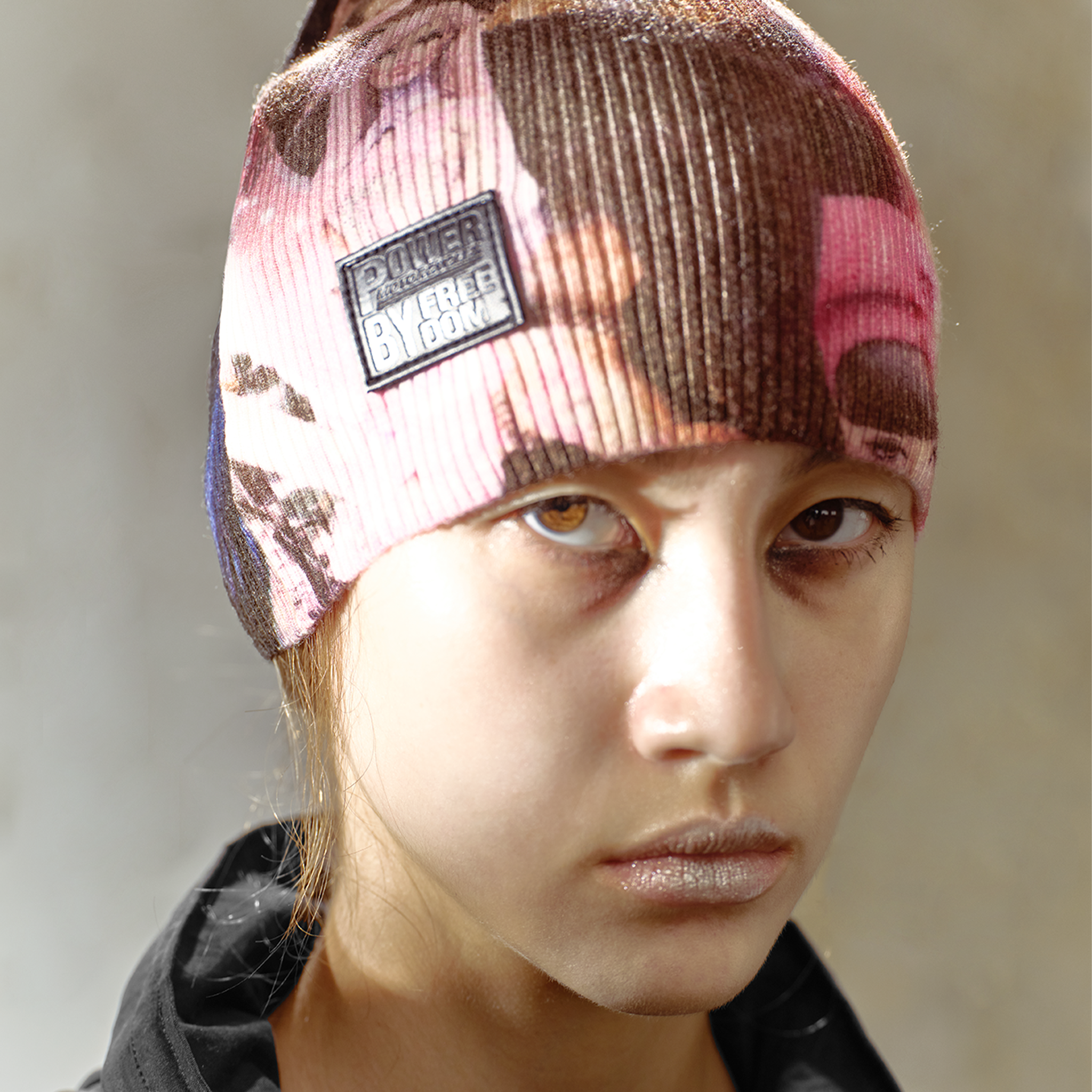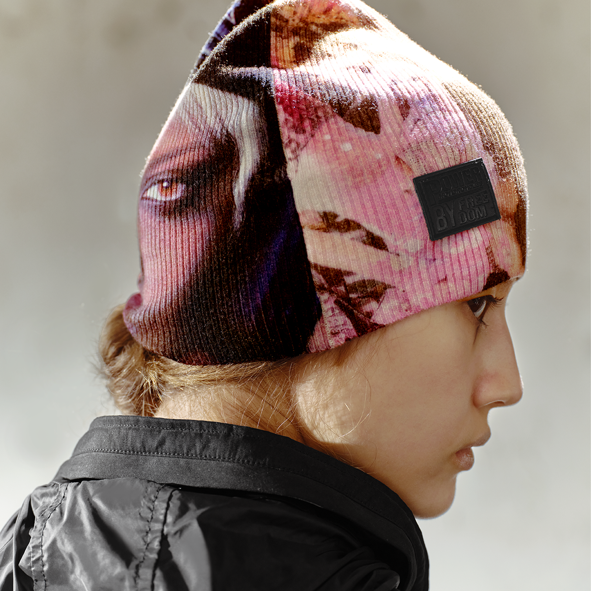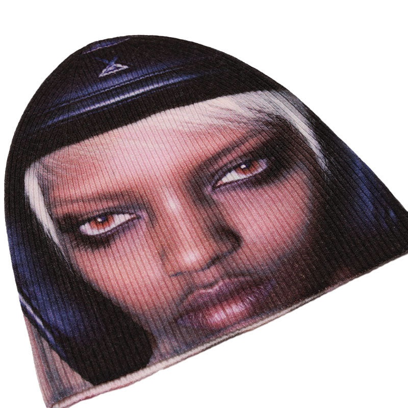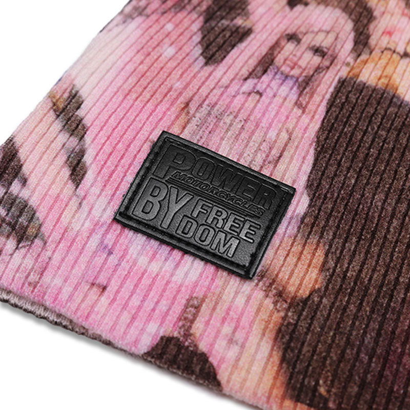 This pure wool knit beanie features distinct character prints on the front and back, creating a playful and layered aesthetic. The front is adorned with a custom slogan cowhide leather patch. Designed to be reversible, it offers versatile styling options while providing warmth and a fashionable look.