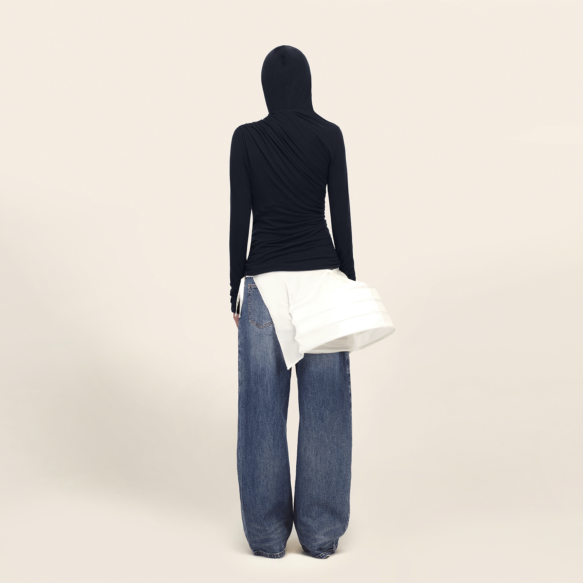 The design continues TRINITE’s signature Victorian-inspired elements, utilizing double-layer pleats for a structured drape, cleverly incorporating excess fabric into the design. The top features a series of sculptural pleats and asymmetric layering, creating a completely unique, twisting silhouette reminiscent of the cascading drapery in medieval sculptures, blending romance with strong structure.
