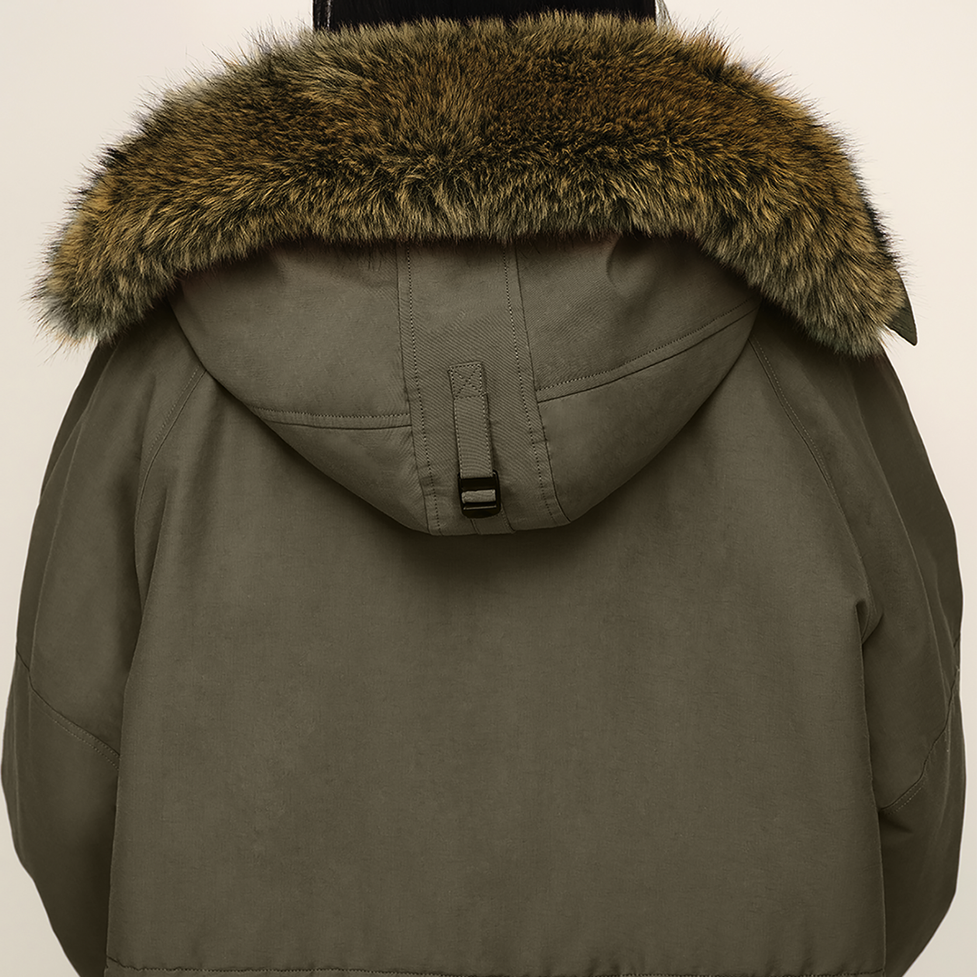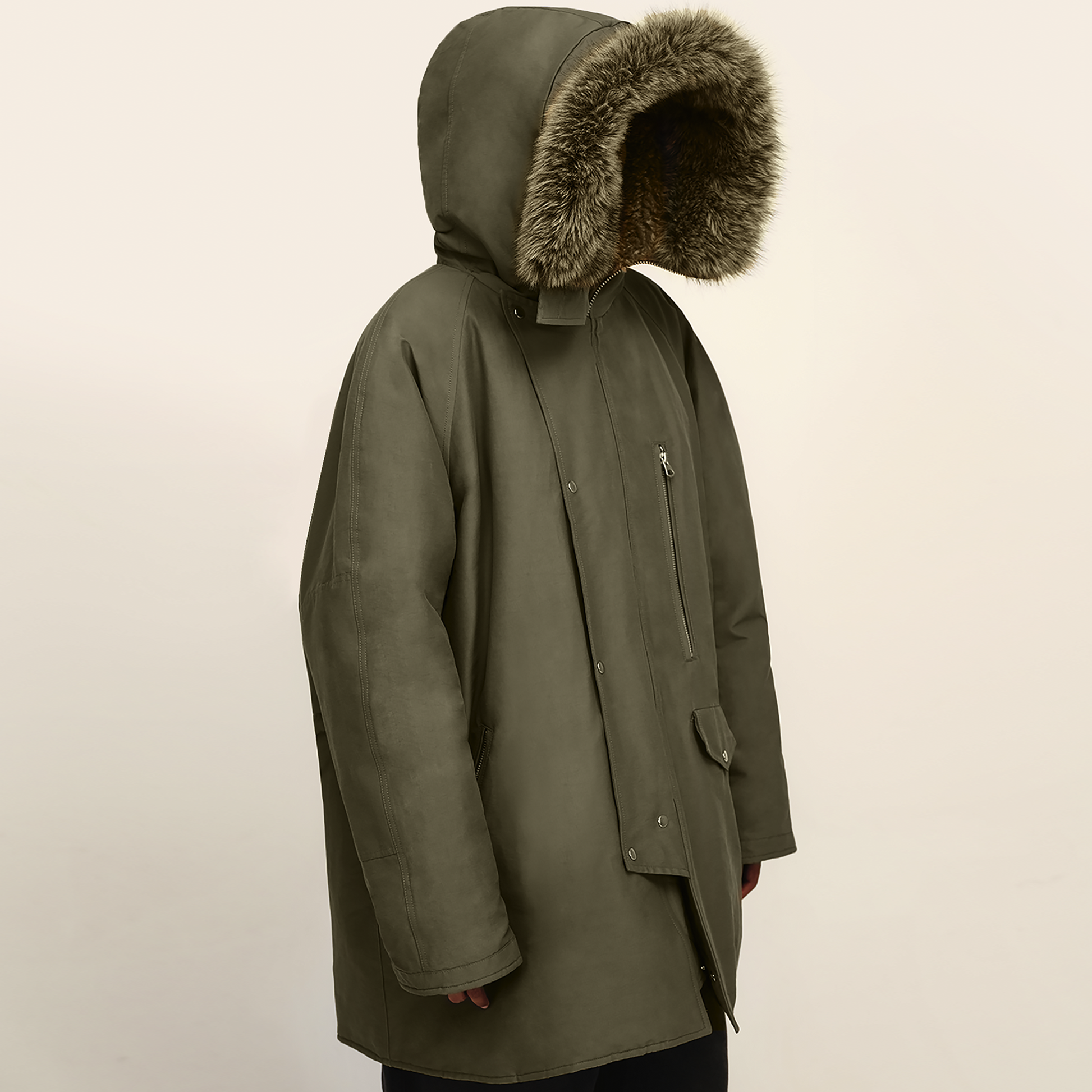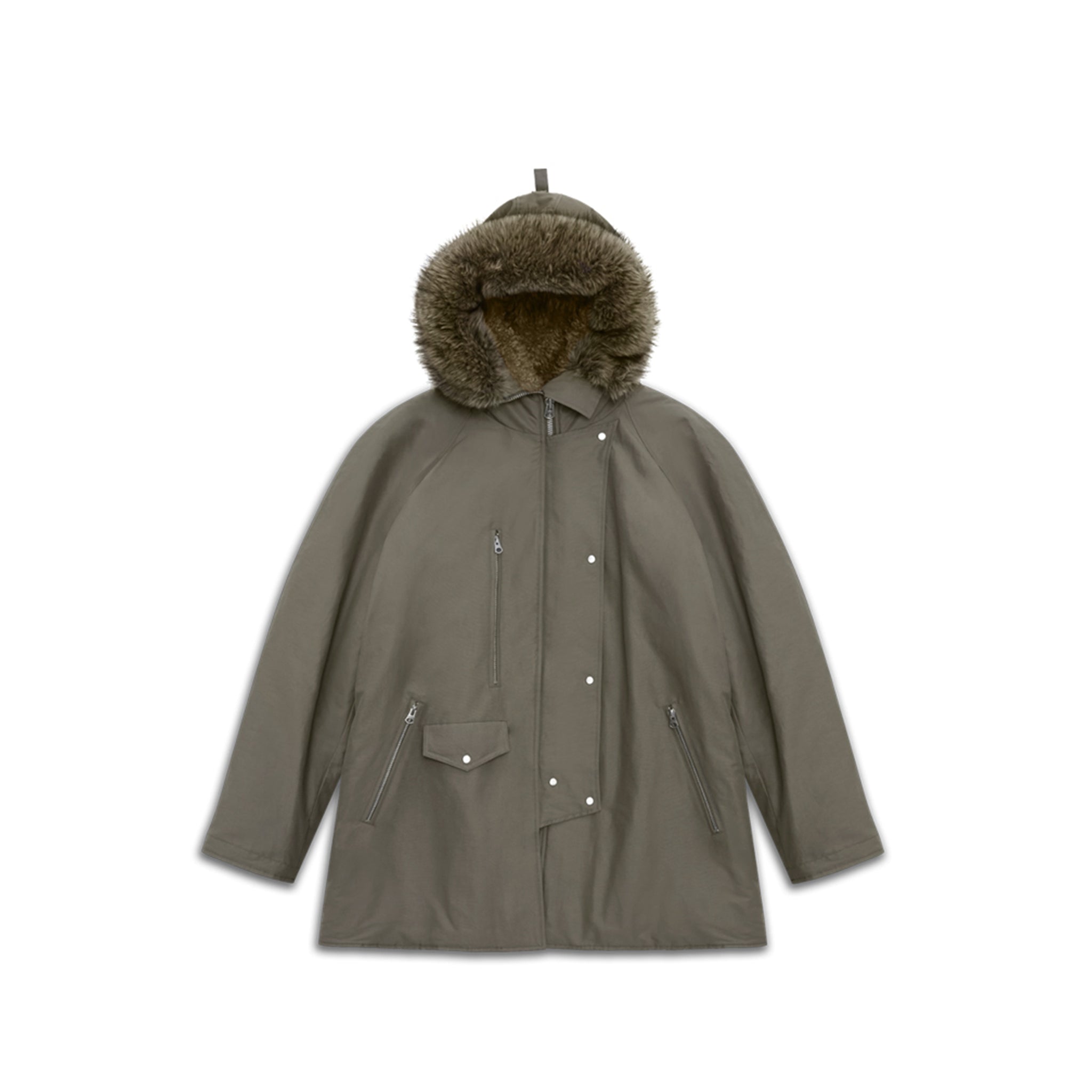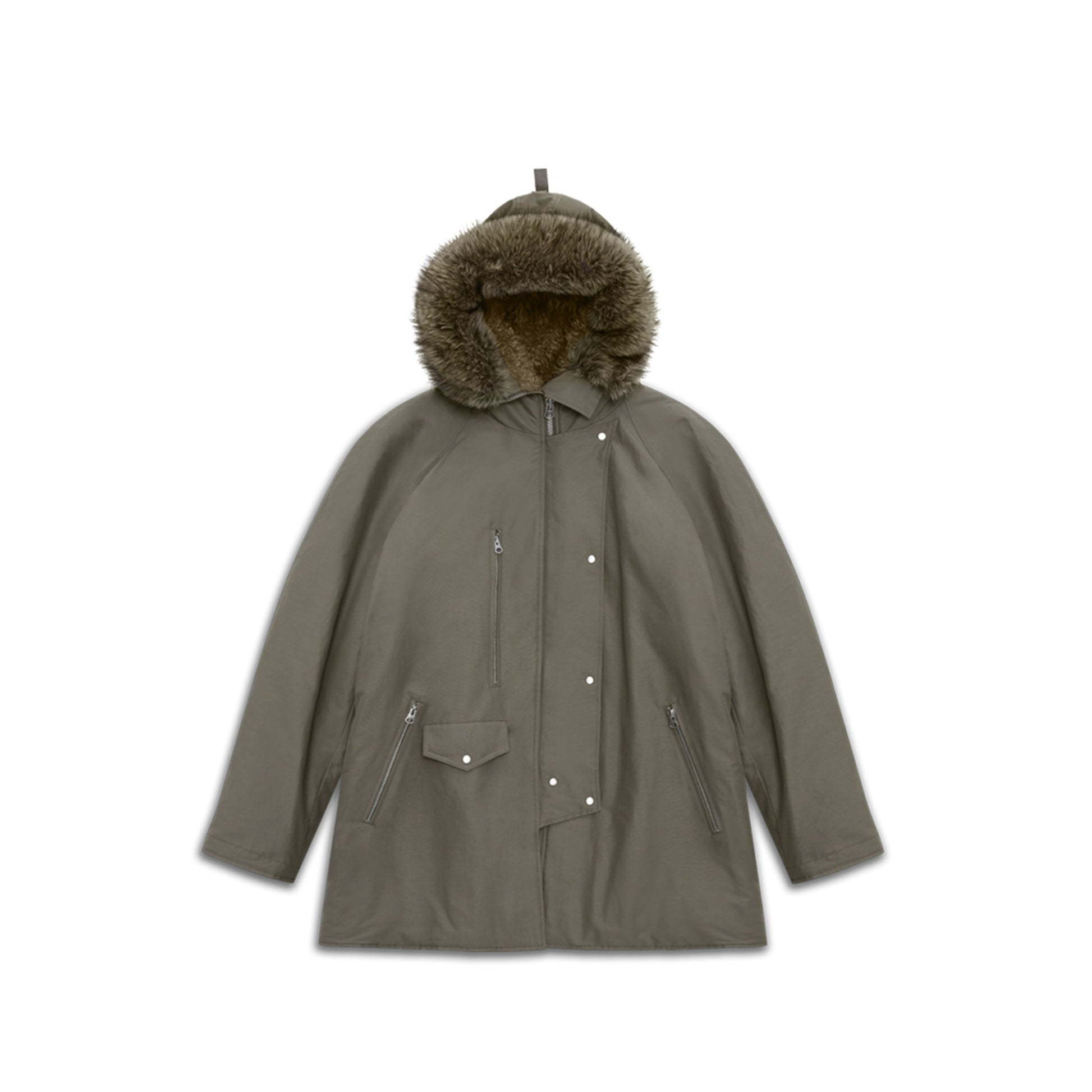 Inspired by the classic 1960s N-3B military parka, TRINITE redefines the style with a modern, streetwear-infused approach, using a glossy imported olive fabric. The coat is meticulously designed, with a faux-fur collar constructed from two types of eco-friendly fur. The hood features a brown lambskin-style faux fur lining, complemented by a layered, long-haired eco-fur trim along the outer edge, offering both warmth and a sculpted facial frame.