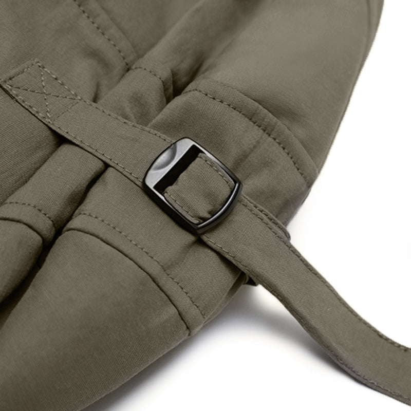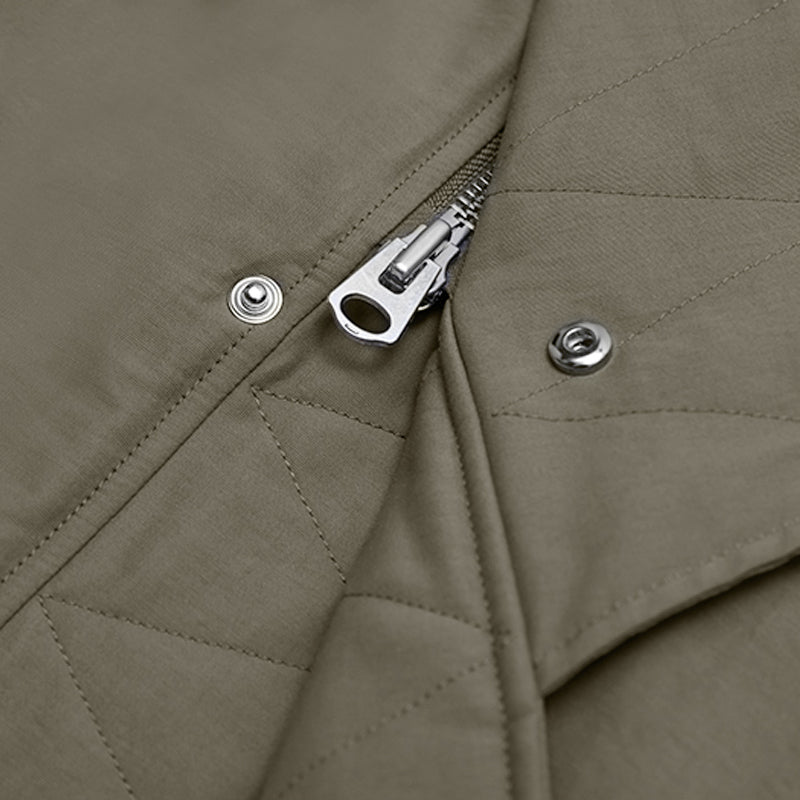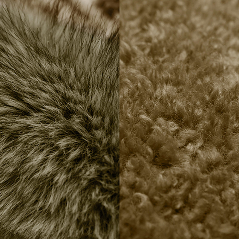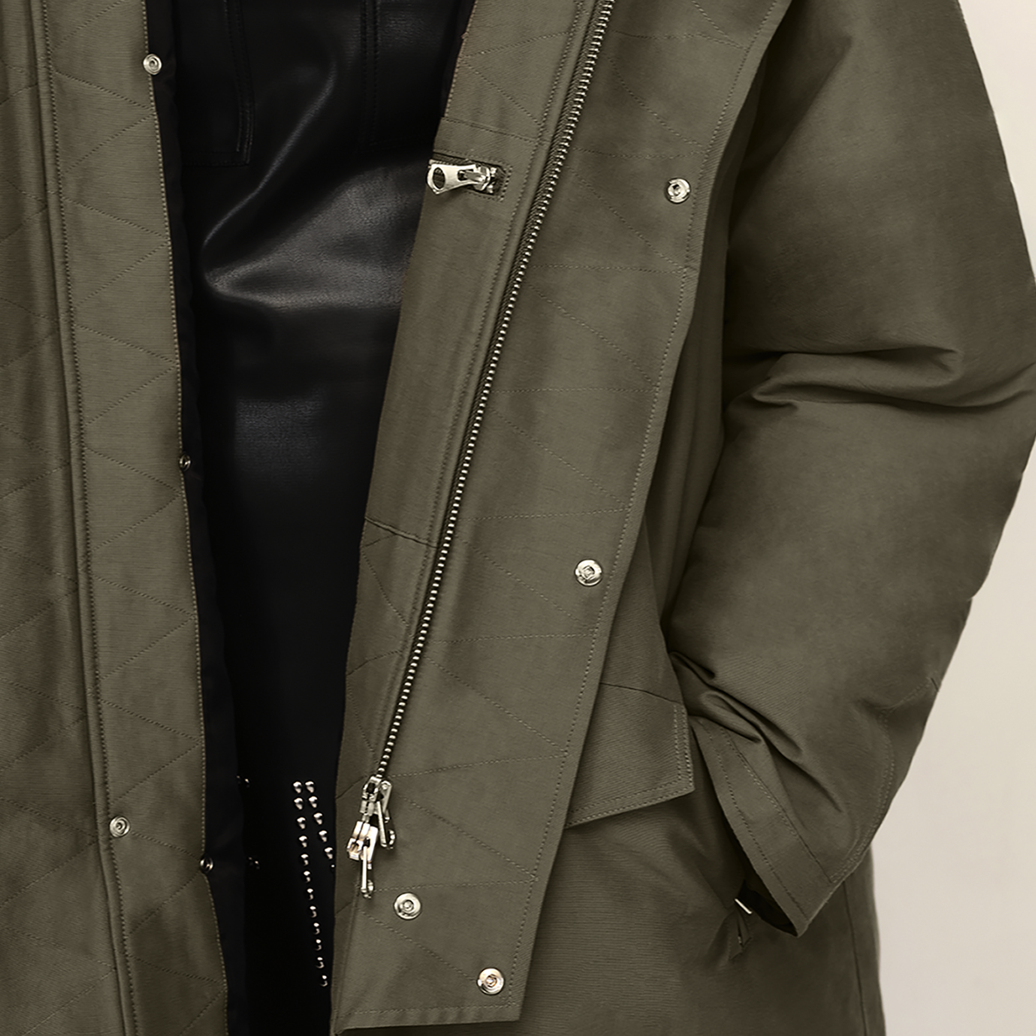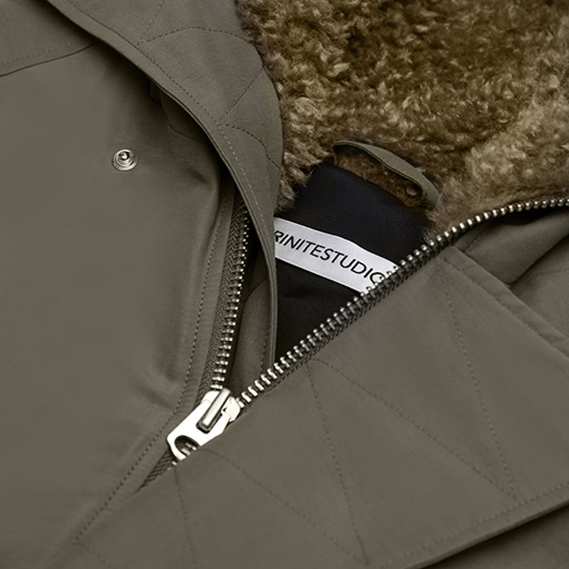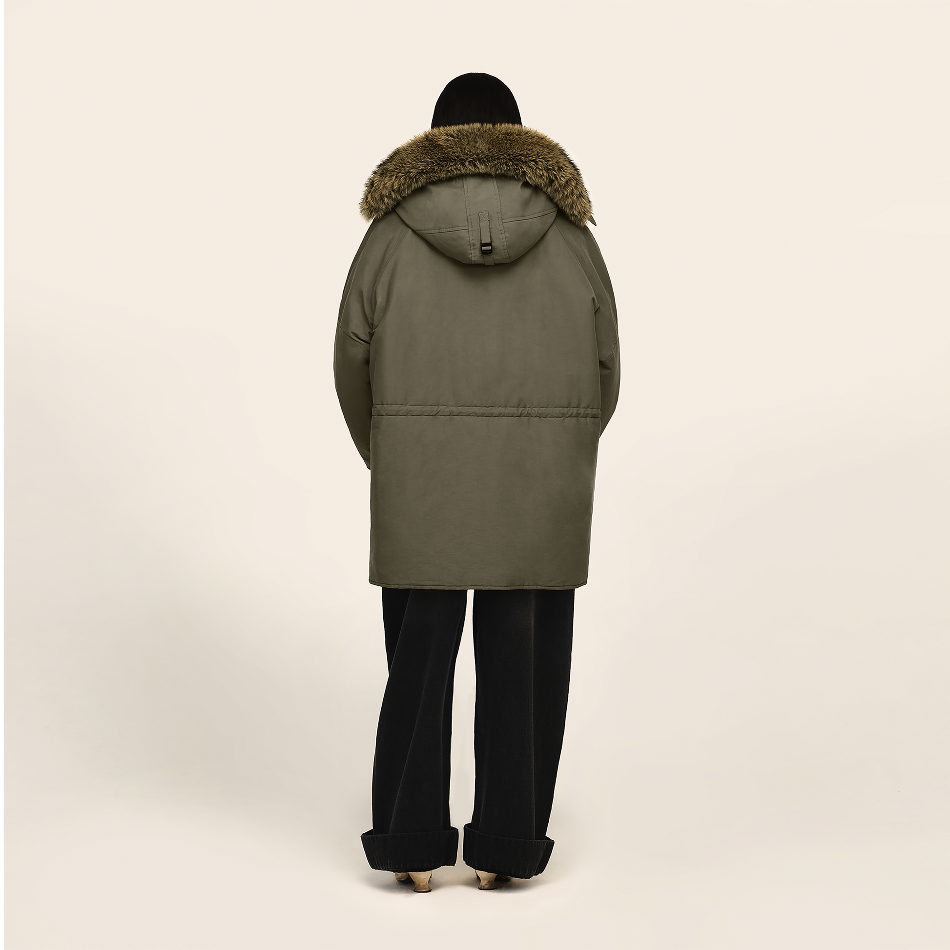 Inspired by the classic 1960s N-3B military parka, TRINITE redefines the style with a modern, streetwear-infused approach, using a glossy imported olive fabric. The coat is meticulously designed, with a faux-fur collar constructed from two types of eco-friendly fur. The hood features a brown lambskin-style faux fur lining, complemented by a layered, long-haired eco-fur trim along the outer edge, offering both warmth and a sculpted facial frame.
