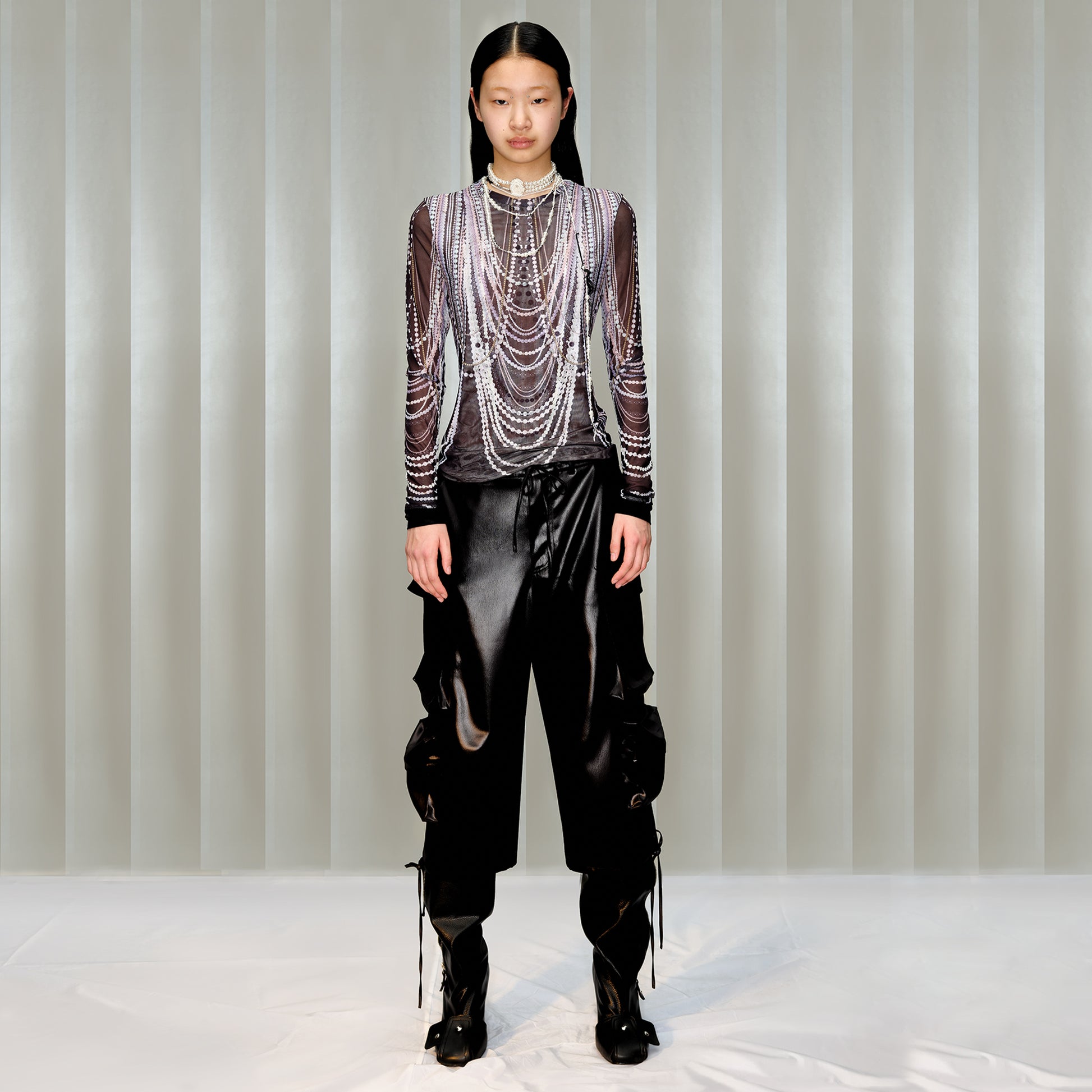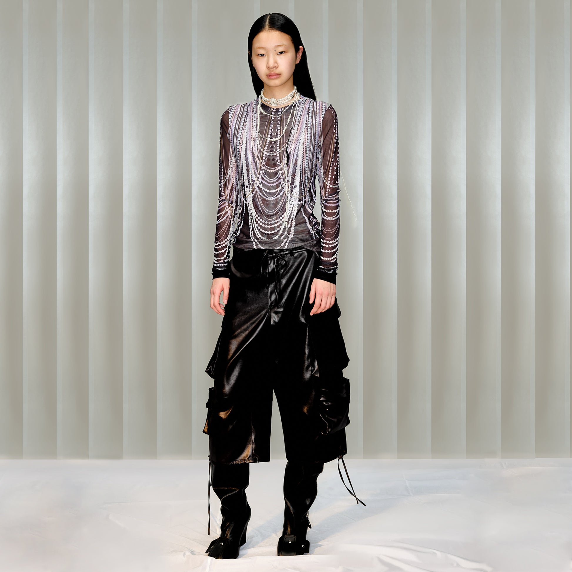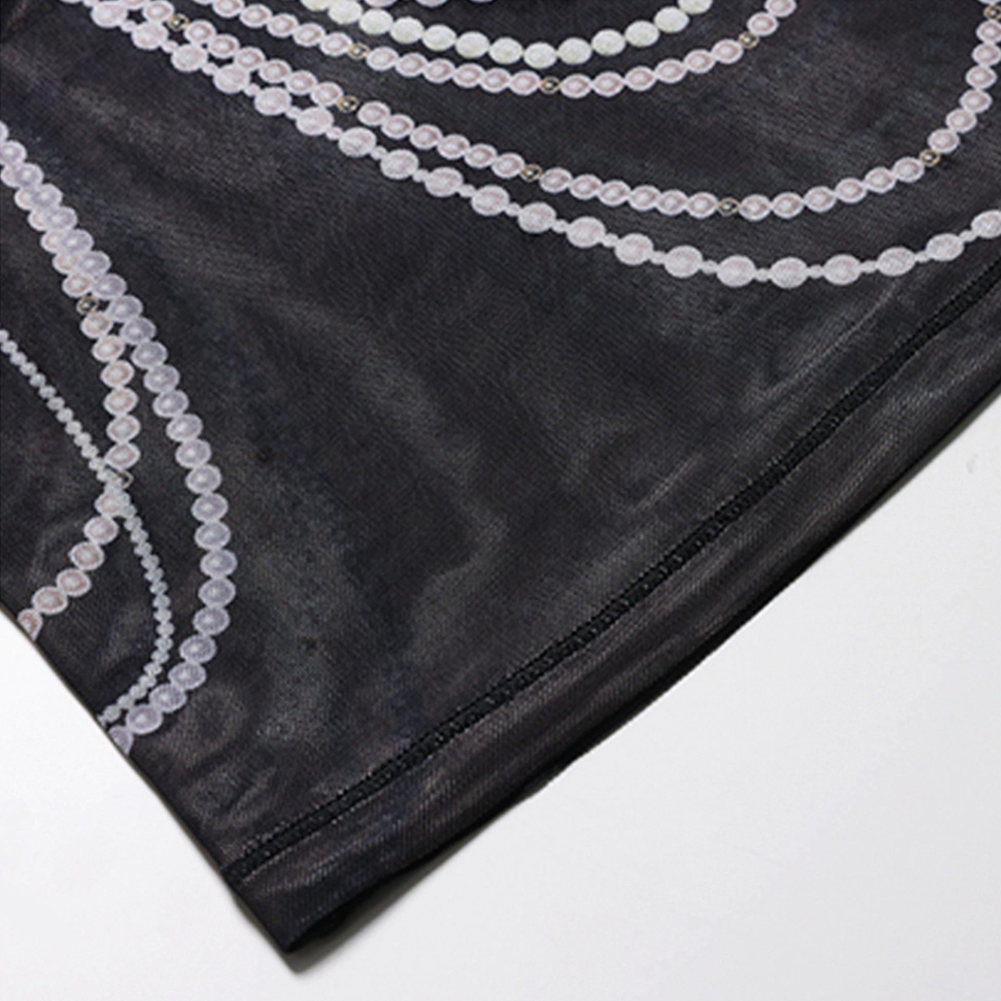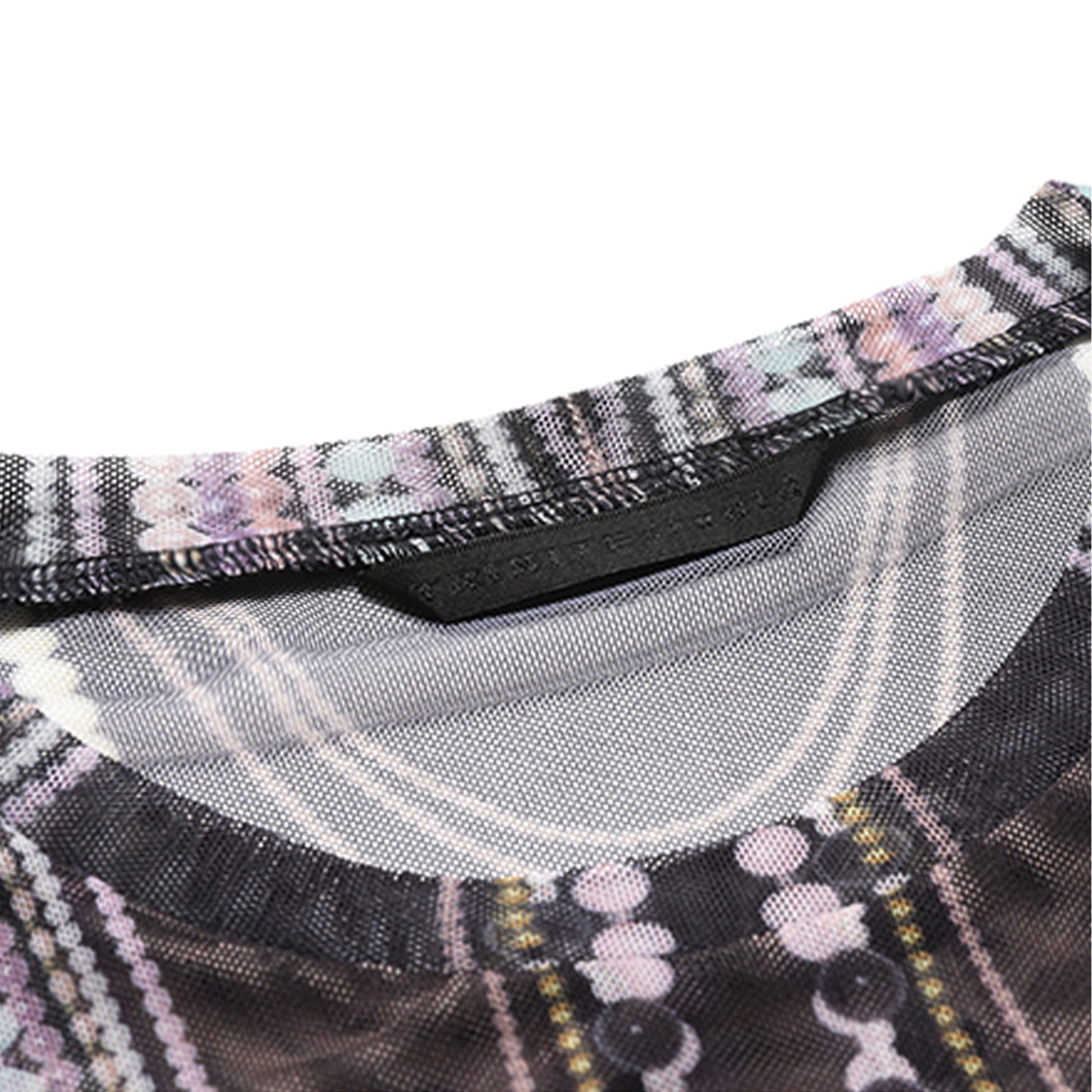 Pearl Overlay Print Mesh Long Sleeve T-Shirt