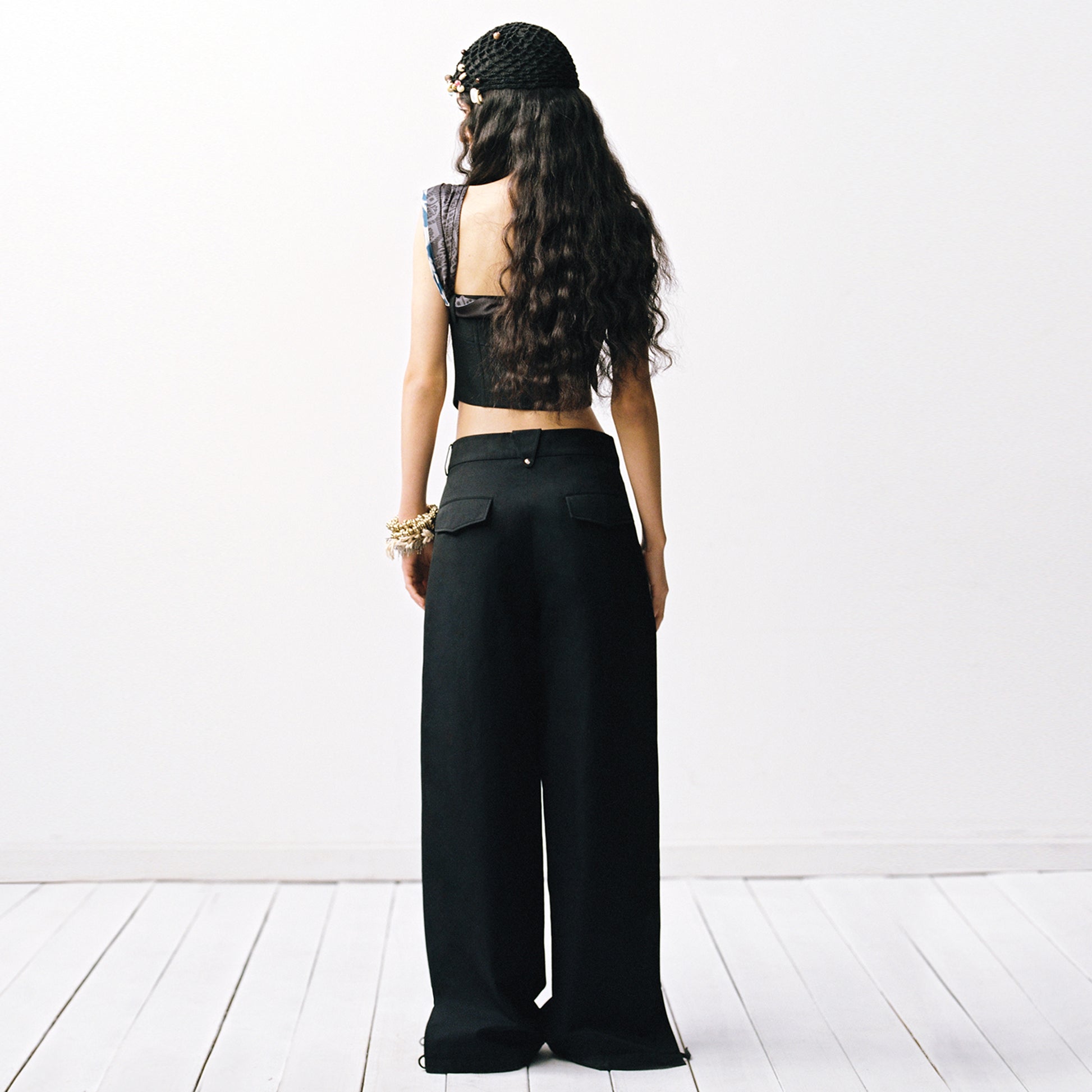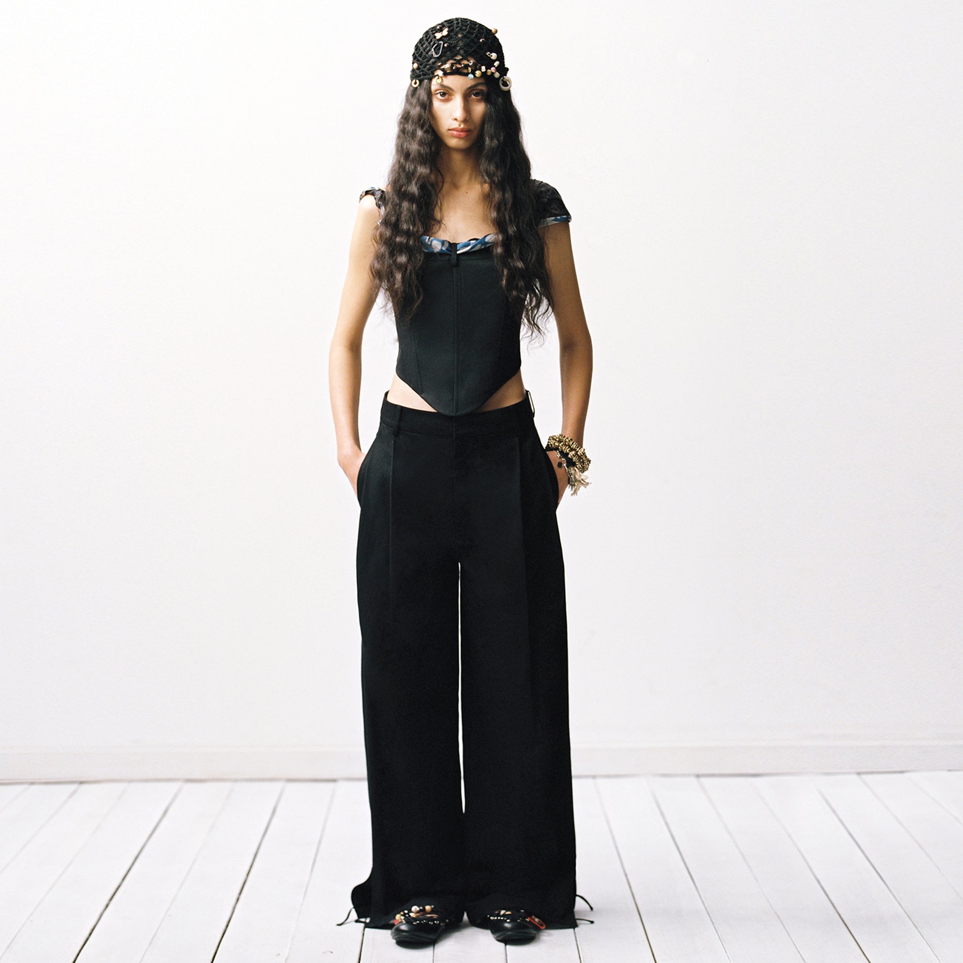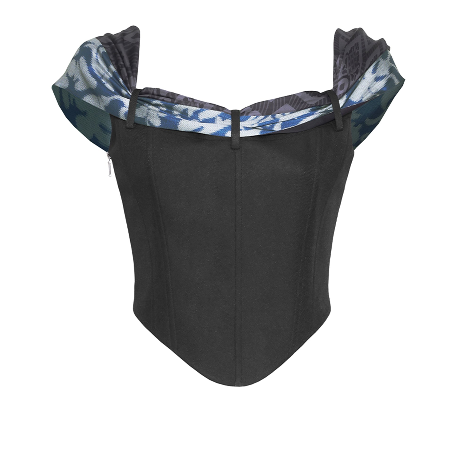 The corset continues the Victorian style of TRINTIE, emphasizing a clean and smooth body silhouette with straight lines to highlight female power. It is adorned with a soft, draped printed scarf that is knotted and fixed to enhance visual layers, drawing attention to the shoulder and neck area.