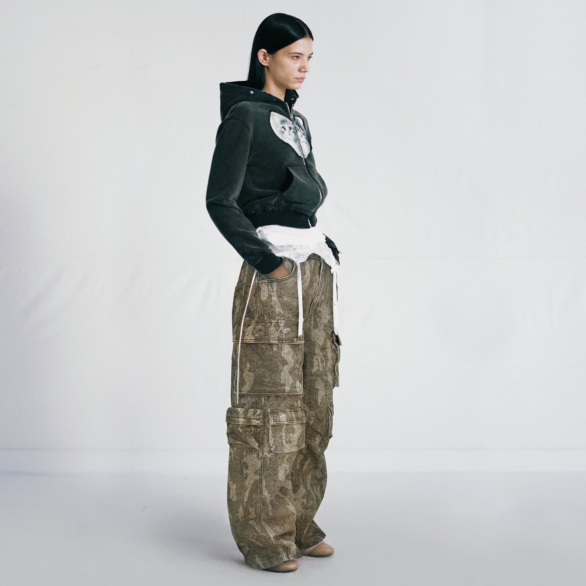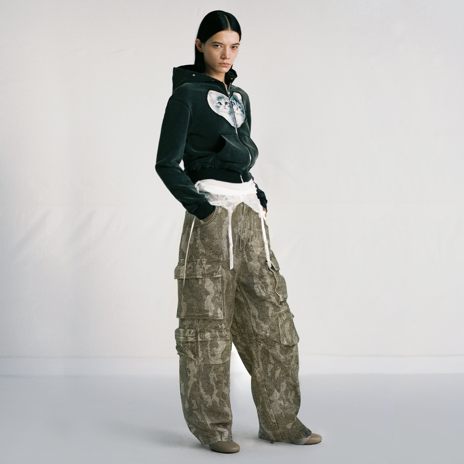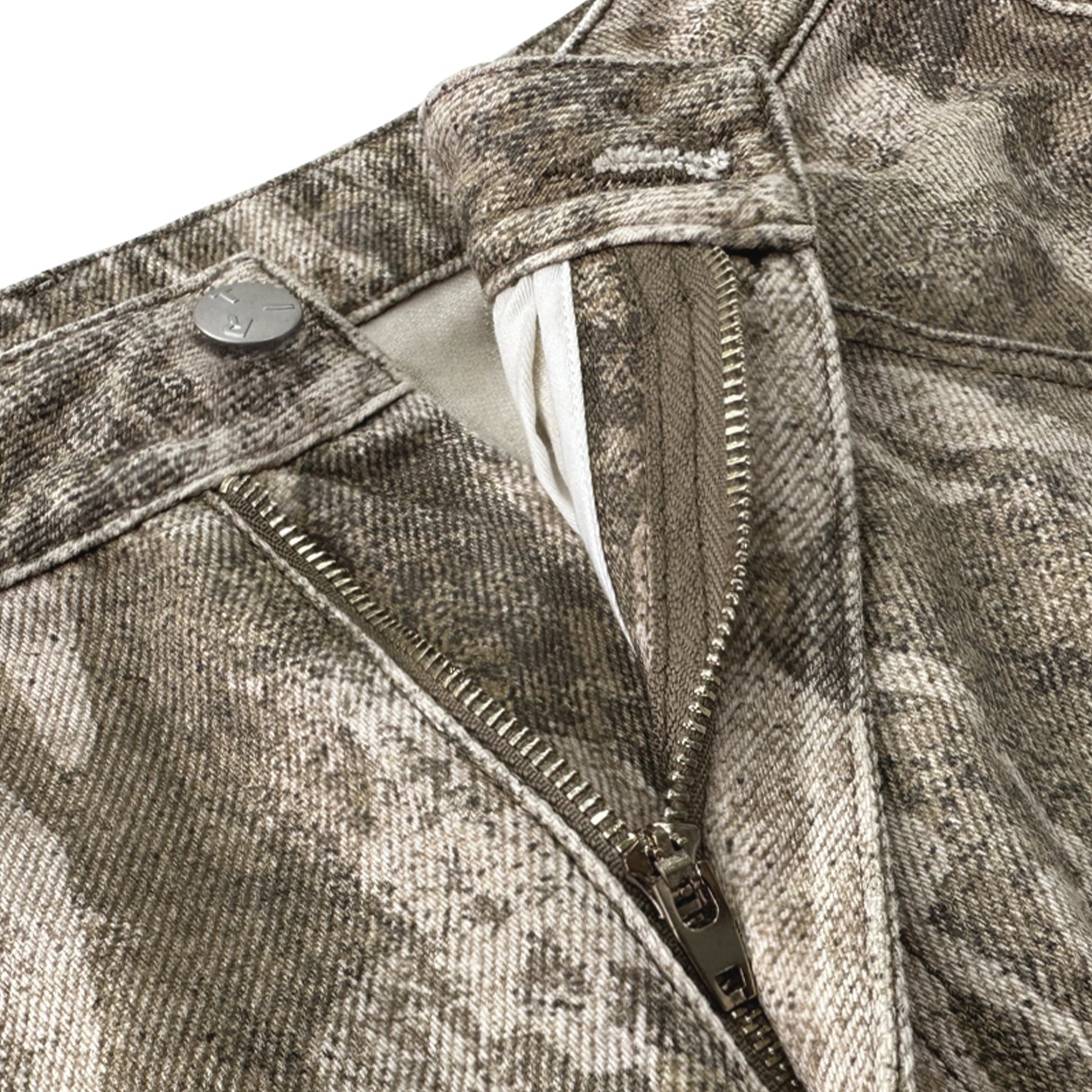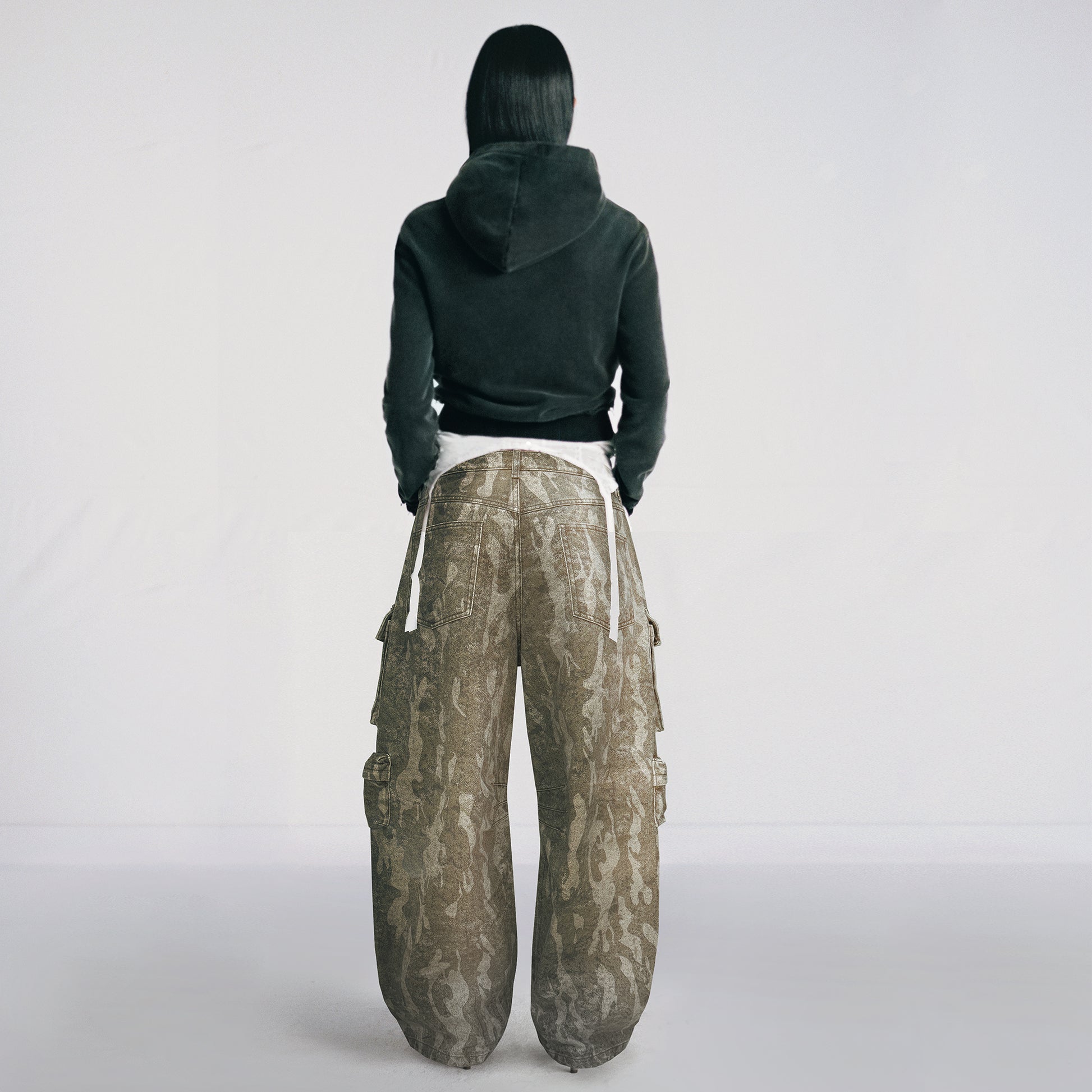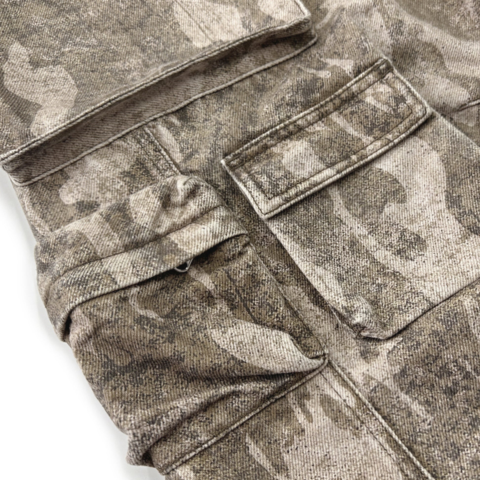 This item continues TRINITE's classic cargo pants design, combining functionality and fashion. Made from 100% cotton white denim base fabric, digitally printed and washed to achieve a naturally distressed and faded look, creating a vintage modern feel.