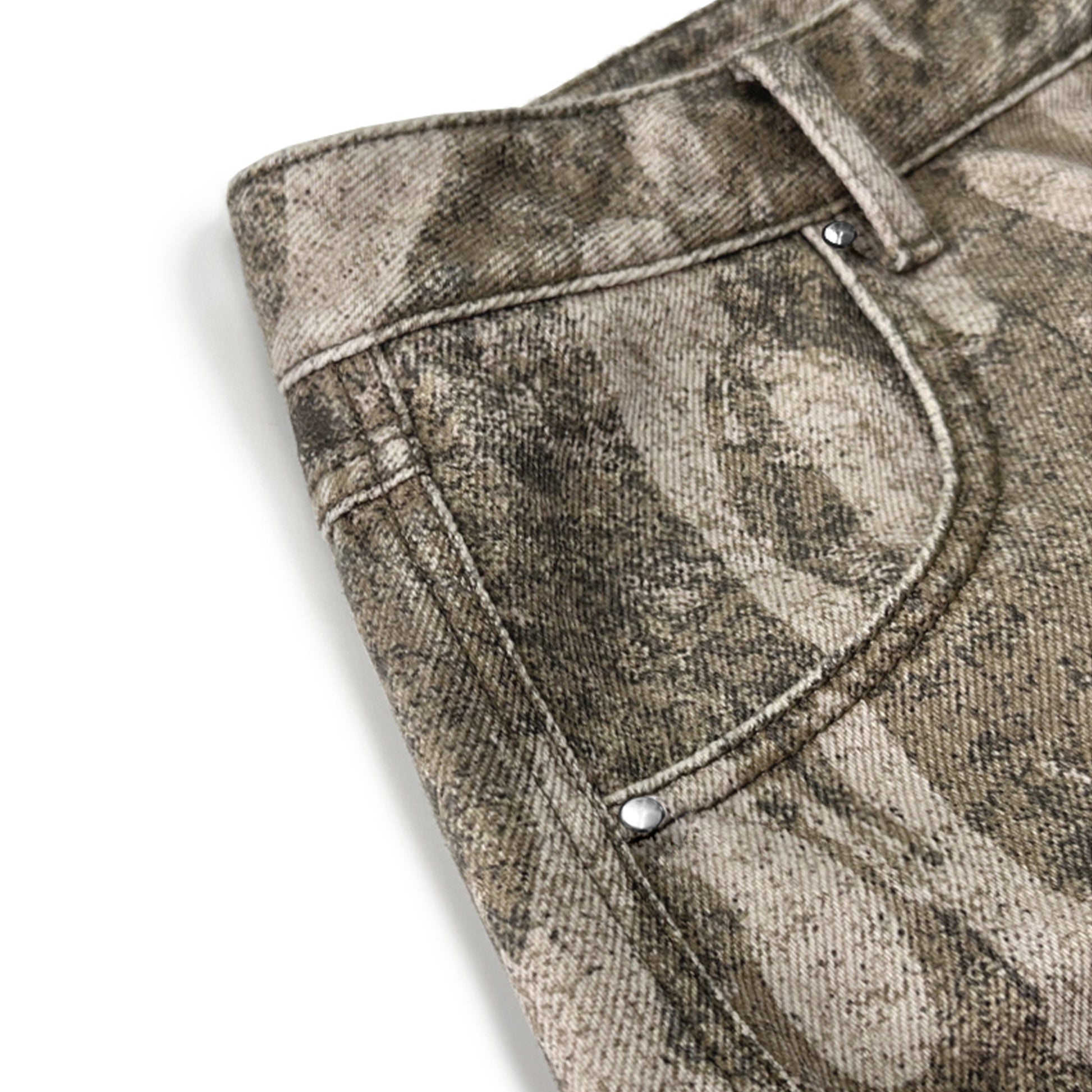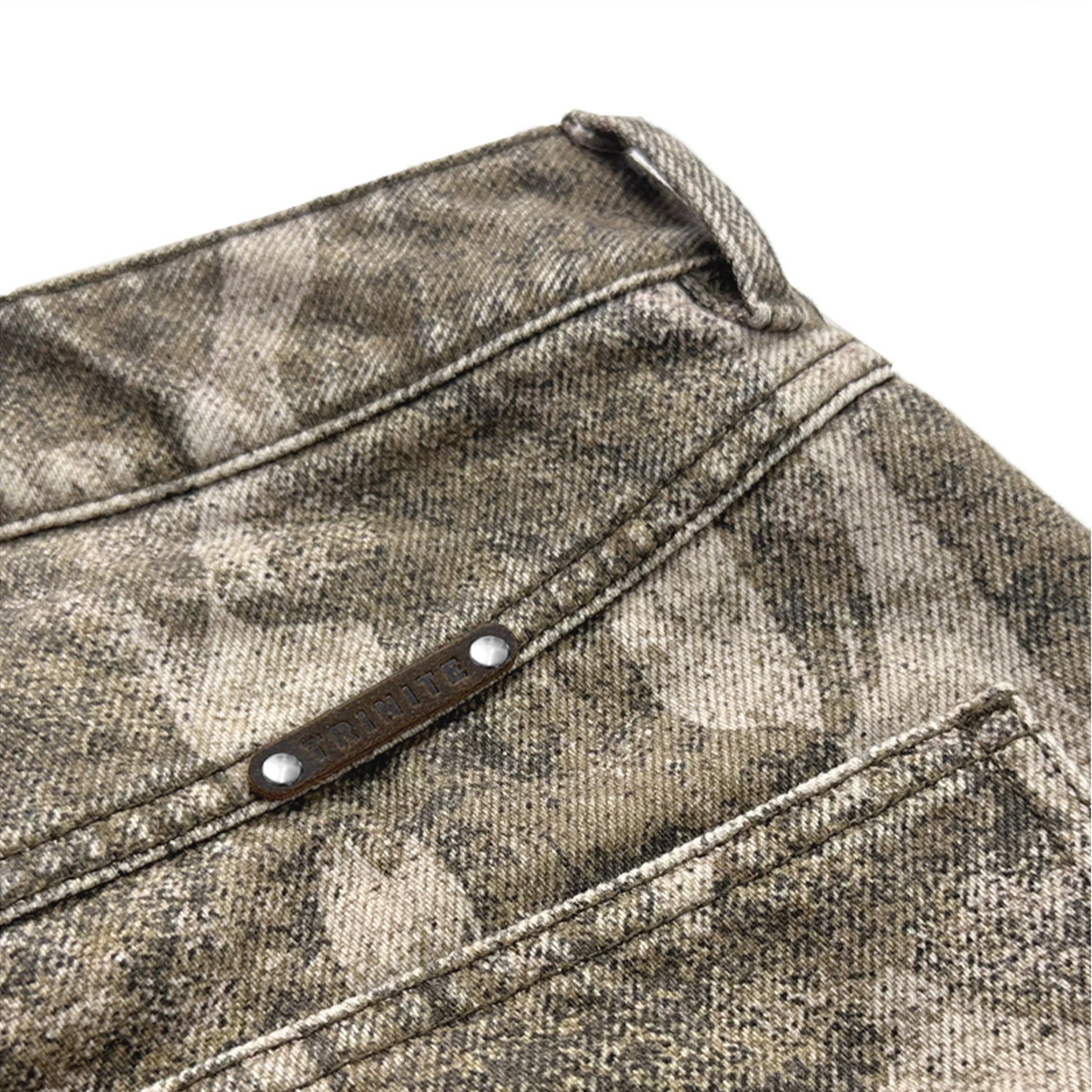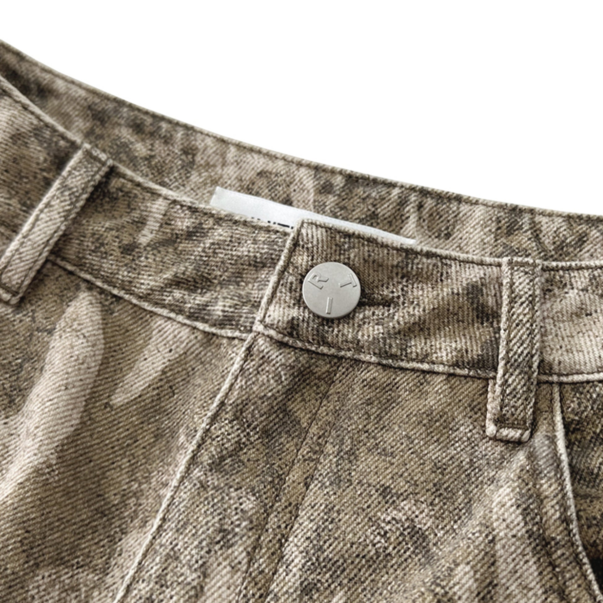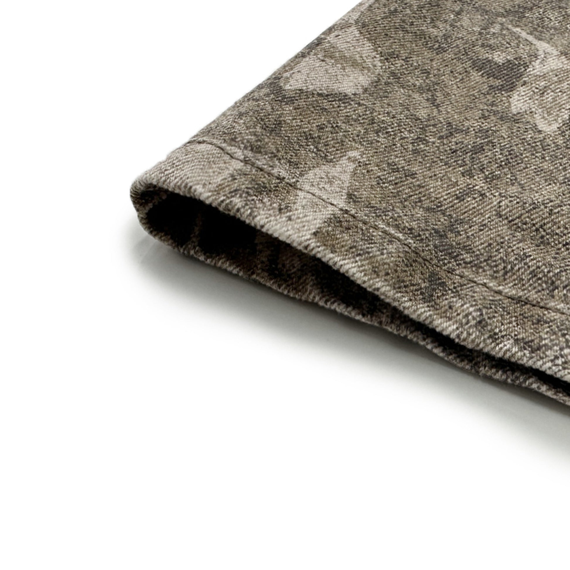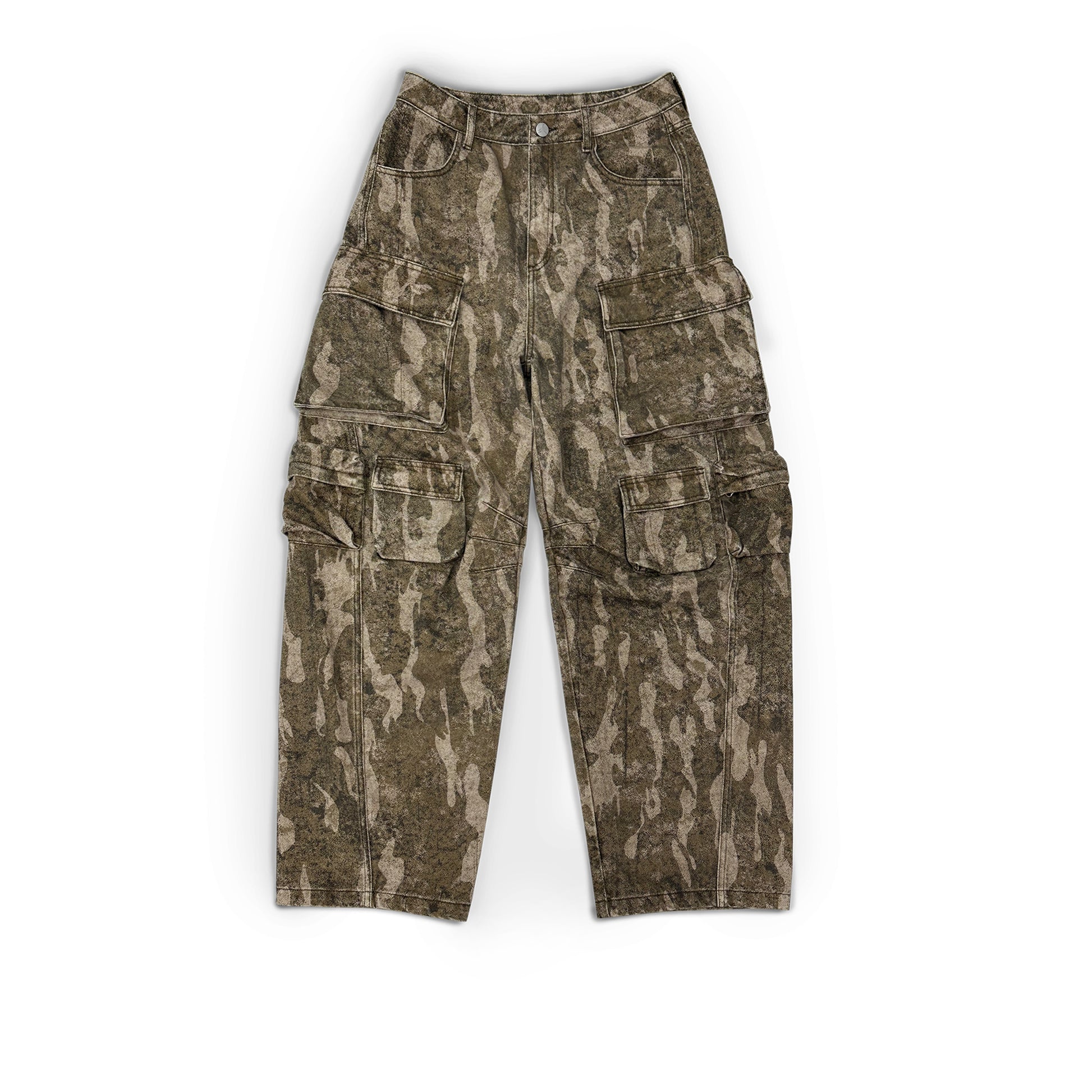 This item continues TRINITE's classic cargo pants design, combining functionality and fashion. Made from 100% cotton white denim base fabric, digitally printed and washed to achieve a naturally distressed and faded look, creating a vintage modern feel.