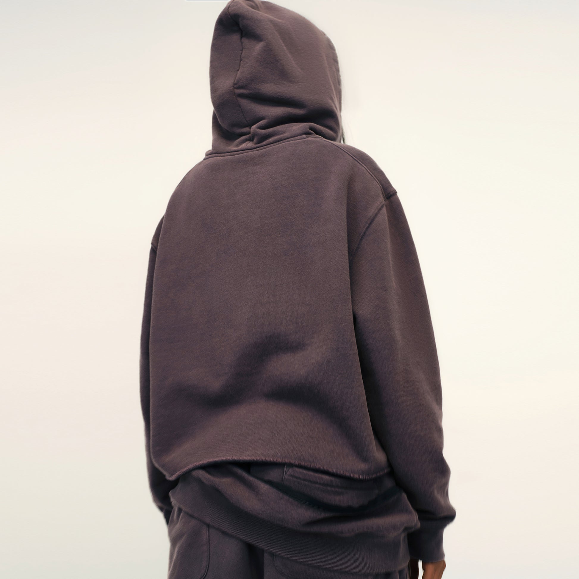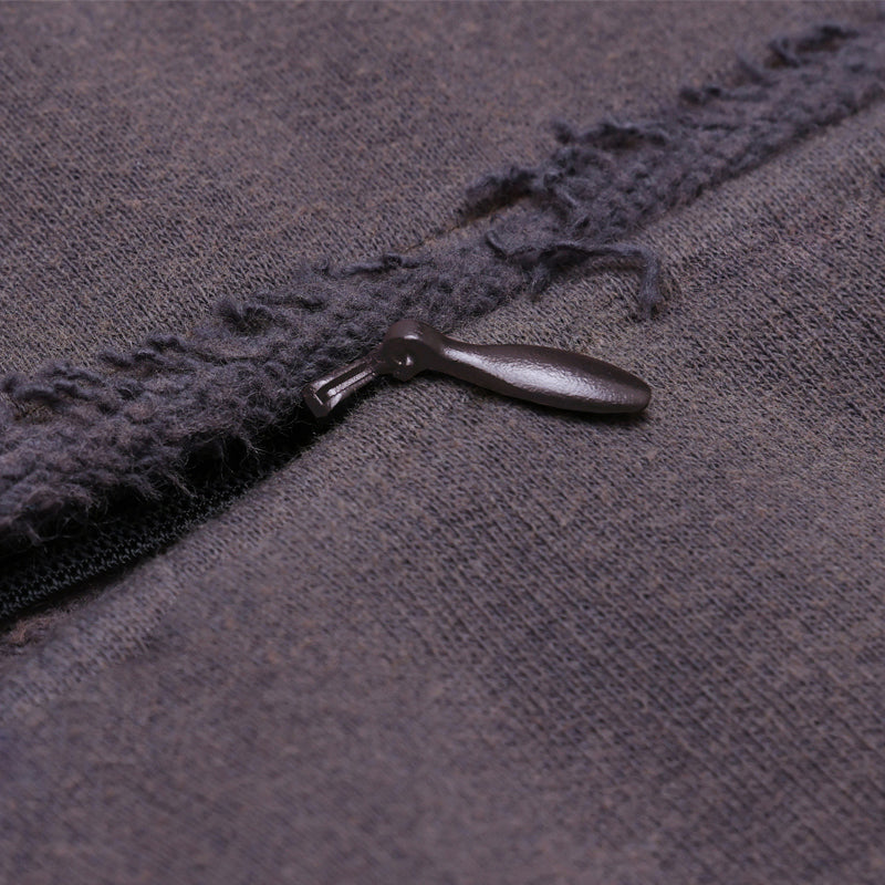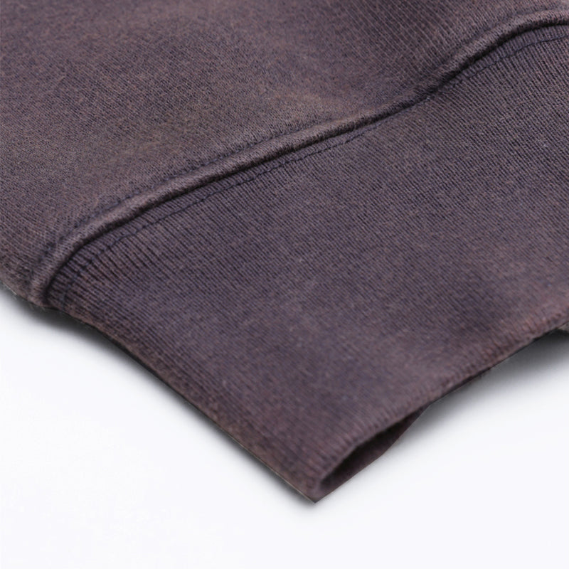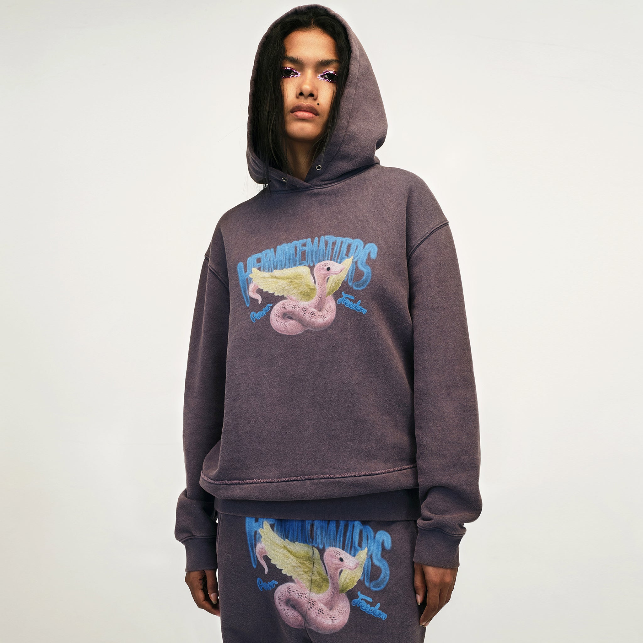 The purple-brown base is treated with a washing process to create a naturally distressed look, cleverly aligning with the season’s “TRAILBLAZER” theme. The front is adorned with the slogan “HER VOICE MATTERS,” expressed through a snake pattern and street graffiti style, precisely rendered using digital printing technology. This design conveys the empowering message of women expressing themselves and confronting their inner strength. The waist features a detachable hidden zipper, allowing for three different styling options: fully removed for a cropped raw-edge hoodie, half-zipped for a casual unfinished look, or zipped up for a classic oversized fit.